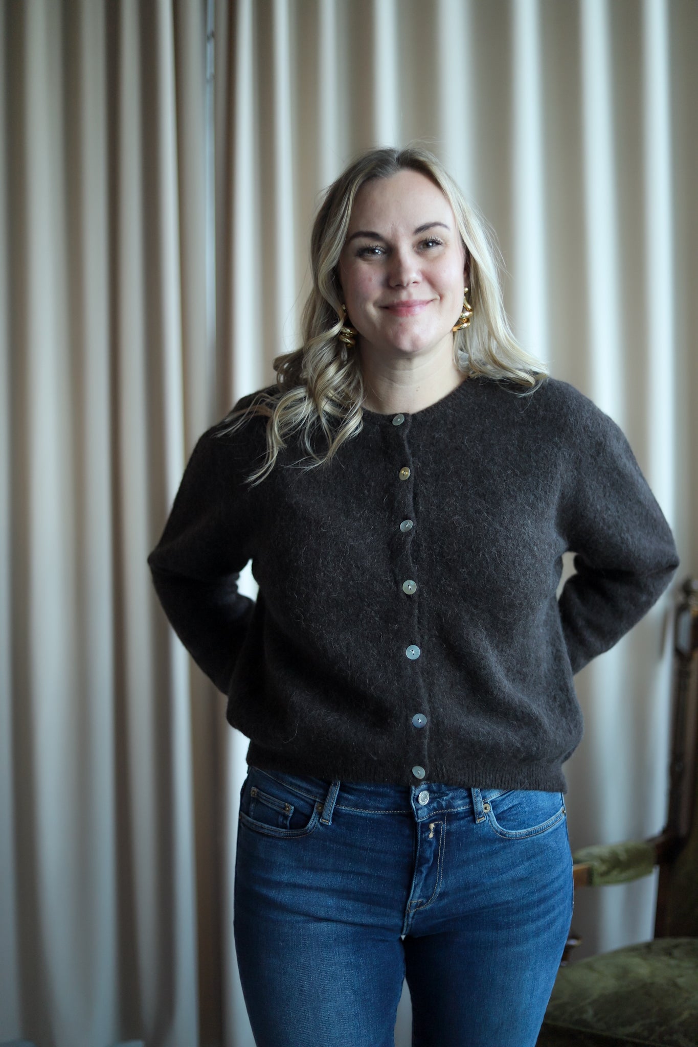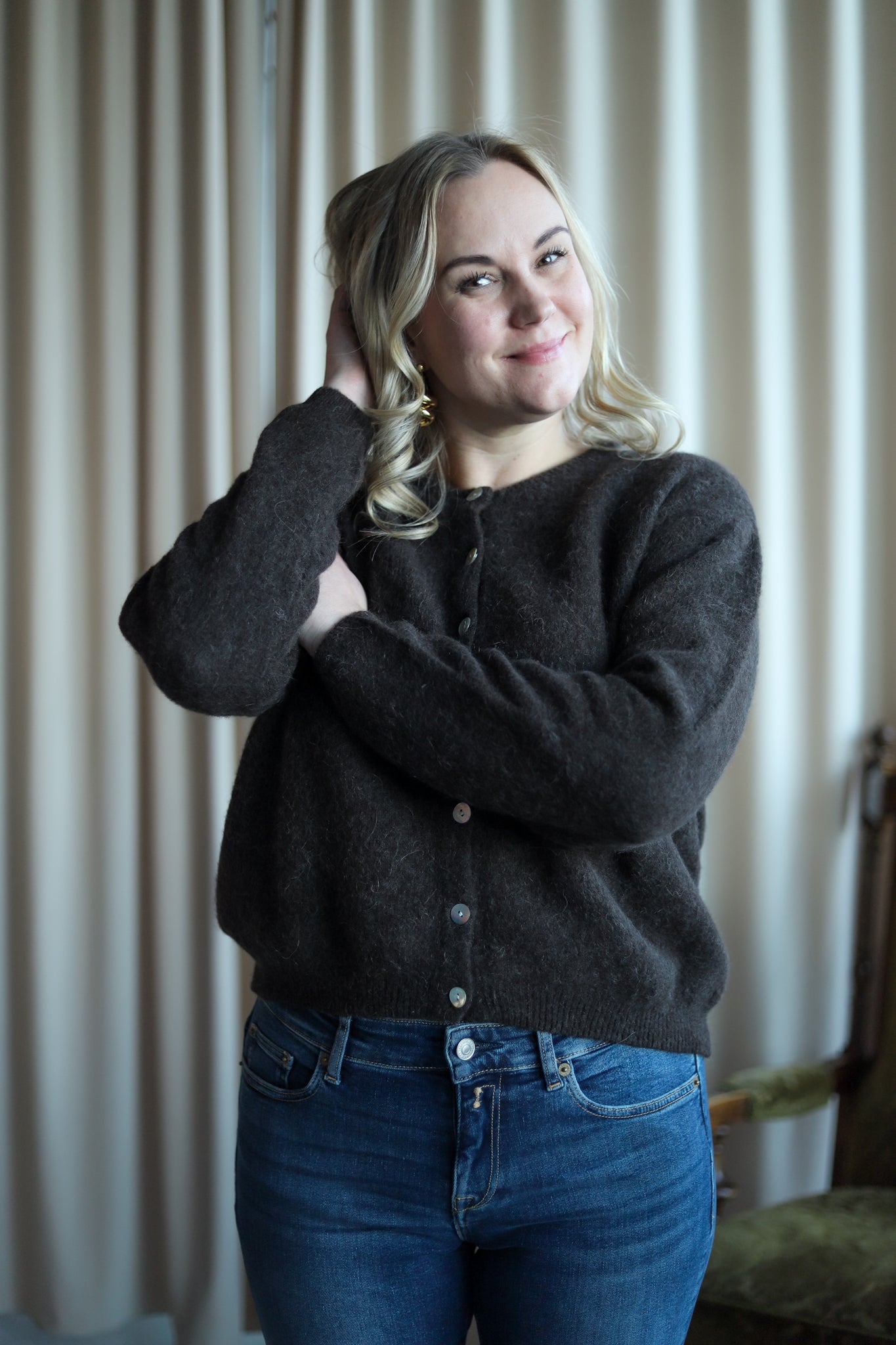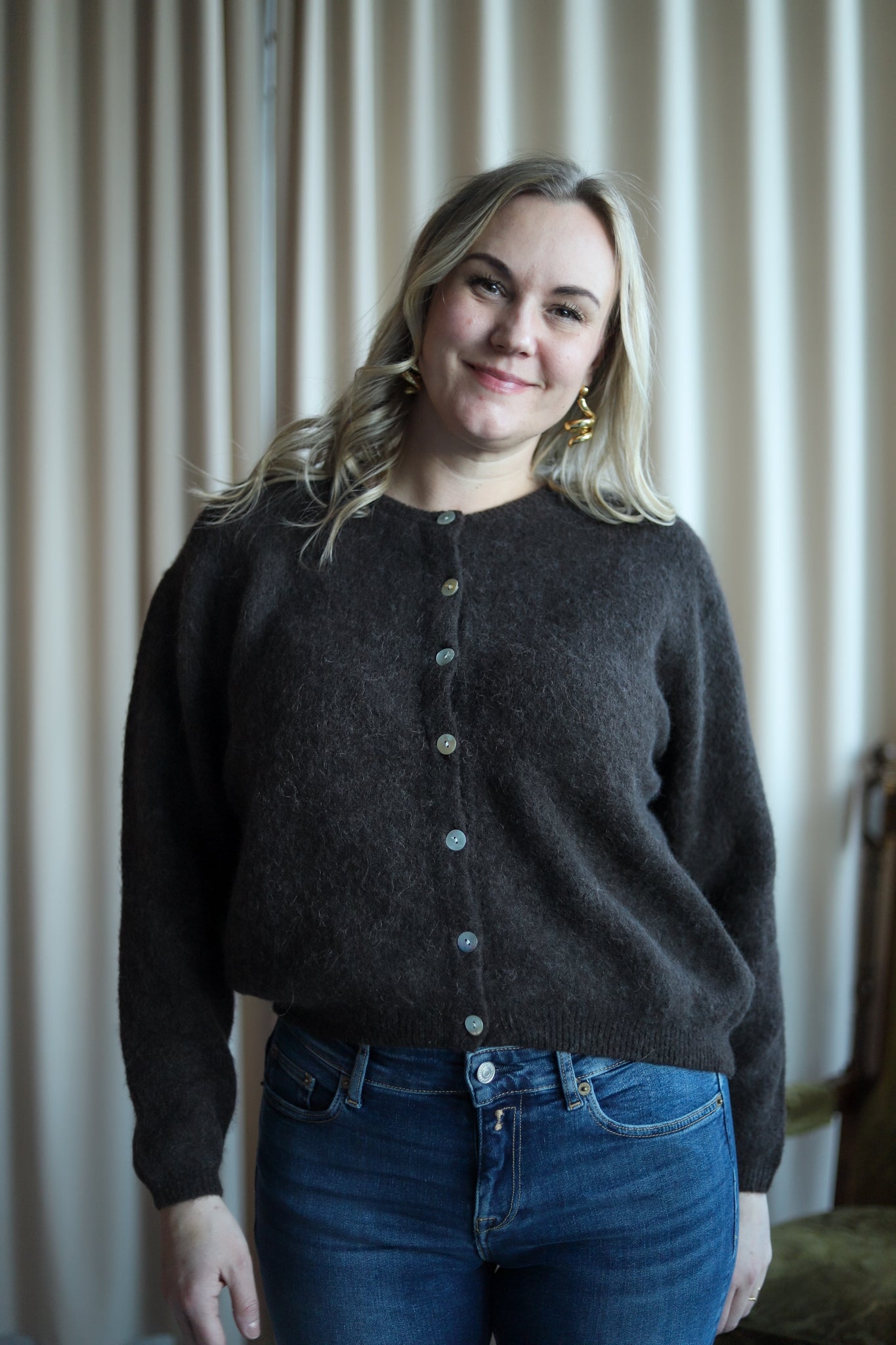 Deilig cardigan i mørk brun fra American Vintage. Modellen er boxy med lett croppet lengde. Avslappet passform med rund hals og lange ermer. Den har droppet skuldersøm og knepping med vakre perlemorsknapper i front. Kvaliteten er passe tykk og bygger ikke for mye. Deilig myk kvalitet med en børstet og fluffy overflate. Hals, mansjett og hem er markert med ribb. En hverdagfavoritt som funker hele året. Kjempefin farge som er lett å kombinere, perfekt til jeans eller over favorittkjolen. Bruk den gjerne motsatt vei, som en genser med stilig kneppning i ryggen.