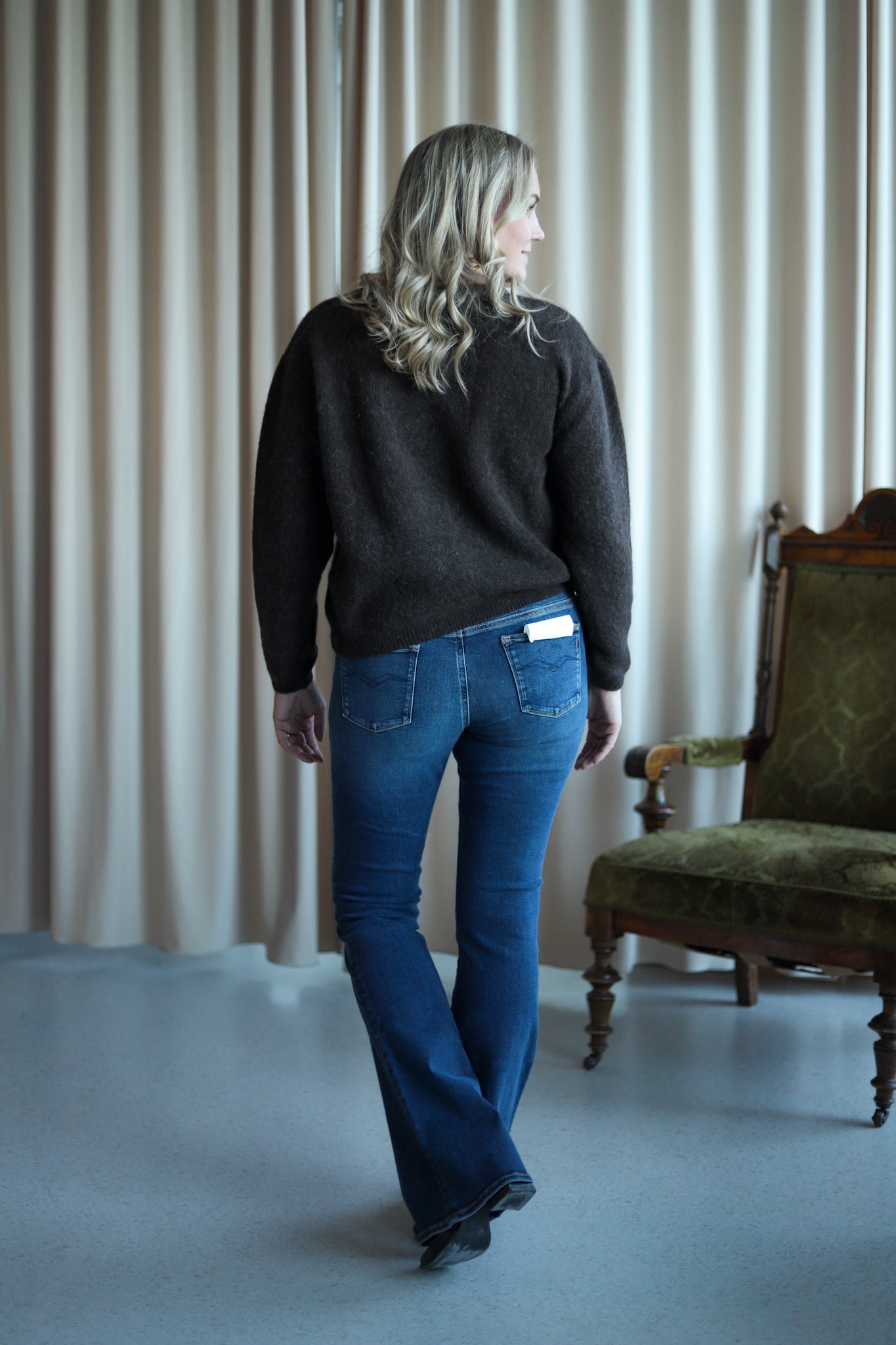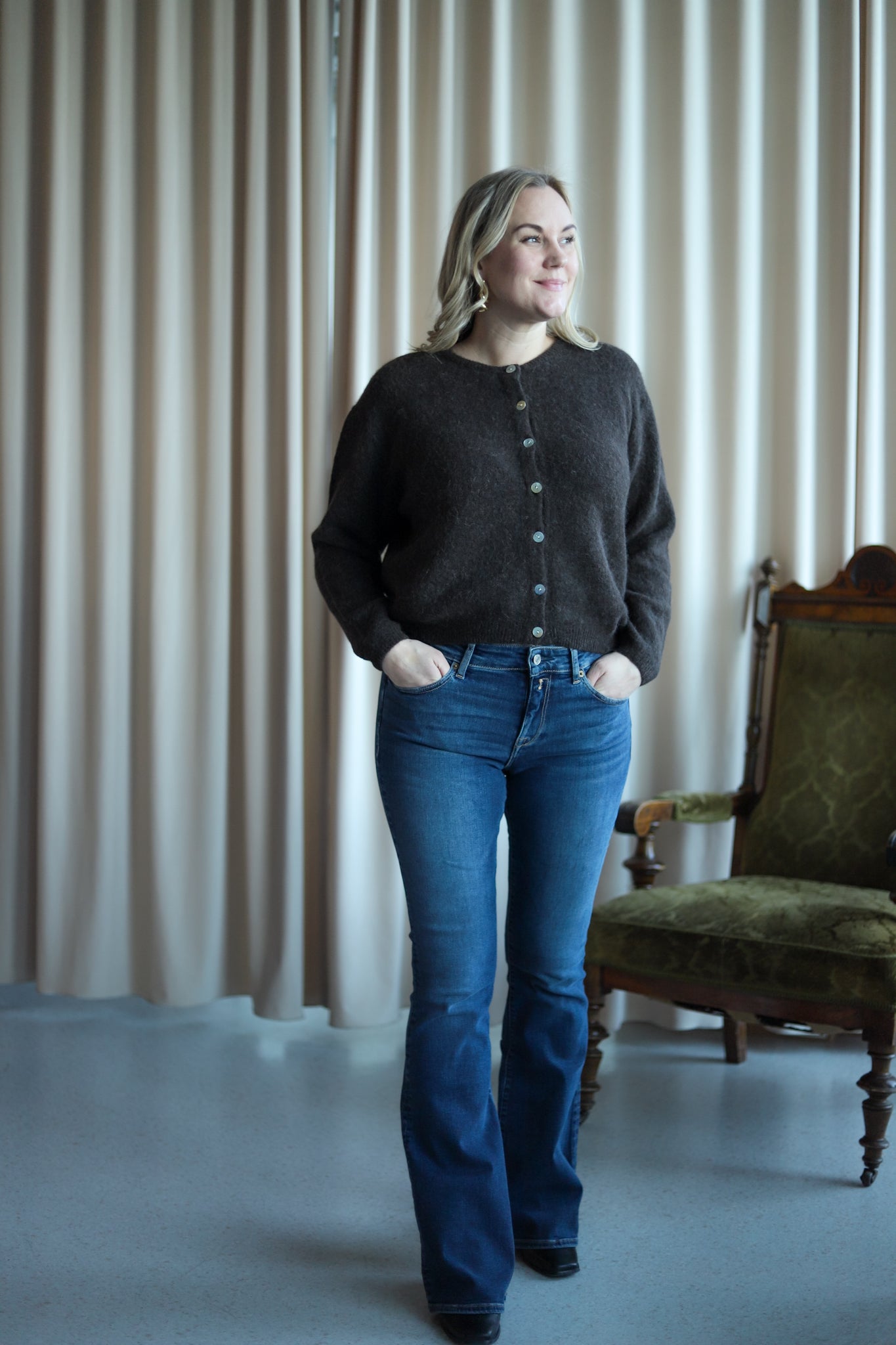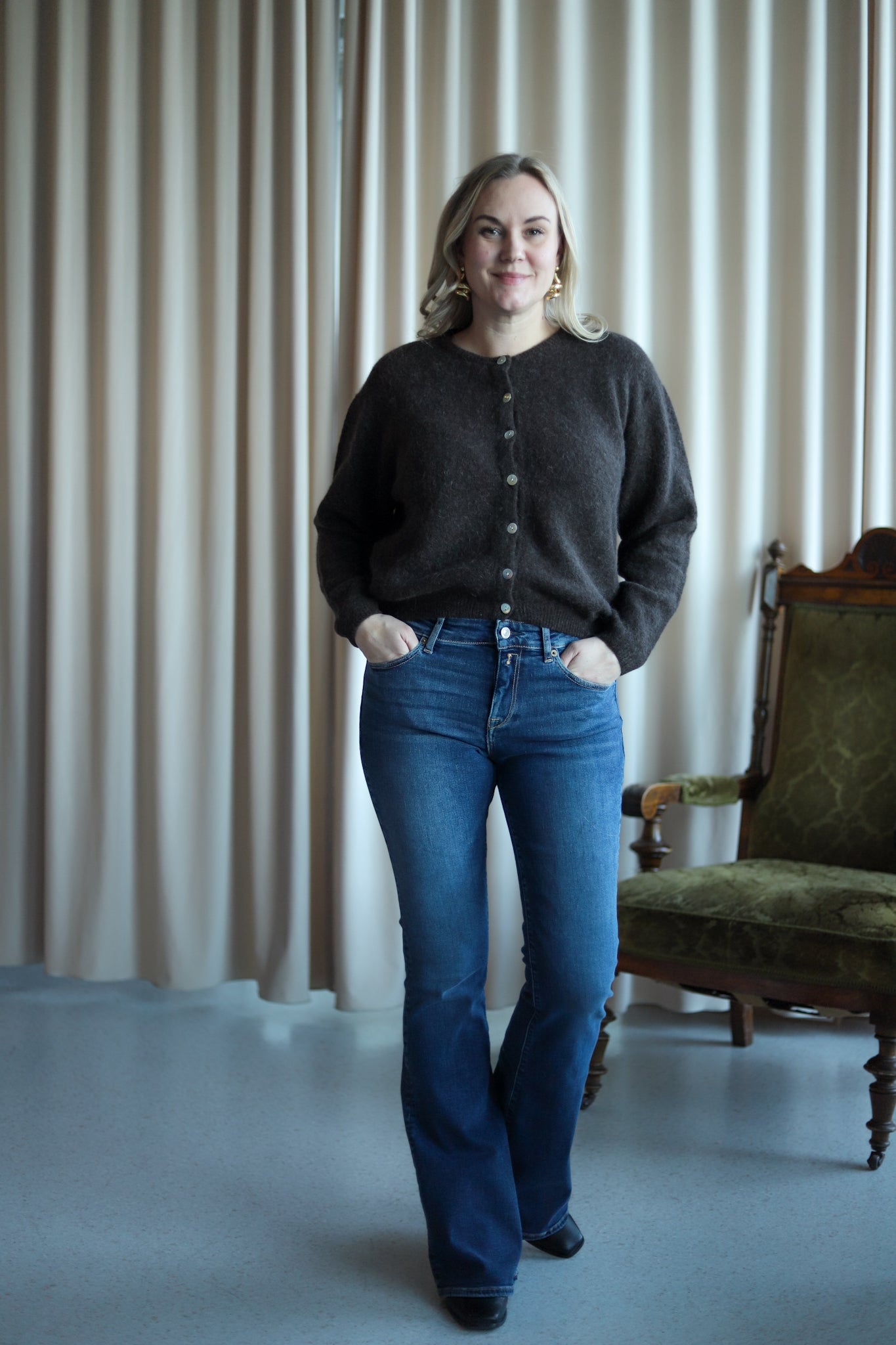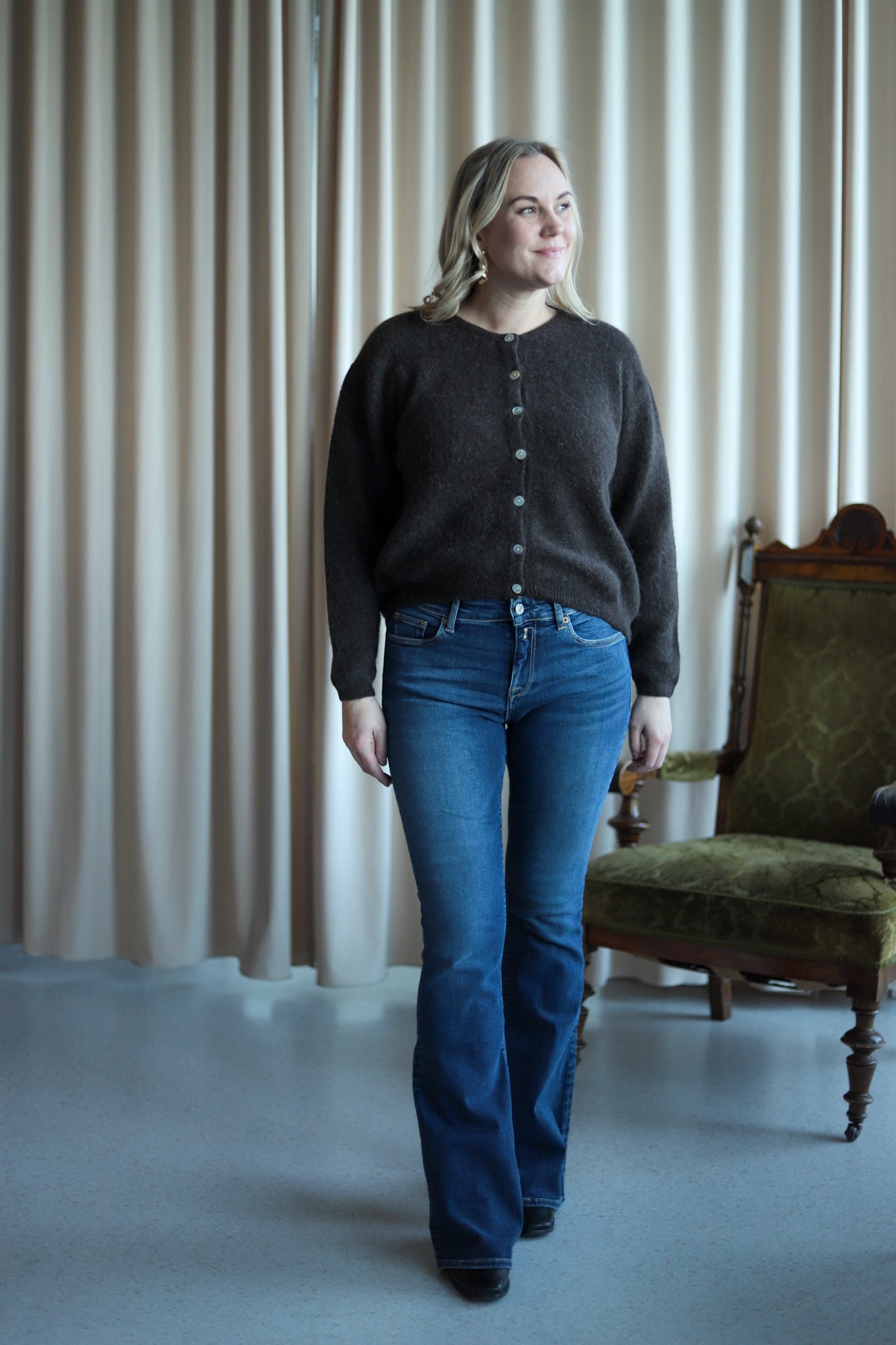 Deilig cardigan i mørk brun fra American Vintage. Modellen er boxy med lett croppet lengde. Avslappet passform med rund hals og lange ermer. Den har droppet skuldersøm og knepping med vakre perlemorsknapper i front. Kvaliteten er passe tykk og bygger ikke for mye. Deilig myk kvalitet med en børstet og fluffy overflate. Hals, mansjett og hem er markert med ribb. En hverdagfavoritt som funker hele året. Kjempefin farge som er lett å kombinere, perfekt til jeans eller over favorittkjolen. Bruk den gjerne motsatt vei, som en genser med stilig kneppning i ryggen.