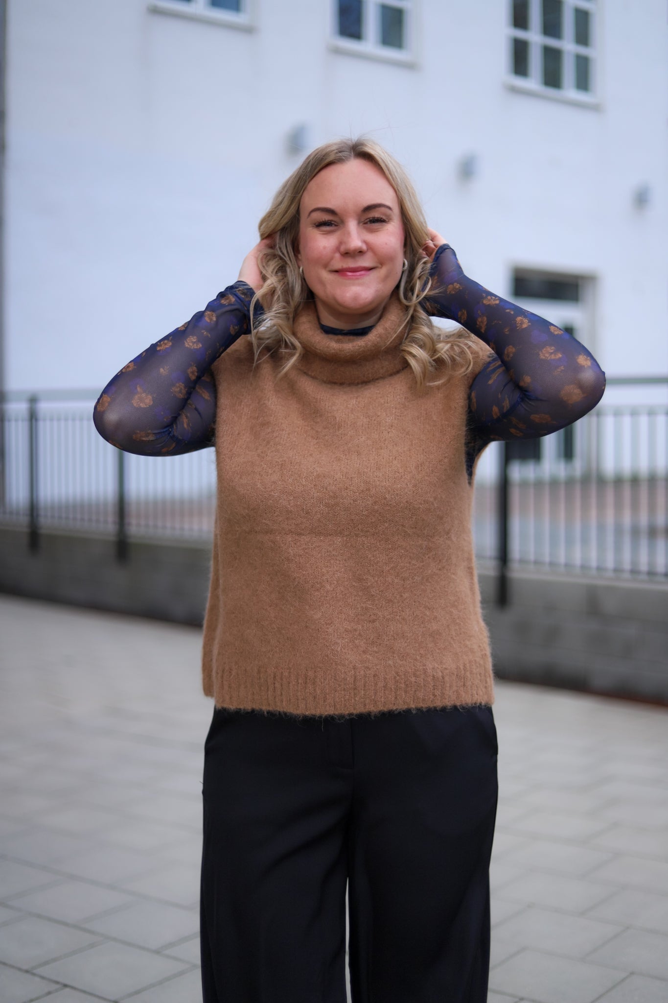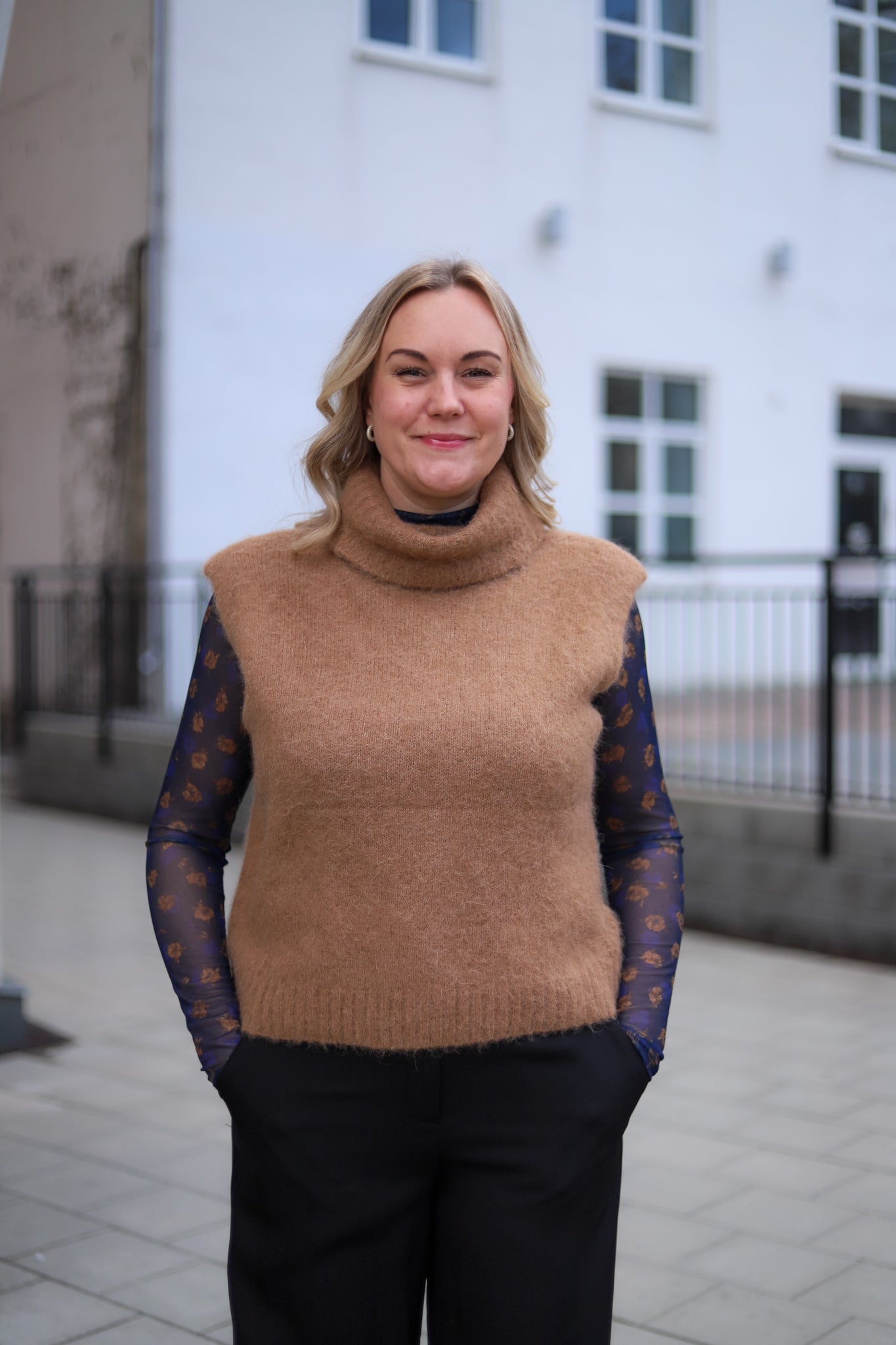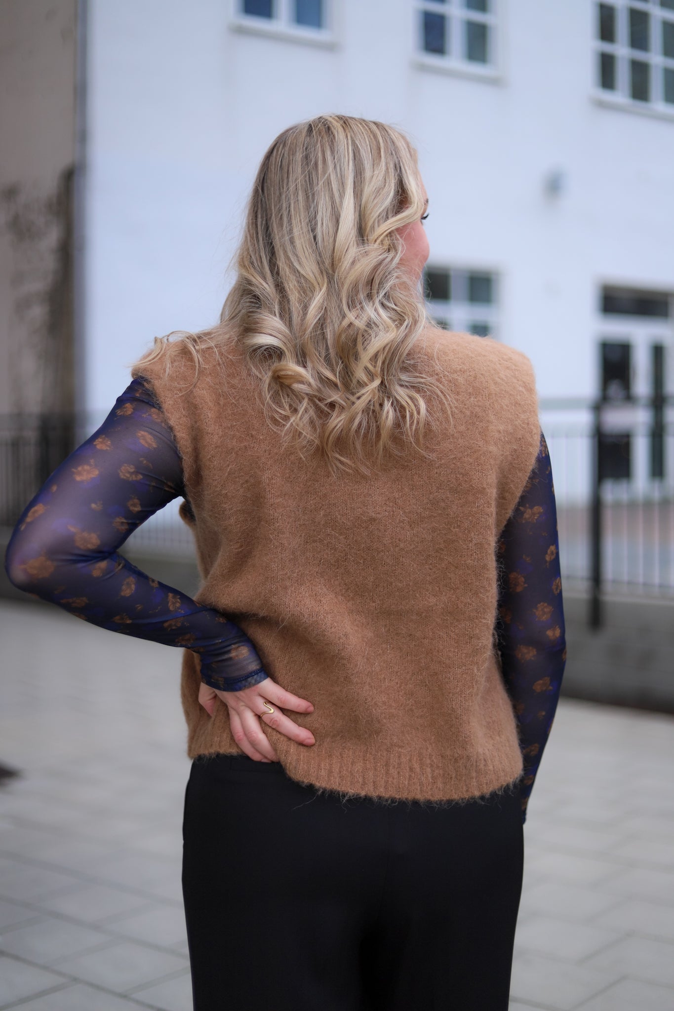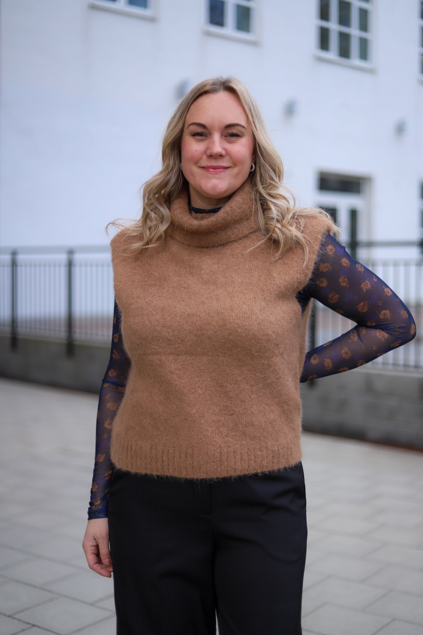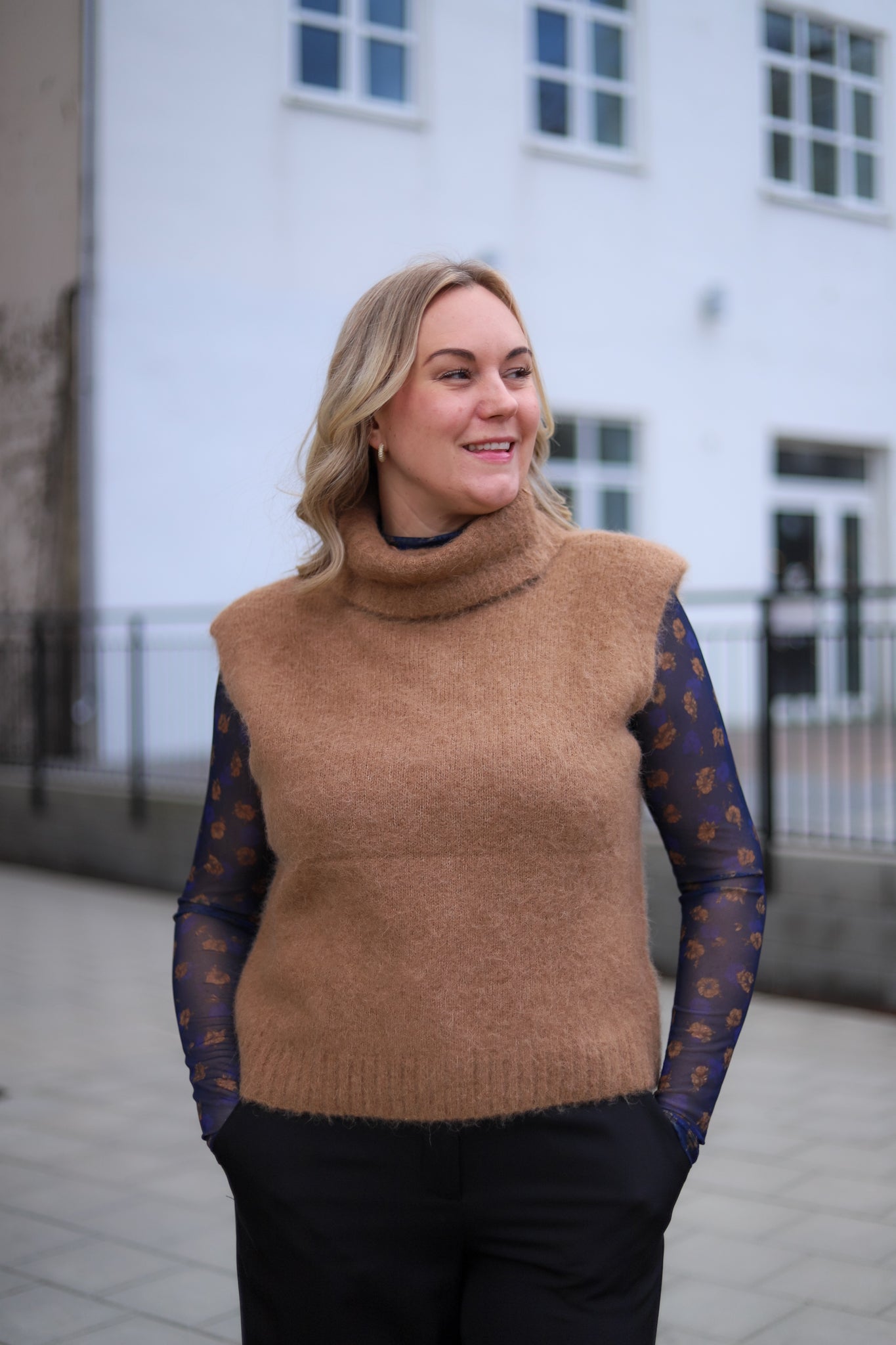 Stilig vest i lys brun farge fra MSCH Copenhagen. Modellen er rett, uten arm med høy hals. Den er laget i en myk, fluffy alpakkamix. Perfekt som lag på lag med sesongens strikk og topper.