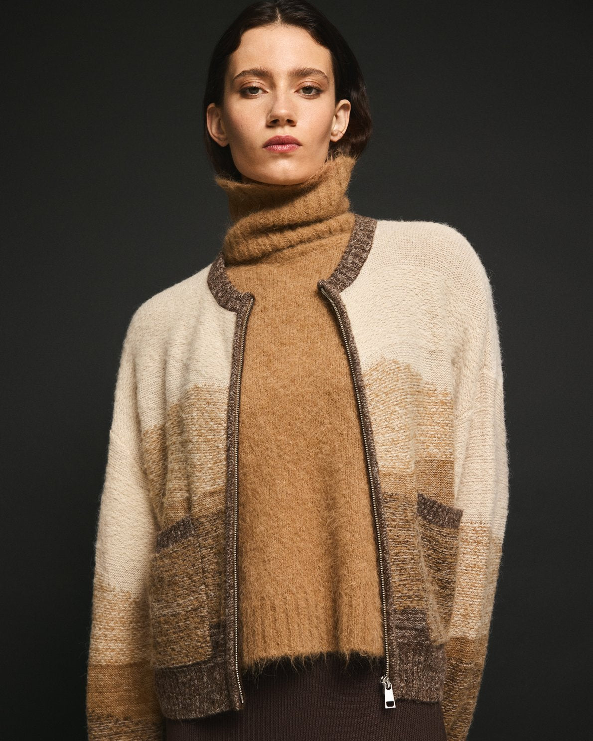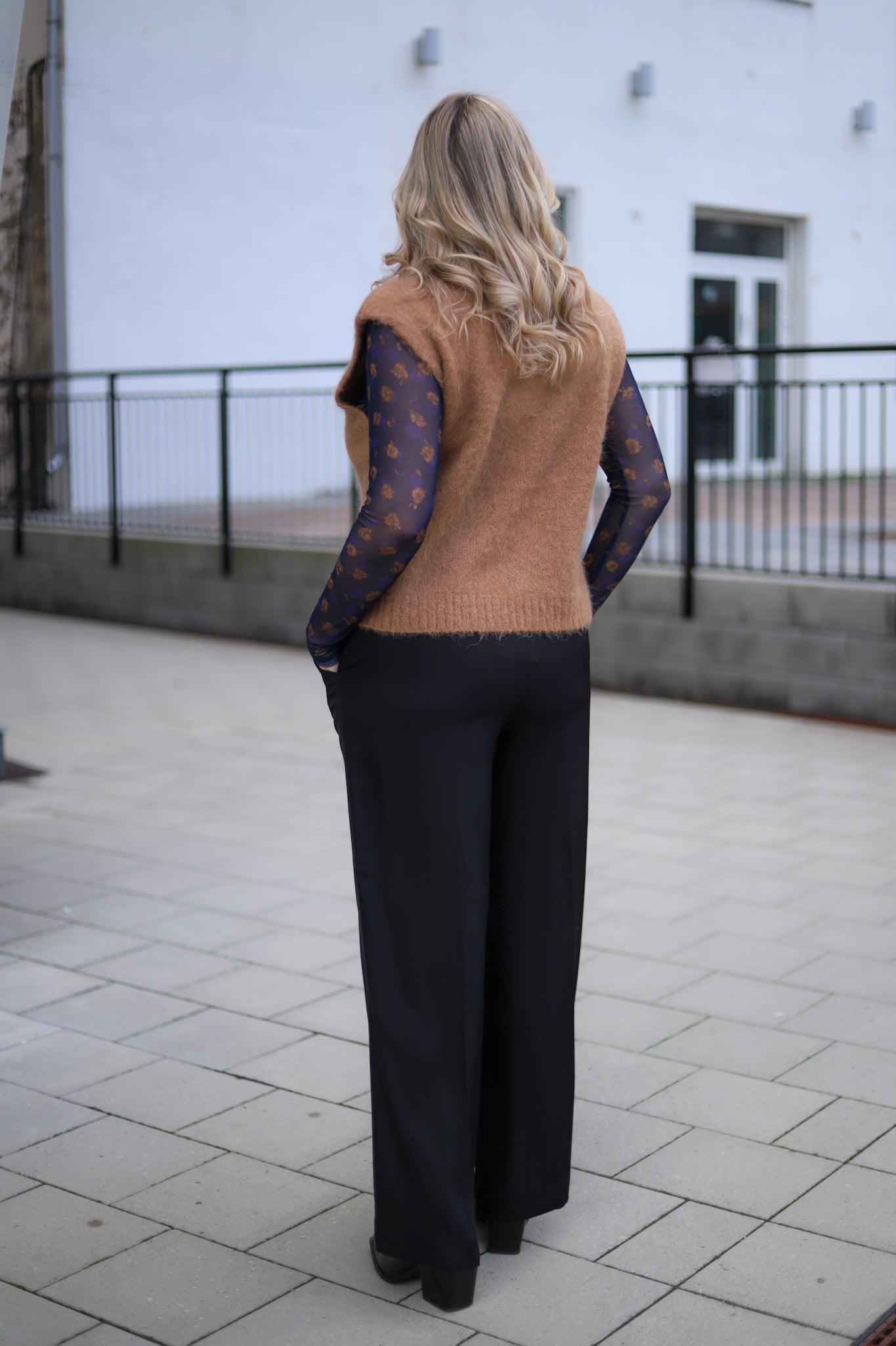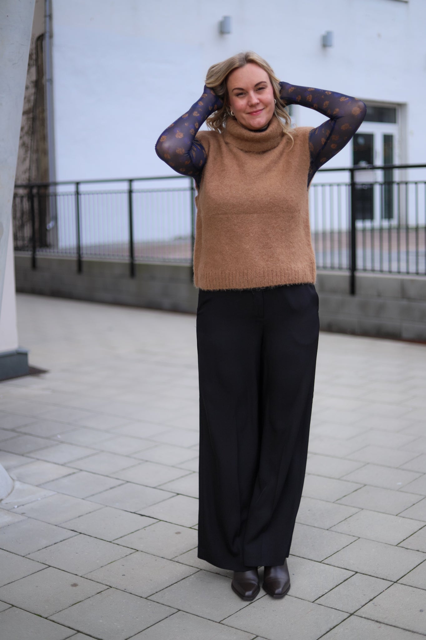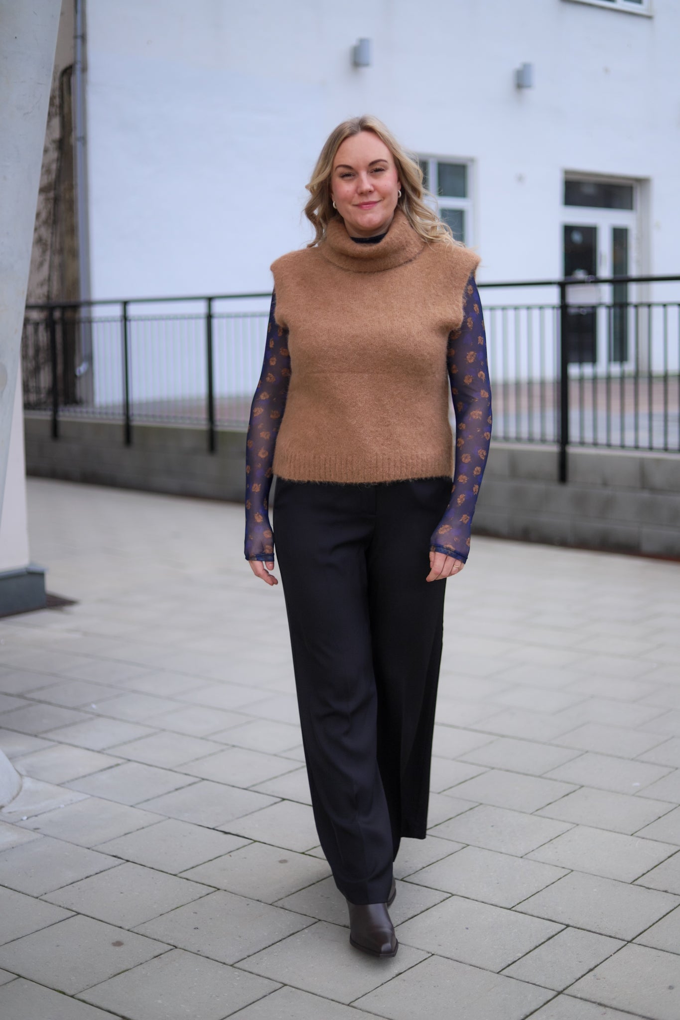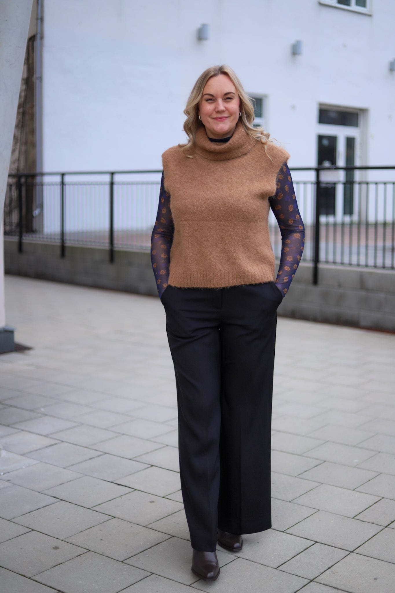 Stilig vest i lys brun farge fra MSCH Copenhagen. Modellen er rett, uten arm med høy hals. Den er laget i en myk, fluffy alpakkamix. Perfekt som lag på lag med sesongens strikk og topper.