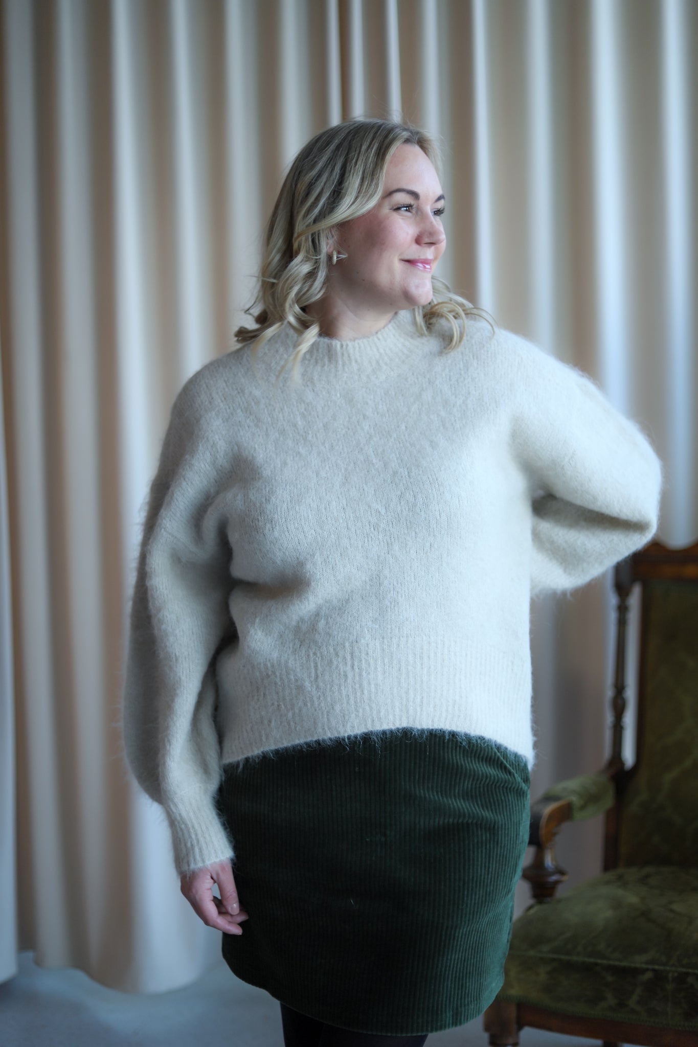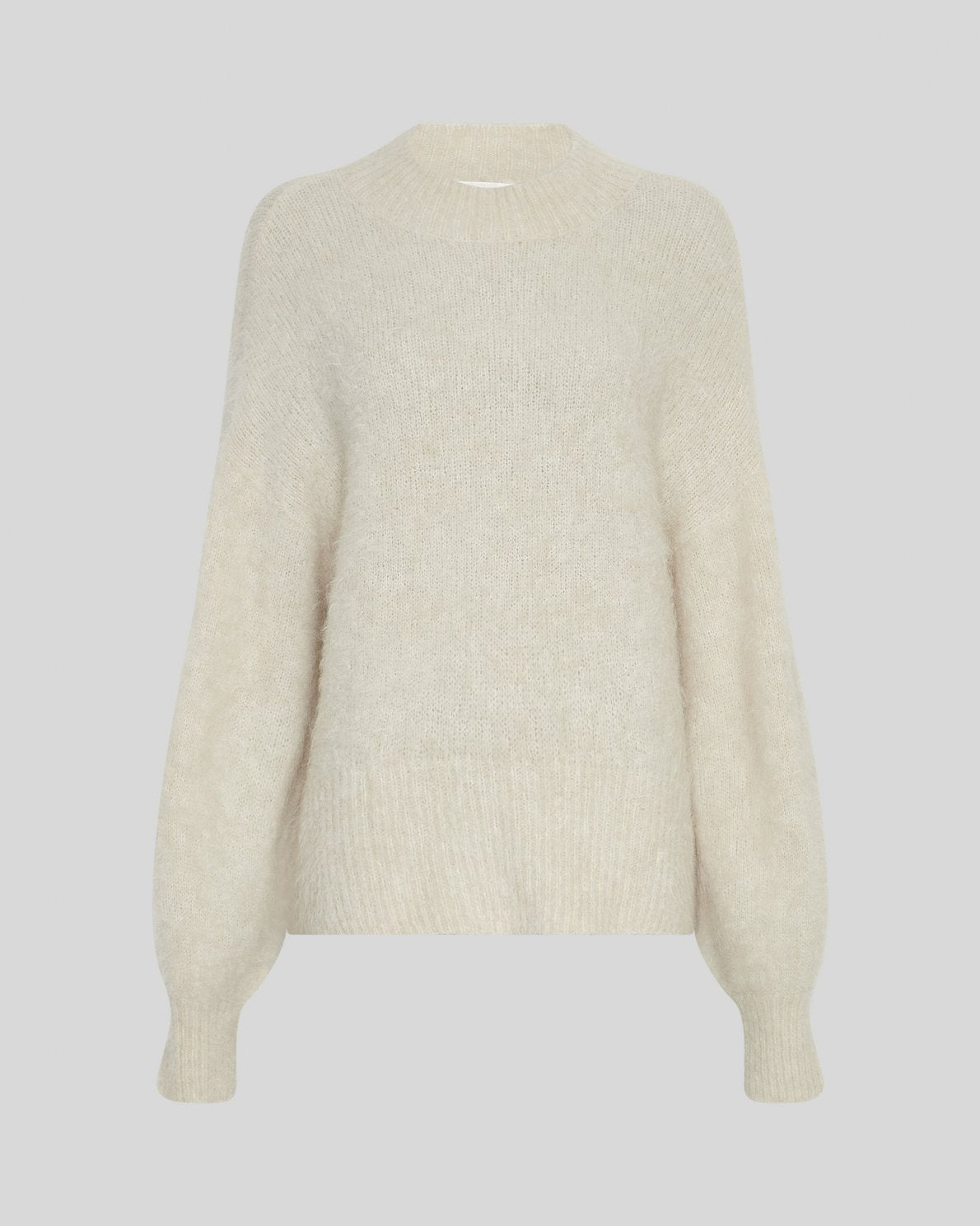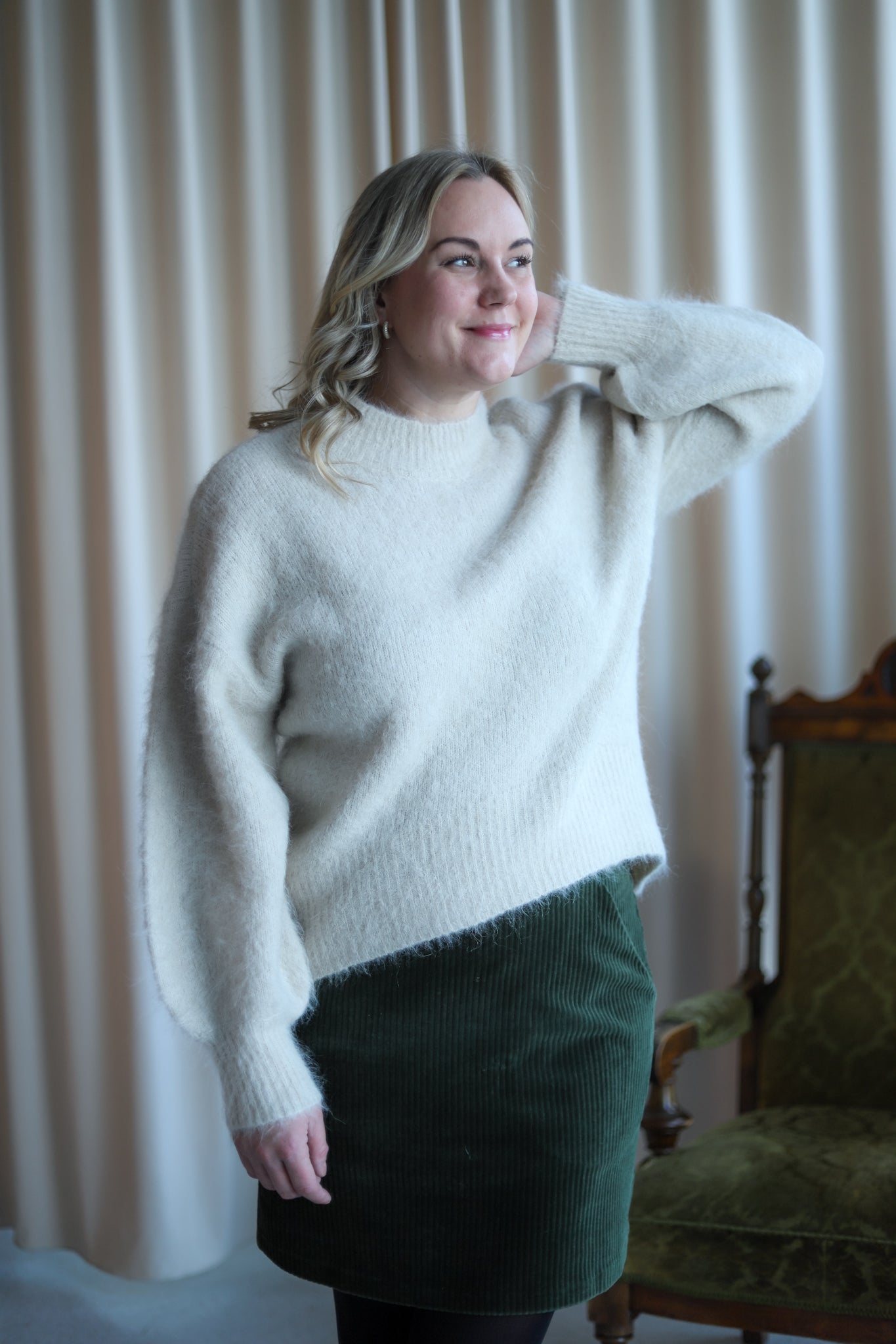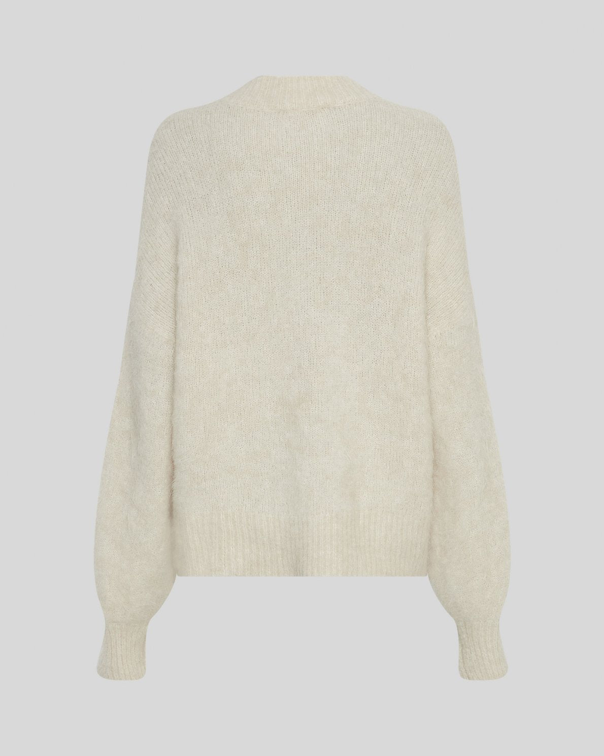 Nydelig strikk i offwhite fra MSCH Copenhagen. Modellen har løs passform med ekstra lengde bak. Den har rund hals og lange ermer med droppet skulder. Bred ribbestrikk i hals, hem og mansjett. Den er laget i en myk, fluffy alpakkamix.