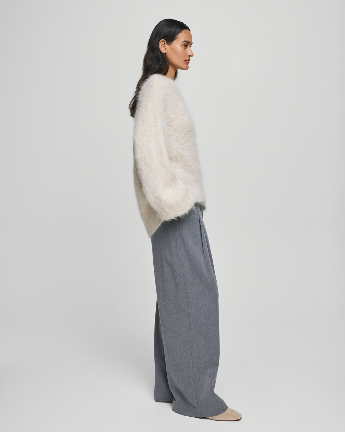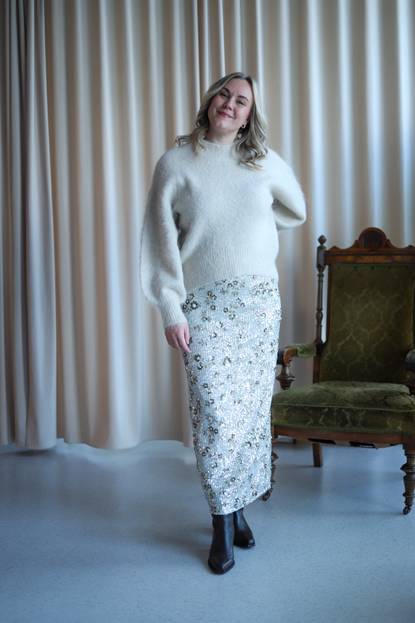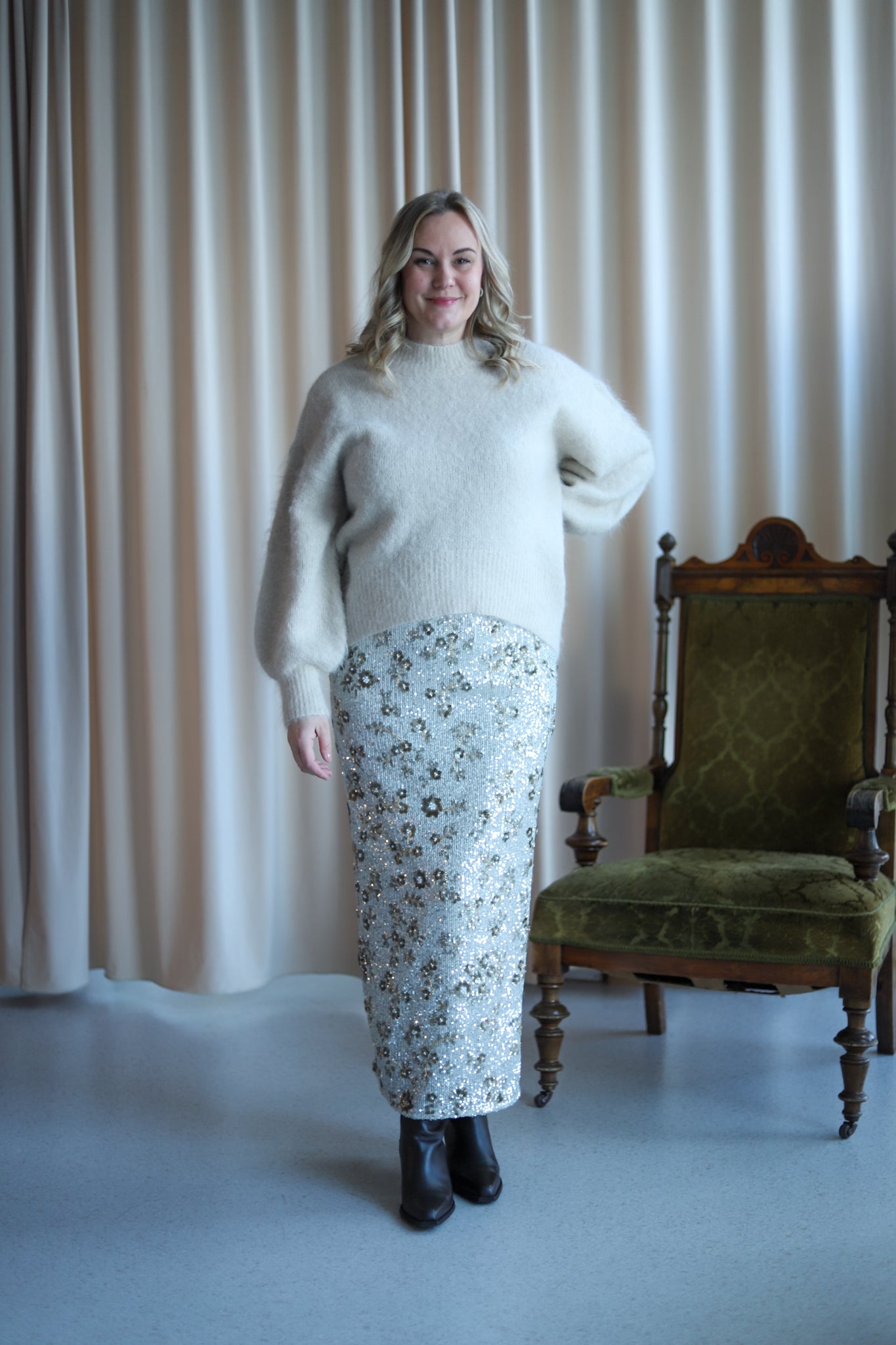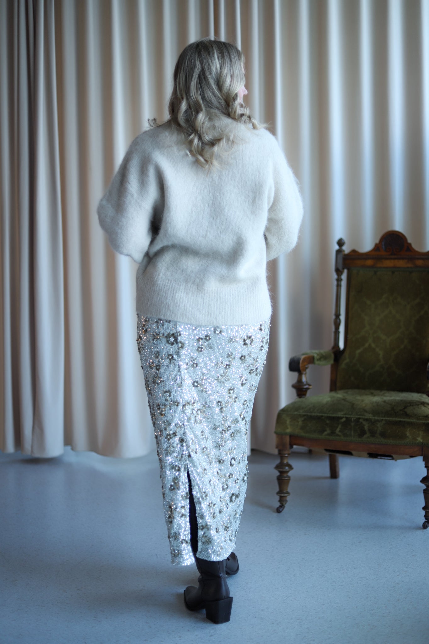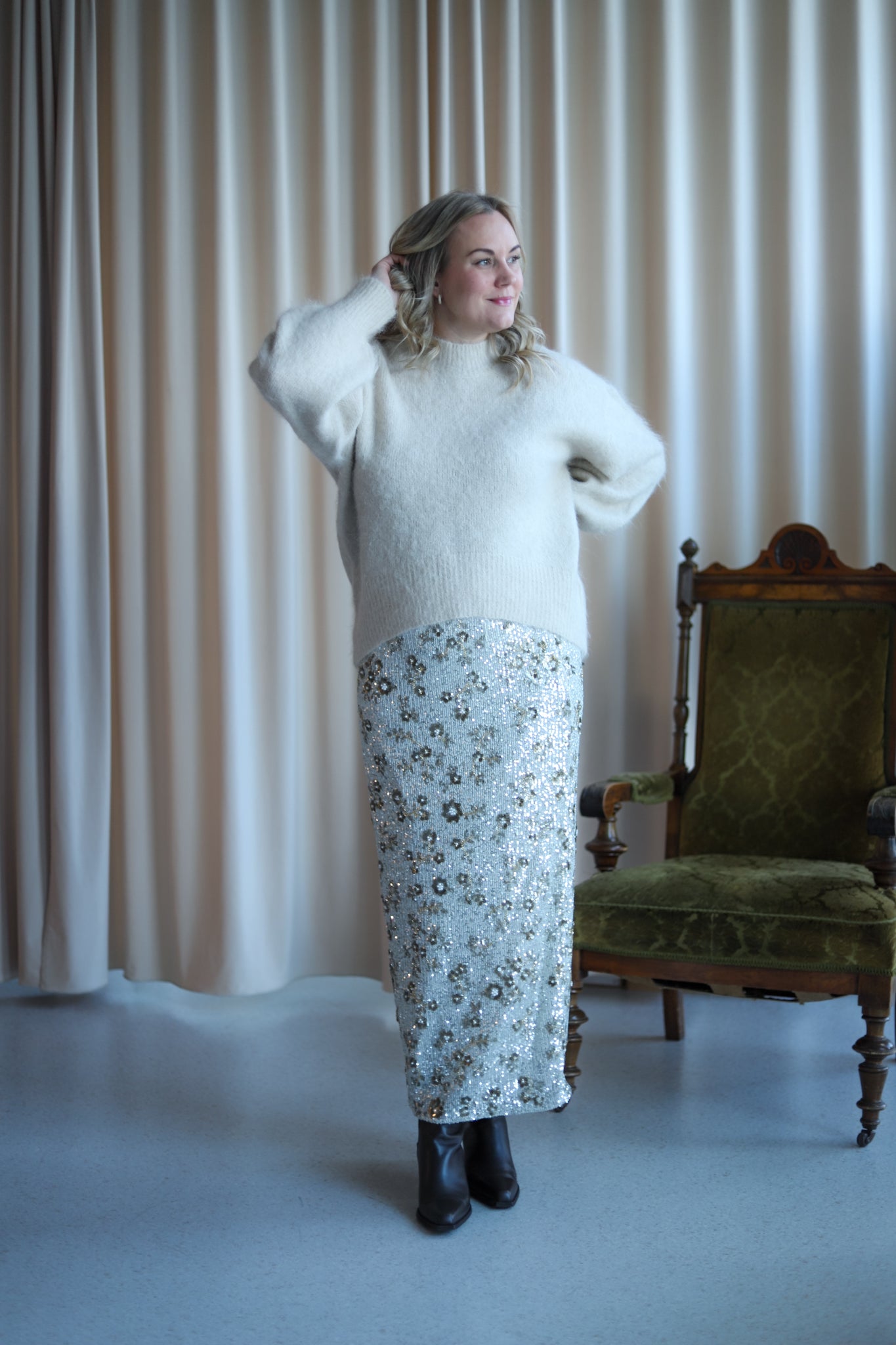 Nydelig strikk i offwhite fra MSCH Copenhagen. Modellen har løs passform med ekstra lengde bak. Den har rund hals og lange ermer med droppet skulder. Bred ribbestrikk i hals, hem og mansjett. Den er laget i en myk, fluffy alpakkamix.