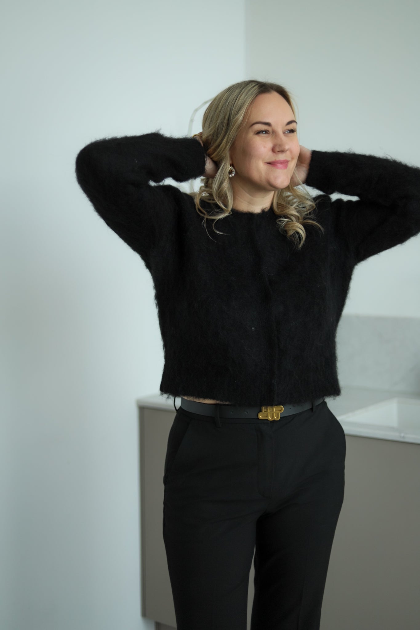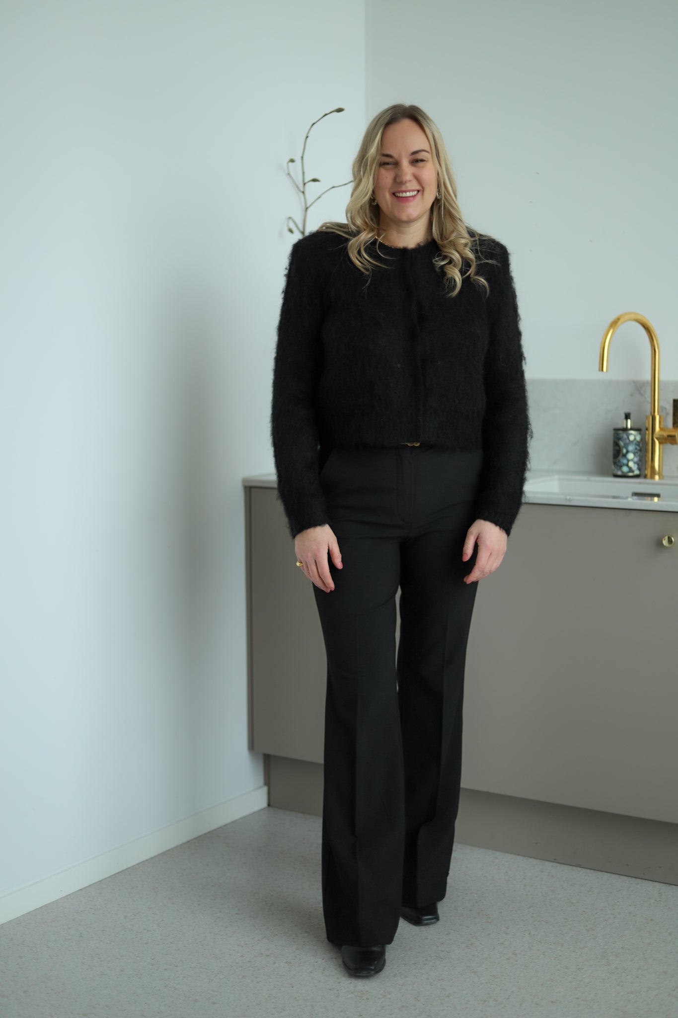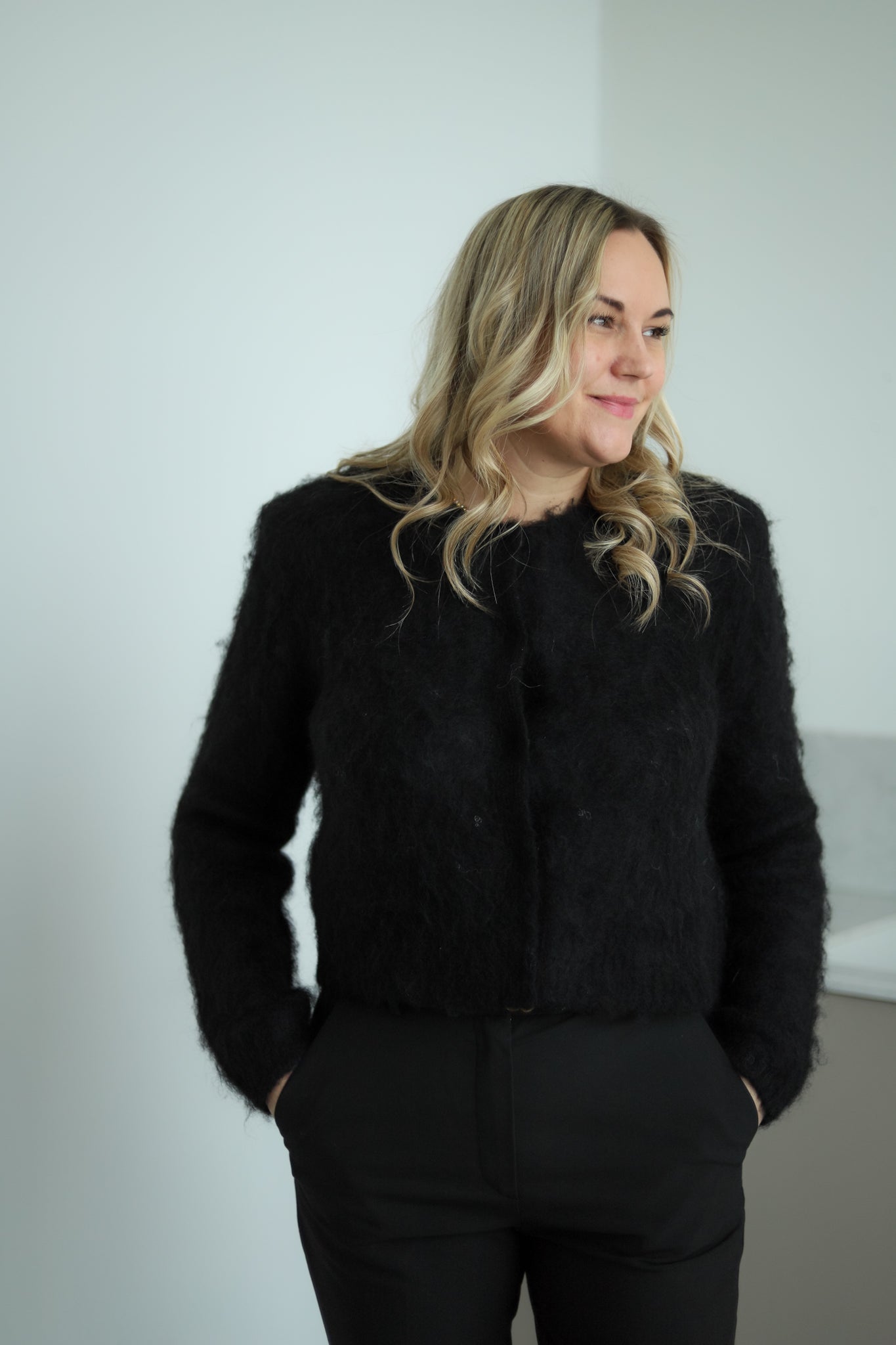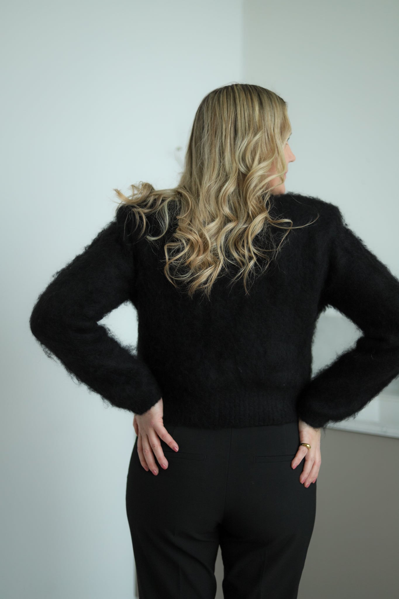 Nydelig cardigan i klassisk sort fra byTiMo. Modellen er rett med lett croppet lengde. Lange smale ermer med avtagbare skulderputer gir jakken det lille ekstra. Ribbestrikk i hals, hem og mansjett. Genseren er laget i deilig alpakkamix og har en delikat fluffy overflate. Med sin nette lengde er denne cardigan perfekte til både jeans, skjørt og over en kjole.