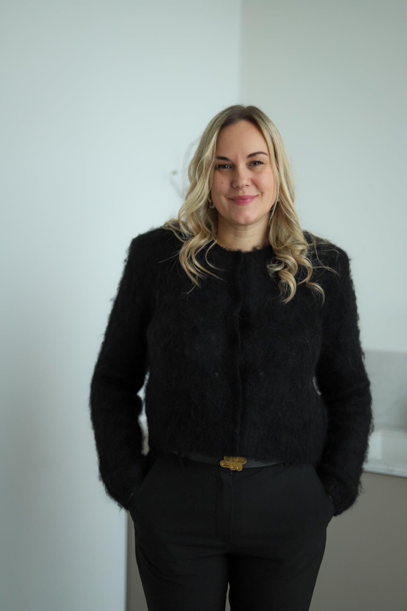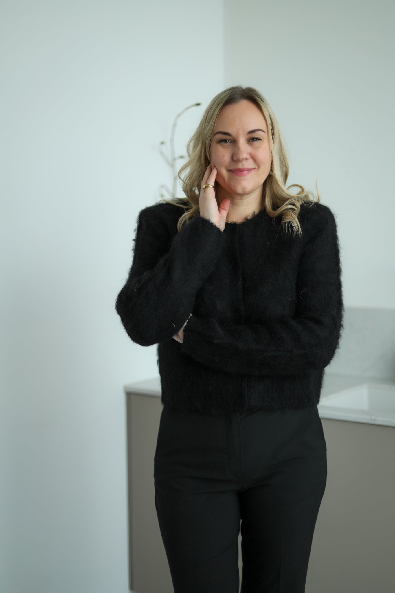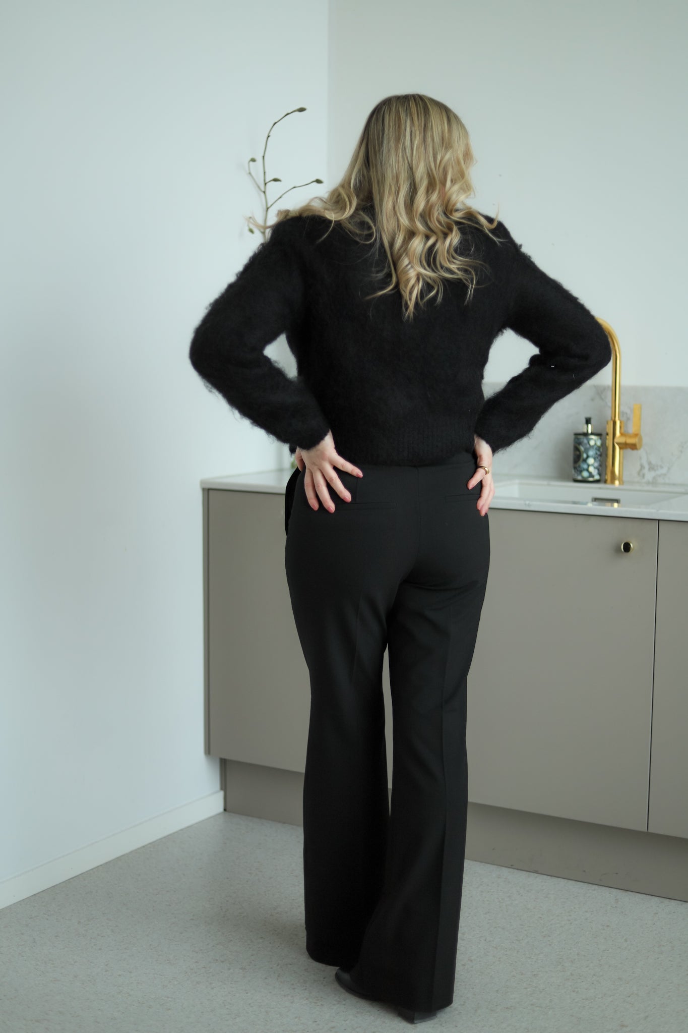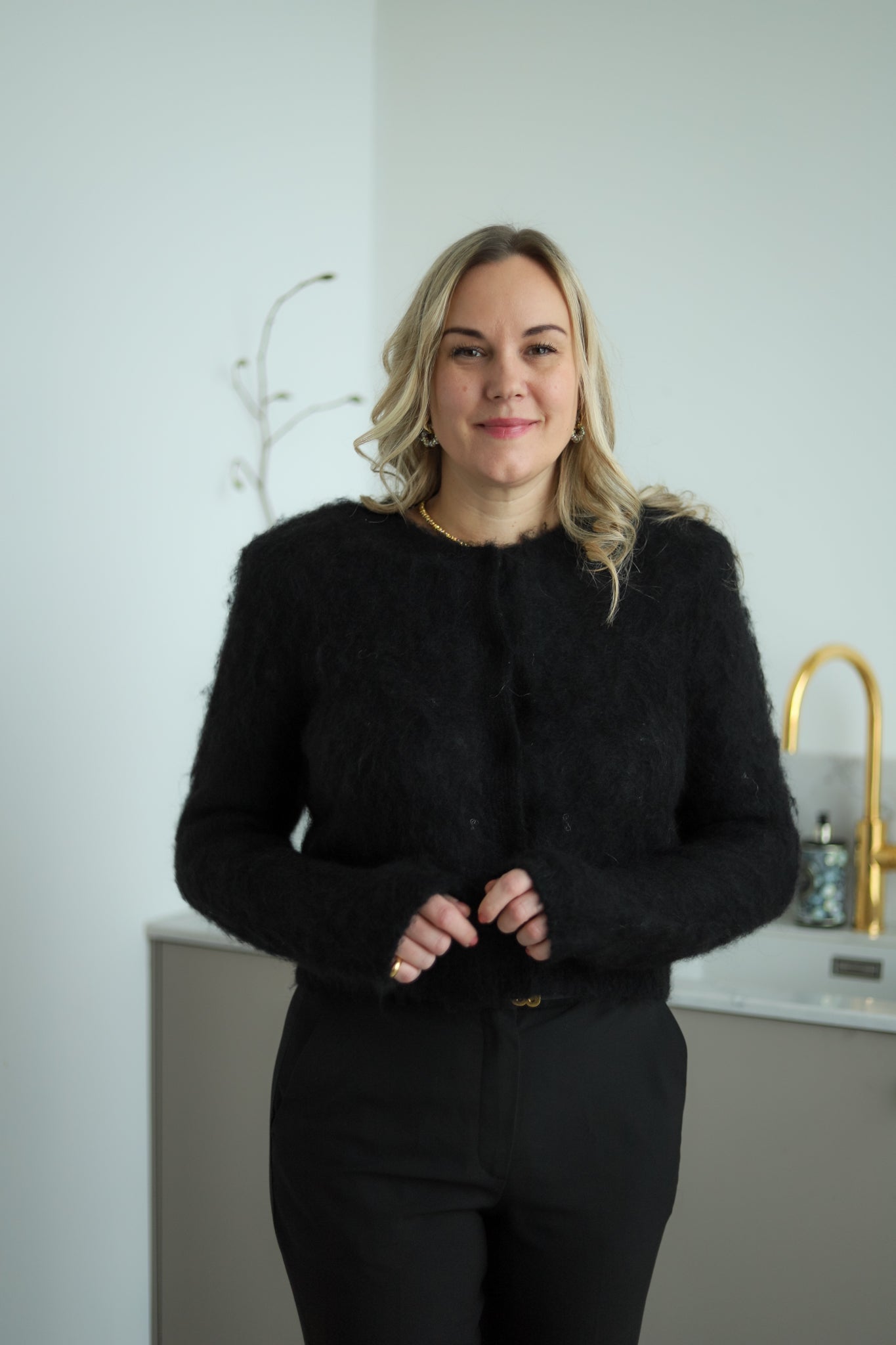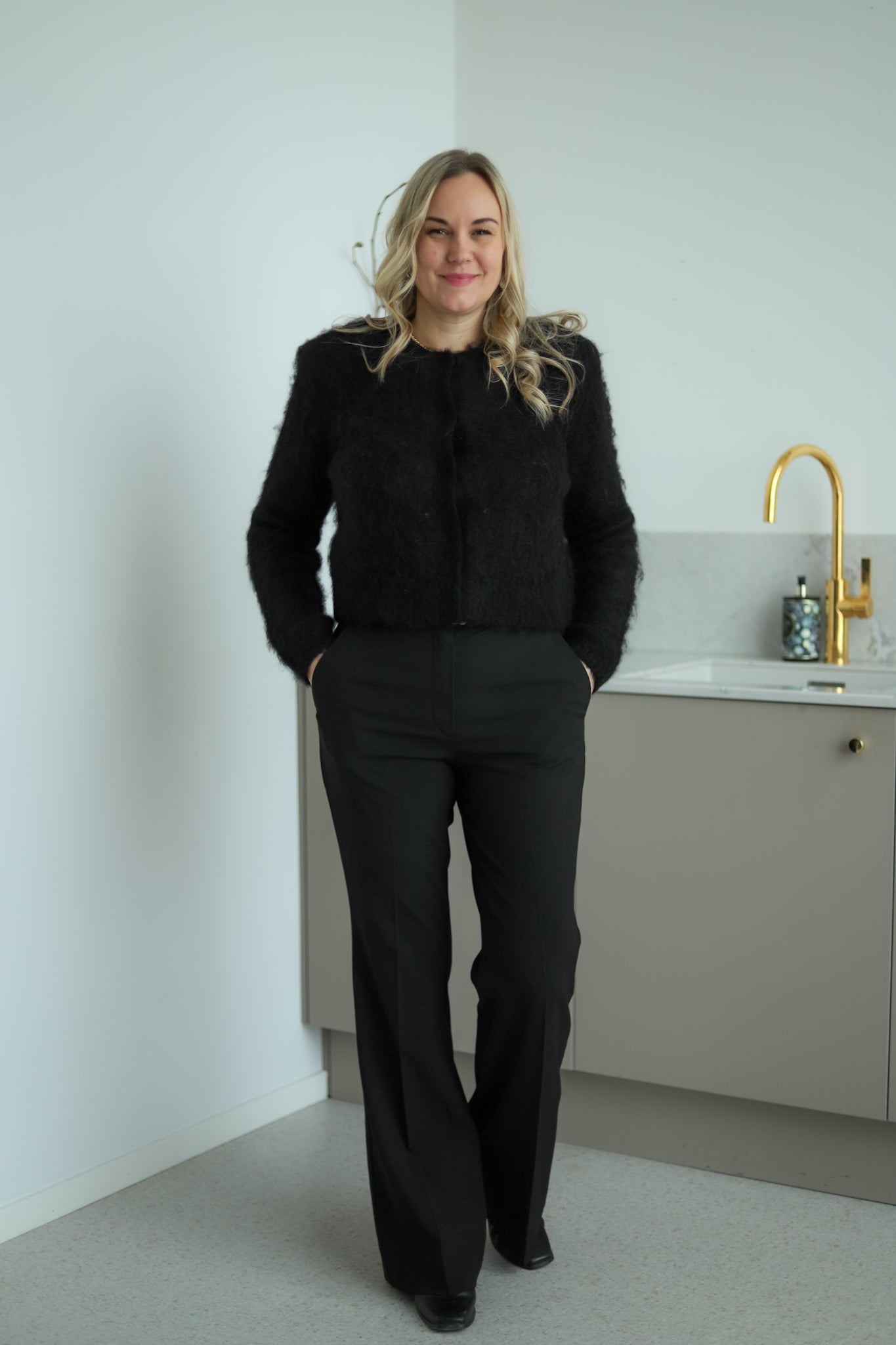Nydelig cardigan i klassisk sort fra byTiMo. Modellen er rett med lett croppet lengde. Lange smale ermer med avtagbare skulderputer gir jakken det lille ekstra. Ribbestrikk i hals, hem og mansjett. Genseren er laget i deilig alpakkamix og har en delikat fluffy overflate. Med sin nette lengde er denne cardigan perfekte til både jeans, skjørt og over en kjole.