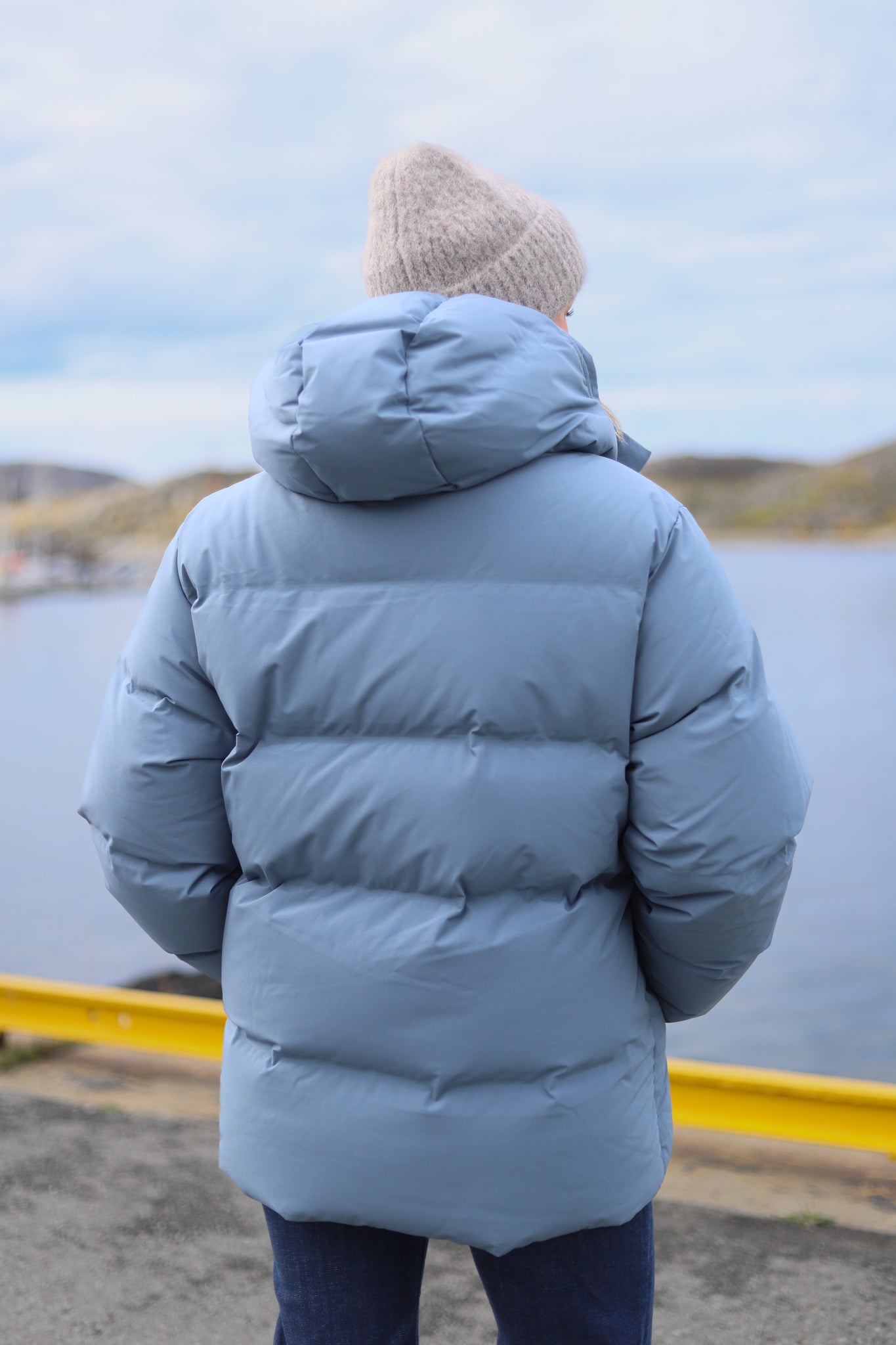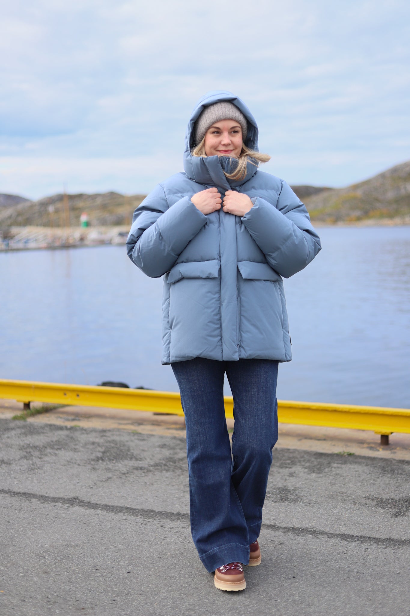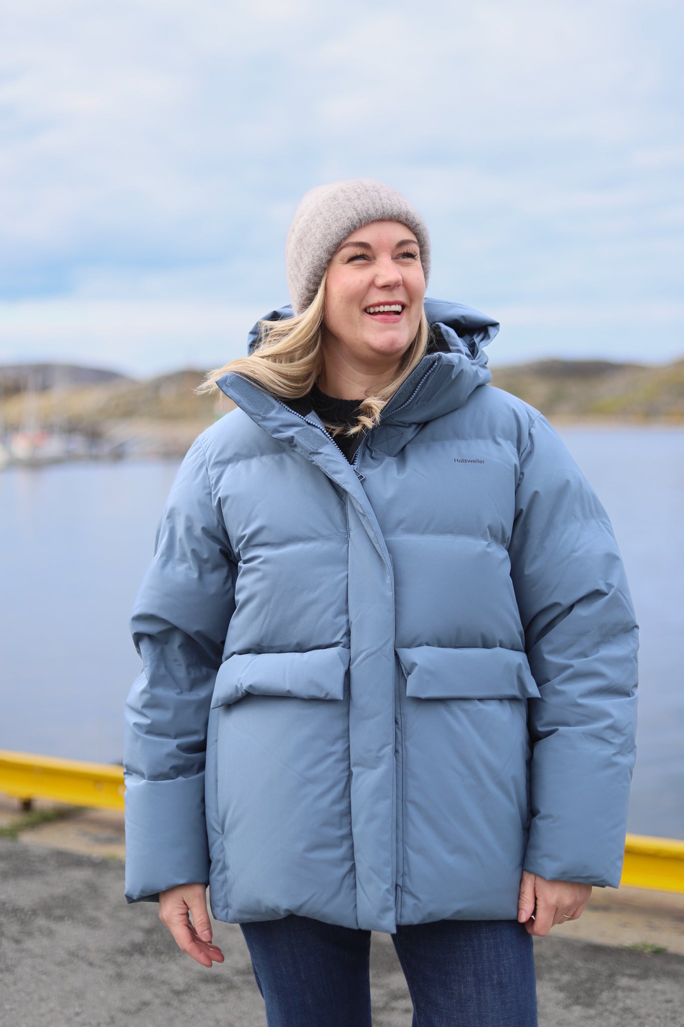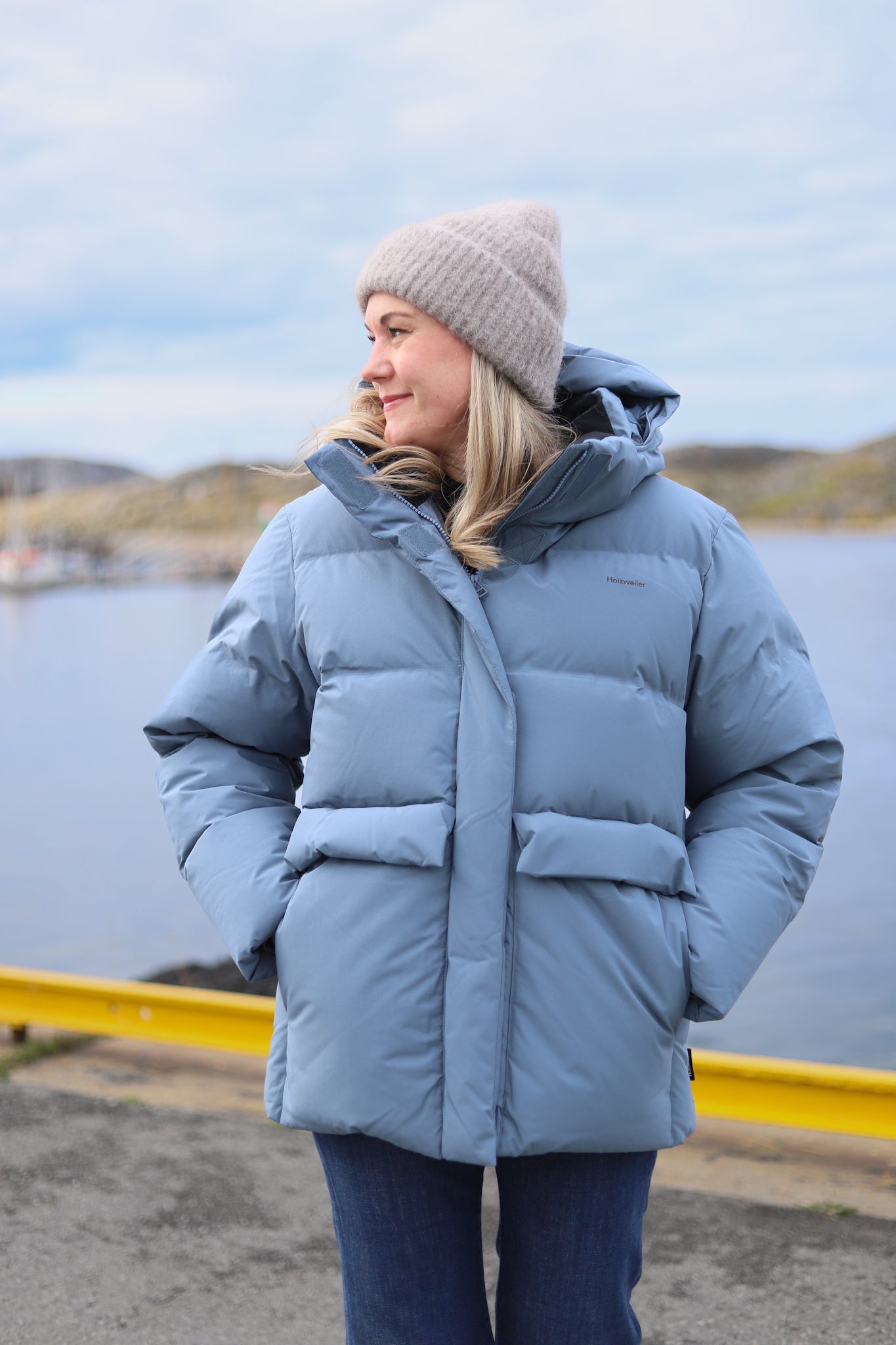 Bestselgeren Besseggen fra Holzweiler i en ny blå farge. Fluffy og oversized jakke som er lett i vekt, quiltet i brede kanaler. Fylt med ypperste dunblanding 80/20. Modellen er rett med pen lengde rett nedenfor baken. Jakken har avtagbar hette og stikklommer med klaff i hoftehøyde. Lukkning med med glidelås og stormklaff med borrelås i front. En teknisk god jakke som er vindtett og har 10.000mm i vannsøyle, overflaten har en hydrofil membran som gjør den vannavstøtende. Jakken varmer helt ned i -15 grader.