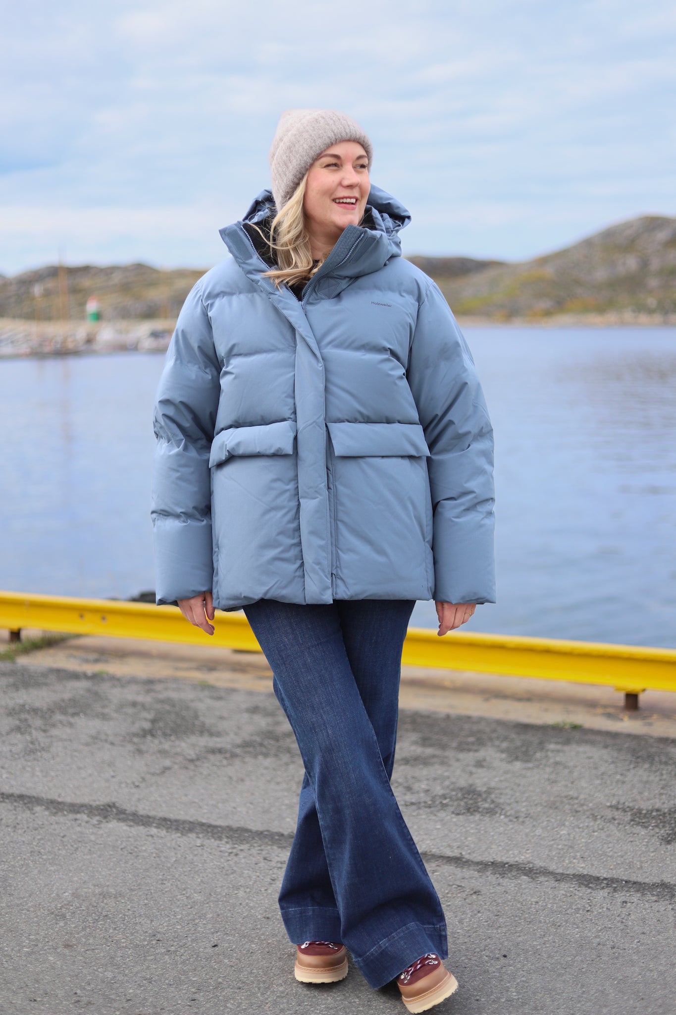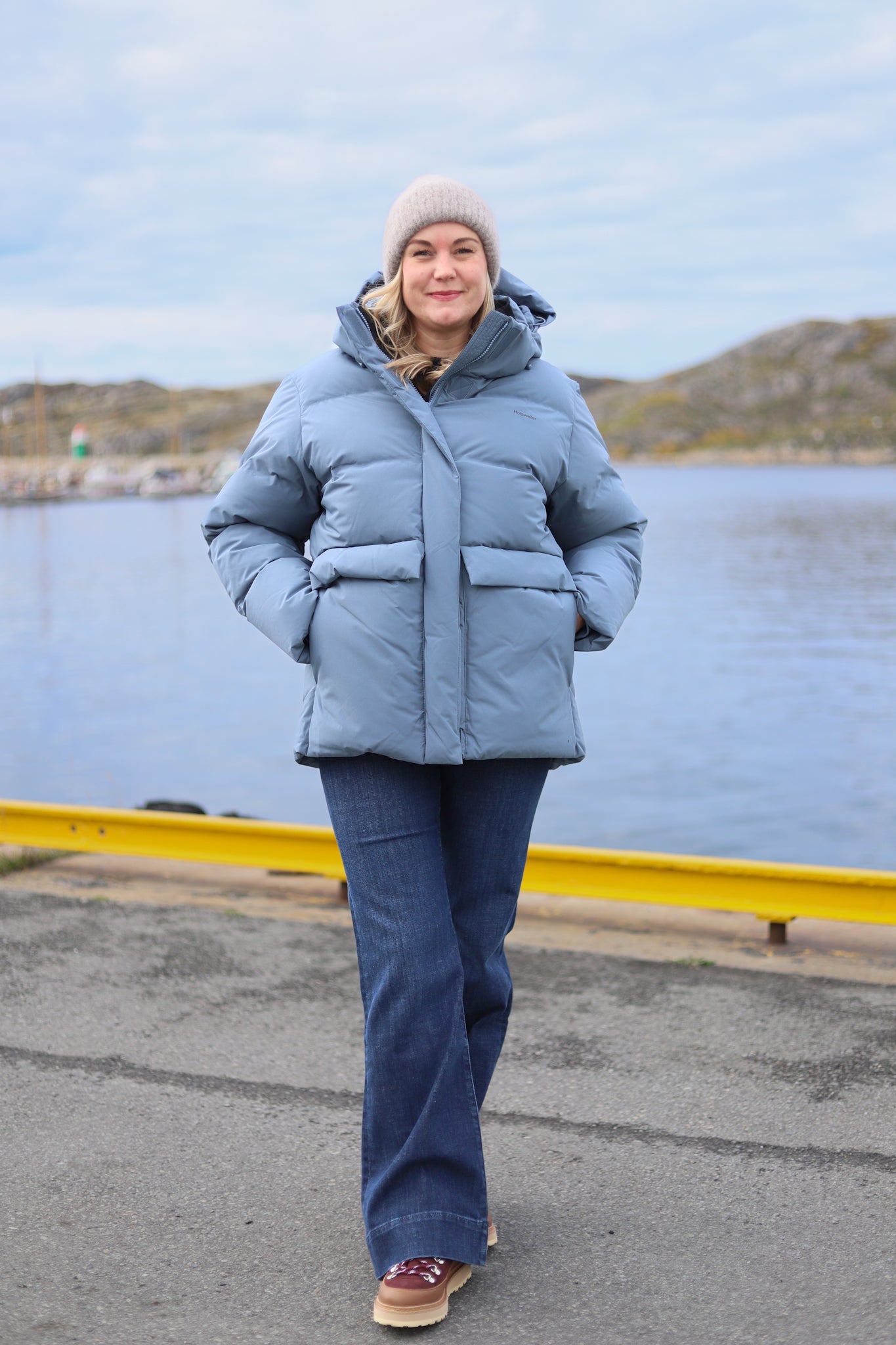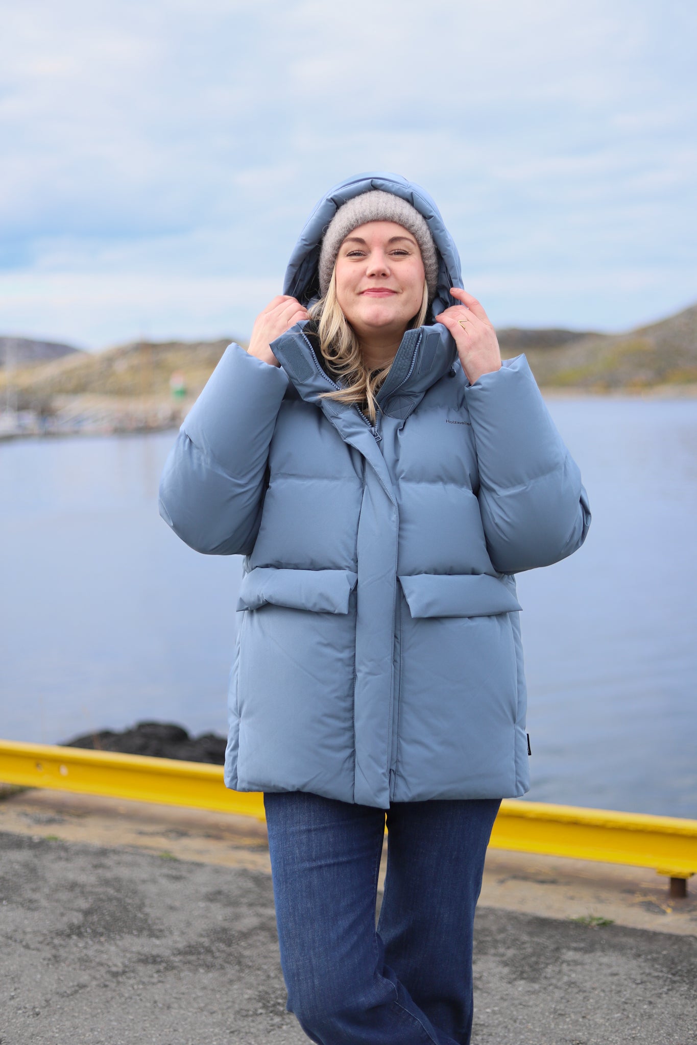 Bestselgeren Besseggen fra Holzweiler i en ny blå farge. Fluffy og oversized jakke som er lett i vekt, quiltet i brede kanaler. Fylt med ypperste dunblanding 80/20. Modellen er rett med pen lengde rett nedenfor baken. Jakken har avtagbar hette og stikklommer med klaff i hoftehøyde. Lukkning med med glidelås og stormklaff med borrelås i front. En teknisk god jakke som er vindtett og har 10.000mm i vannsøyle, overflaten har en hydrofil membran som gjør den vannavstøtende. Jakken varmer helt ned i -15 grader.
