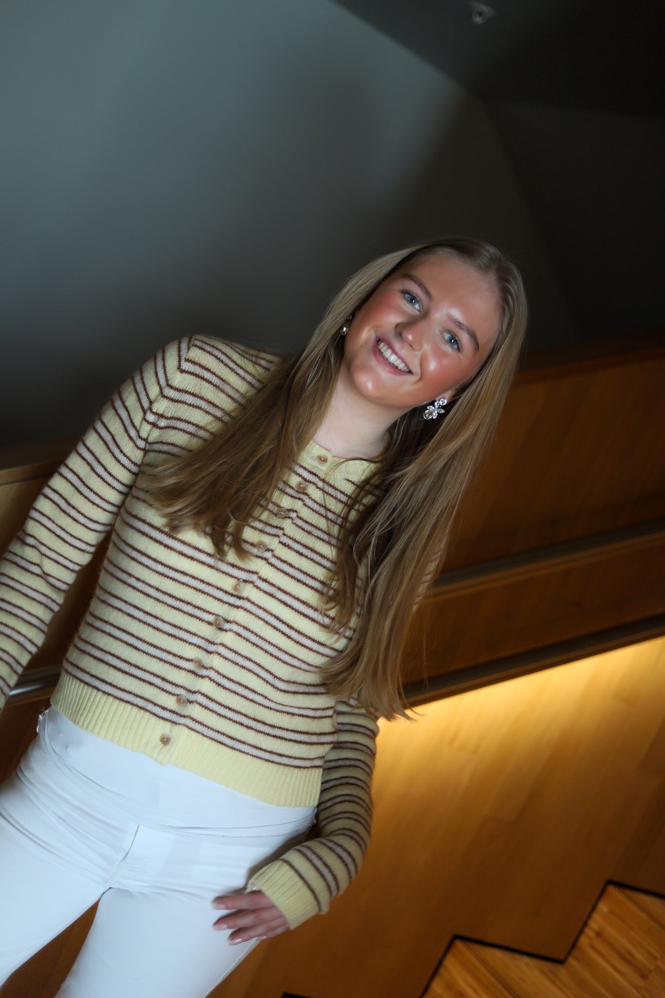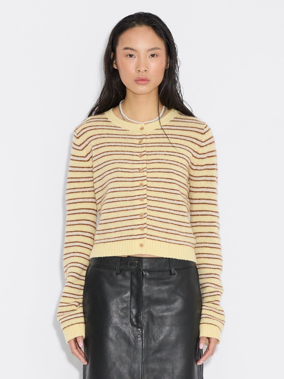 Trendy cardigan i lys gul med striper i lys brun og lys rosa fra Holzweiler. Modellen er tettsittende med rund hals, knepping i front og lange ermer. Den har ribbestrikk i hals, hem og mansjett. Laget i en supermyk, alpakkaullblanding av høy kvalitet. Cardigan er perfekt for den ultimate lag-på-lag-stilen, style den med sesongens kuleste bukser eller skjørt.