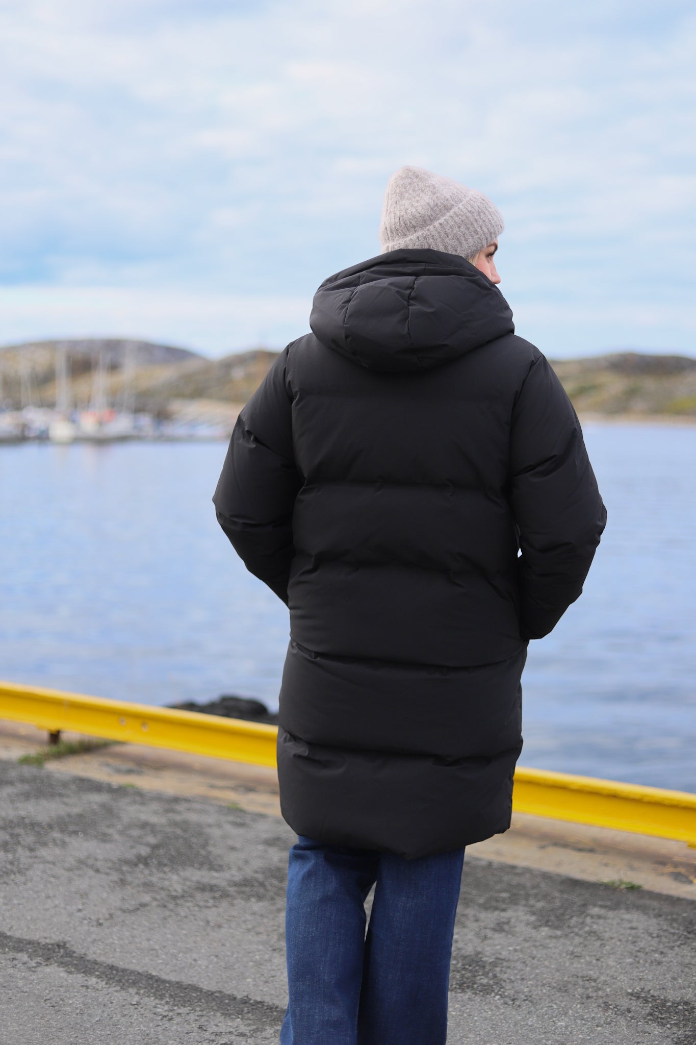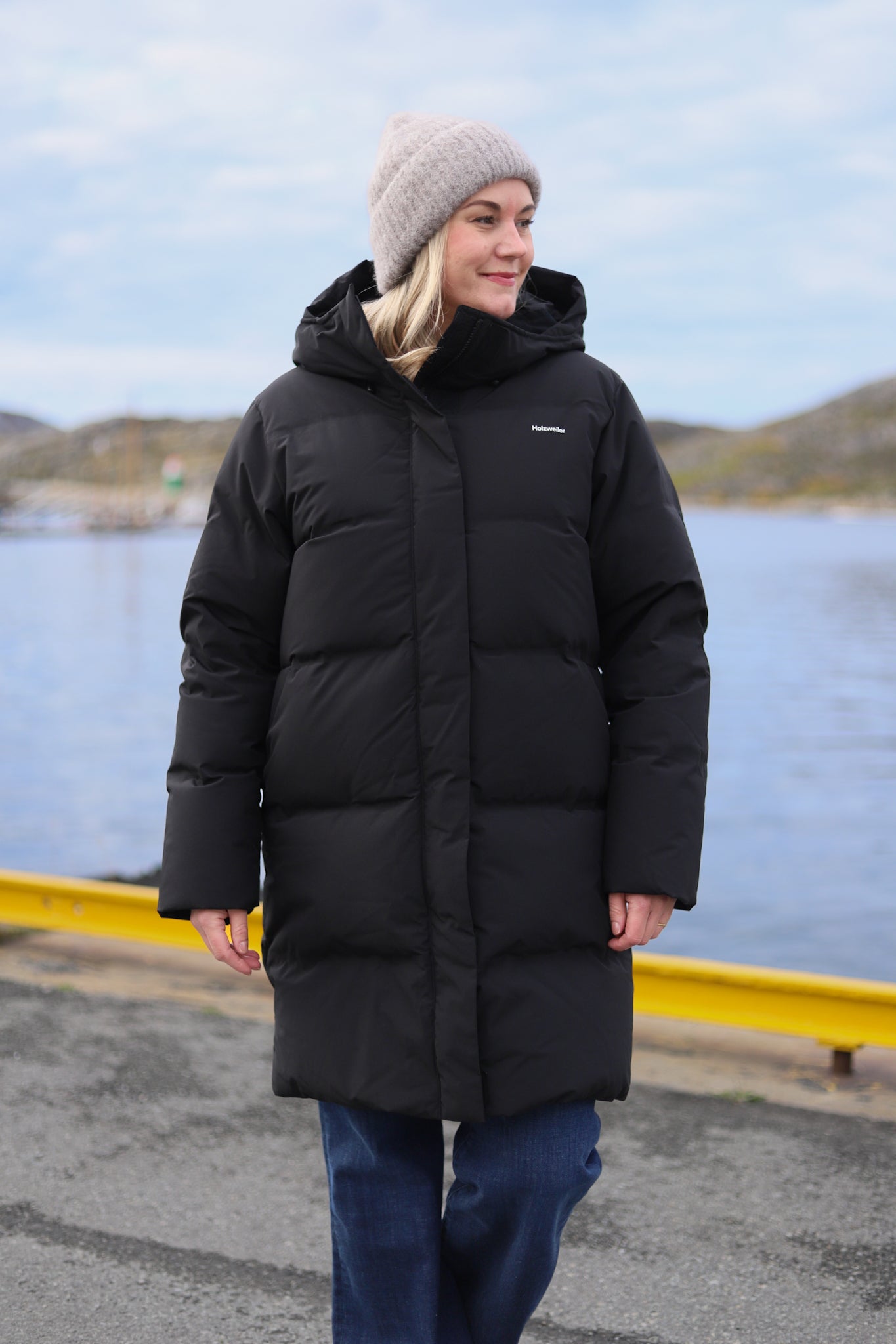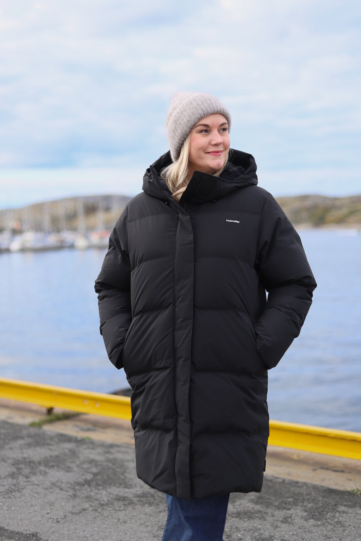 Modellen Loen er her i tidløs sort med liten Holzweiler logo på brystet. Fluffy og oversized jakke som er lett i vekt, quiltet i brede kanaler. Fylt med ypperste dunblanding 80/20. Modellen er rett med god lengde til rett over kneet. Jakken har avtagbar hette og skålommer med glidelås i hoftehøyde. Lukkning med med glidelås og stormklaff med borrelås i front. En teknisk god jakke som er vindtett og har 10.000mm i vannsøyle, overflaten har en hydrofil membran som gjør den vannavstøtende. Jakken varmer helt ned i -15 garder.