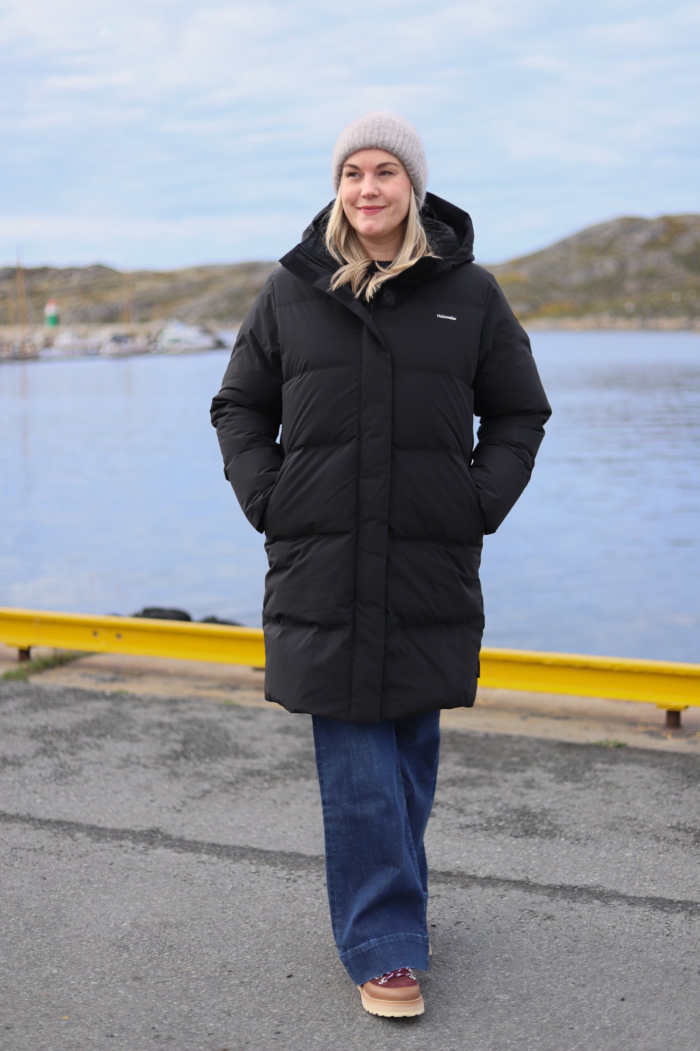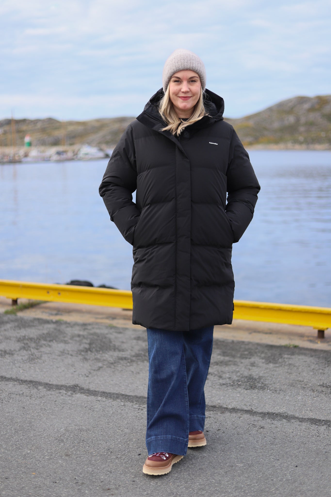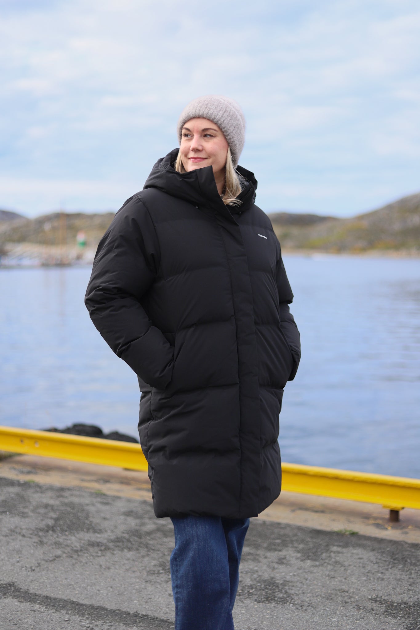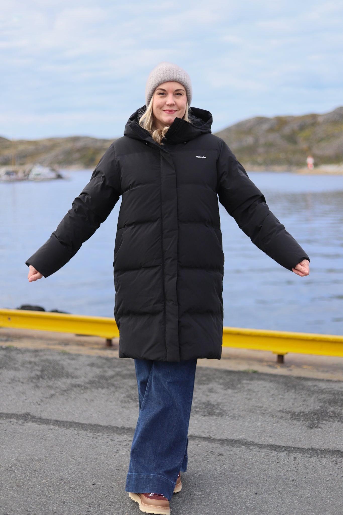 Modellen Loen er her i tidløs sort med liten Holzweiler logo på brystet. Fluffy og oversized jakke som er lett i vekt, quiltet i brede kanaler. Fylt med ypperste dunblanding 80/20. Modellen er rett med god lengde til rett over kneet. Jakken har avtagbar hette og skålommer med glidelås i hoftehøyde. Lukkning med med glidelås og stormklaff med borrelås i front. En teknisk god jakke som er vindtett og har 10.000mm i vannsøyle, overflaten har en hydrofil membran som gjør den vannavstøtende. Jakken varmer helt ned i -15 garder.