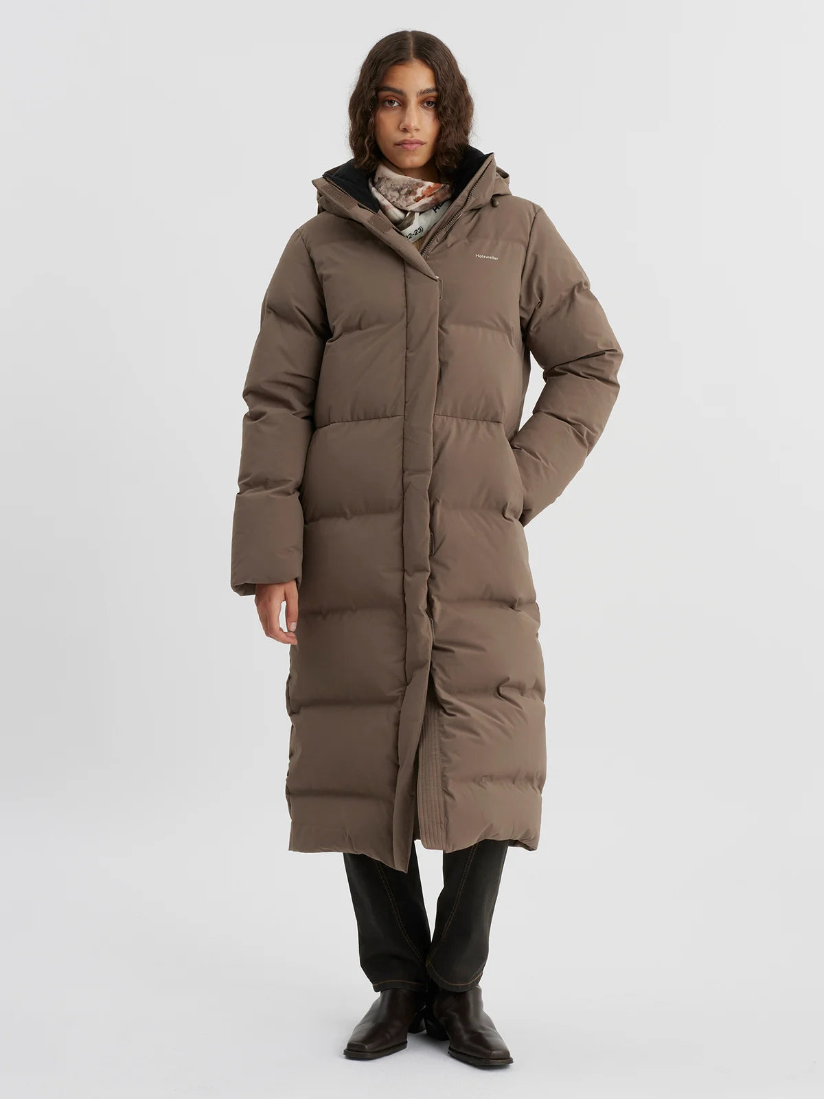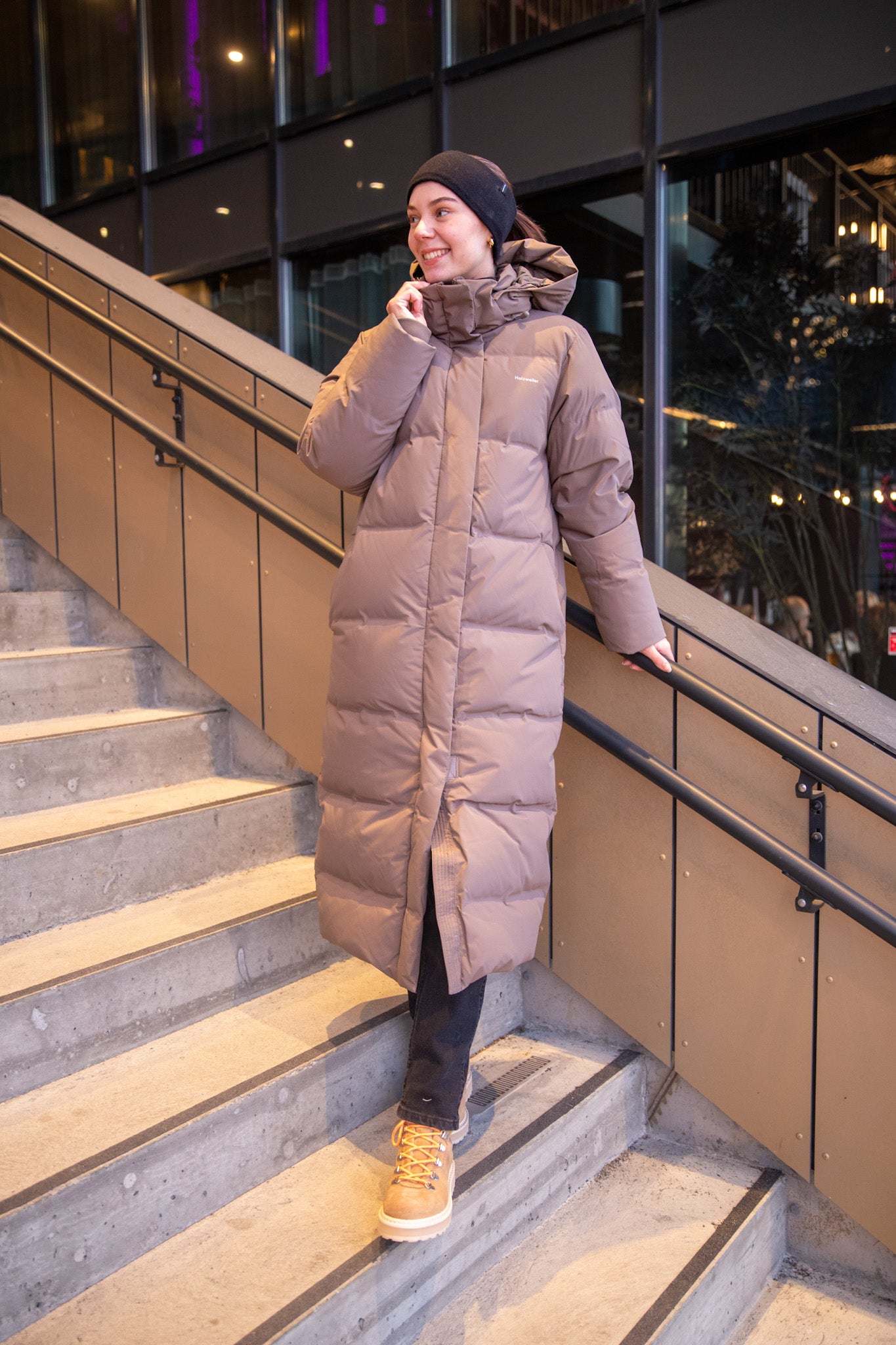 Fluffy og oversized jakke som er lett i vekt, quiltet i brede kanaler. Fylt med ypperste dunblanding 80/20. Modellen er rett med lengde midt på leggen. Jakken har avtagbar hette og skålommer med glidelås i hoftehøyde. Lukkning med med glidelås og stormklaff med borrelås i front. En teknisk god jakke som er vindtett og har 10.000mm i vannsøyle, overflaten har en hydrofil membran som gjør den vannavstøtende. Jakken varmer helt ned i -15 garder.