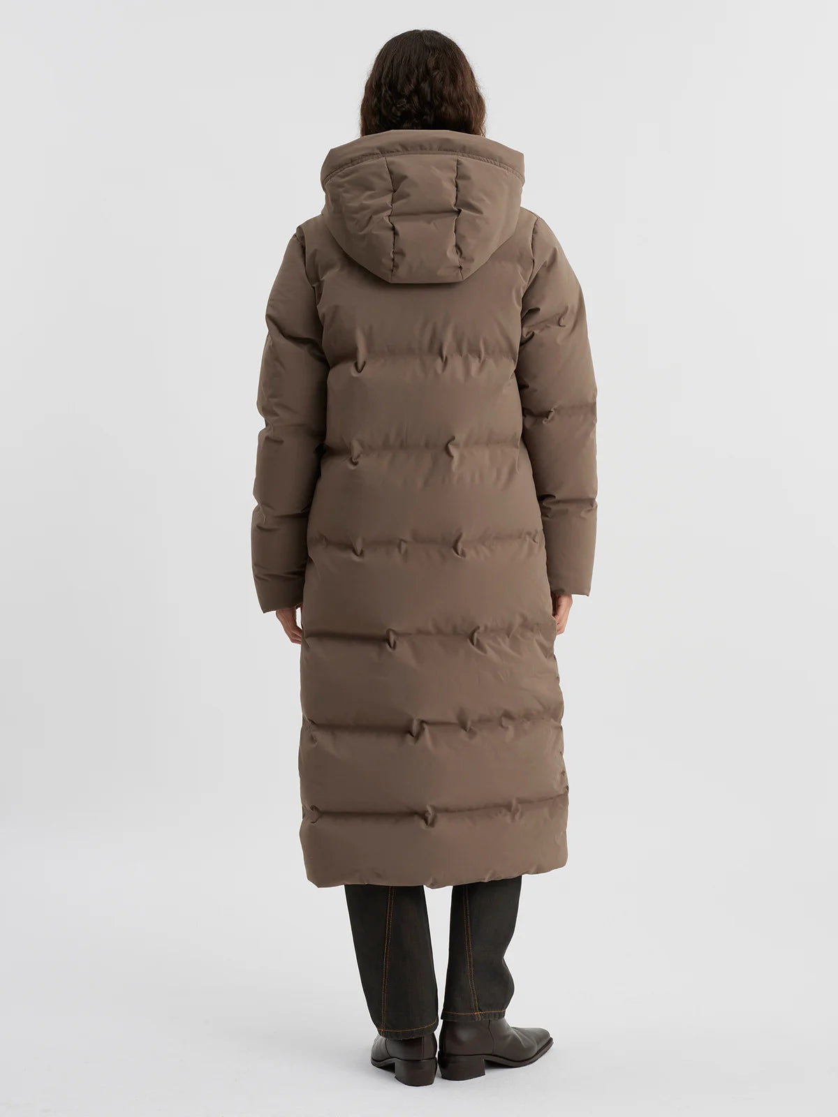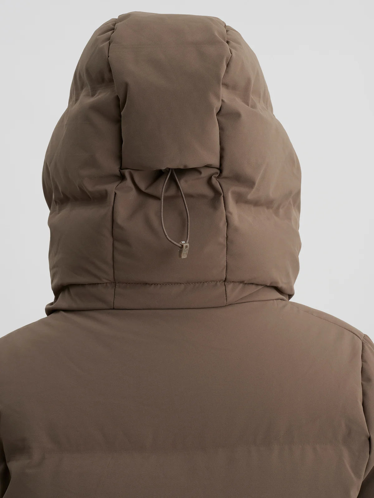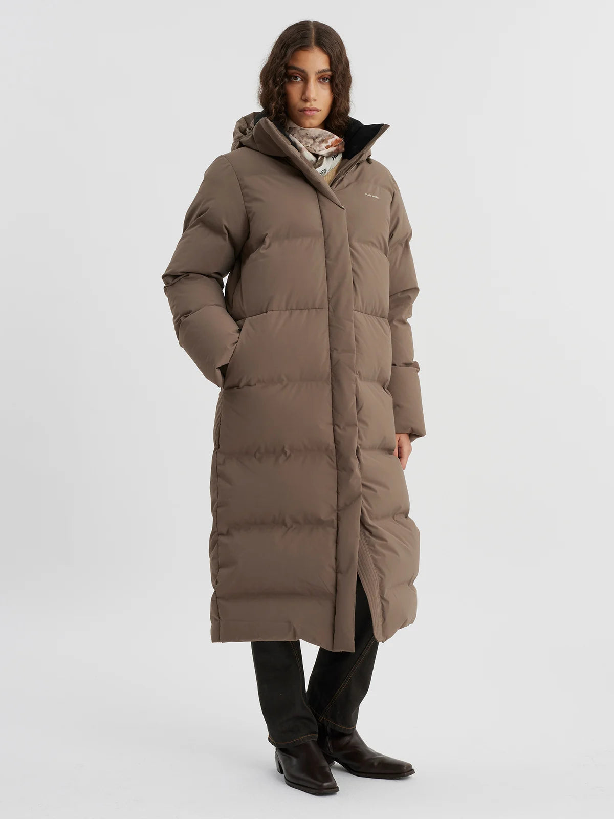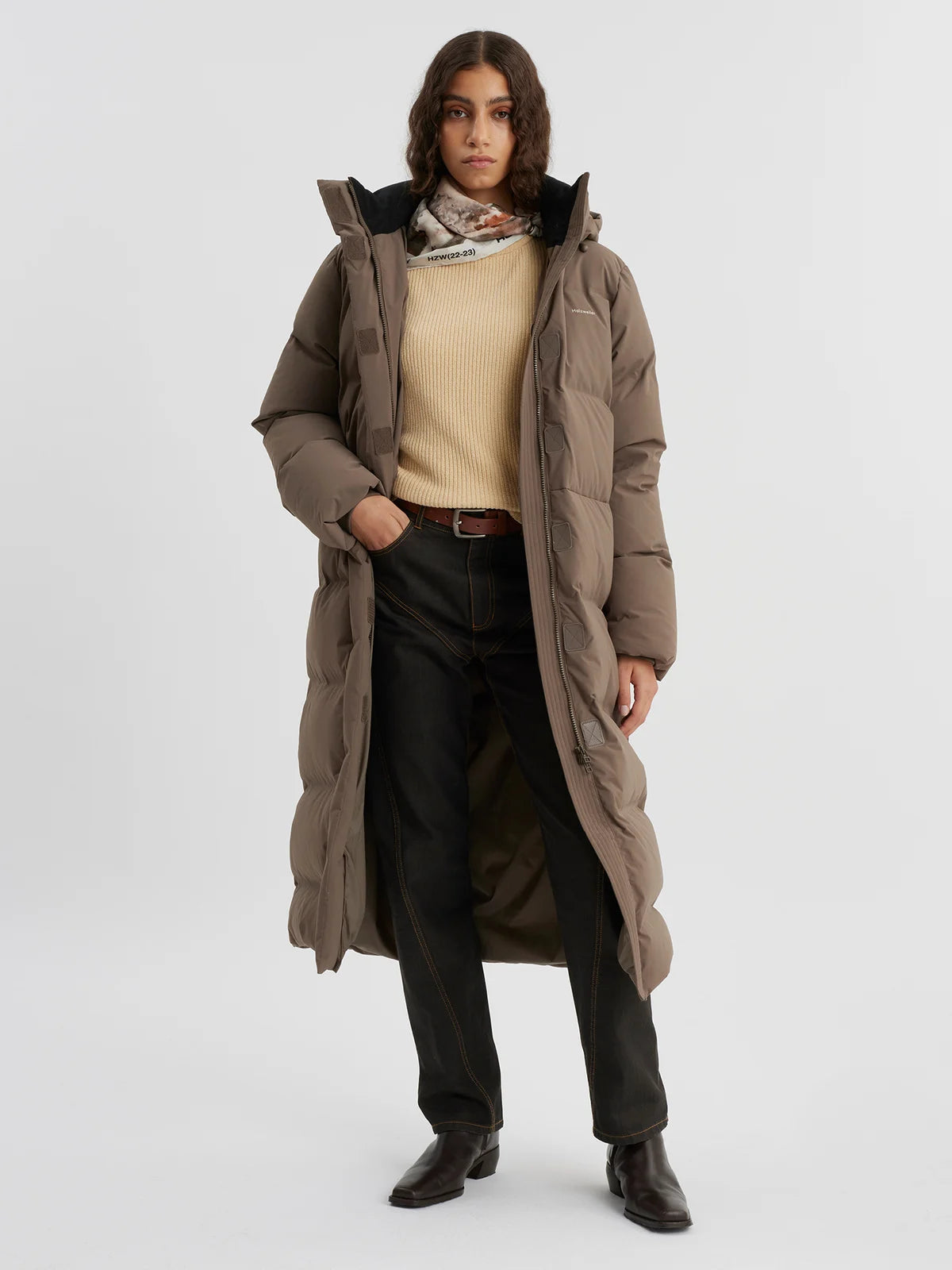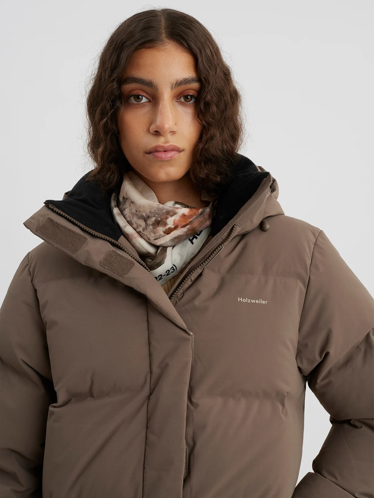 Glittertind er en ny lang dunkåpe fra Holzweiler, men samme tekniske egenskaper som bestselgerne Besseggen og Loen. Her i en nydelig matt muldvarp-brun farge med liten hvit Holzweiler-logo på brystet.