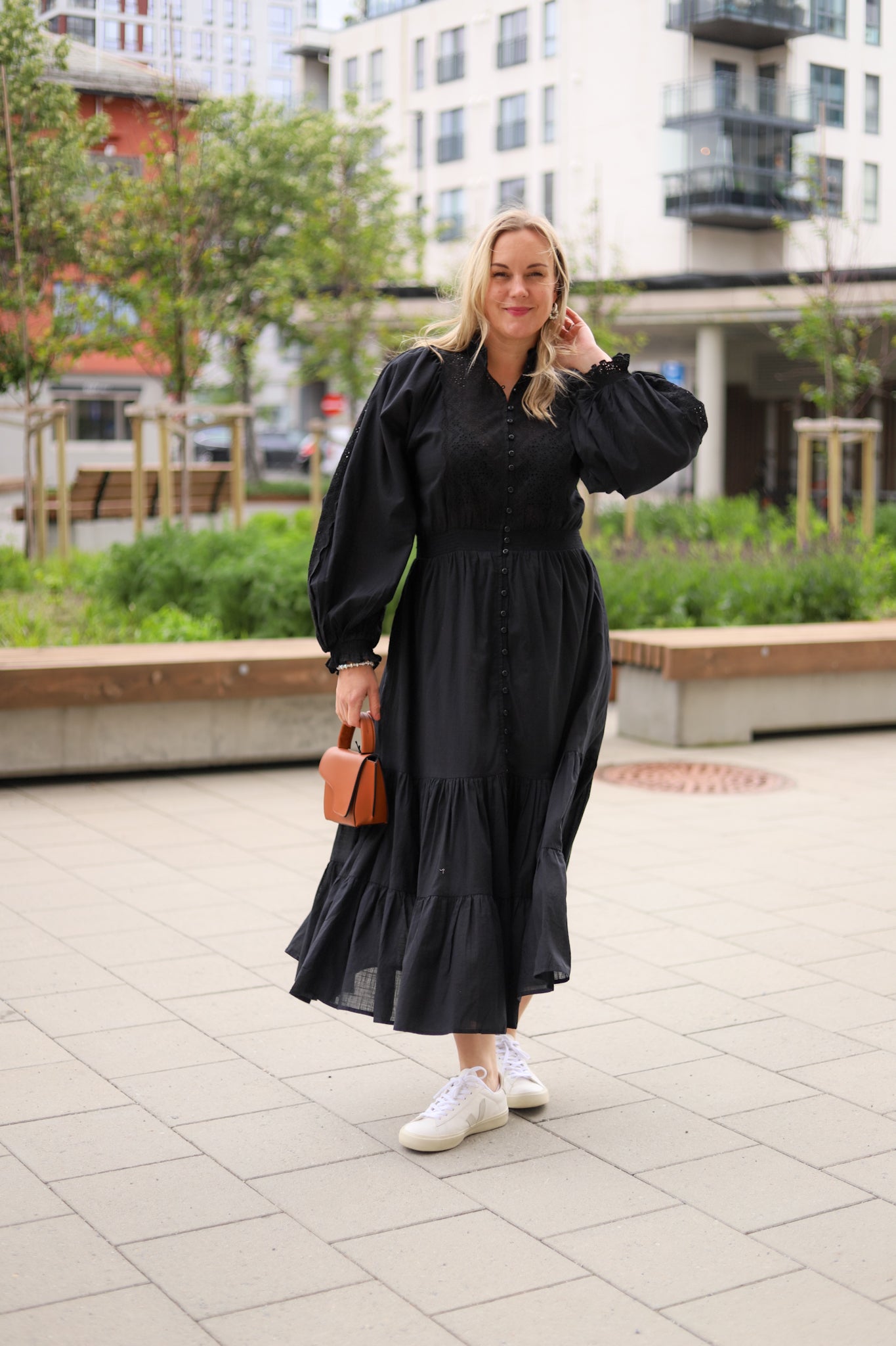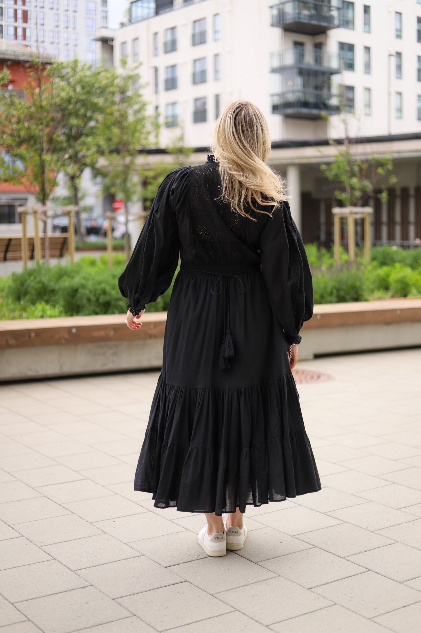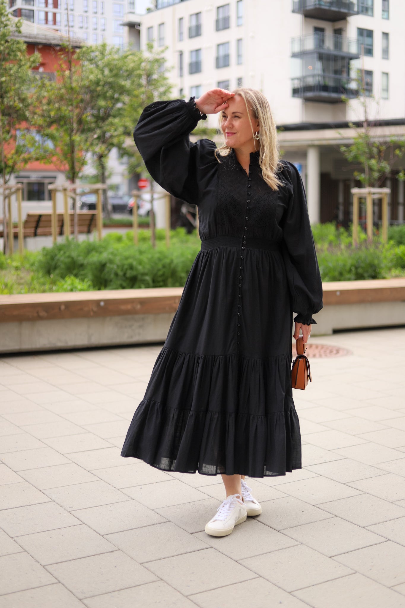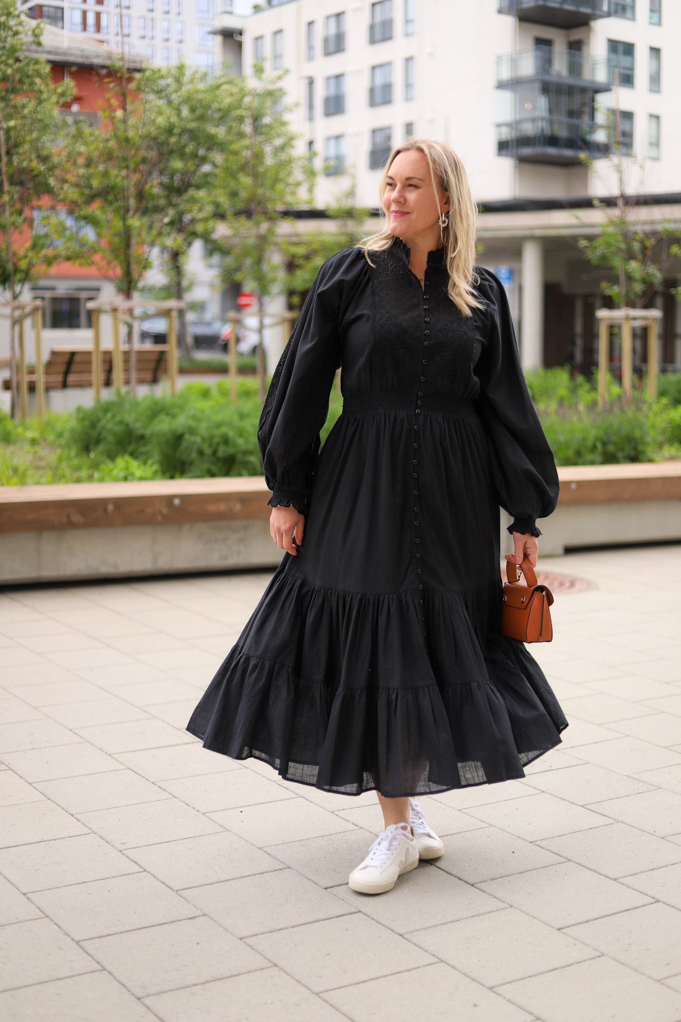 Vakker helsort midikjole fra by TiMo. Modellen har nydelige engelske blonder og lekre detaljer ton-i-ton. Rund krage med frill og knepping i front. Den har voluminøse lange ermer med elastikk og blondekant. Kjolen har et feminint snitt med flatterende smock som markerer midjen perfekt. Skjørtet skrår ut med vidde, avsluttes med kappe og lengden stopper midt på leggen. Kjolen er delvis fóret, har stikklommer i sidesømmen og søte lisser i midjen. De romantiske broderiene pryder kjolen over brystet, i ryggen. i mansjett og krage. Deilig myk og lett kvalitet. En fantastisk flott vintage inspirert kjole, som du enkelt kan pynte opp eller ned etter anledningen.