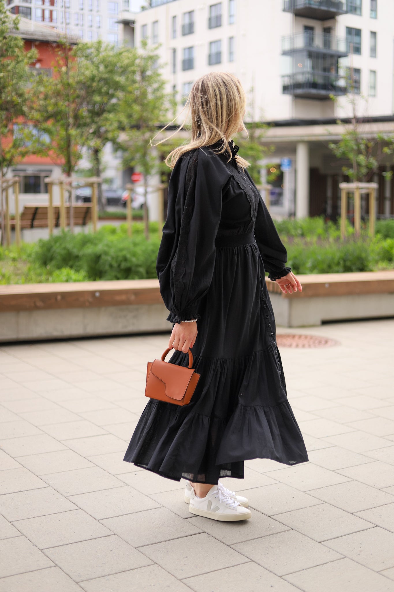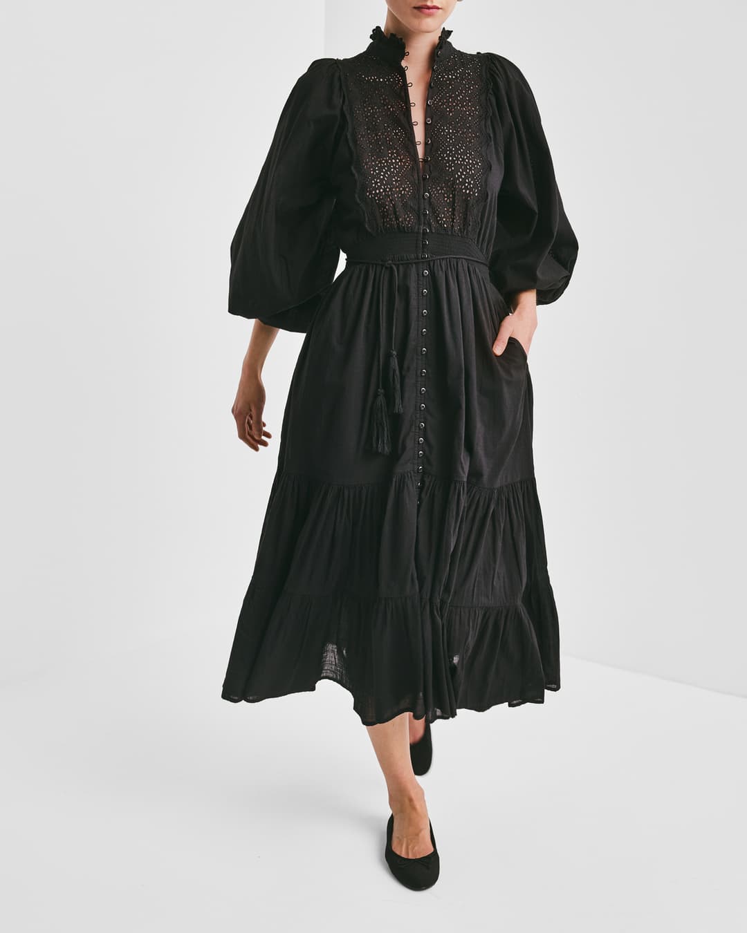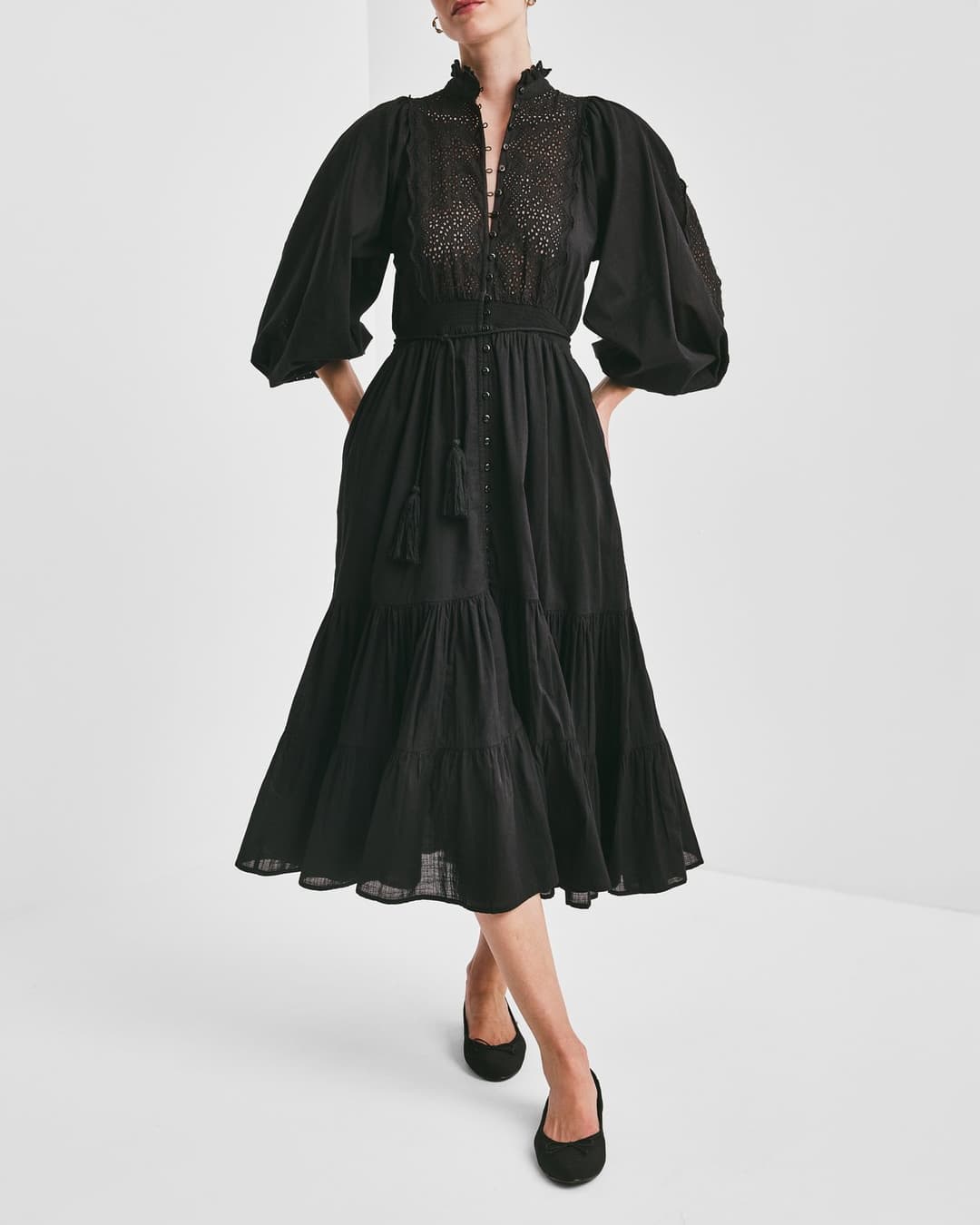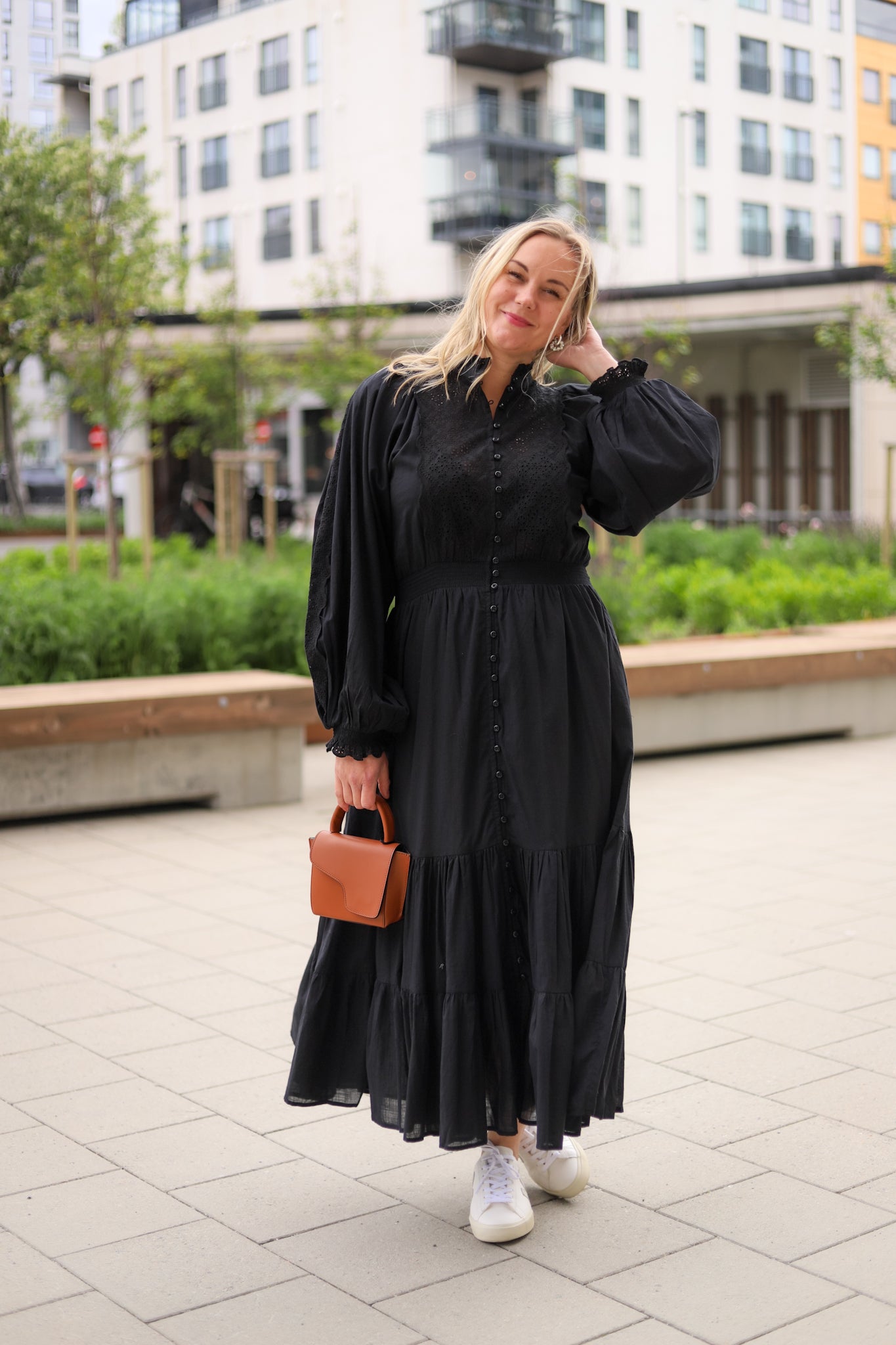 Vakker helsort midikjole fra by TiMo. Modellen har nydelige engelske blonder og lekre detaljer ton-i-ton. Rund krage med frill og knepping i front. Den har voluminøse lange ermer med elastikk og blondekant. Kjolen har et feminint snitt med flatterende smock som markerer midjen perfekt. Skjørtet skrår ut med vidde, avsluttes med kappe og lengden stopper midt på leggen. Kjolen er delvis fóret, har stikklommer i sidesømmen og søte lisser i midjen. De romantiske broderiene pryder kjolen over brystet, i ryggen. i mansjett og krage. Deilig myk og lett kvalitet. En fantastisk flott vintage inspirert kjole, som du enkelt kan pynte opp eller ned etter anledningen.