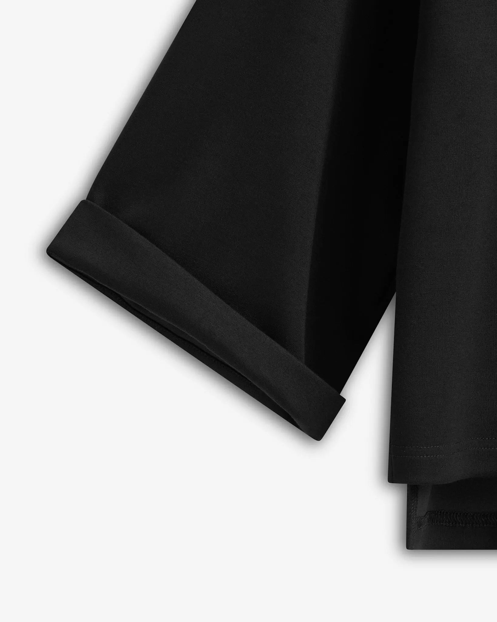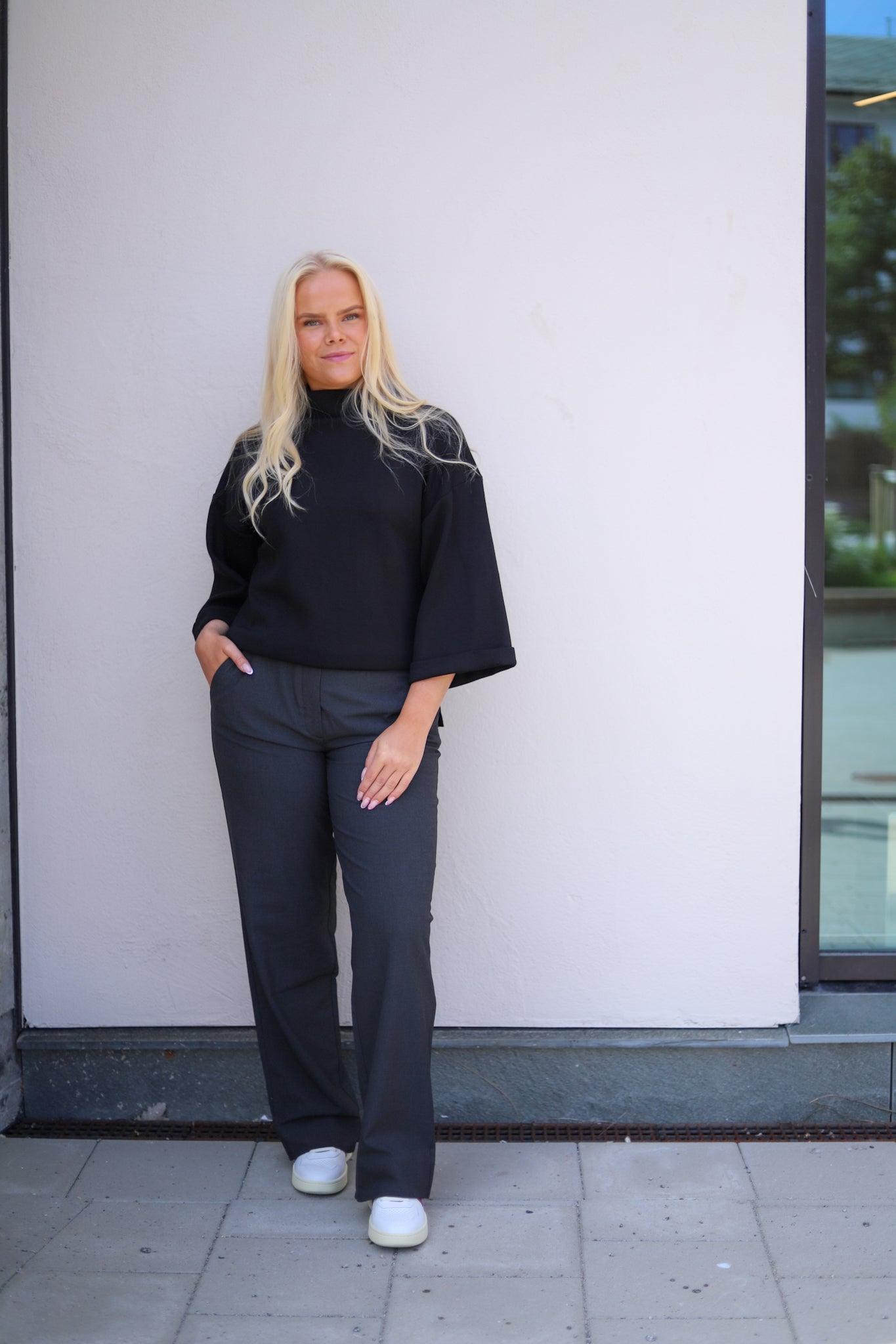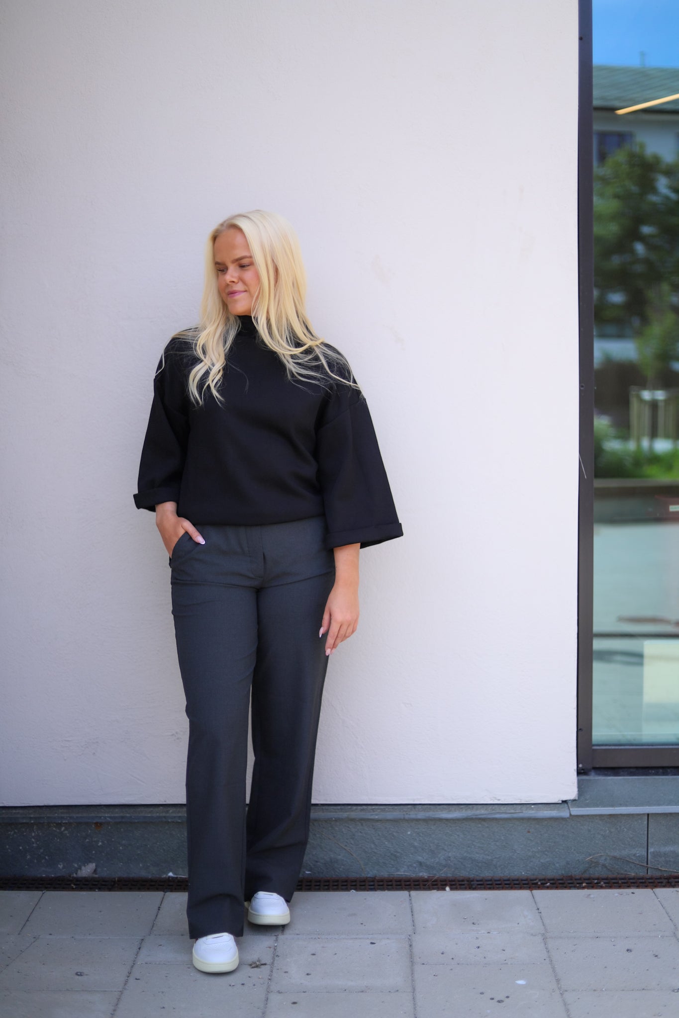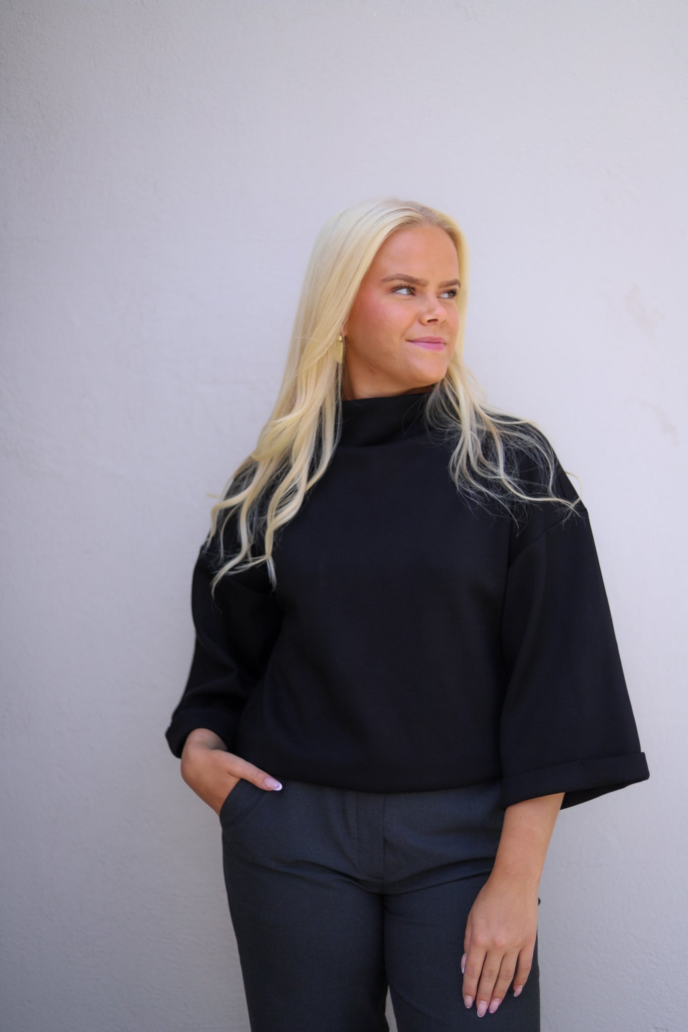 Stilren topp i klassisk sort fra Iben. Tidløs modell med rett passform og nett hoftelengde. Vid semihøy hals og vide trekvartlange ermer med droppet skulder og delikat oppbrett i mansjett. Det perfekte hverdagsplagget som passer til alt. Laget av en tykk viskosejersey av premiumkvalitet, den gir en luksuriøst myk følelse som føles behagelig mot huden.