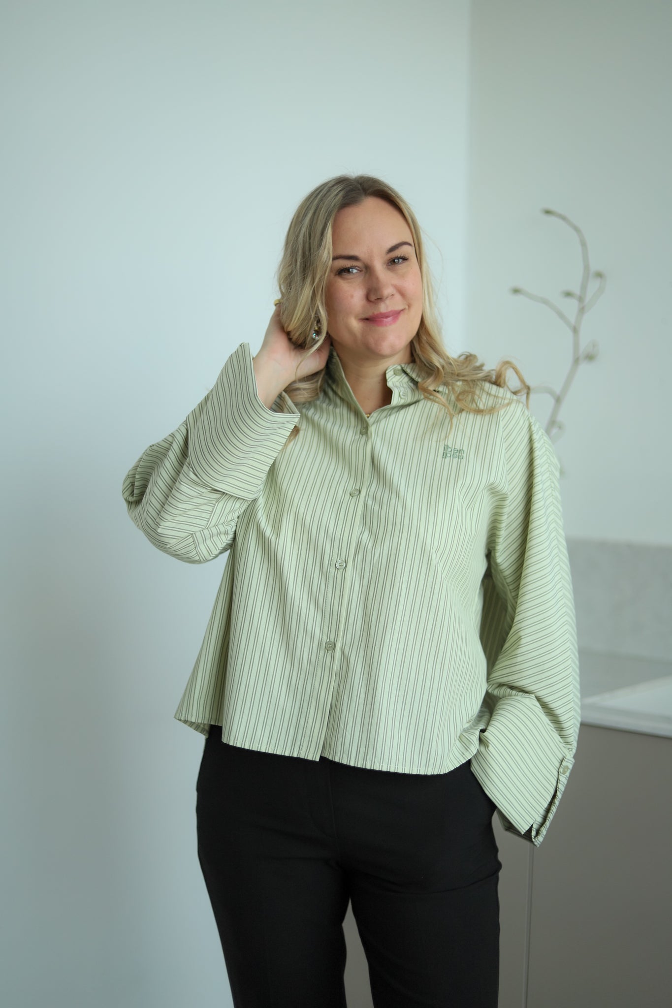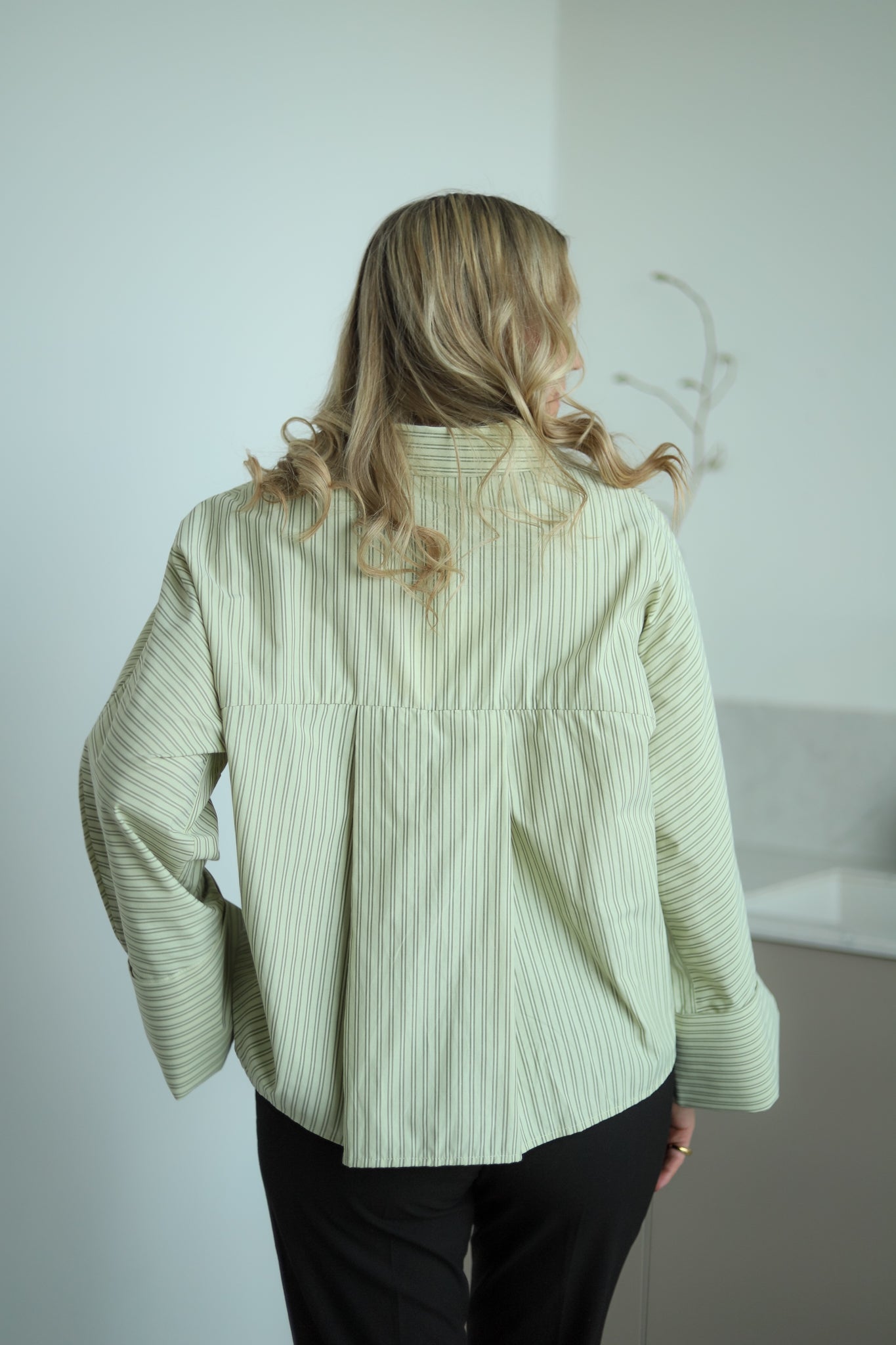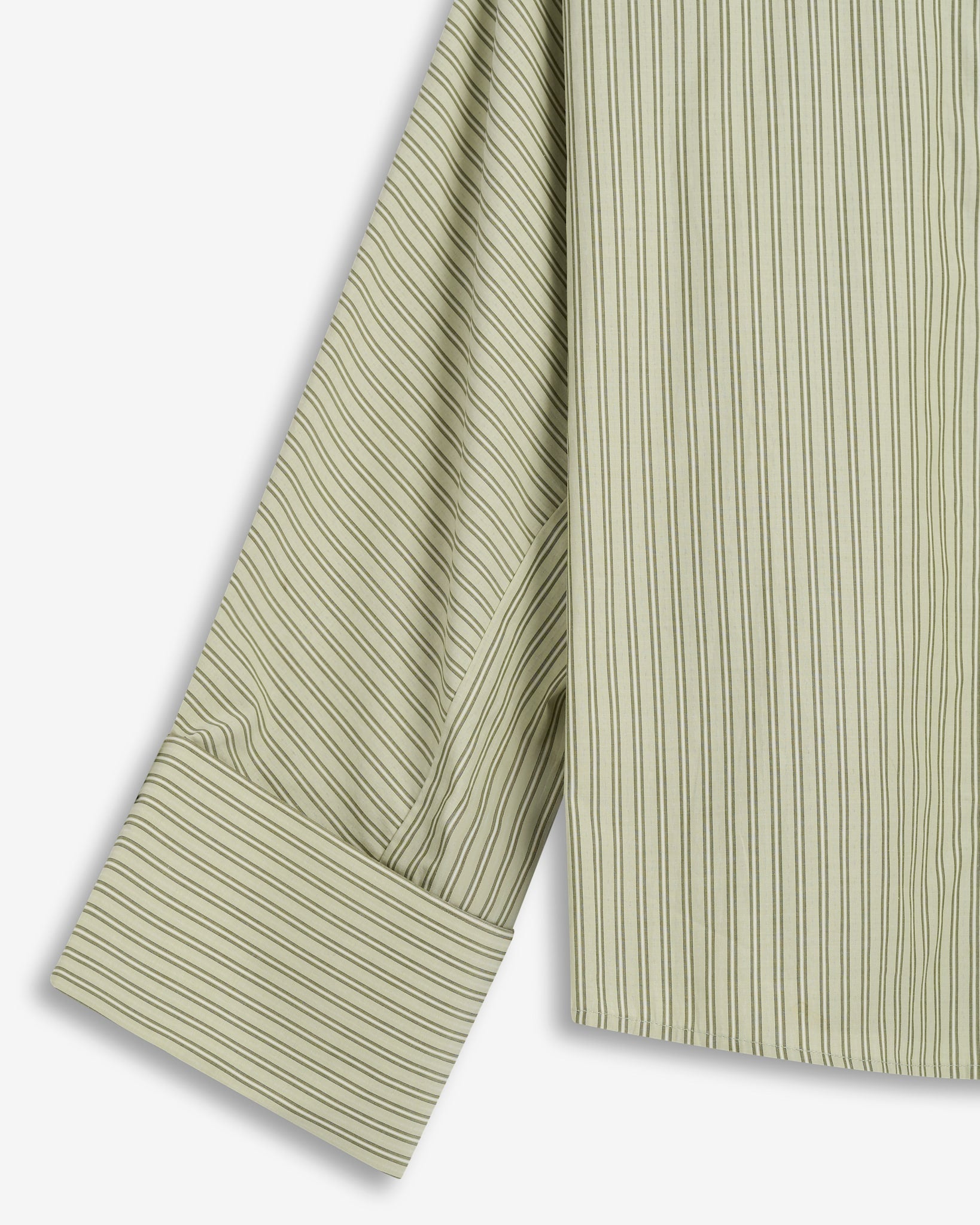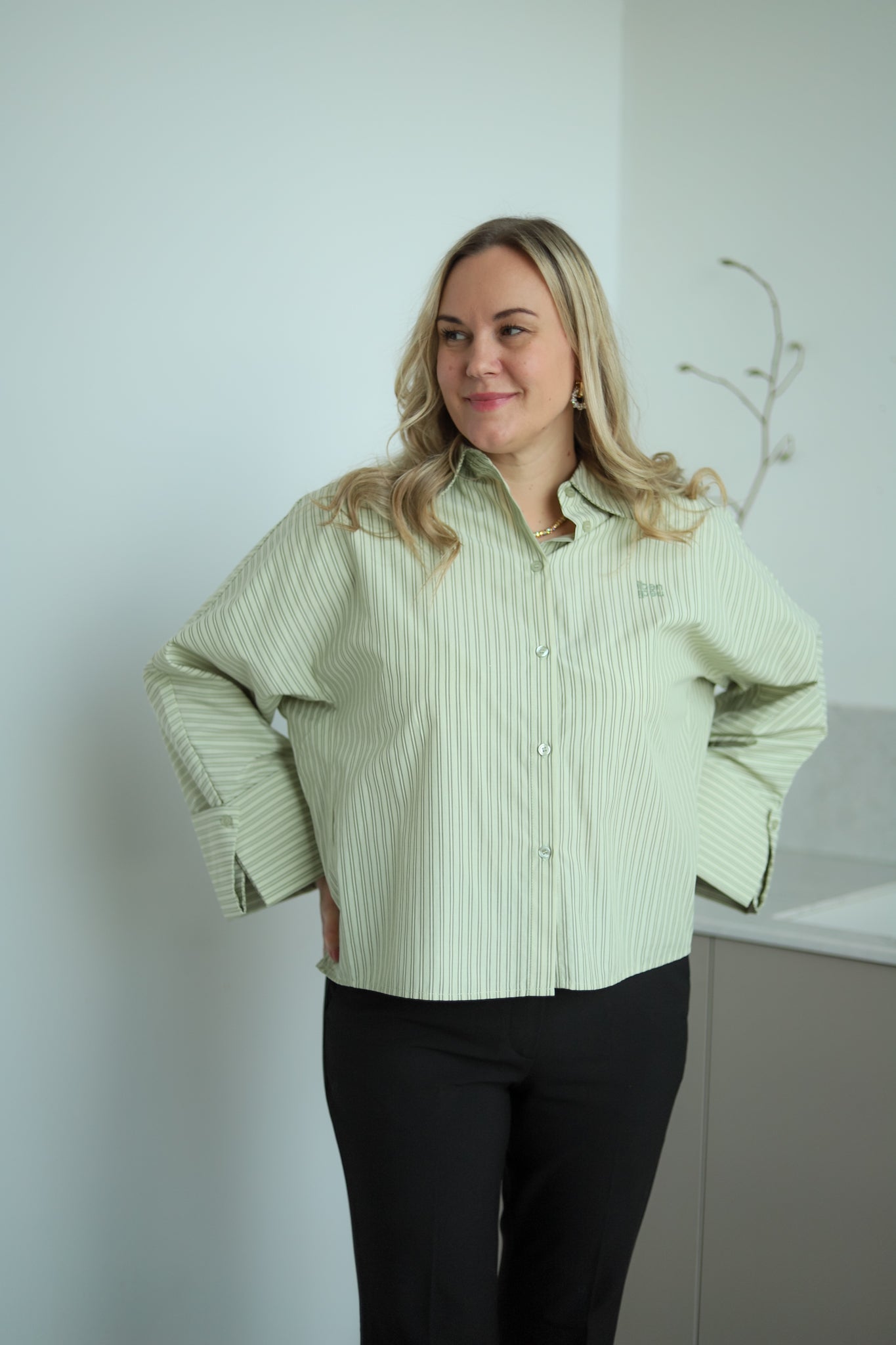 IT-skjorten Atari i sesongens grønn med striper fra Iben. Modellen har klassisk skjortekrage og kneppning ton-i-ton i front. Nett lengde og vidde i fasongen med legg bak som skaper et stilig uttrykk. Vide ermer med lett droppet skulder og bred oppbrettskant i mansjett med splitt og knapp. Klassisk skjorte med det lille ekstra som gir skjorten en unik statementlook.