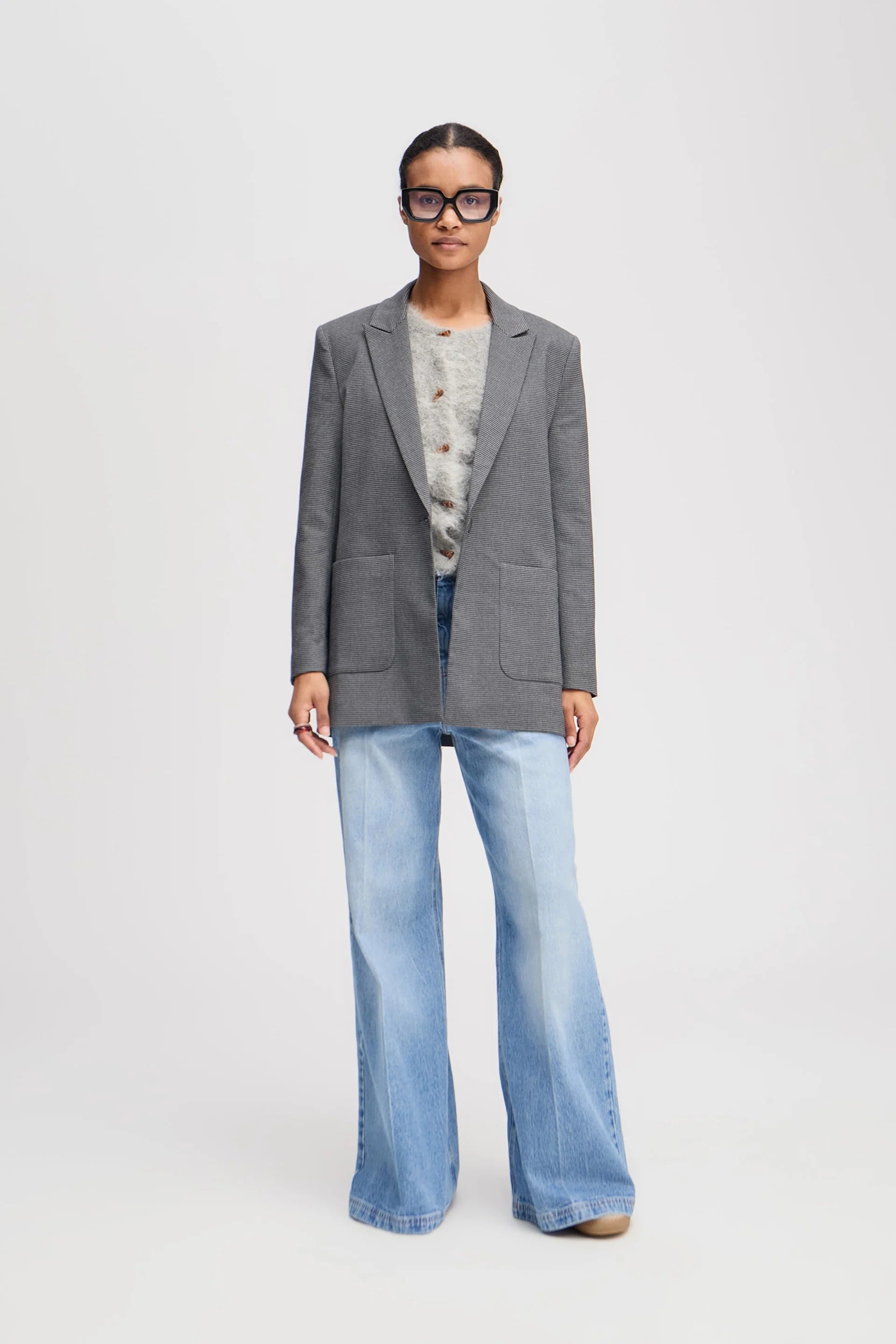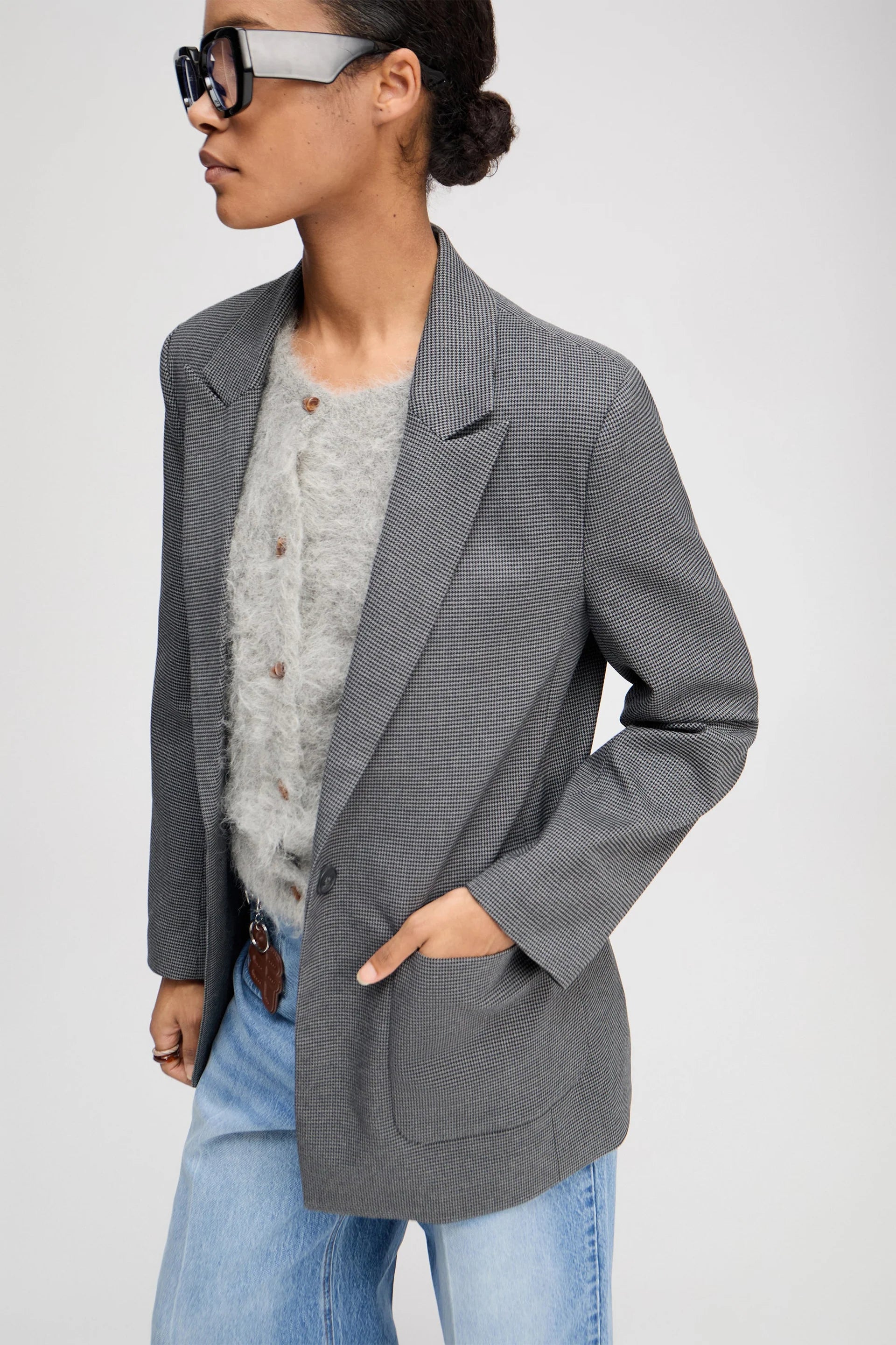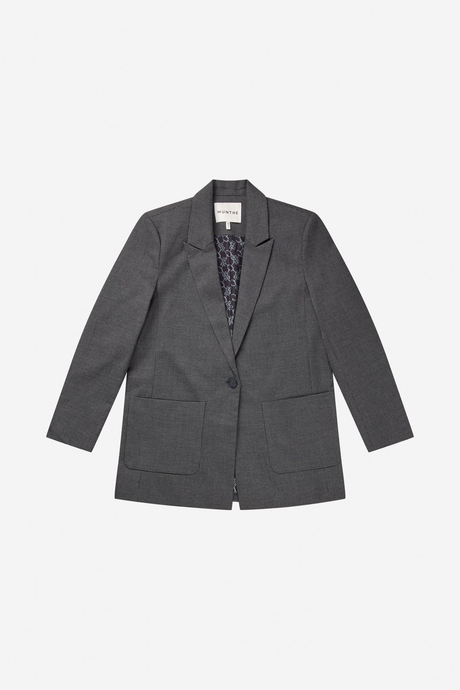 Blazer med trendy små ruter og patchlommer fra Munthe. Klassisk dressjakke med lange ermer og rett passform. Med elegante slag og lukkning med en knapp i front. Og som alltid gjennomført med et lekkert kontrast-fór inni. Tøff til jeans og elegant i sett med matchende dressbukser.