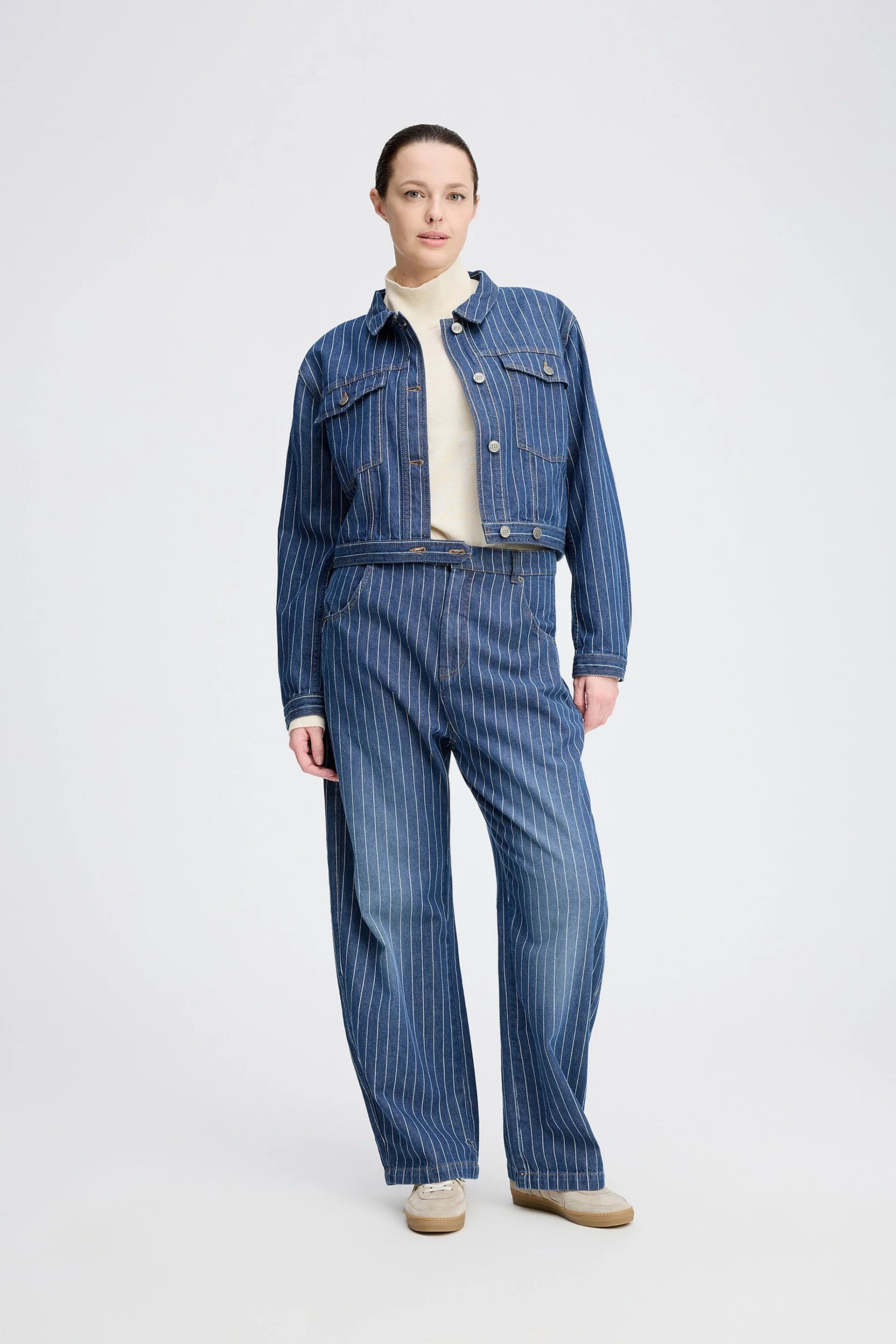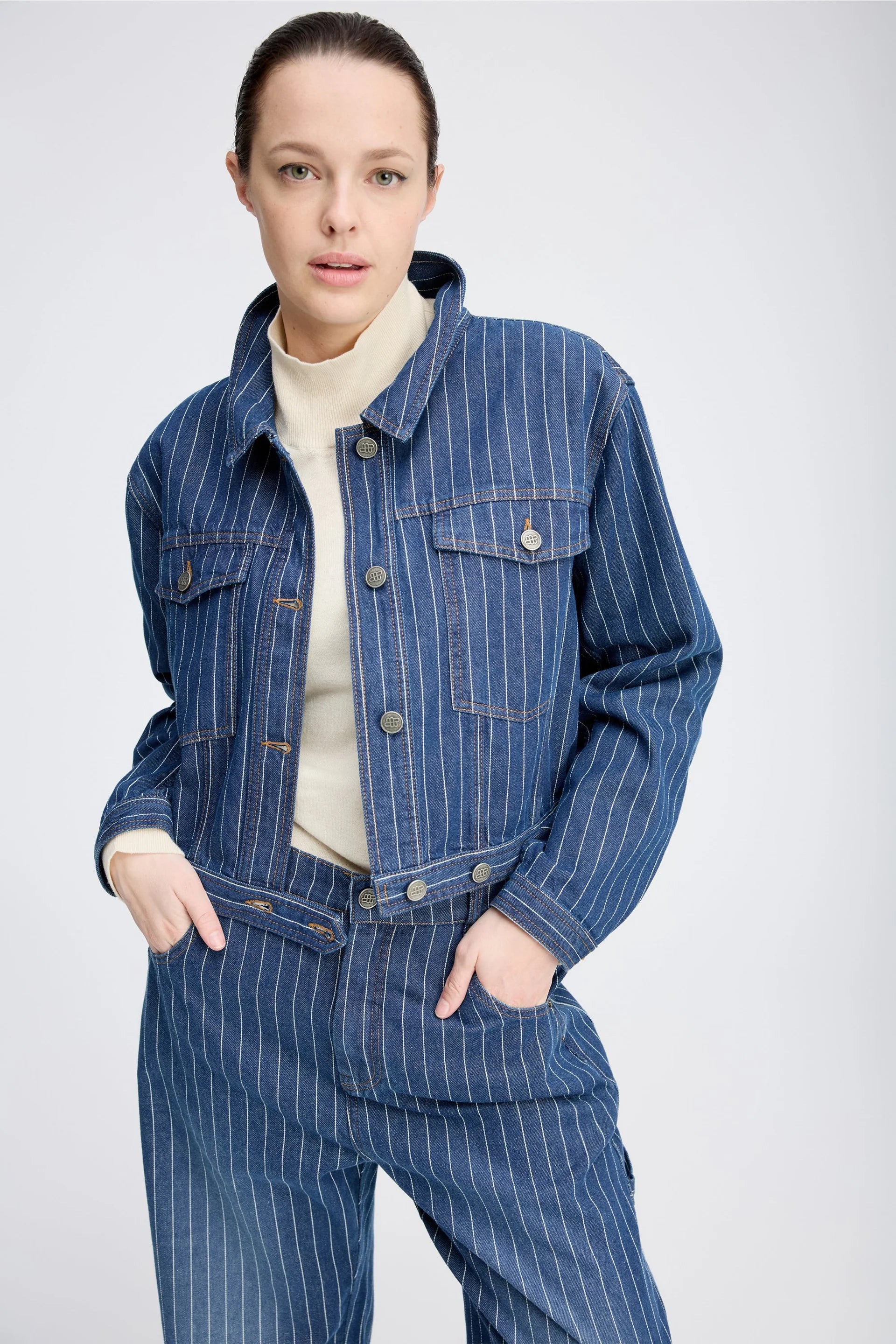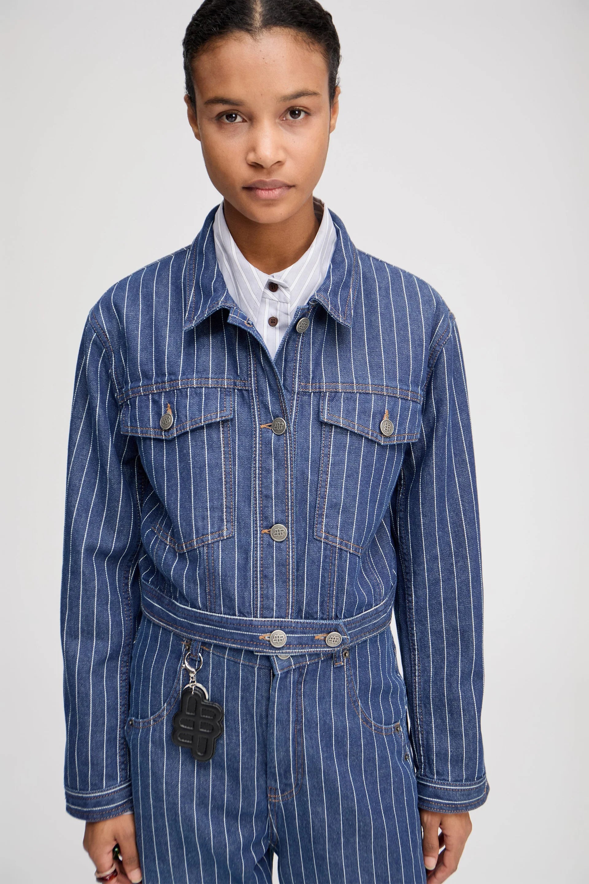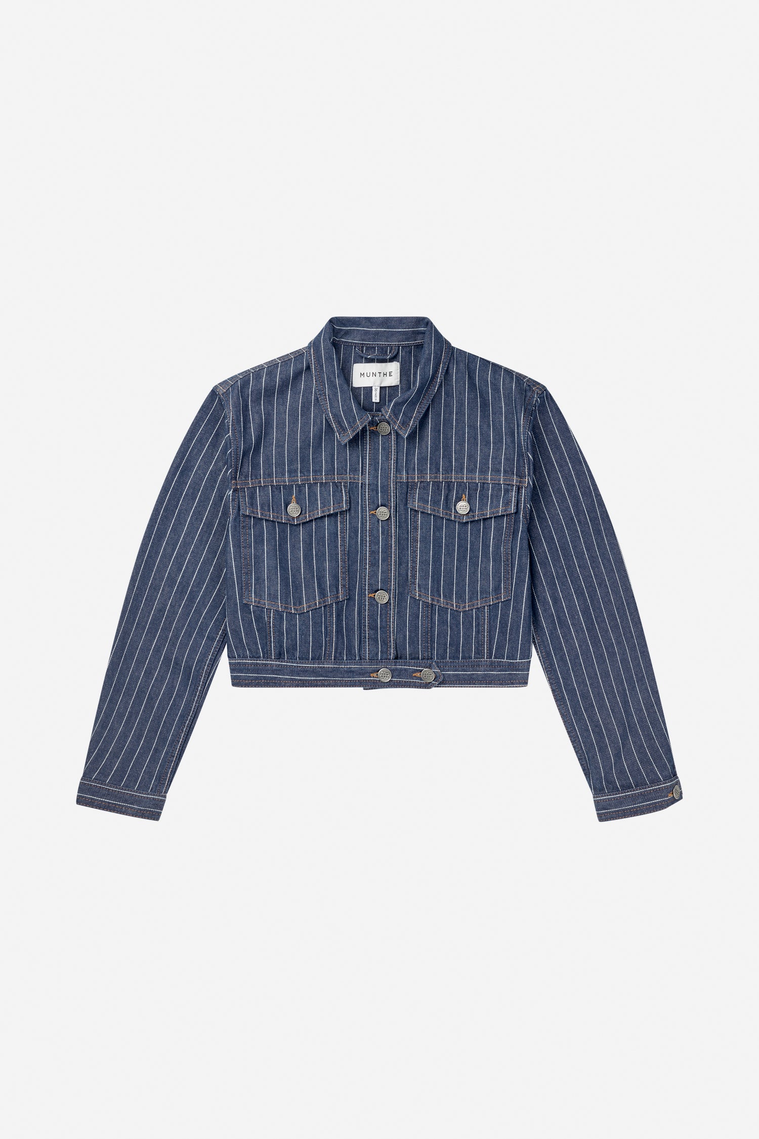 Stilig denimjakke med trendy striper fra Munthe. Mellomblå jeansvask med hvite striper i myk bomull uten stretch. Rett og boxy modell med cropped lengde. Klassisk look med krage og brystlommer. Med dekorative jeansknapper i front og på mansjetter. Style jakken med dressbukse eller jeans. Tøff i sett med matchende skjørt.