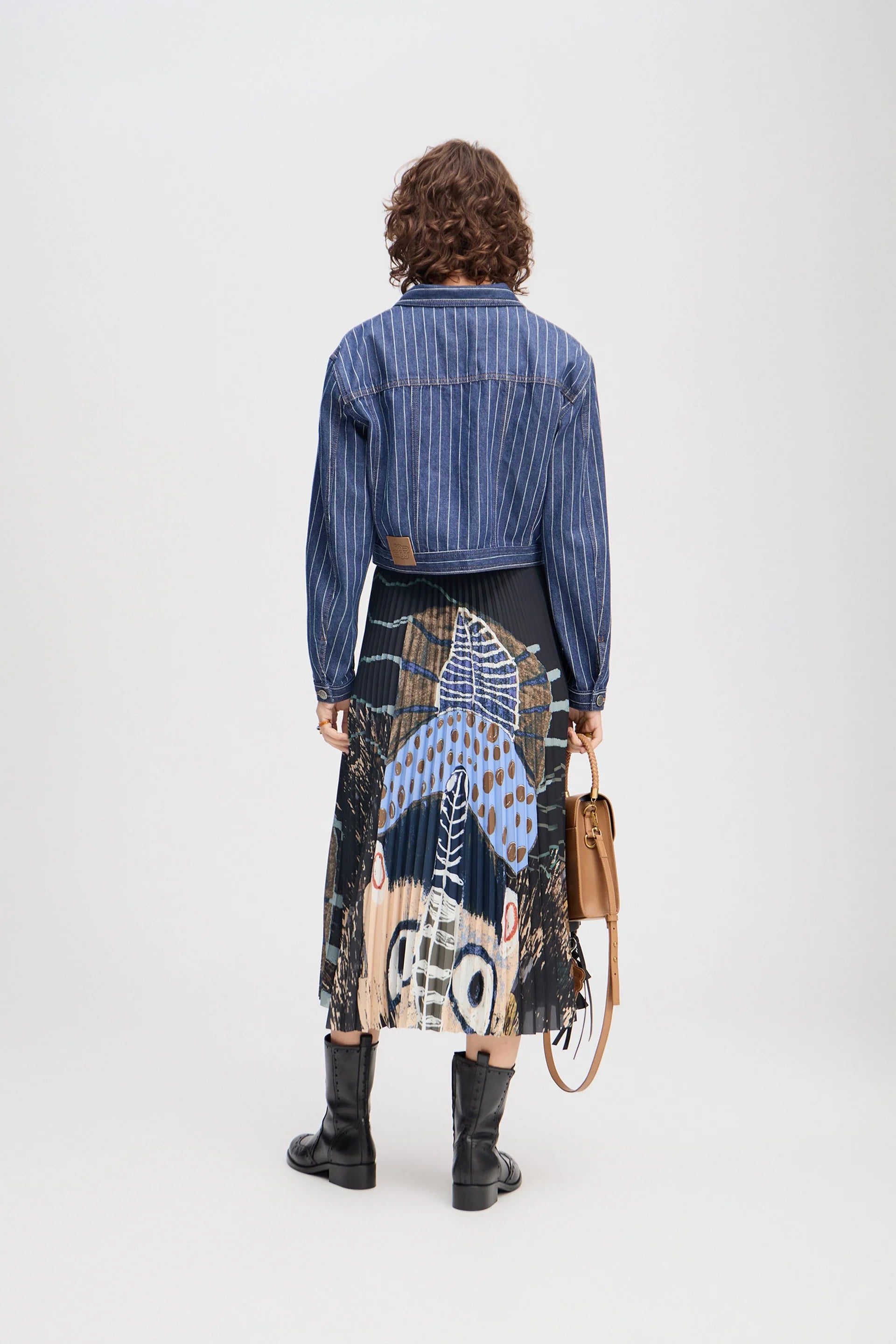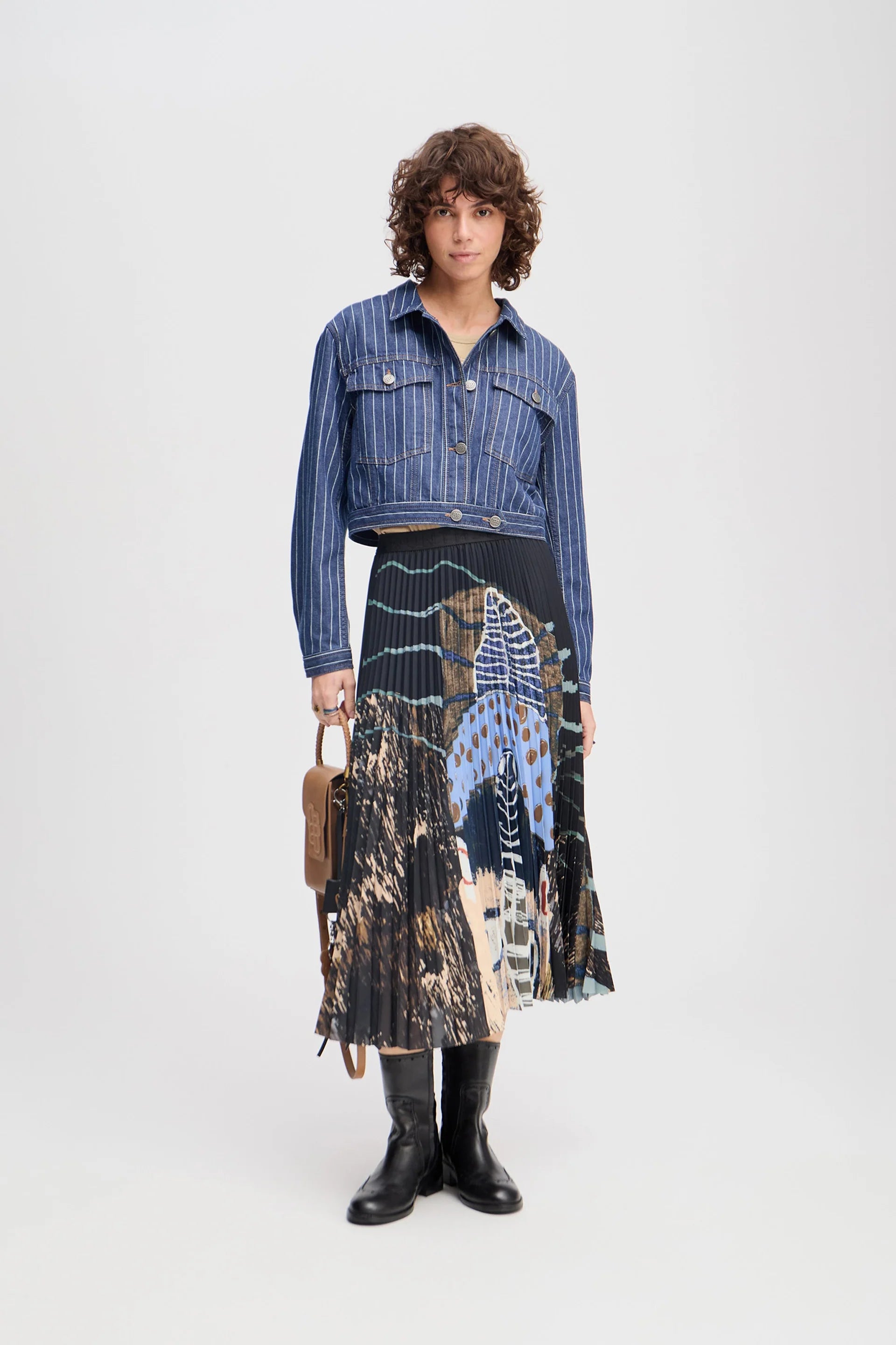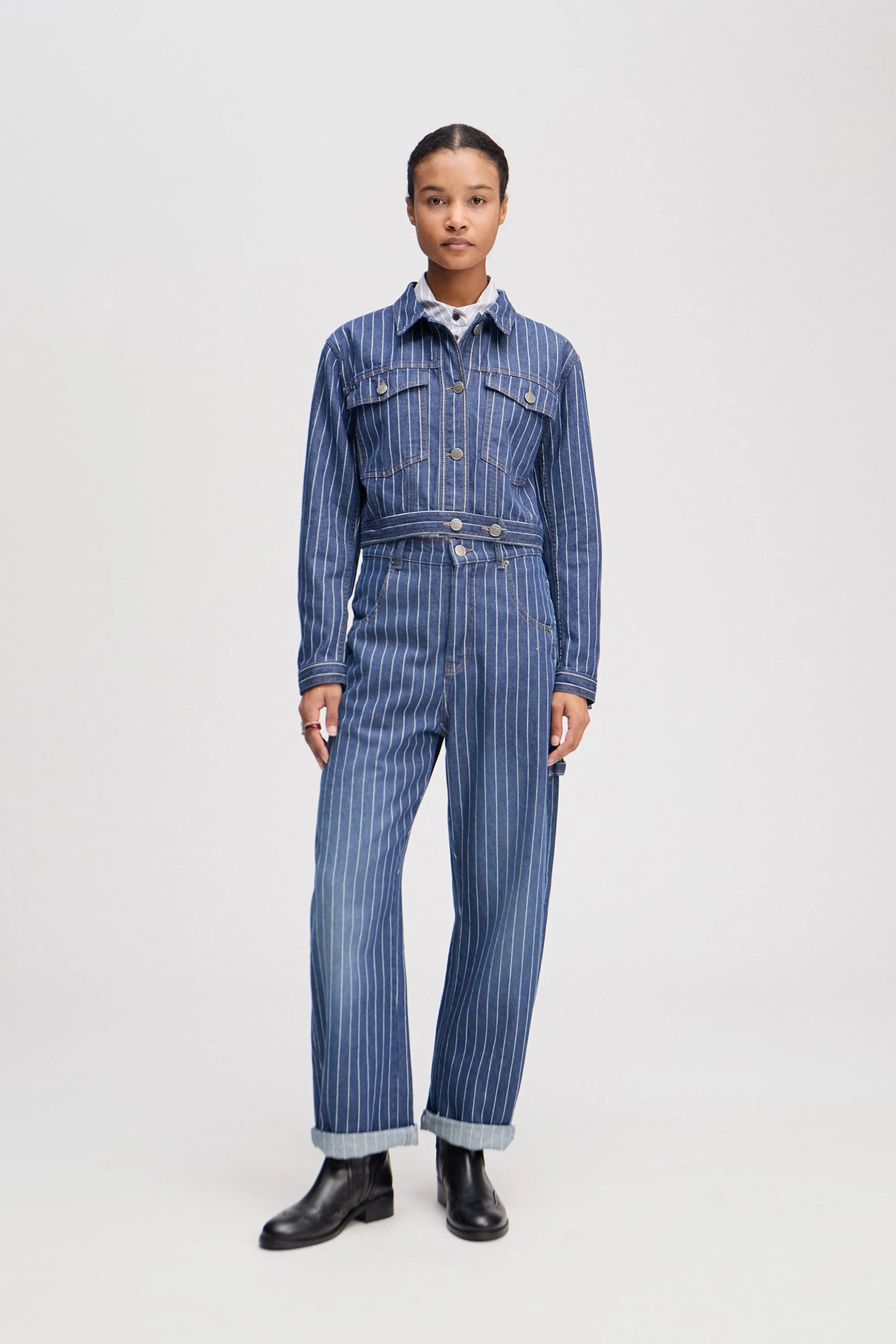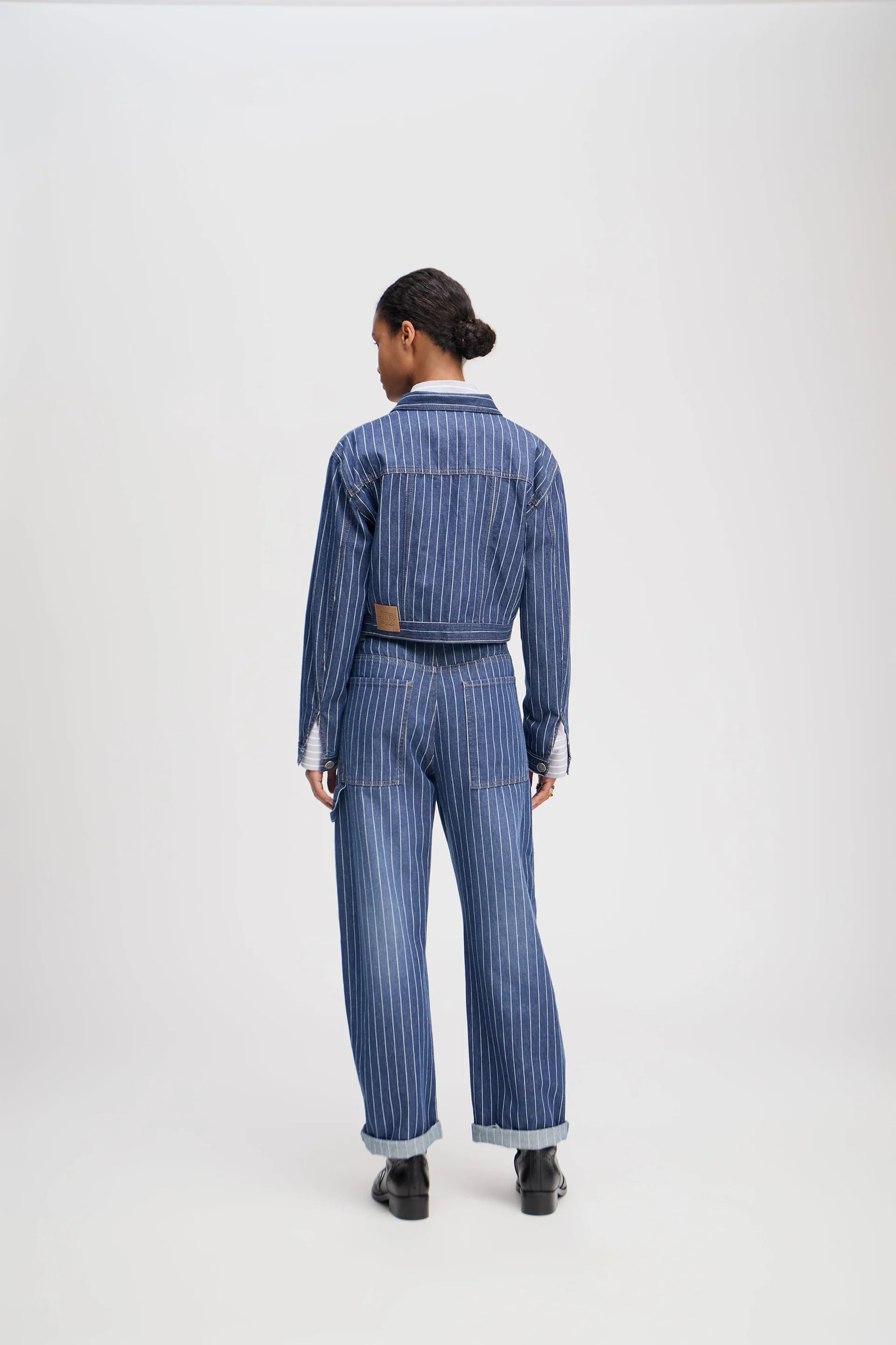Stilig denimjakke med trendy striper fra Munthe. Mellomblå jeansvask med hvite striper i myk bomull uten stretch. Rett og boxy modell med cropped lengde. Klassisk look med krage og brystlommer. Med dekorative jeansknapper i front og på mansjetter. Style jakken med dressbukse eller jeans. Tøff i sett med matchende skjørt.