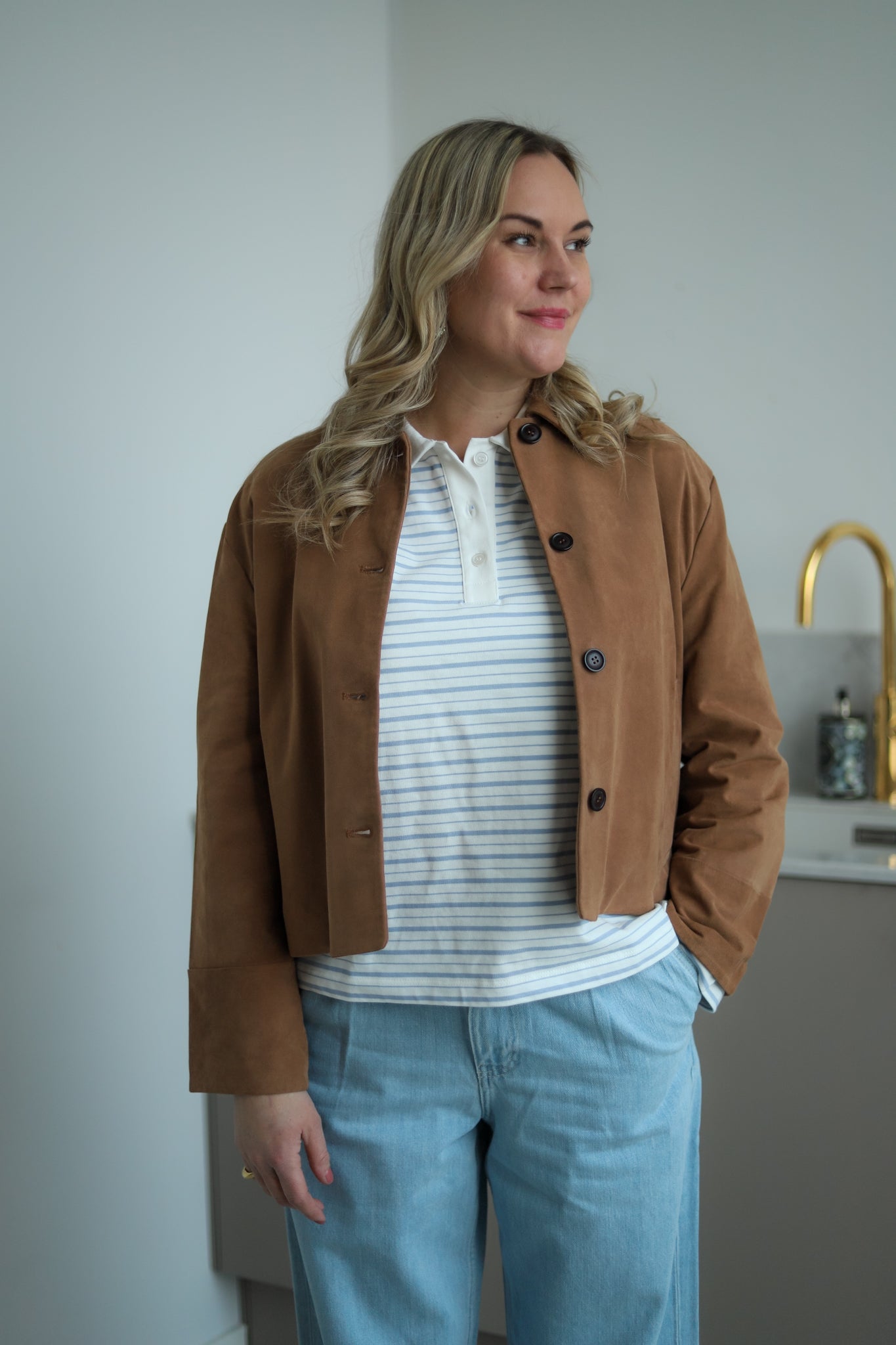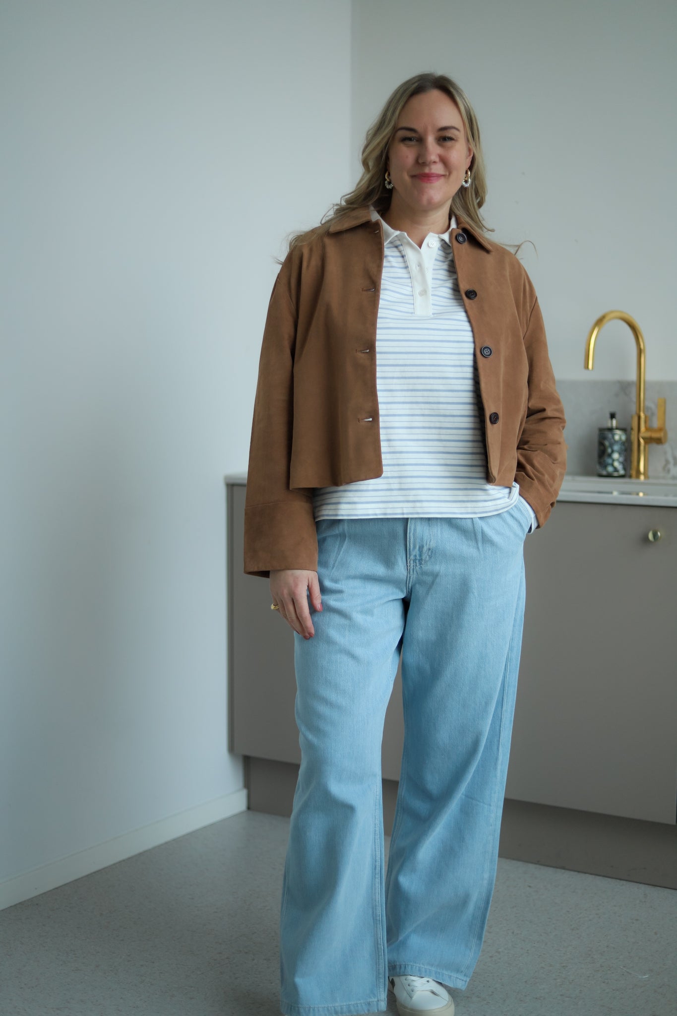 Trendy semsket skinnjakke i lys brun fra Studio AR. Avslappet modell med nett lengde og lukning med tortoise-knapper. Modellen har krage, droppet skuldersøm og skrålommer i front. Deilig bløt semsket skinnkvalitet av geit. Sesongens hotteste jakke-trend!