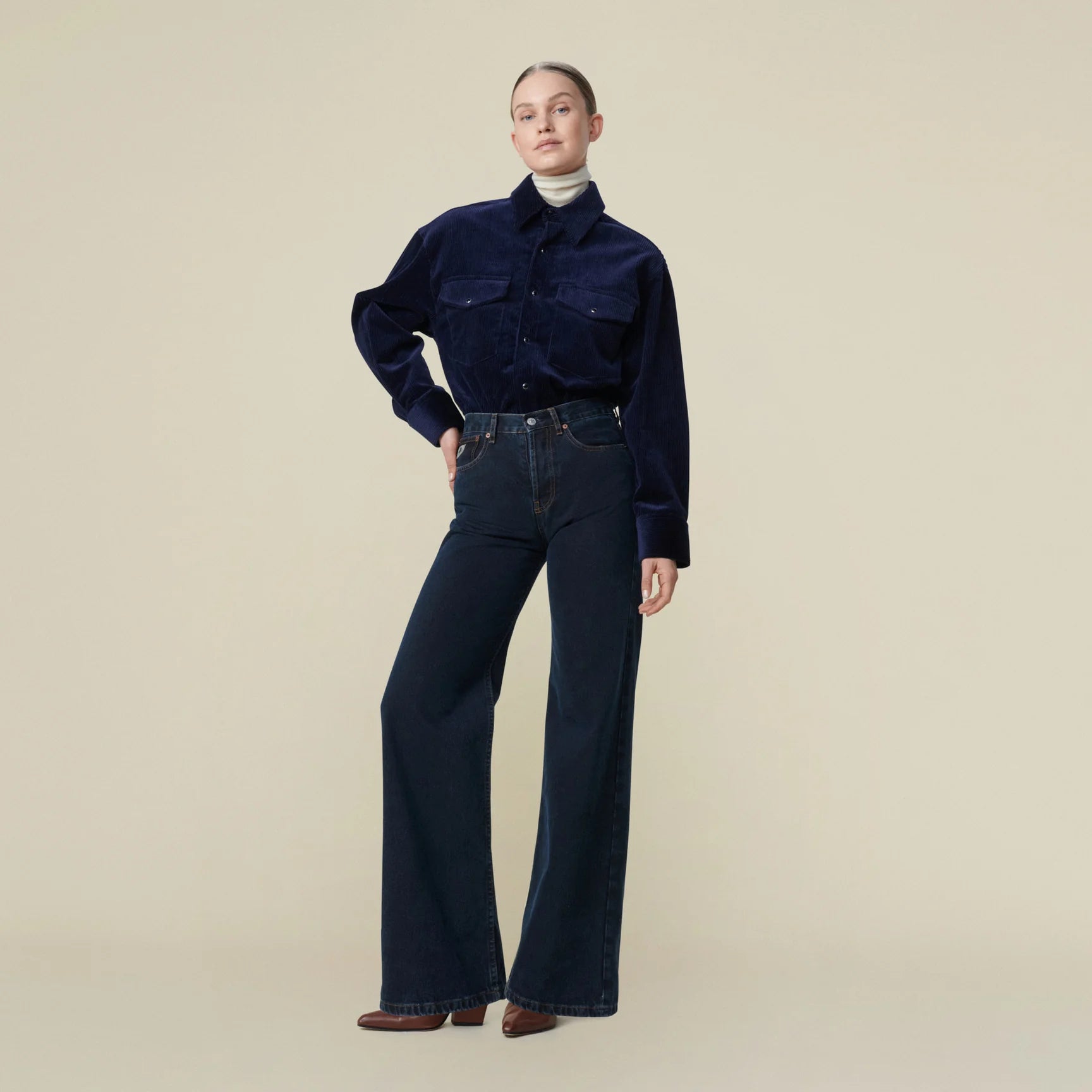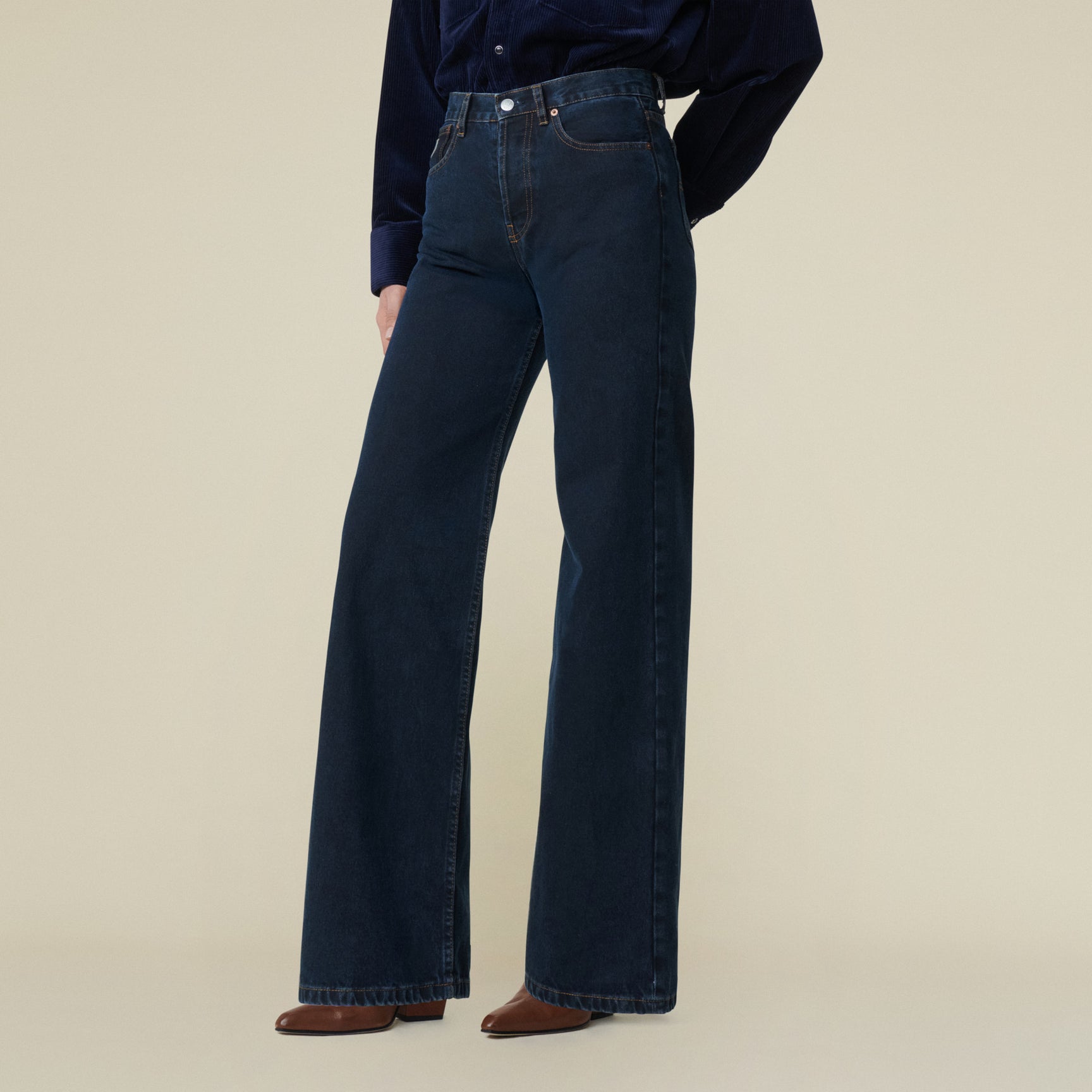 Favorittmodellen Palazzo i en lekker mørk blå vask med gule sømmer, uten stretch. En trendy og elegant jeans med høyt liv og vide ben. Buksen har klassiske 5-pocket detaljer. Linning, beltehemper, gylf med skjult glidelås og jeansknapp i front. Buksen sitter tett rundt livet og over baken, og slipper fra hoftene. Bena er vide med full lengde. Tøff jeans til en enkel tee og loafers. Men også classy med hæler og dressjakke!