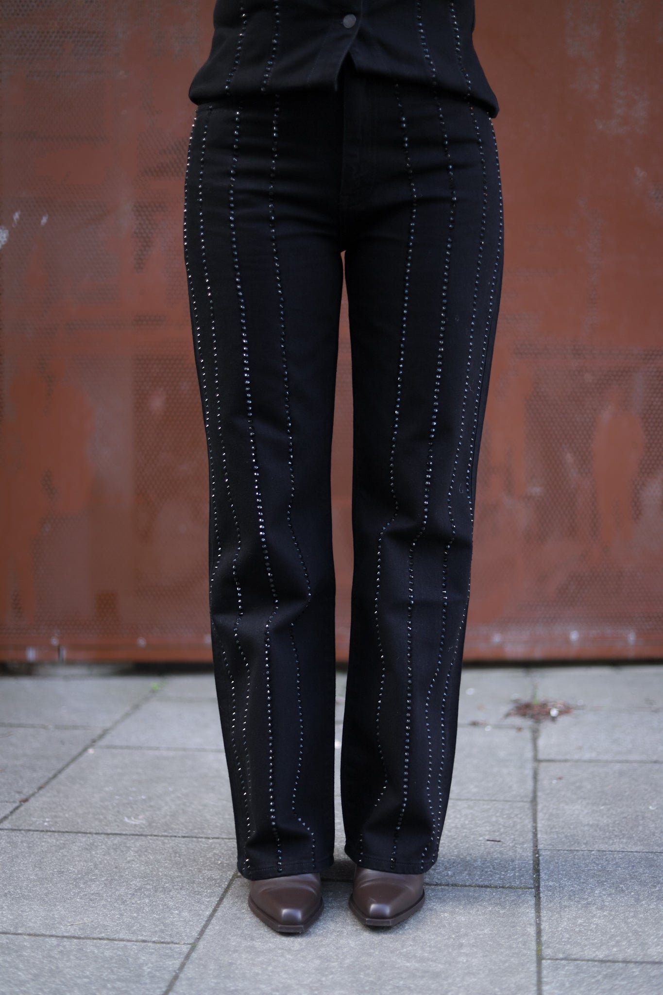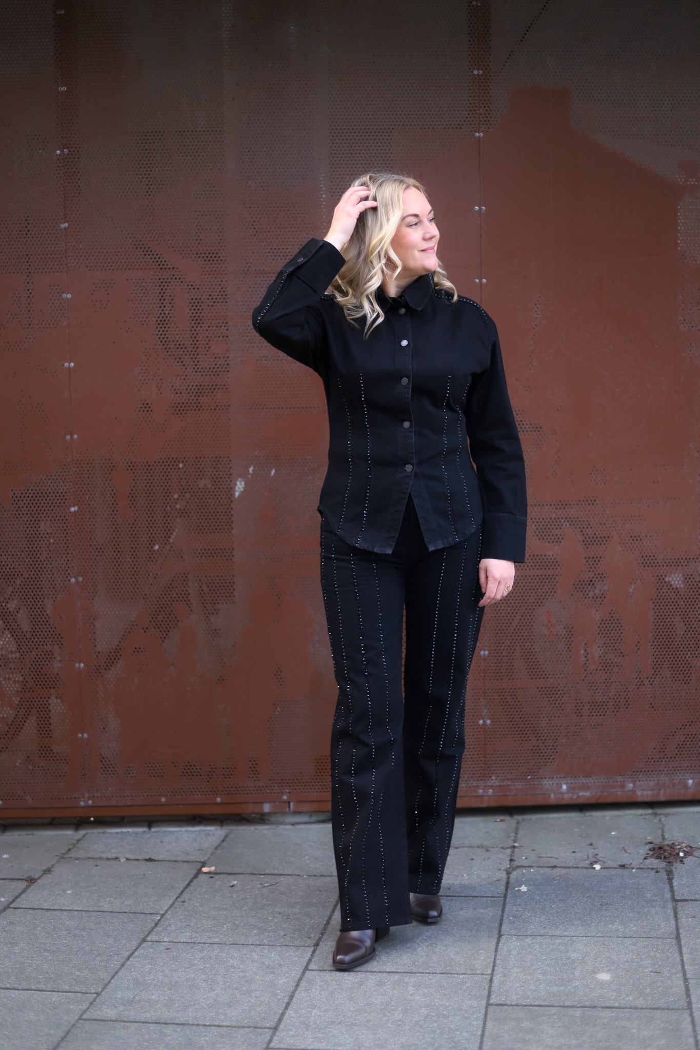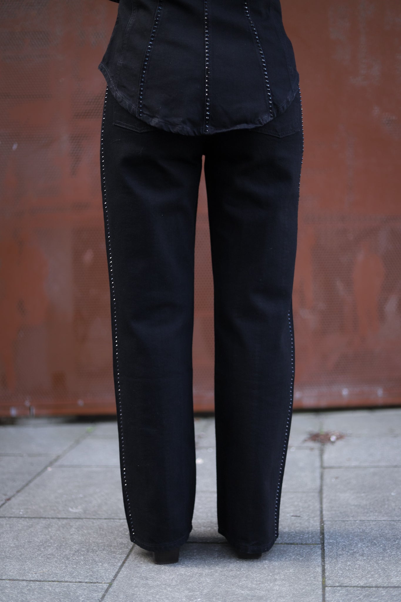Modellen Luca fra Camilla Pihl Denim, i stilig sort denim med ton-i-ton strass. En retro og stødig jeanskvalitet med komfort stretch. Klassisk 5-pocket jeans med linning, beltehemper, gylf med skjult zip og jeansknapp i front. Modellen har høyt liv som virker slankende over hoftene og definerer midjen. Den sitter tett i livet, over hofter og lår, og har rette ben med full lengde. En flatterende jeans med det lille ekstra, style den med matchende skjorte for komplett look.