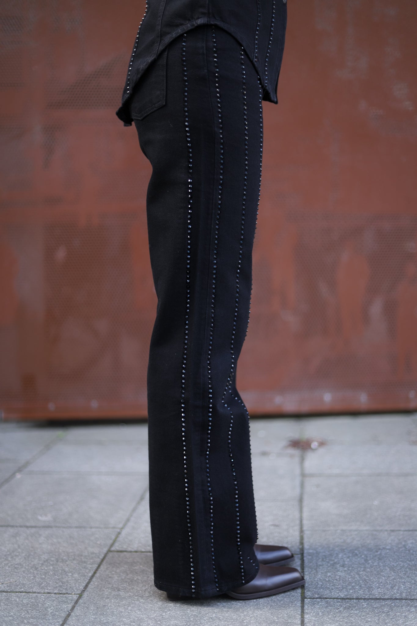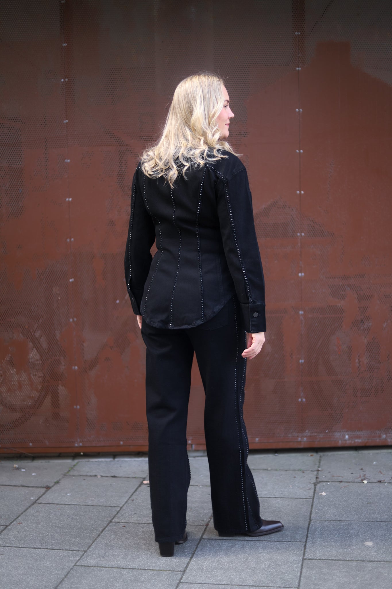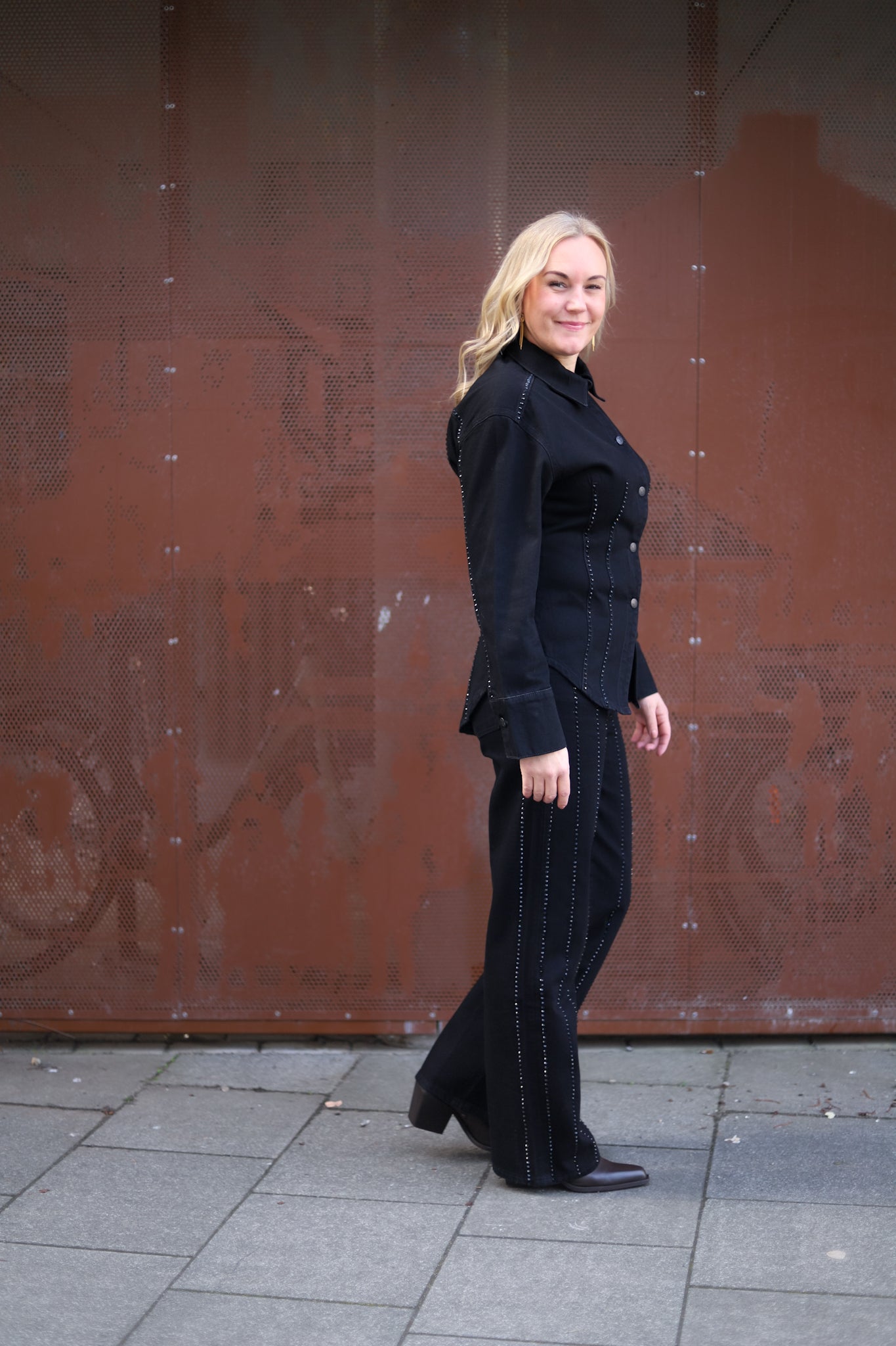 Modellen Luca fra Camilla Pihl Denim, i stilig sort denim med ton-i-ton strass. En retro og stødig jeanskvalitet med komfort stretch. Klassisk 5-pocket jeans med linning, beltehemper, gylf med skjult zip og jeansknapp i front. Modellen har høyt liv som virker slankende over hoftene og definerer midjen. Den sitter tett i livet, over hofter og lår, og har rette ben med full lengde. En flatterende jeans med det lille ekstra, style den med matchende skjorte for komplett look.