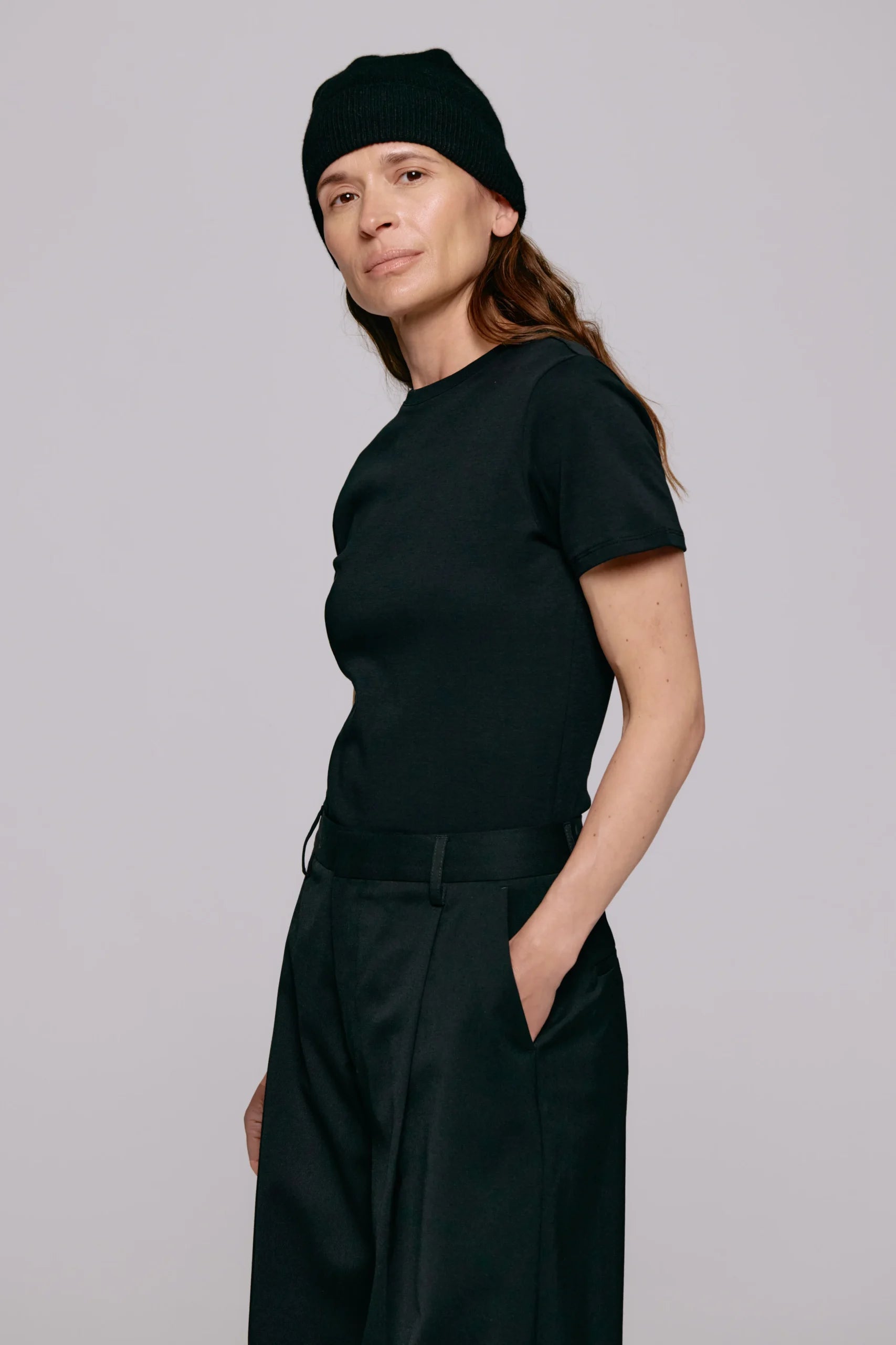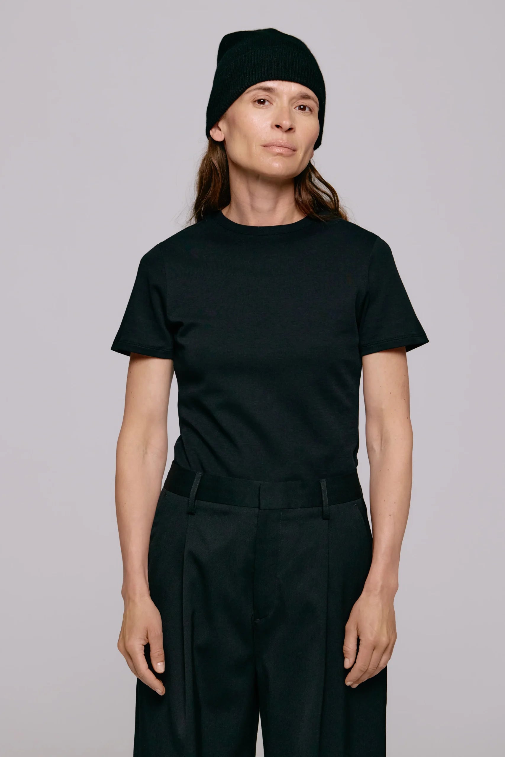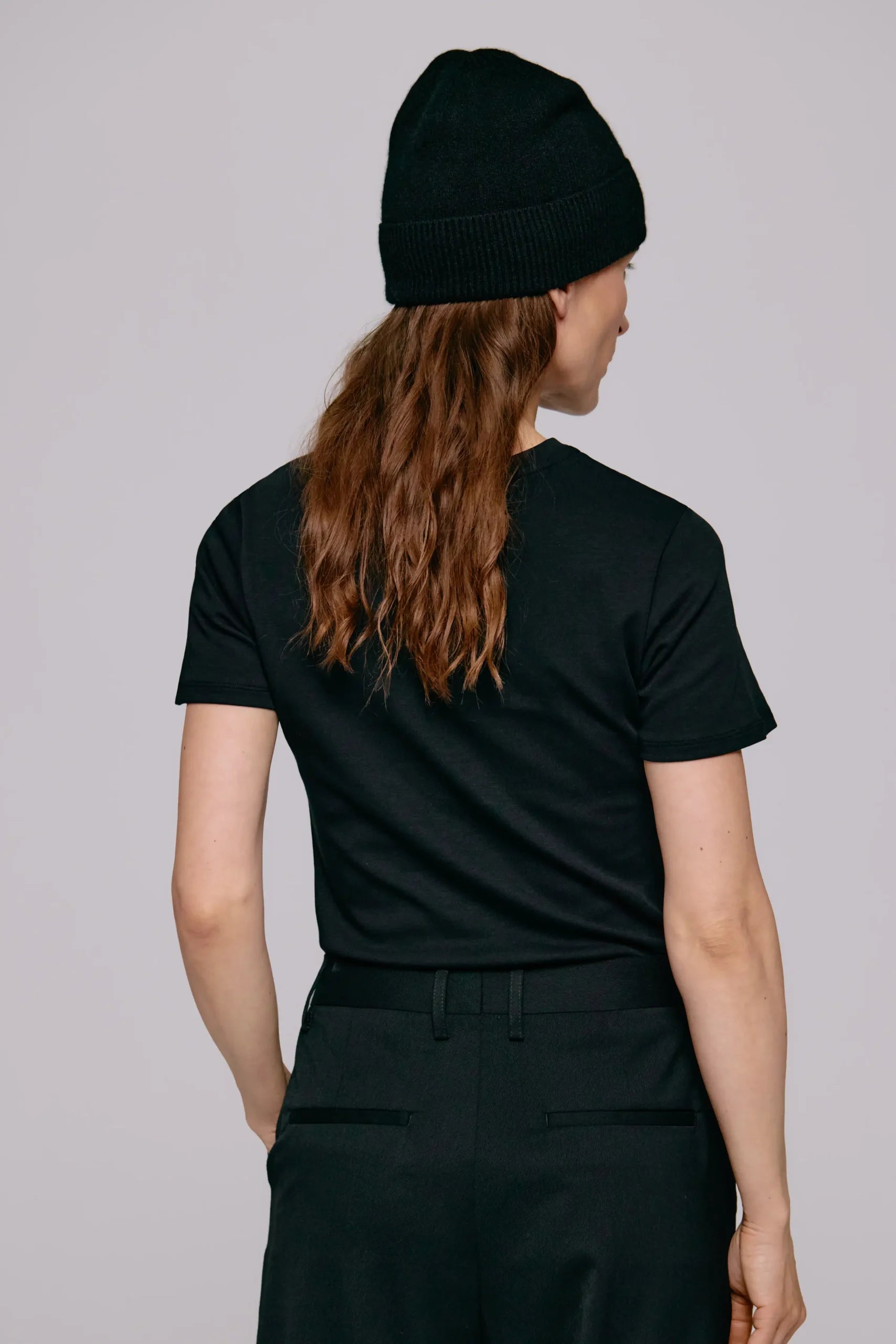 Den perfekte basic tee fra Julie Josephine. Her i klassisk sort. T-skjorten er laget av en super myk bomulls jersey. Modellen er klassisk rett, med rund hals, pen hoftelengde og nett kort erm. Oppgrader garderoben din med tidløs basic i flott kvalitet!