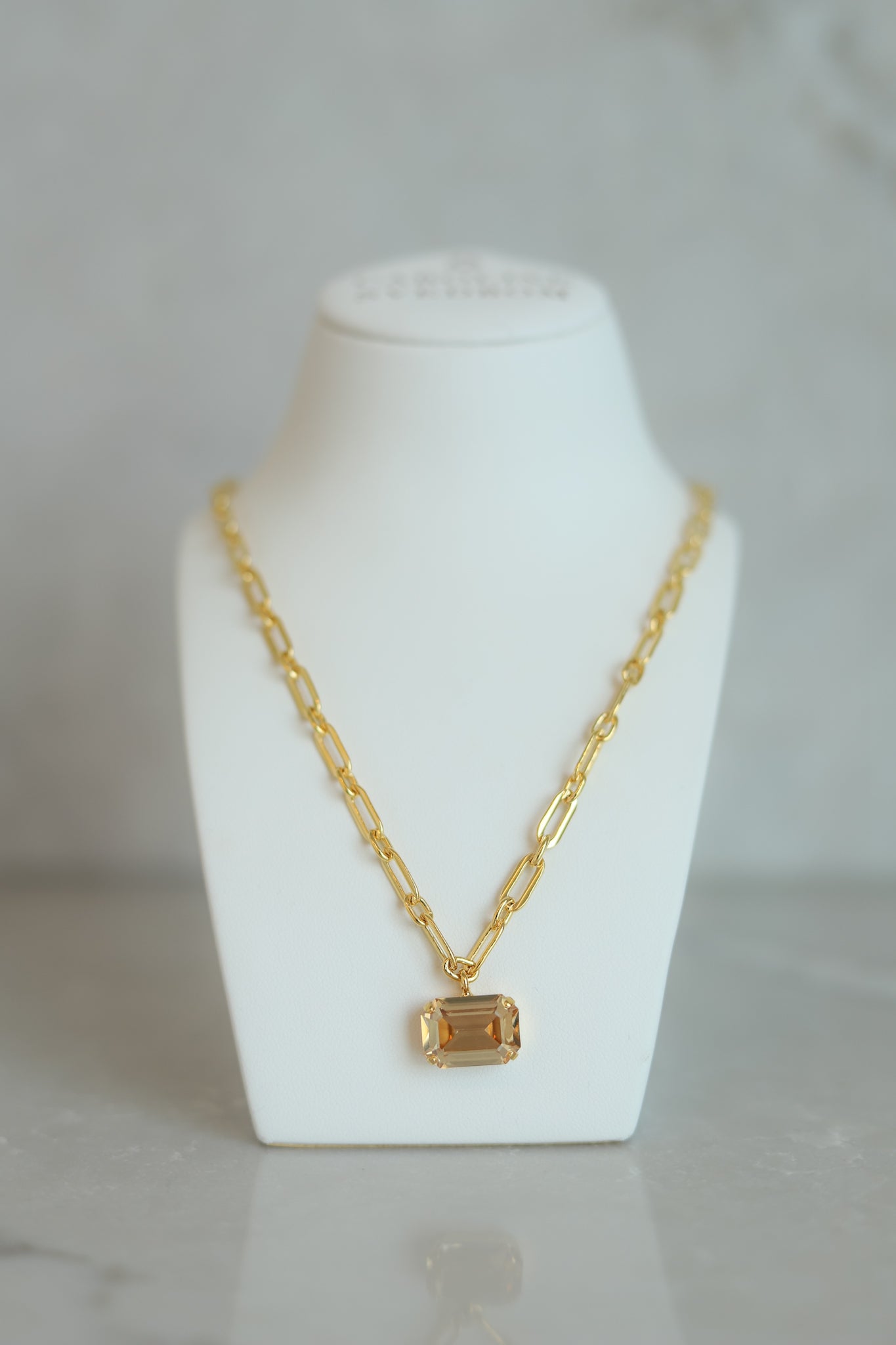 Mini Lydia Necklace har et kult kjede med et vakkert lite firkantet-anheng. Kjedet er 18k gullforgyldt rhodium og swarovski-stenen er i en lekker beigetone.