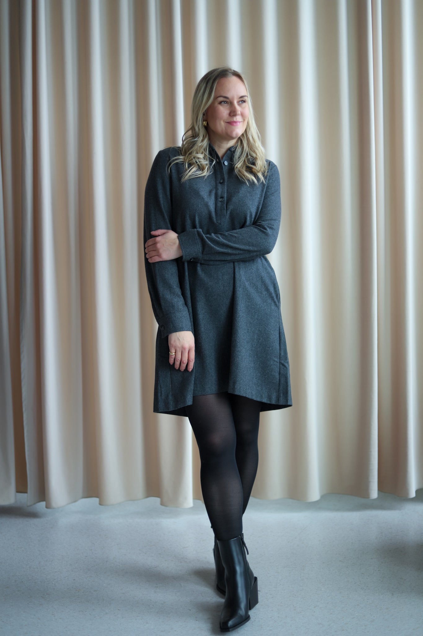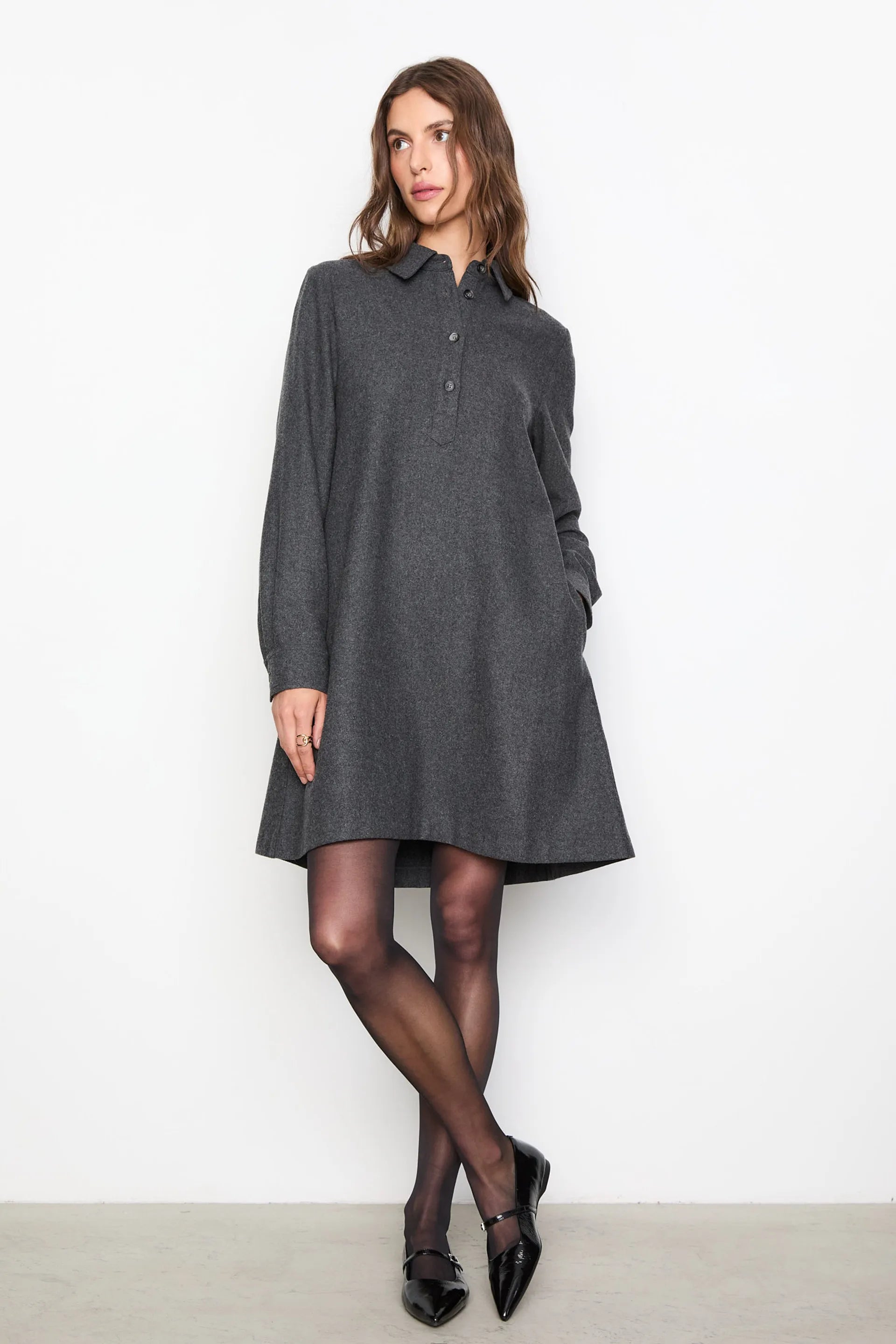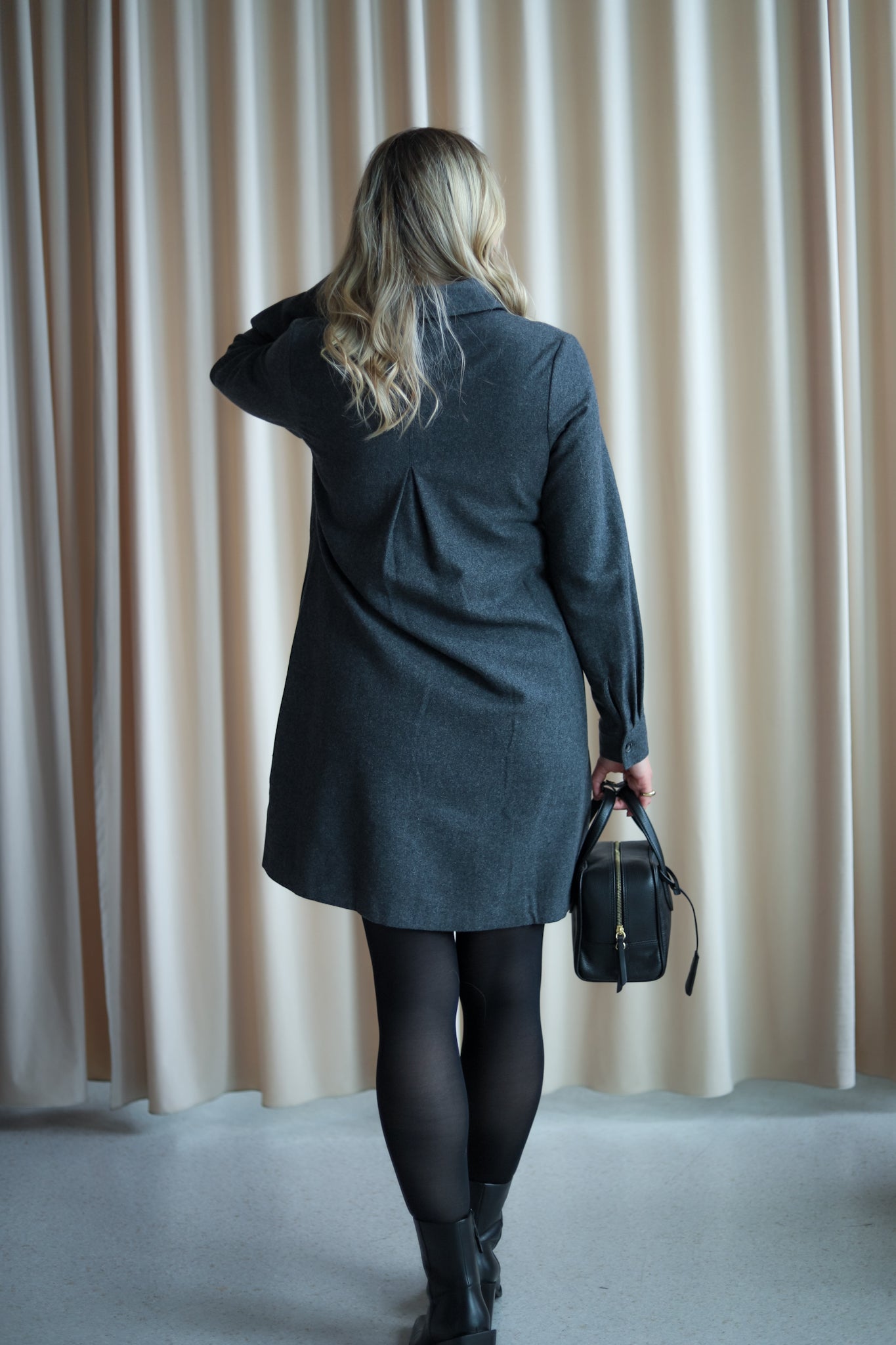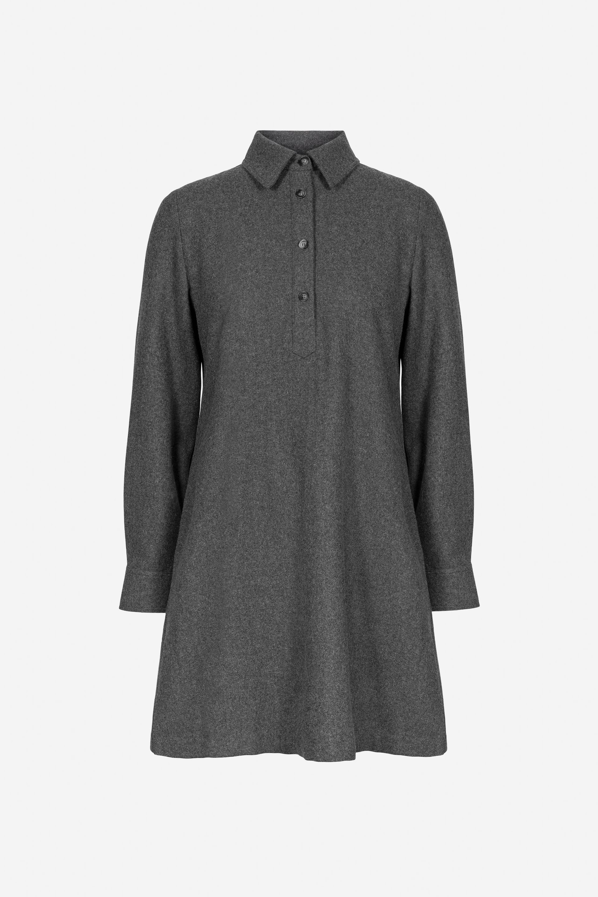 Nydelig kjole i gråmelert farge fra Camilla pihl. Modellen har feminin a-form og når til midt på låret. Delikat krage med knappestolpe på brystet og stikklommer i sidene. Kjolen har lange ermer med knapper i mansjett og legg i ryggen som skaper et pent fall. Den perfekte hverdagskjolen!