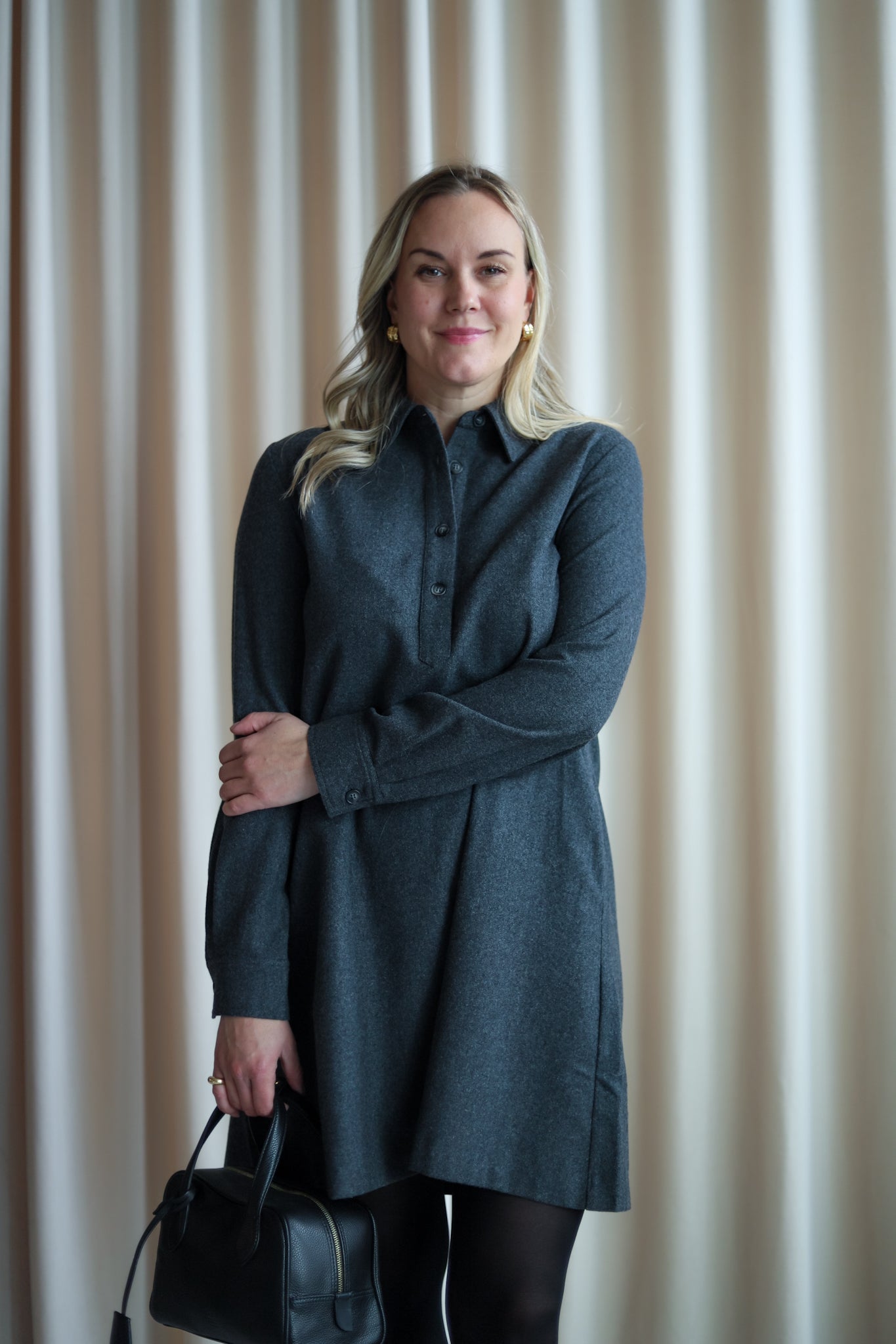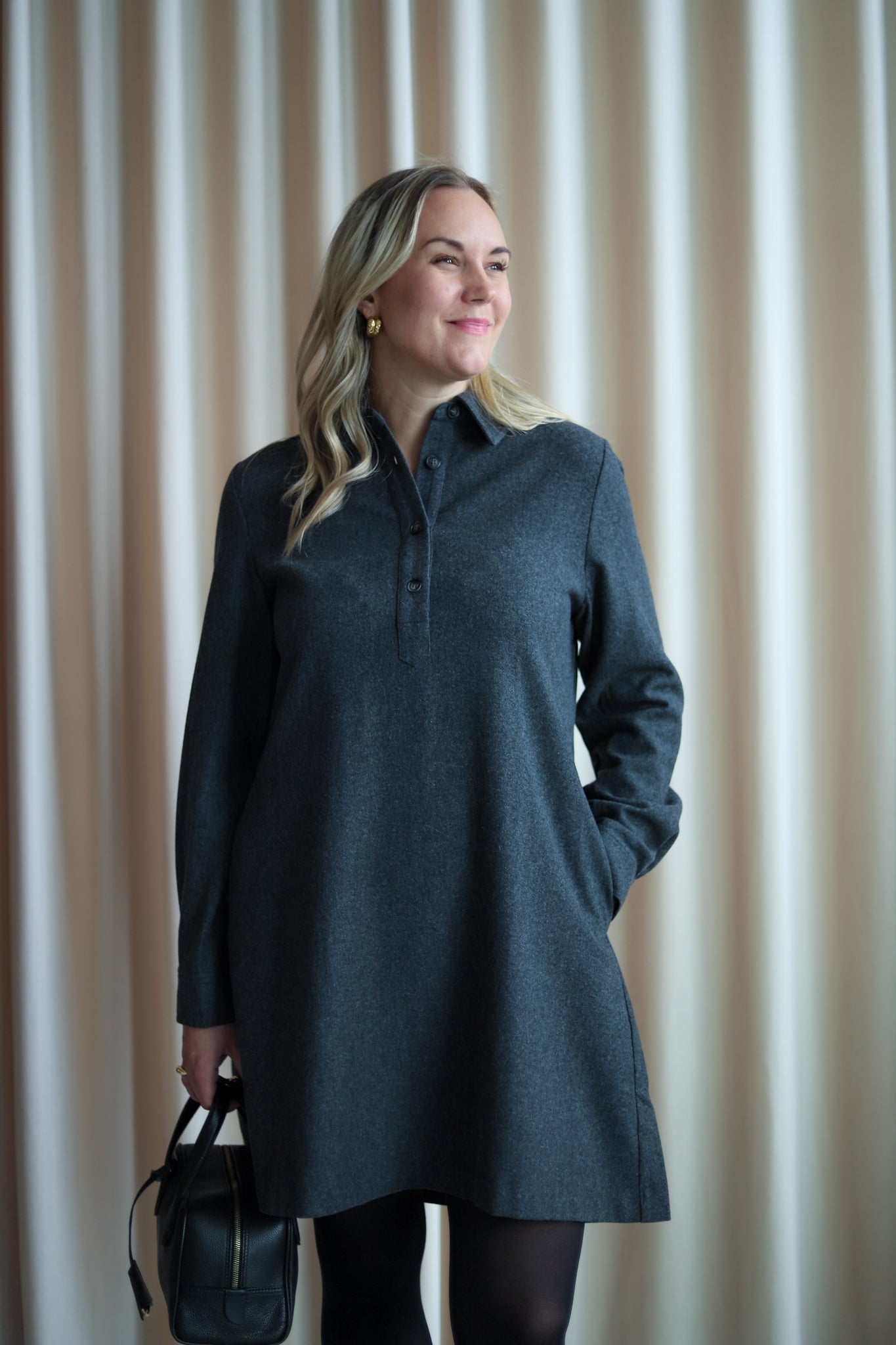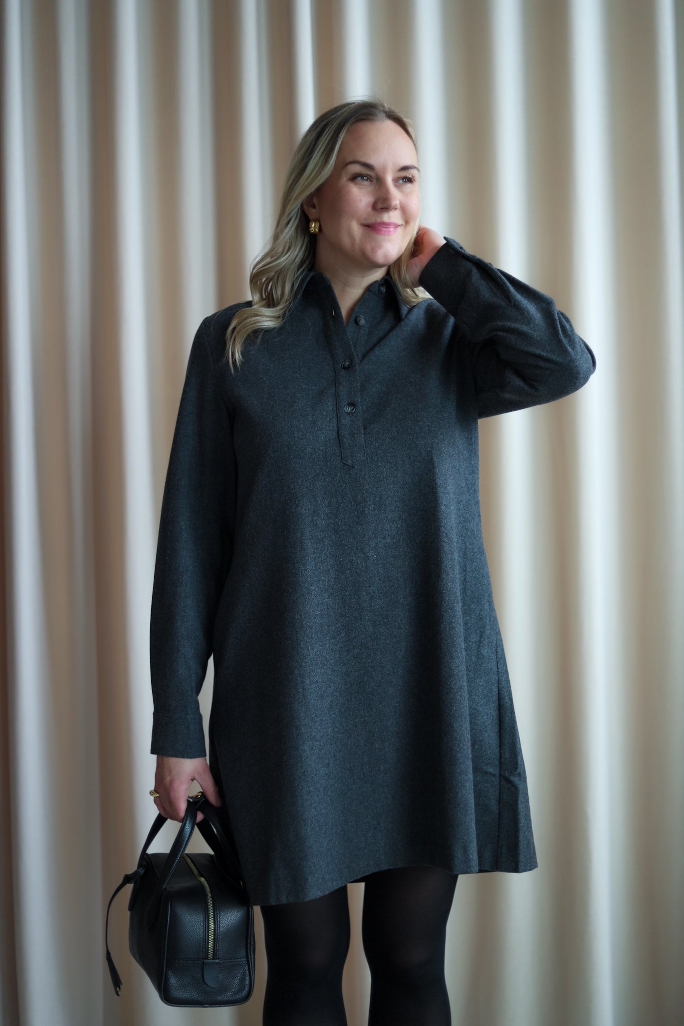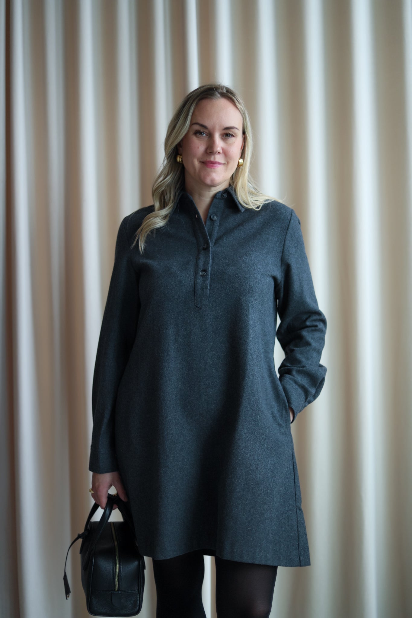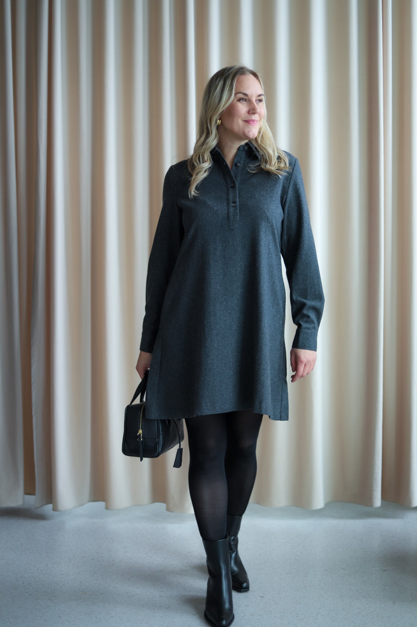 Nydelig kjole i gråmelert farge fra Camilla pihl. Modellen har feminin a-form og når til midt på låret. Delikat krage med knappestolpe på brystet og stikklommer i sidene. Kjolen har lange ermer med knapper i mansjett og legg i ryggen som skaper et pent fall. Den perfekte hverdagskjolen!