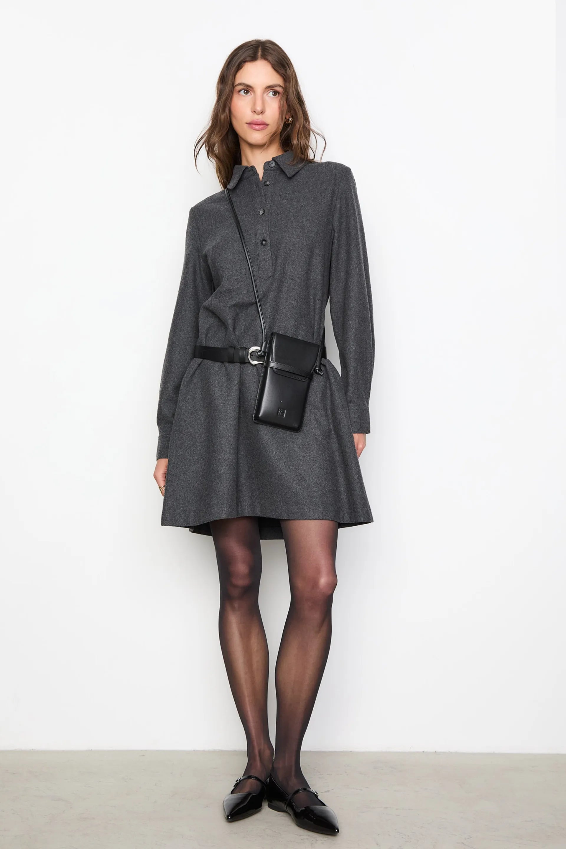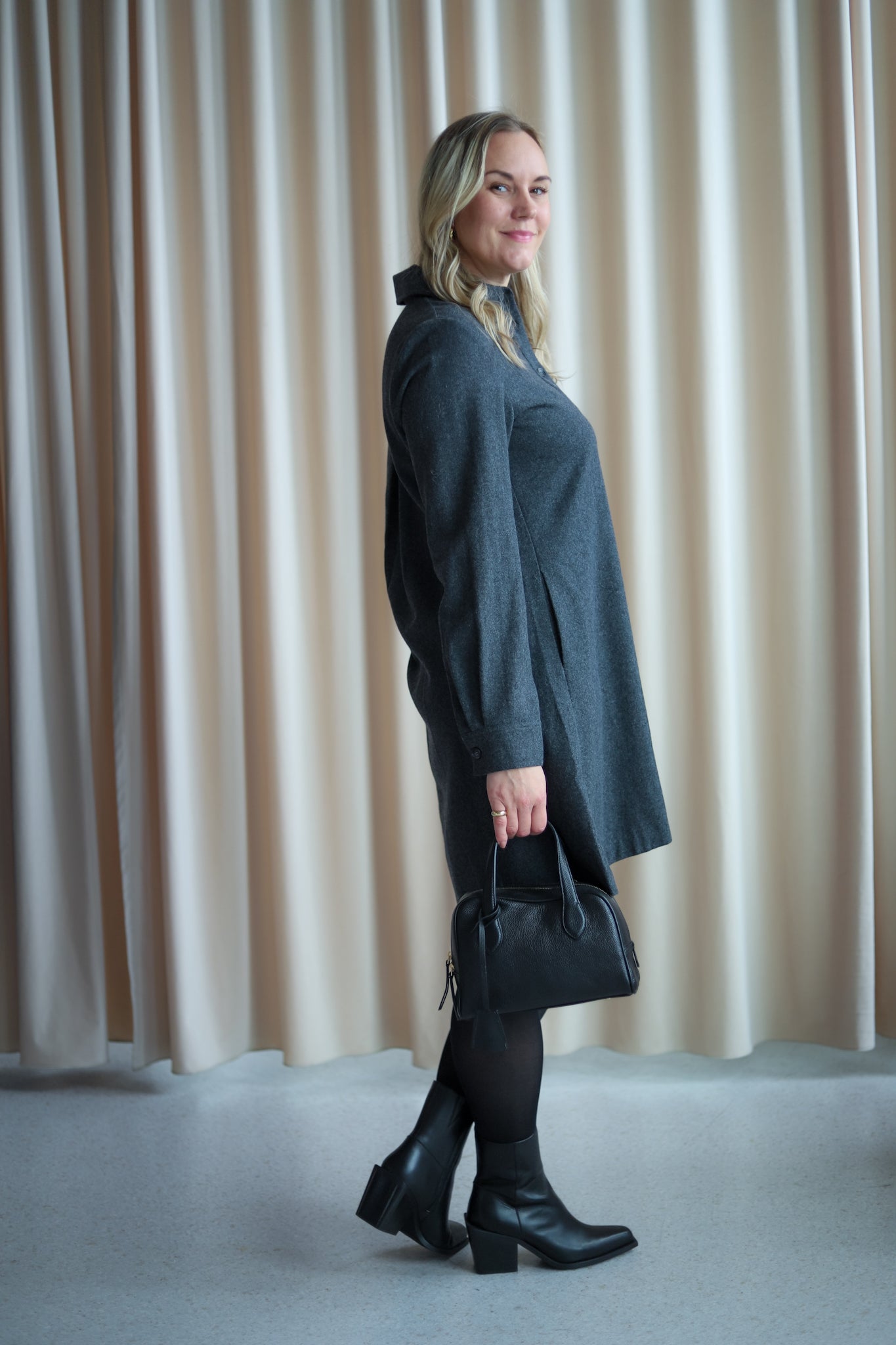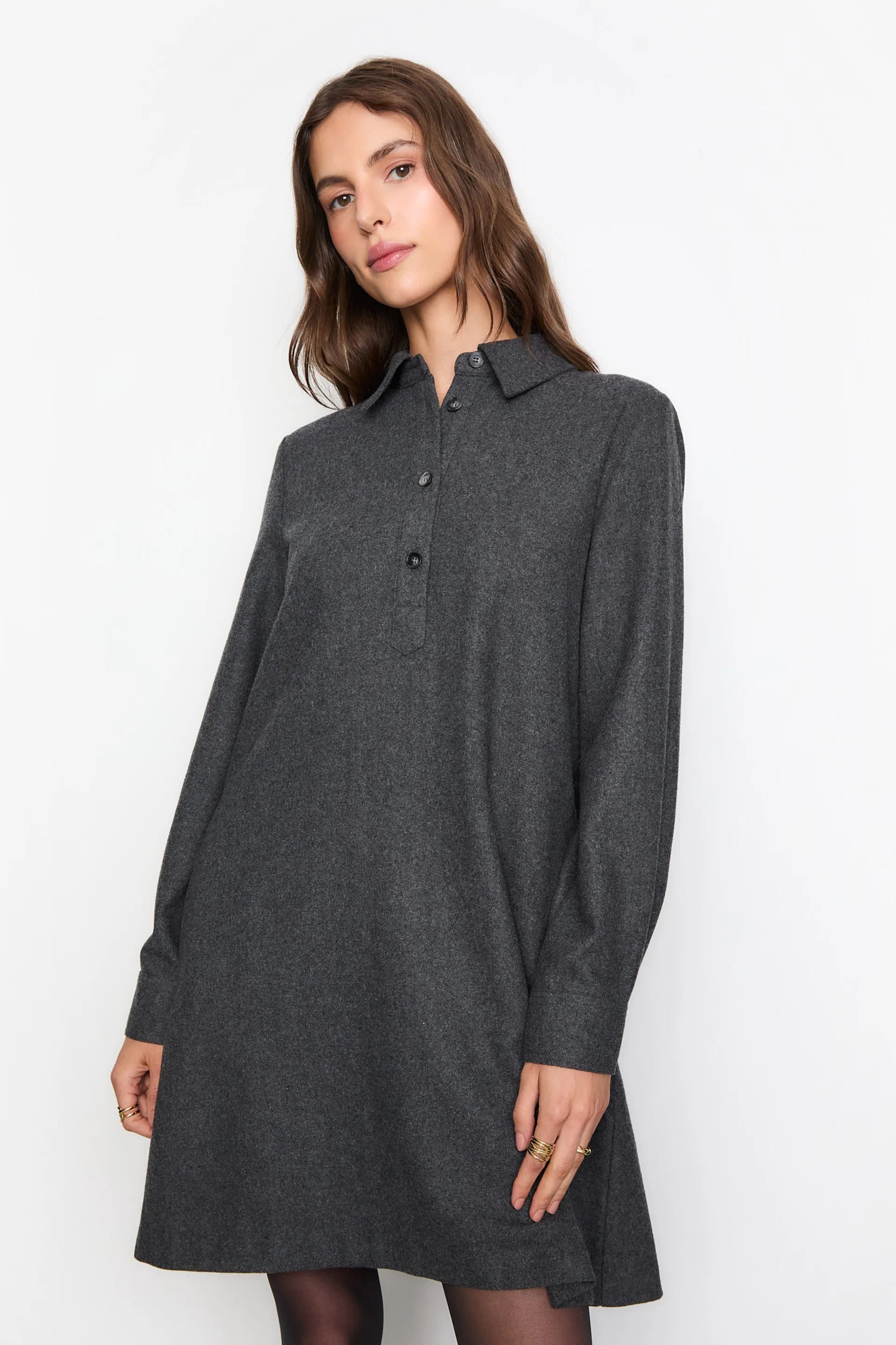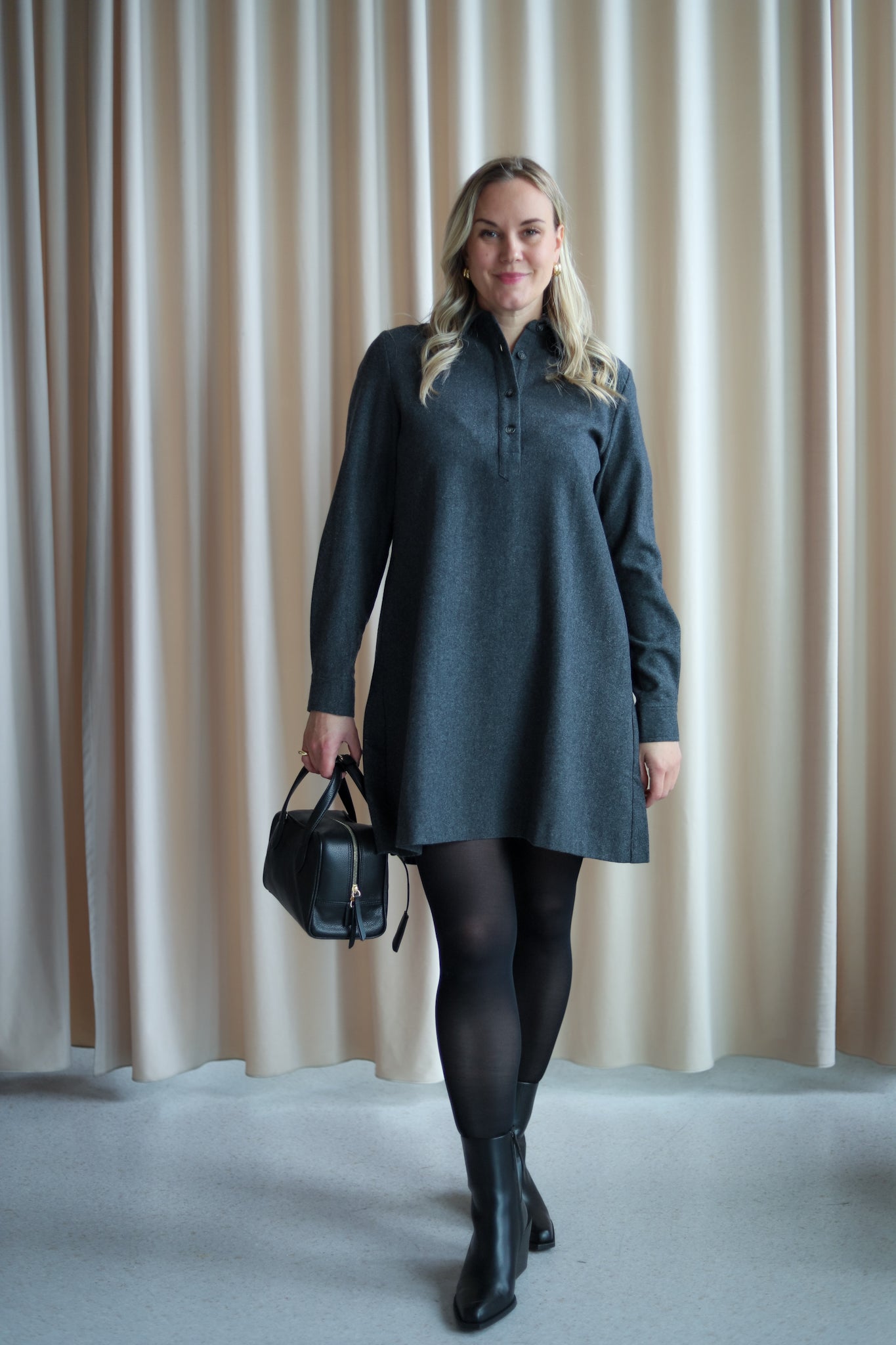 Nydelig kjole i gråmelert farge fra Camilla pihl. Modellen har feminin a-form og når til midt på låret. Delikat krage med knappestolpe på brystet og stikklommer i sidene. Kjolen har lange ermer med knapper i mansjett og legg i ryggen som skaper et pent fall. Den perfekte hverdagskjolen!