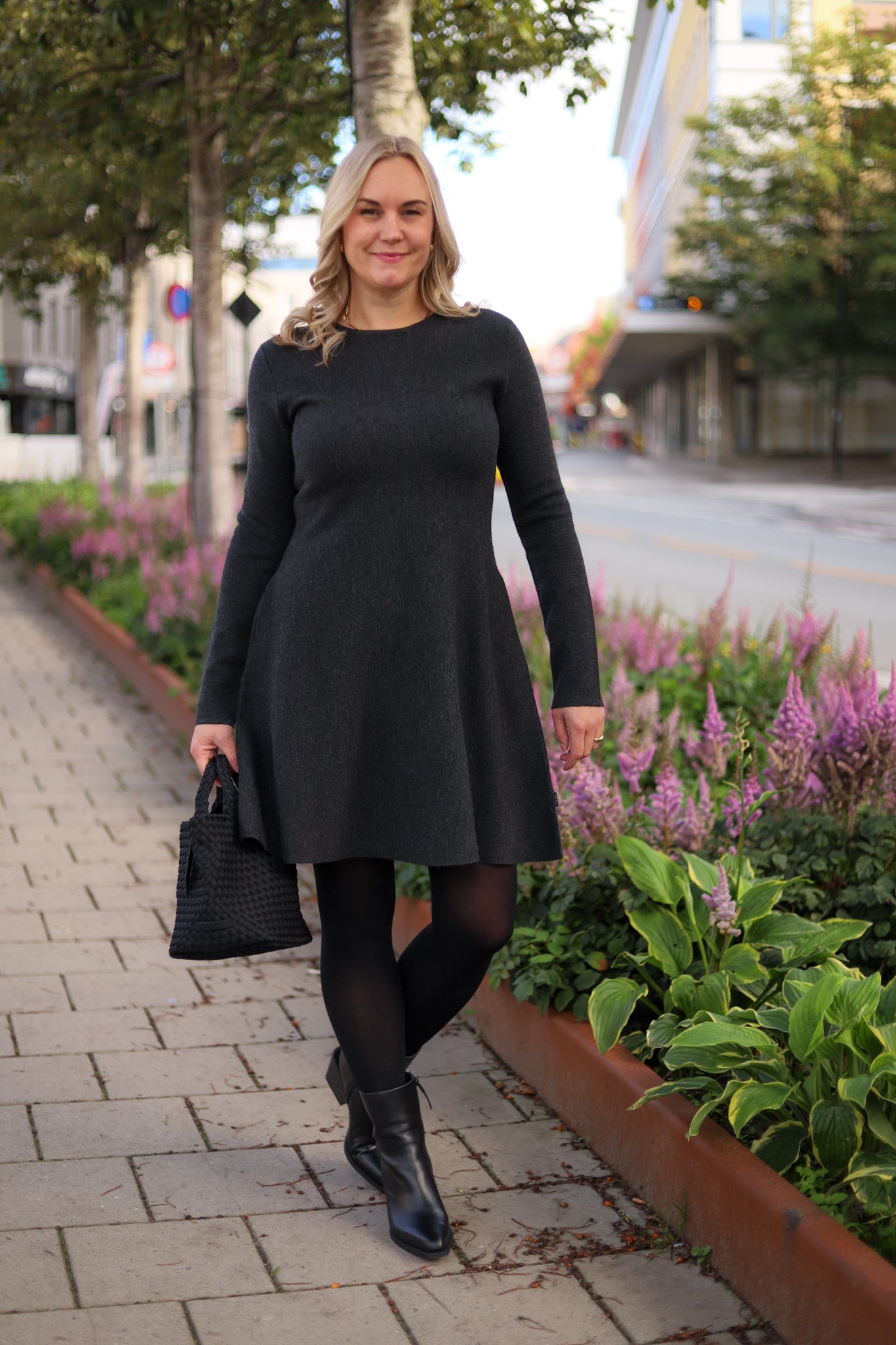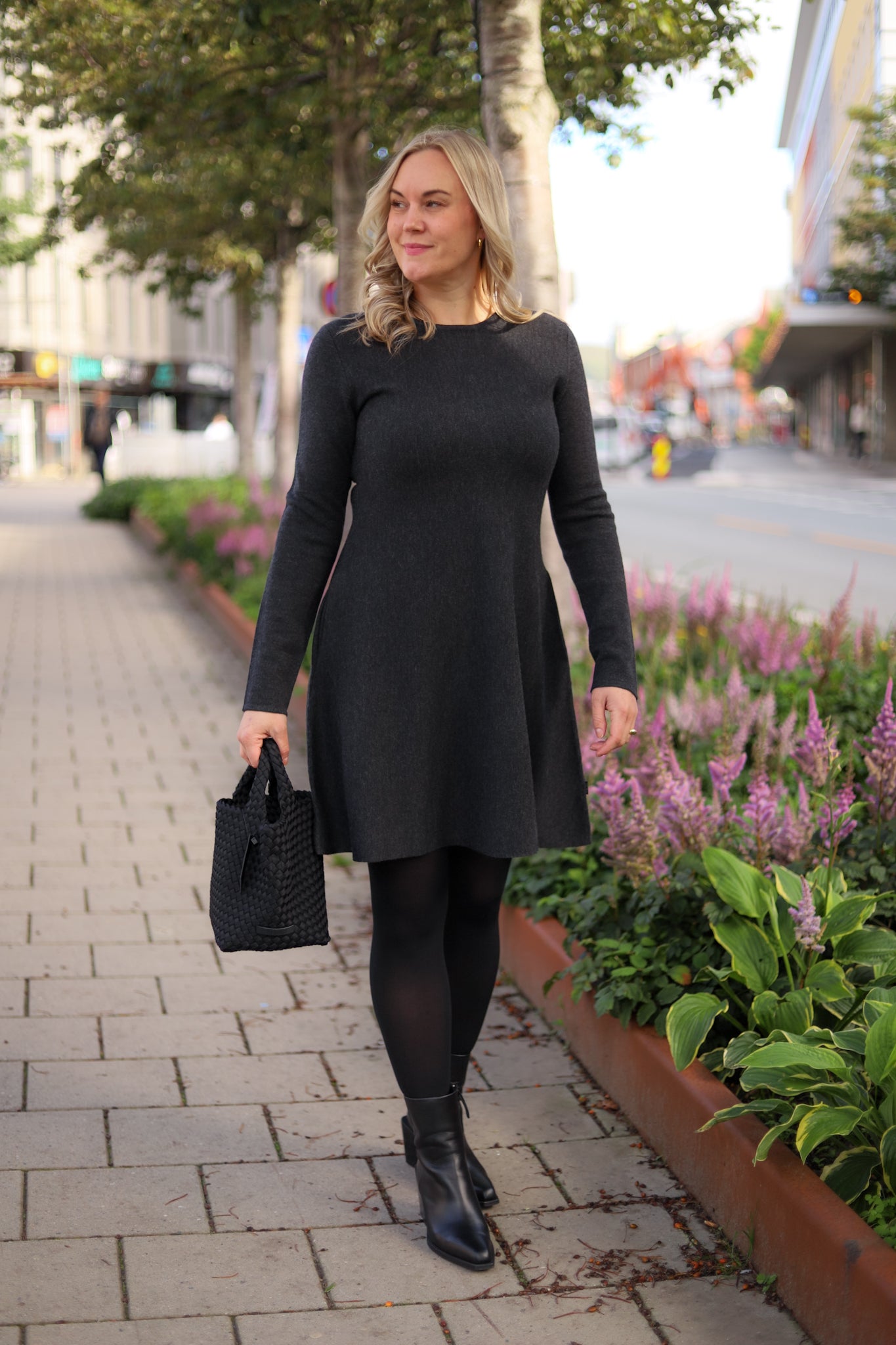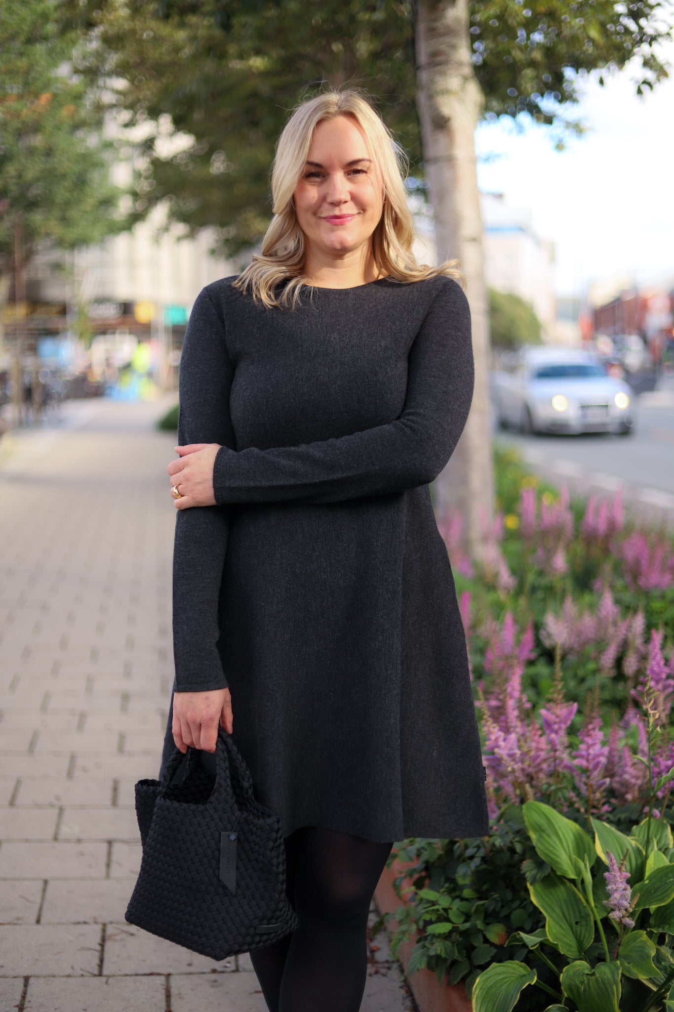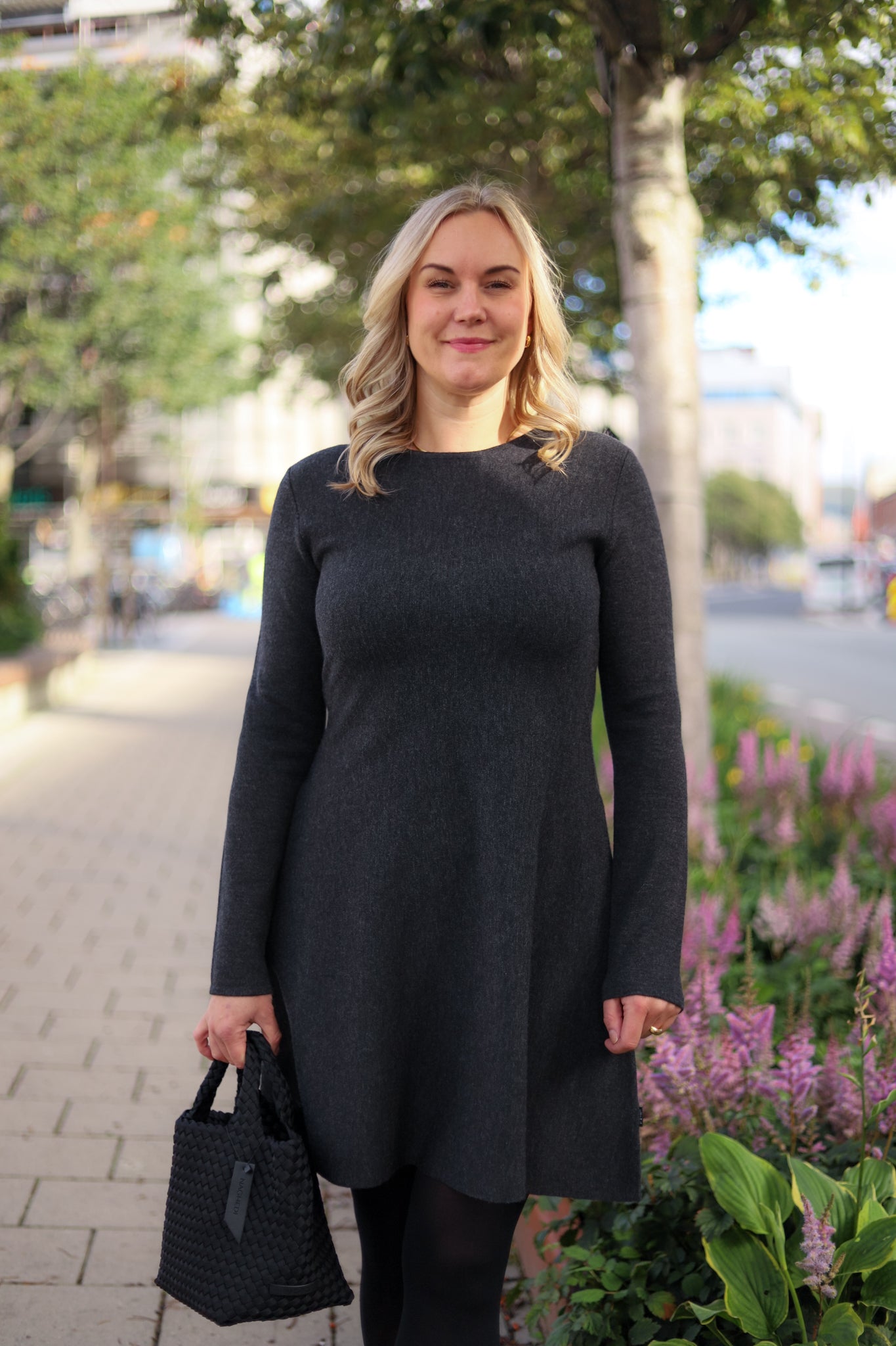 Superdeilig, klassisk kjole i merinoull fra Ella&il. Modellen har rund hals, lange smale ermer og lommer i sidene. Den har a-form og et flatterende snitt med lengde til over kneet. Her i mørk grå. En klassiker i garderoben som kan pyntes opp og ned etter anledning!