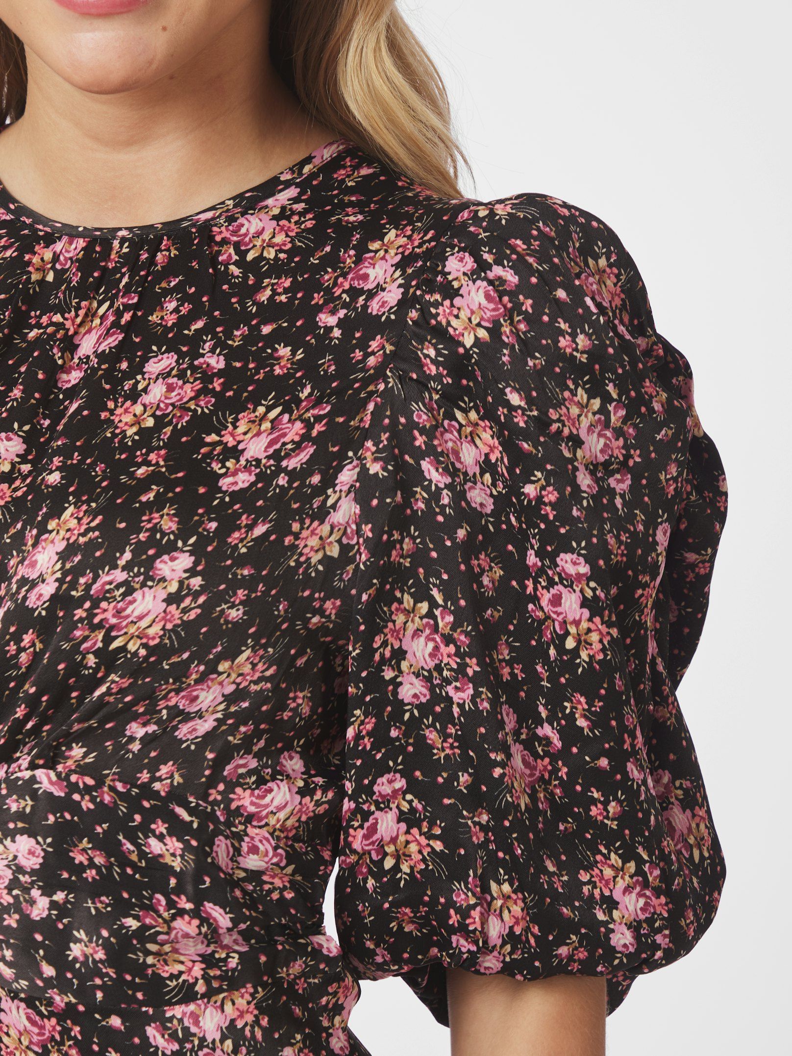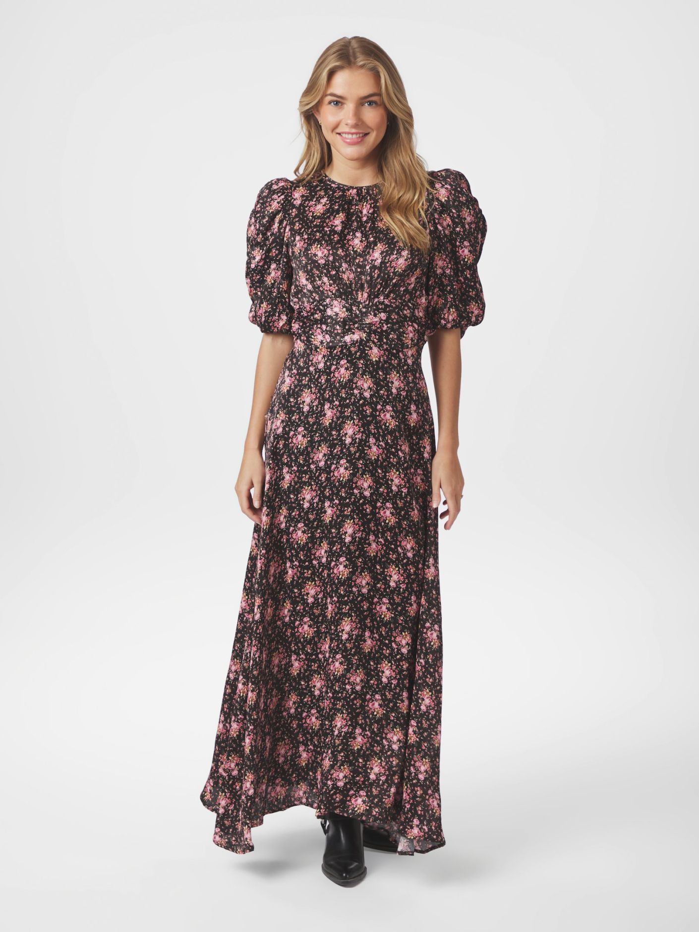Nydelig kjole med sort bunn og delikat flerfarget blomsterprint fra Neo Noir. Modellen er tettsittende i overkroppen, med skjørt som skrår ut i maxilengde. Rund hals og delikate albulange pufferemer med elastisk i mansjett. Behagelig smock i rygg og knappelukking i nakken skaper en perfekt passform. Style kjolen med boots og strikk til hverdags og pynt opp med hæler til festlige anledninger.