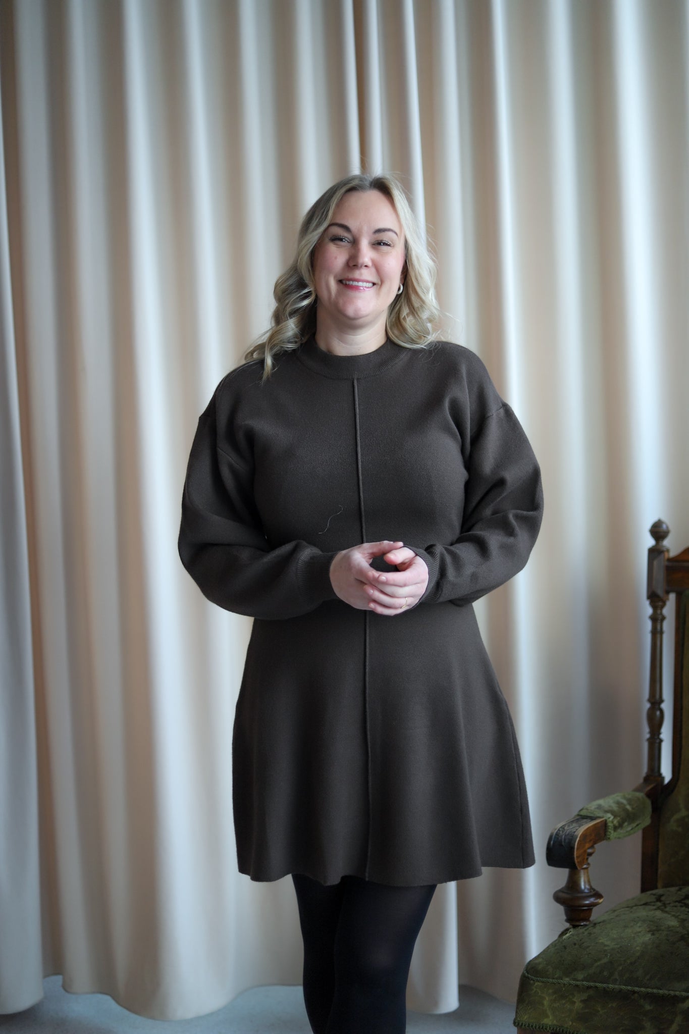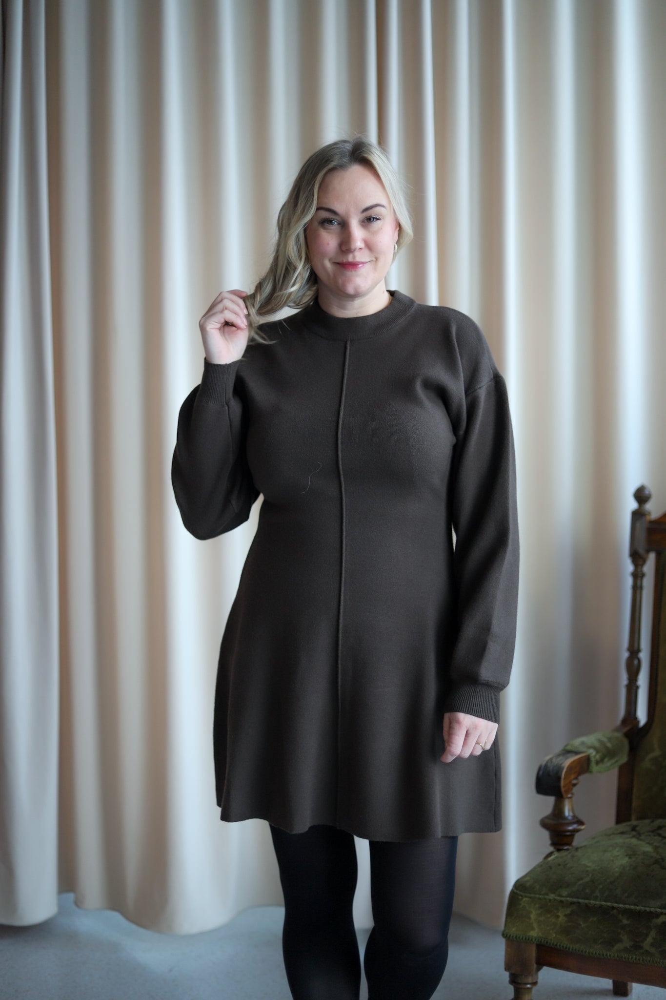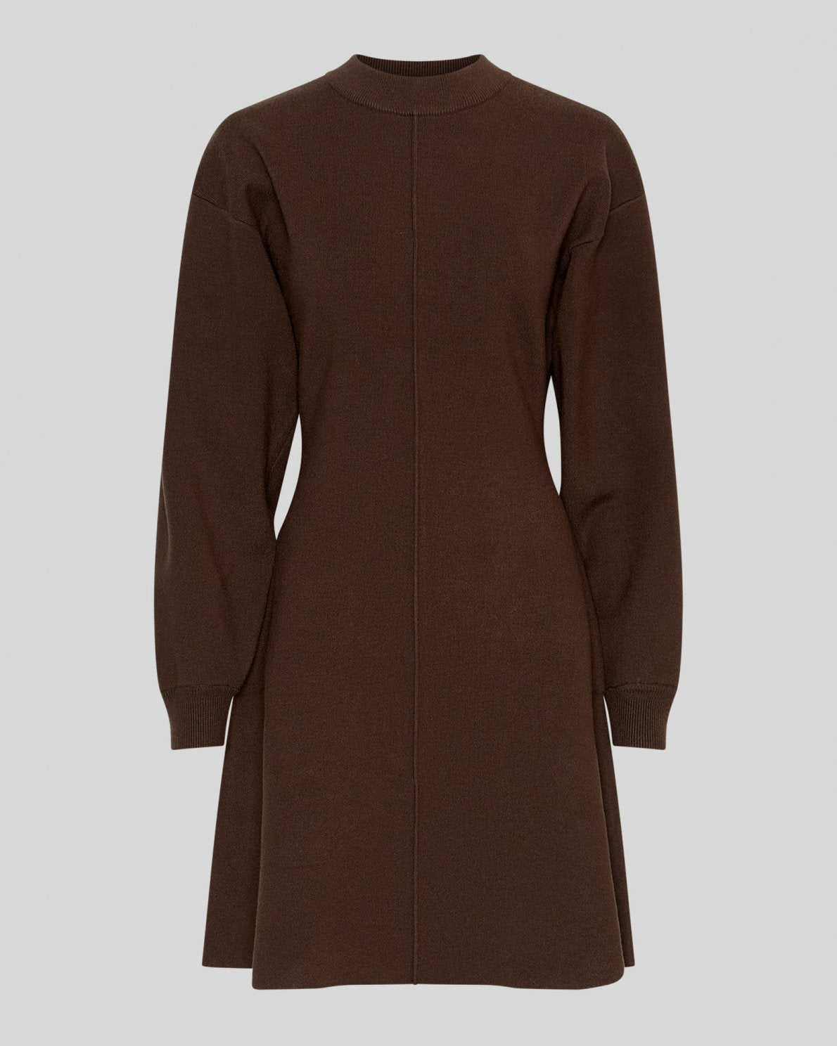 Stilig kjole i mørk brun fra MSCH Copenhagen. Modellen har rund hals og feminin innsvingt midje. Voluminøse ermer med droppet skulder som skrår inn mot mansjett. Skjørtet skrår ut med lengde til knærne. Lekker hverdagskjole som er superfin til både boots og sneakers.