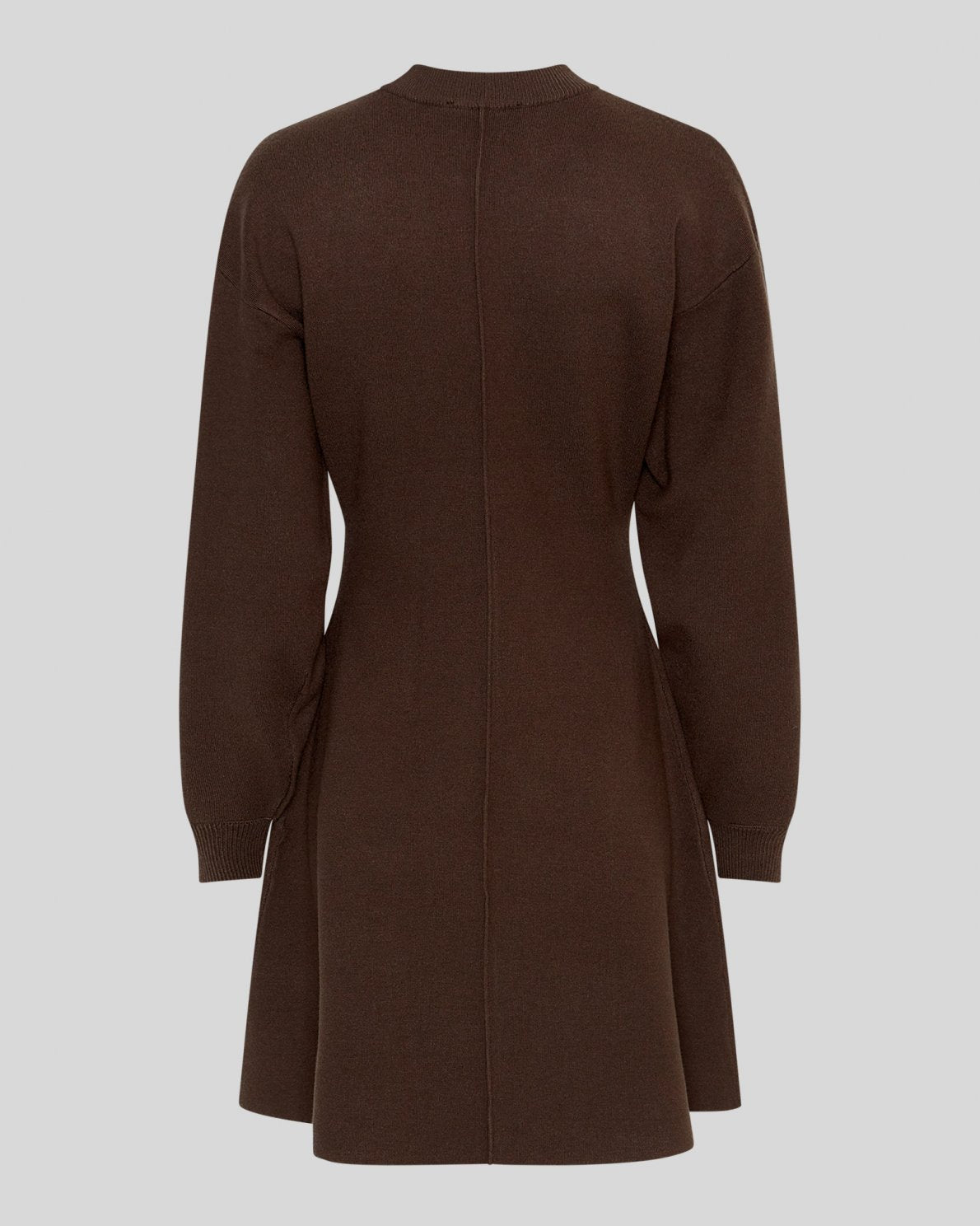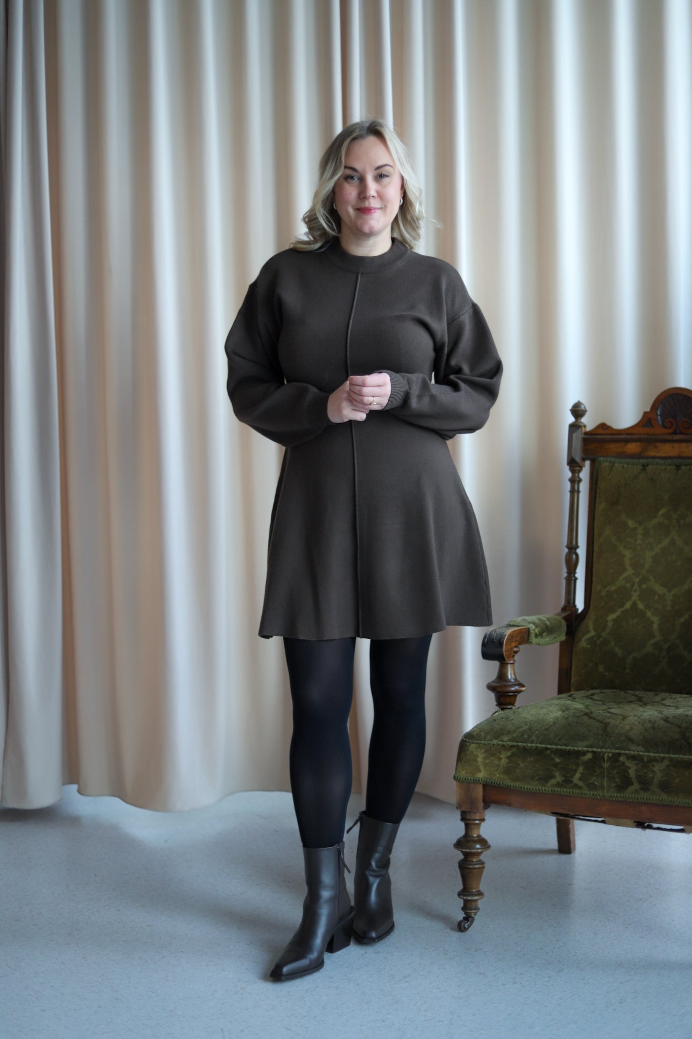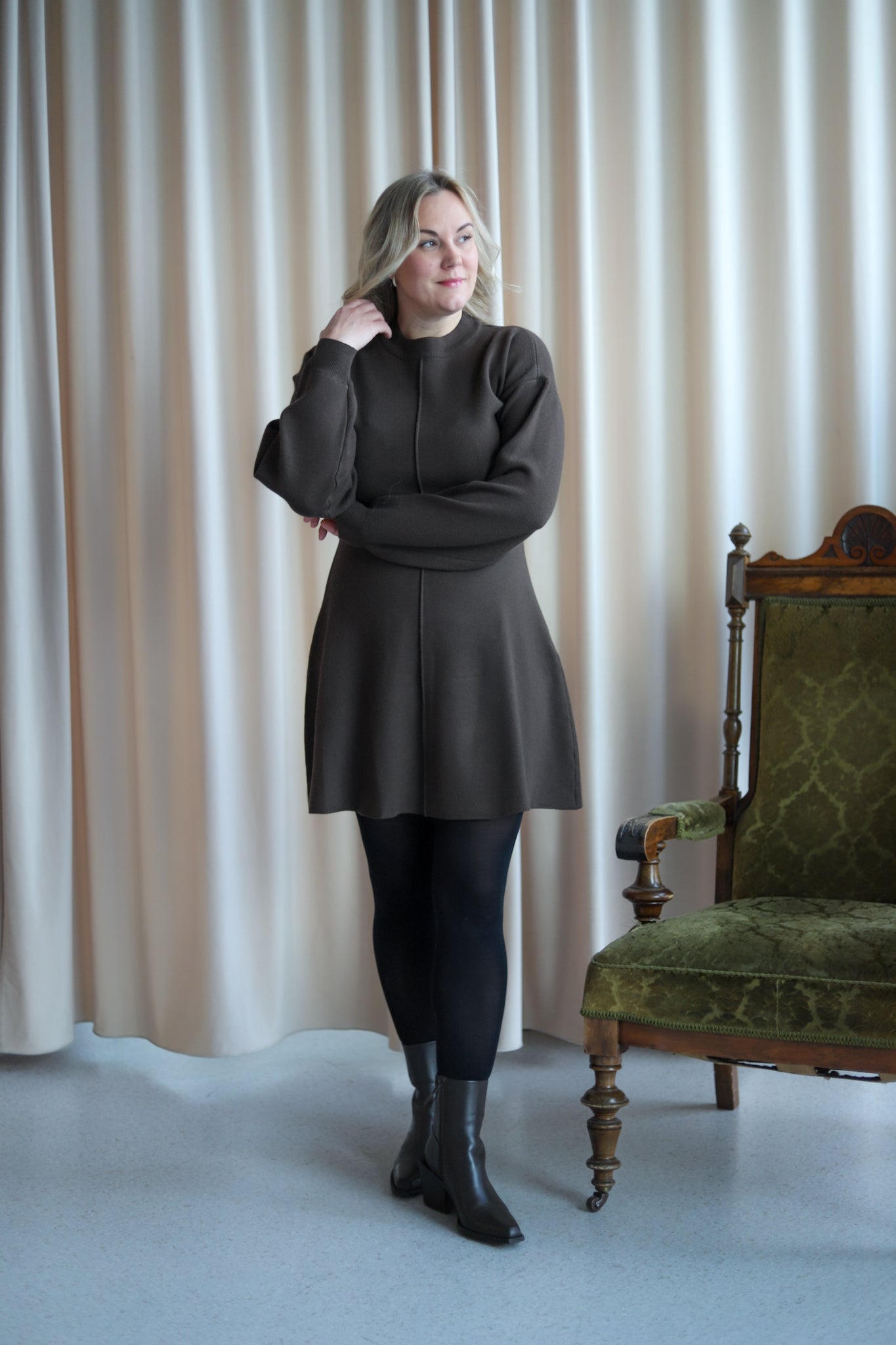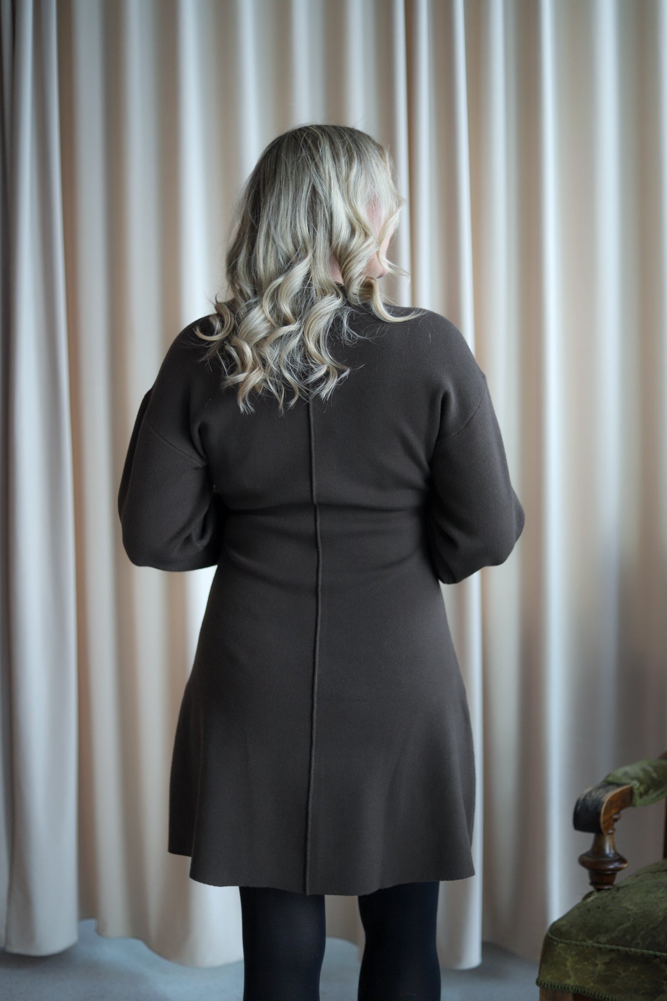 Stilig kjole i mørk brun fra MSCH Copenhagen. Modellen har rund hals og feminin innsvingt midje. Voluminøse ermer med droppet skulder som skrår inn mot mansjett. Skjørtet skrår ut med lengde til knærne. Lekker hverdagskjole som er superfin til både boots og sneakers.