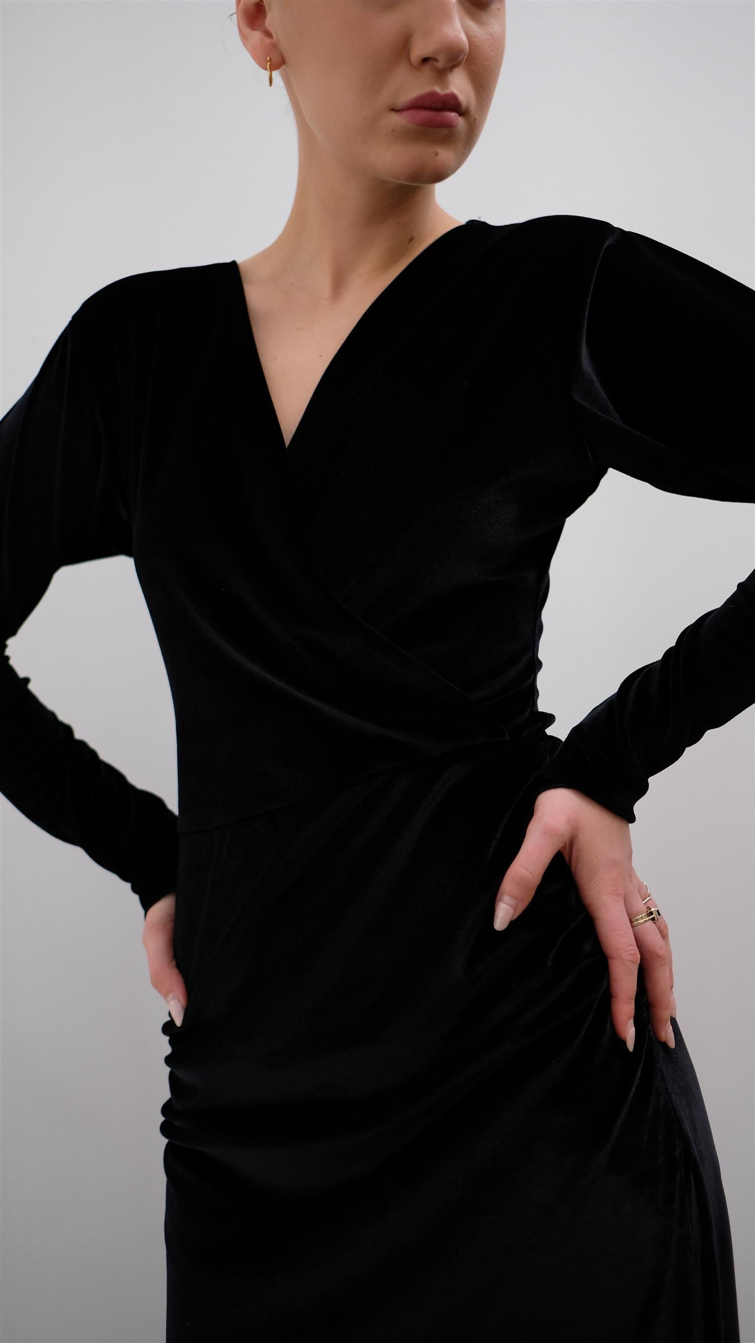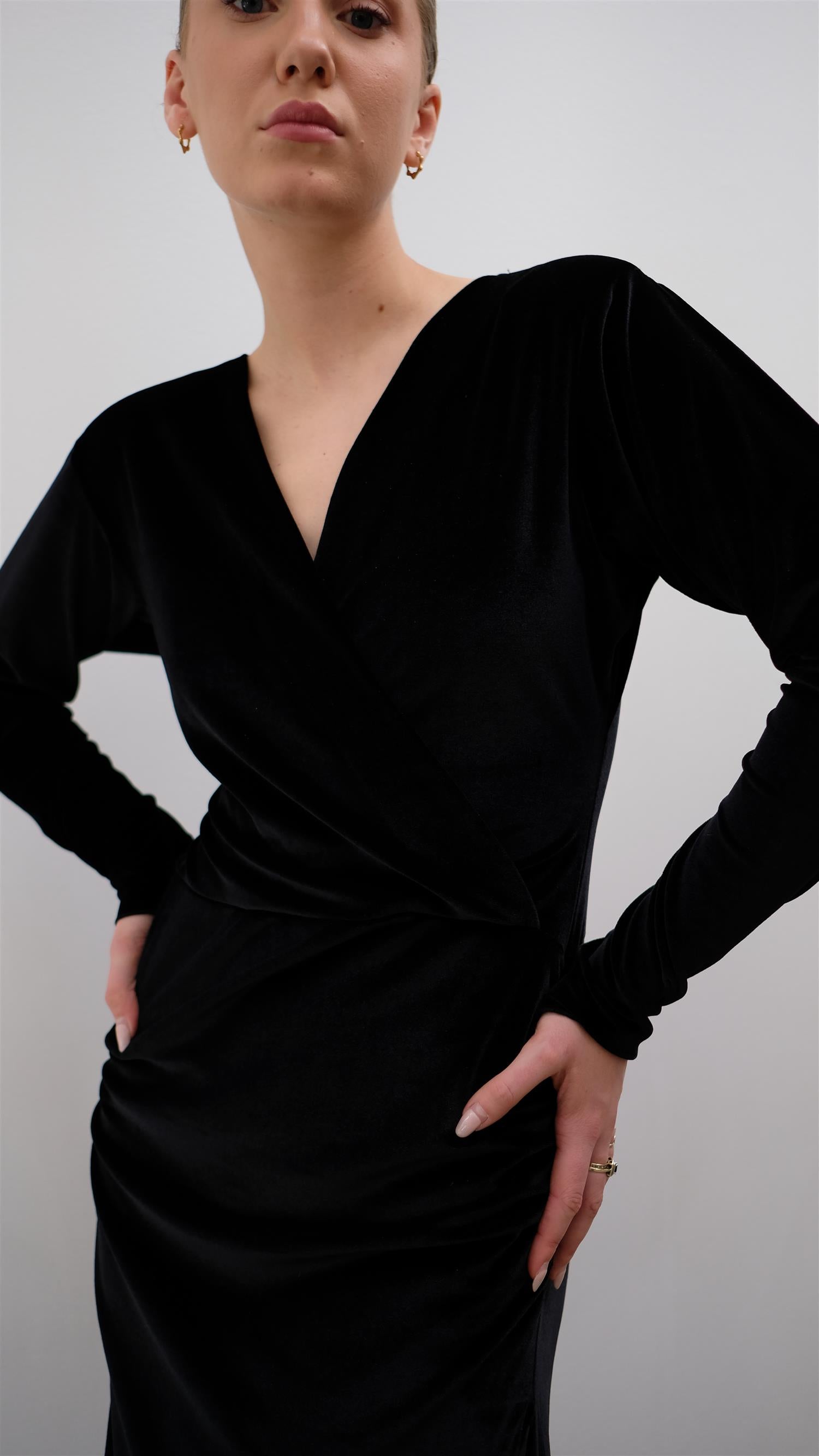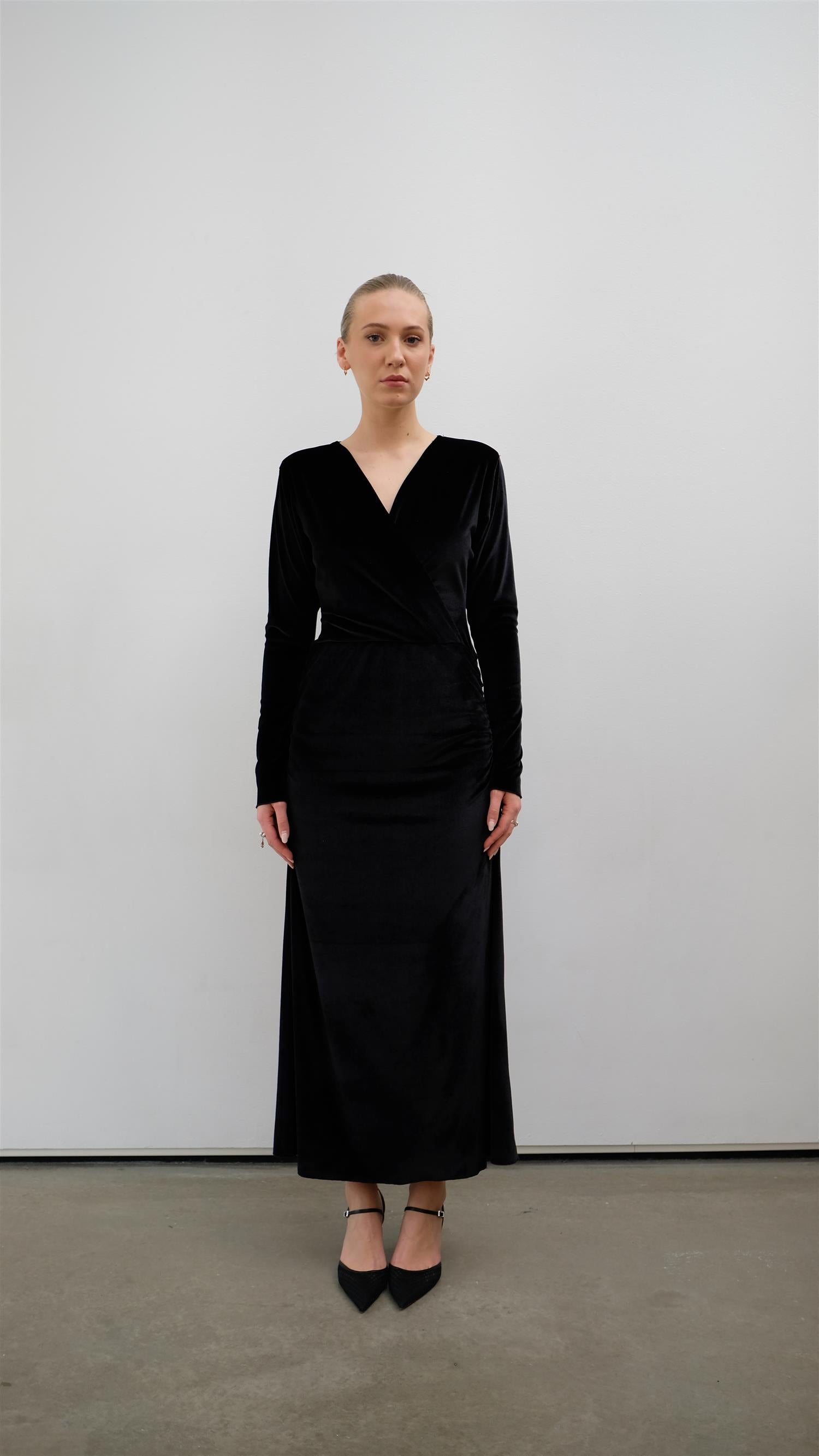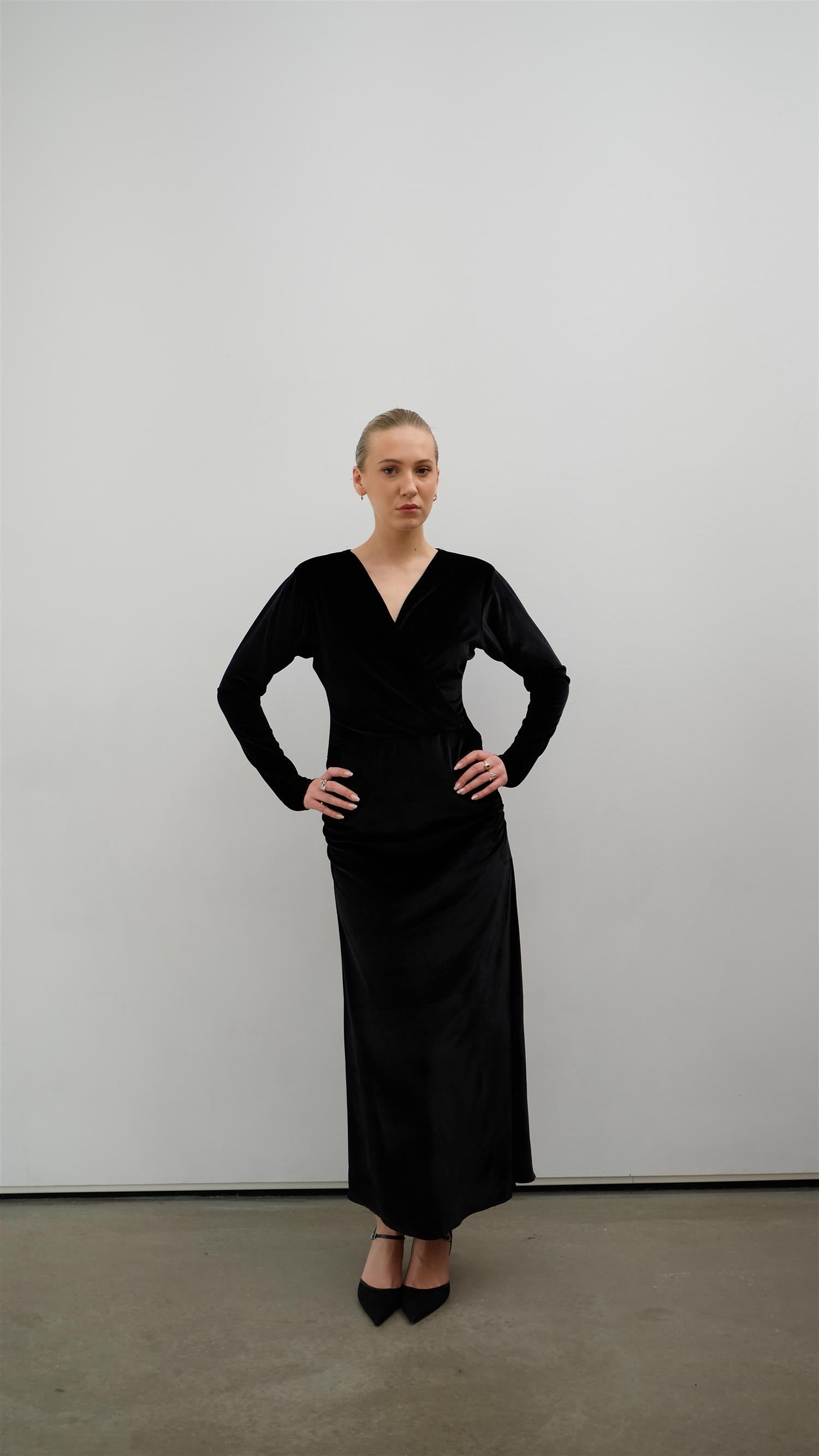 Elegant kjole i klassisk sort fra Once Untold. Modellen er tettsittende med V-hals og lange smale ermer. Den er i myk fløyel og har drapert midje som skaper en nydelig silhuett. Omslagseffekten fremhever midjen og ankellengden gir kjolen en eksklusiv look. Perfekt kjole til sesongens festligheter.