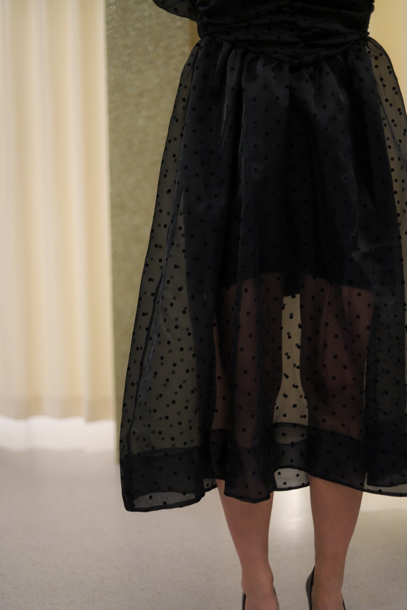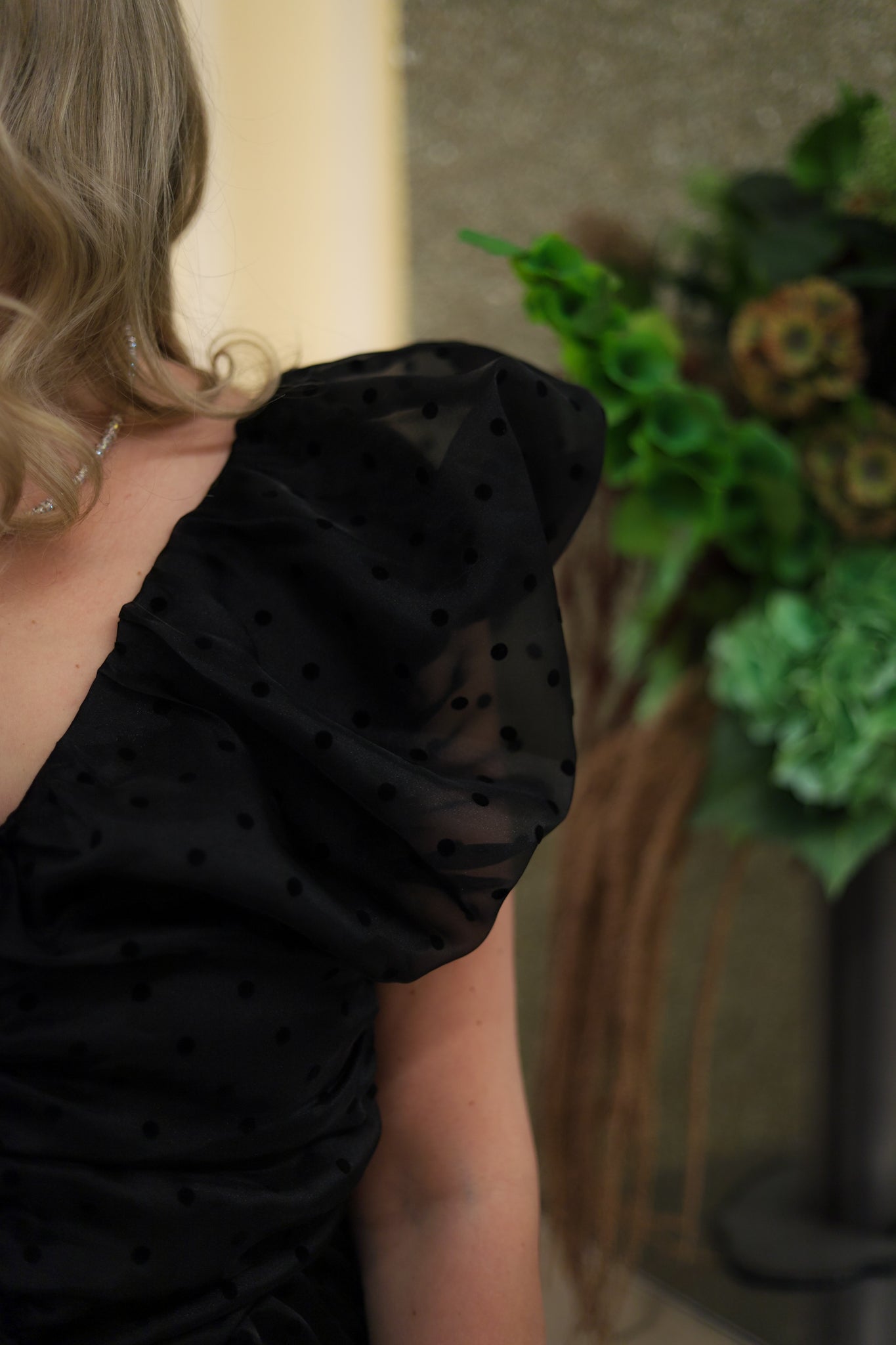 Lekker sort organzakjole med rouching-detaljer og voluminøst midiskjørt fra Ganni. Myk gjennomskinnelig organza med dots ton-i-ton. Fóret i overdel og med lårkort underskjørt som gir en kul effekt. Feminin modell med v-skjæring foran og bak, markert midje og puff i skulderen. Lukkes med skjult glidelås bak. Nydelig kjole som fint kan pyntes opp og ned.