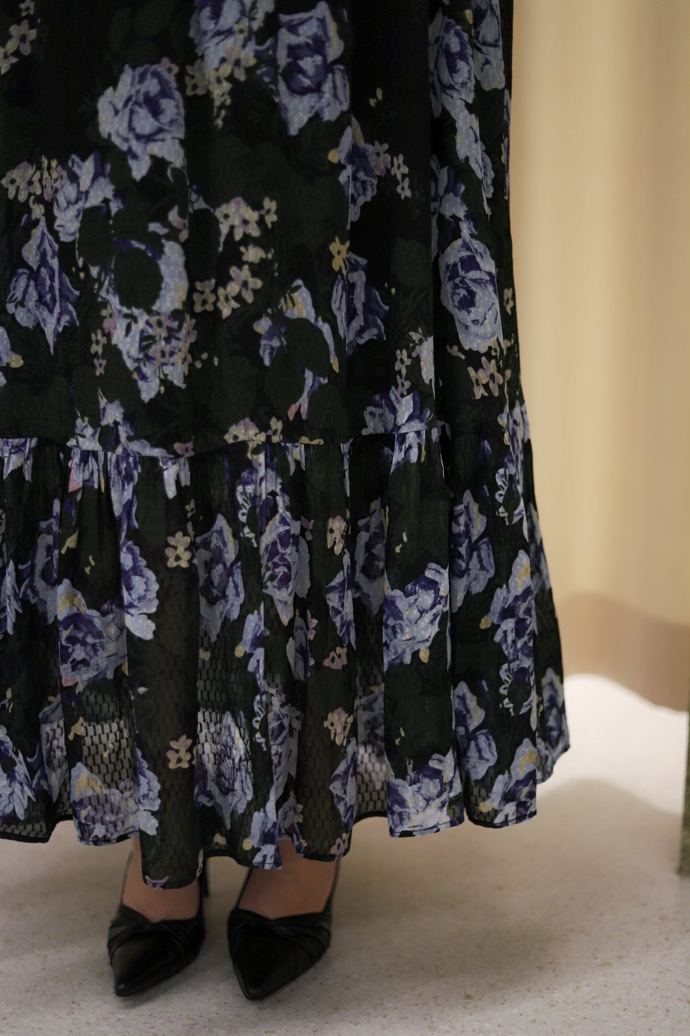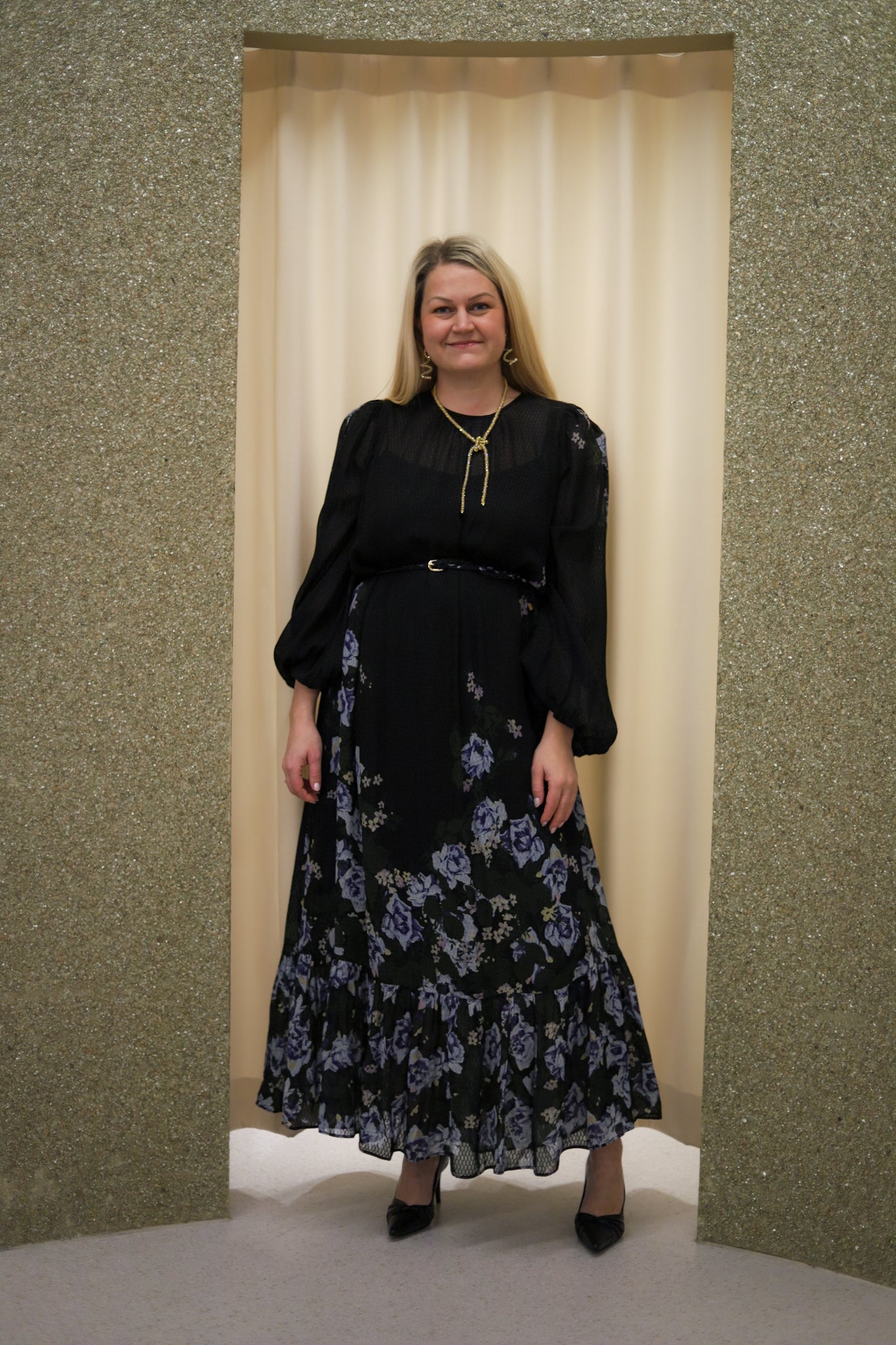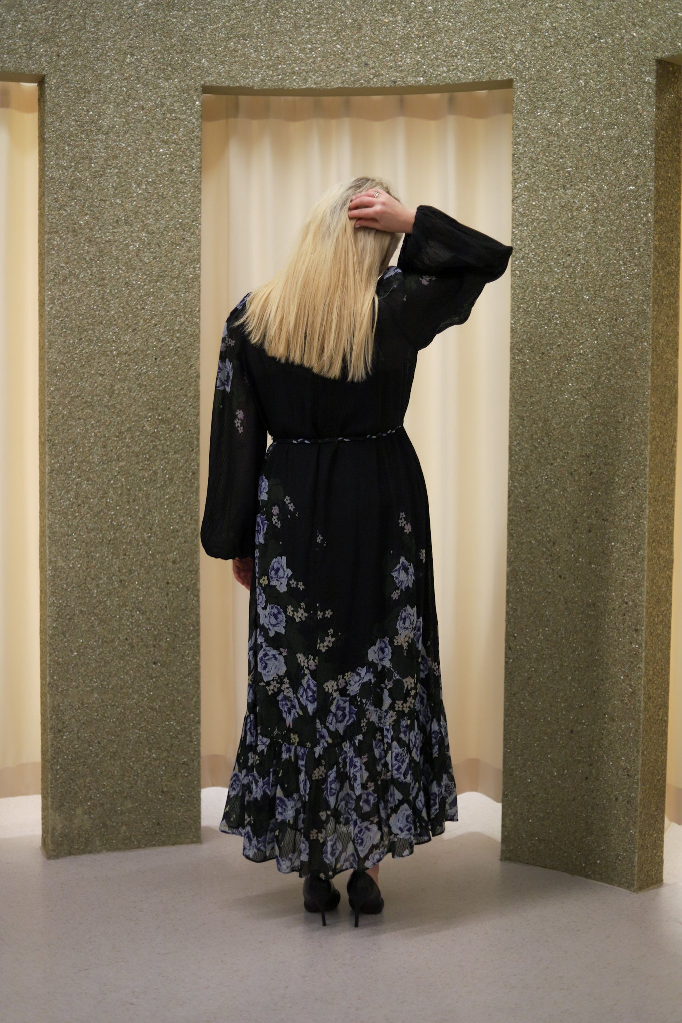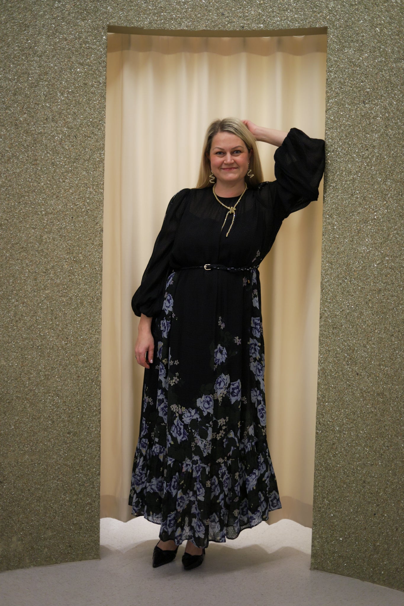 Vakker kjole i klassisk sort med blått blomsterprint fra byTiMo. Modellen har midilengde, avslappet passform, rund hals og lange, voluminøse ermer med elastiske mansjetter. Laget i delikat og teksturerte FSC-sertifiserte viskose-georgettekvalitet. Følger med flettet, matchende belte og lukkes bak med glidelås. Lekker kjole til sesongens festligheter.