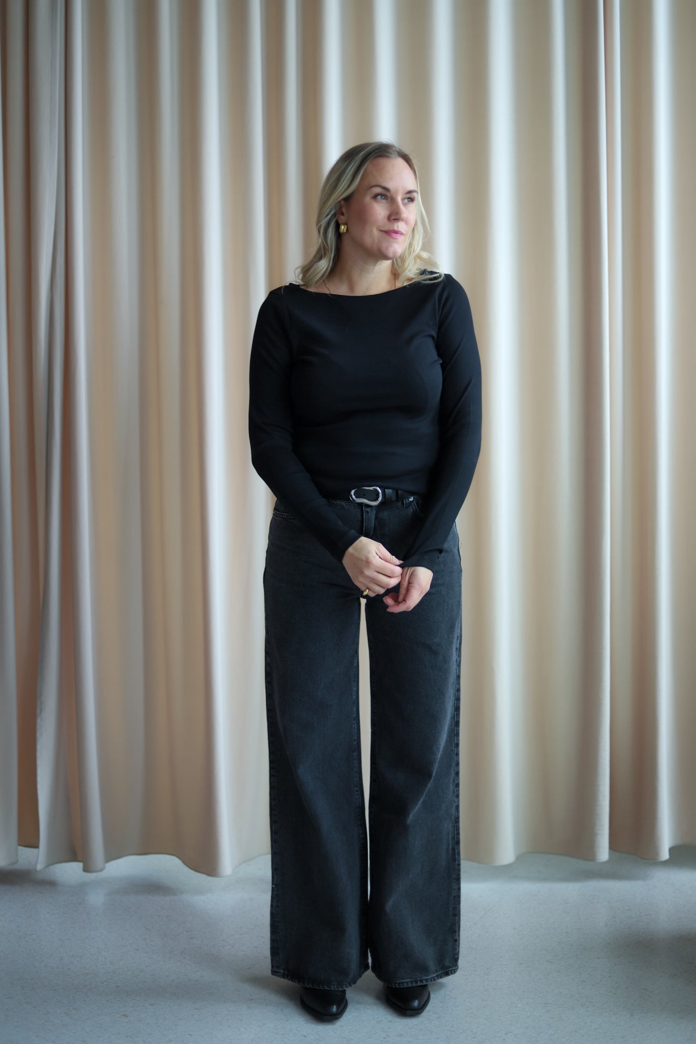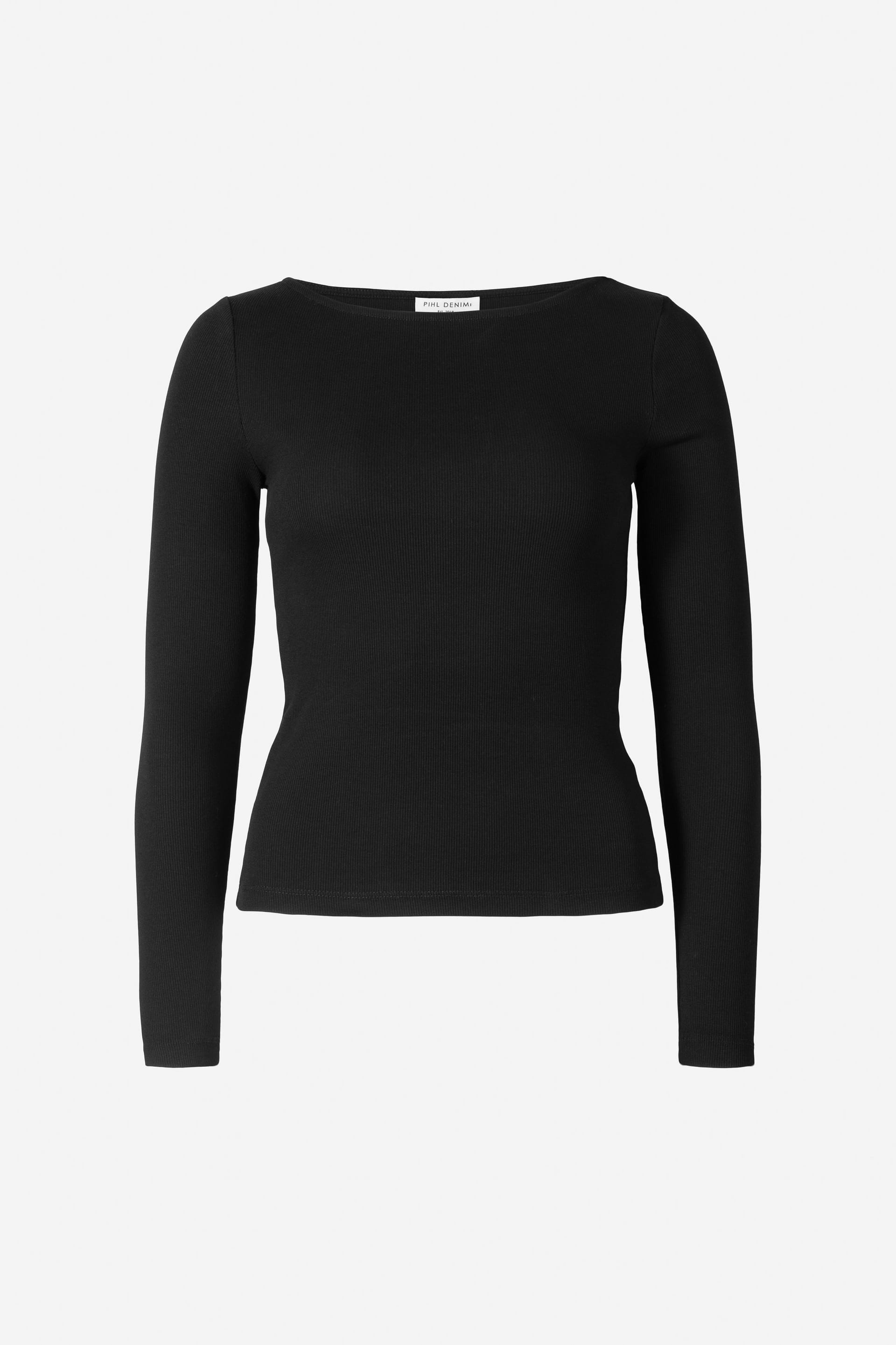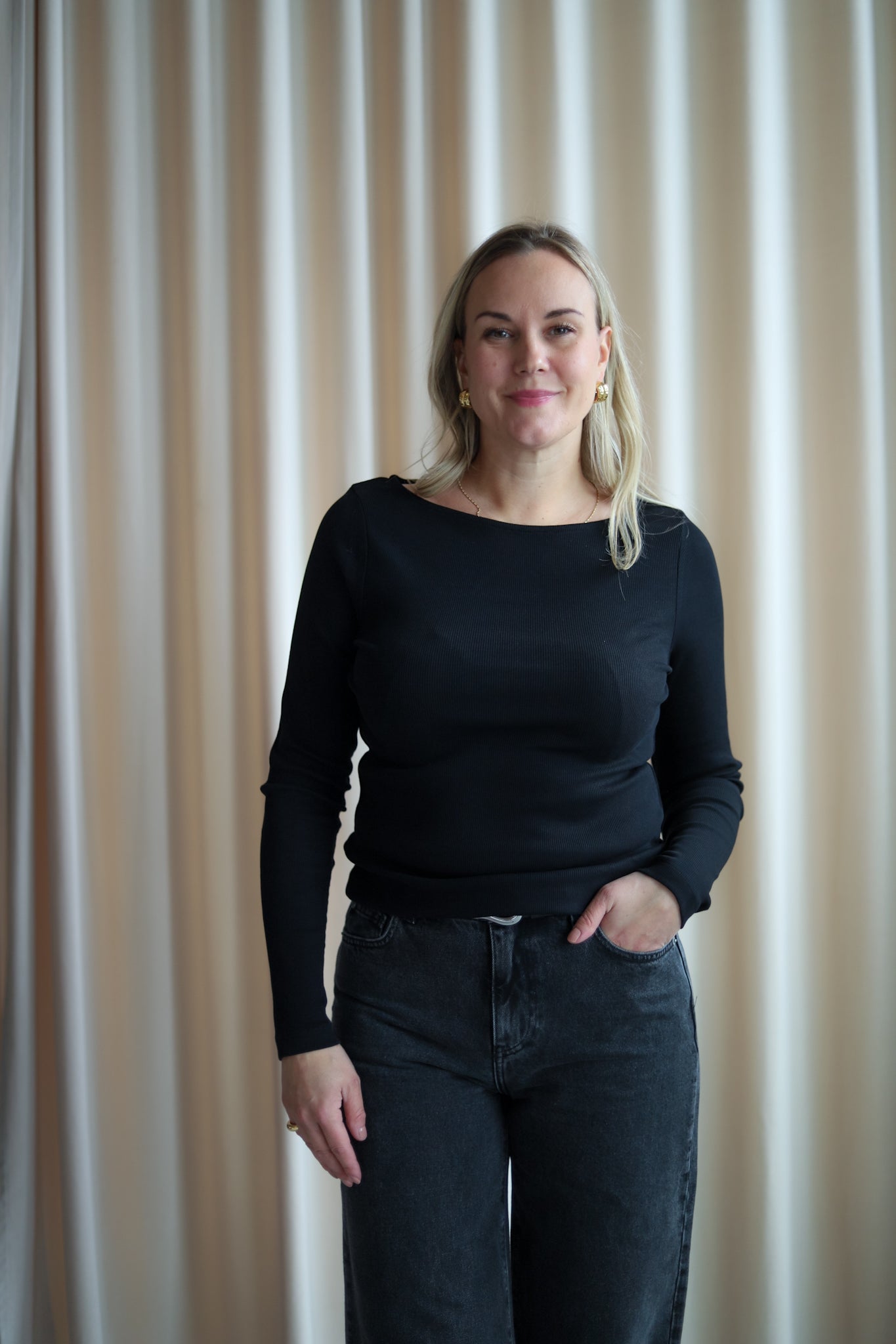 Delikat basic i klassisk sort ribbestrikk fra Camilla Pihl. Modellen er tettsittende med feminin båthals og lange smale ermer. En myk og elastisk klassiker som er like fin til jeans, skjørt og under en blazer.