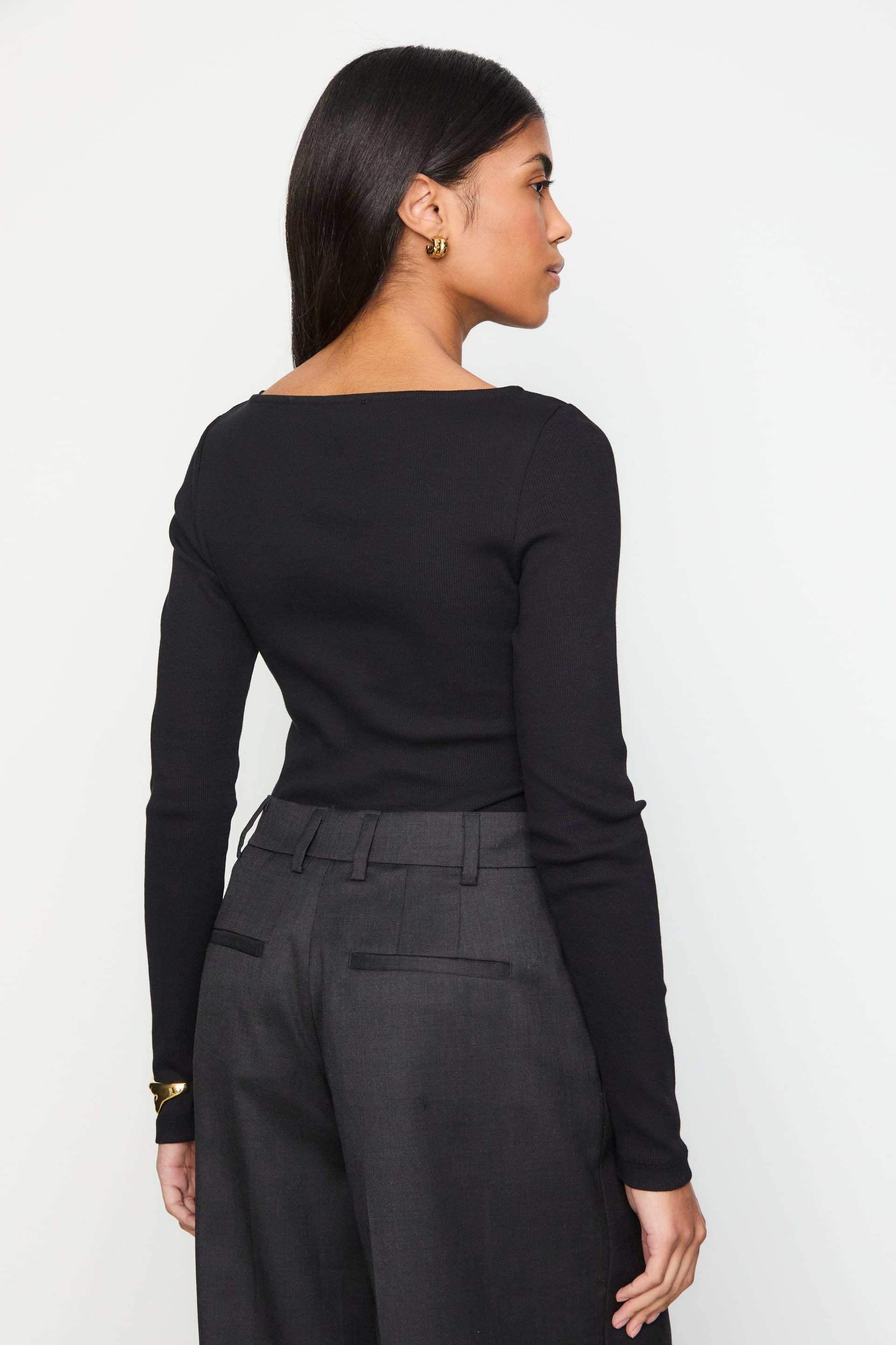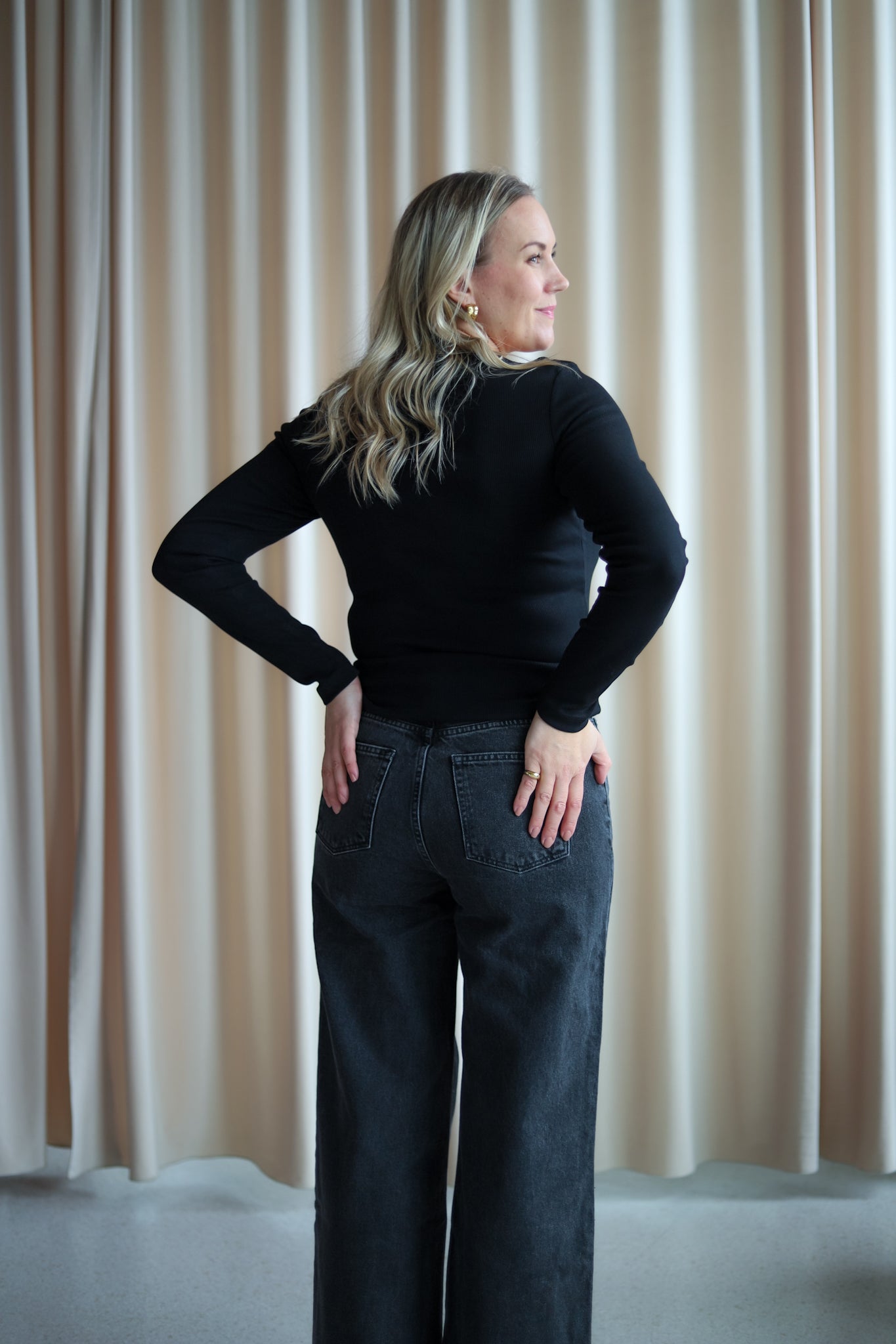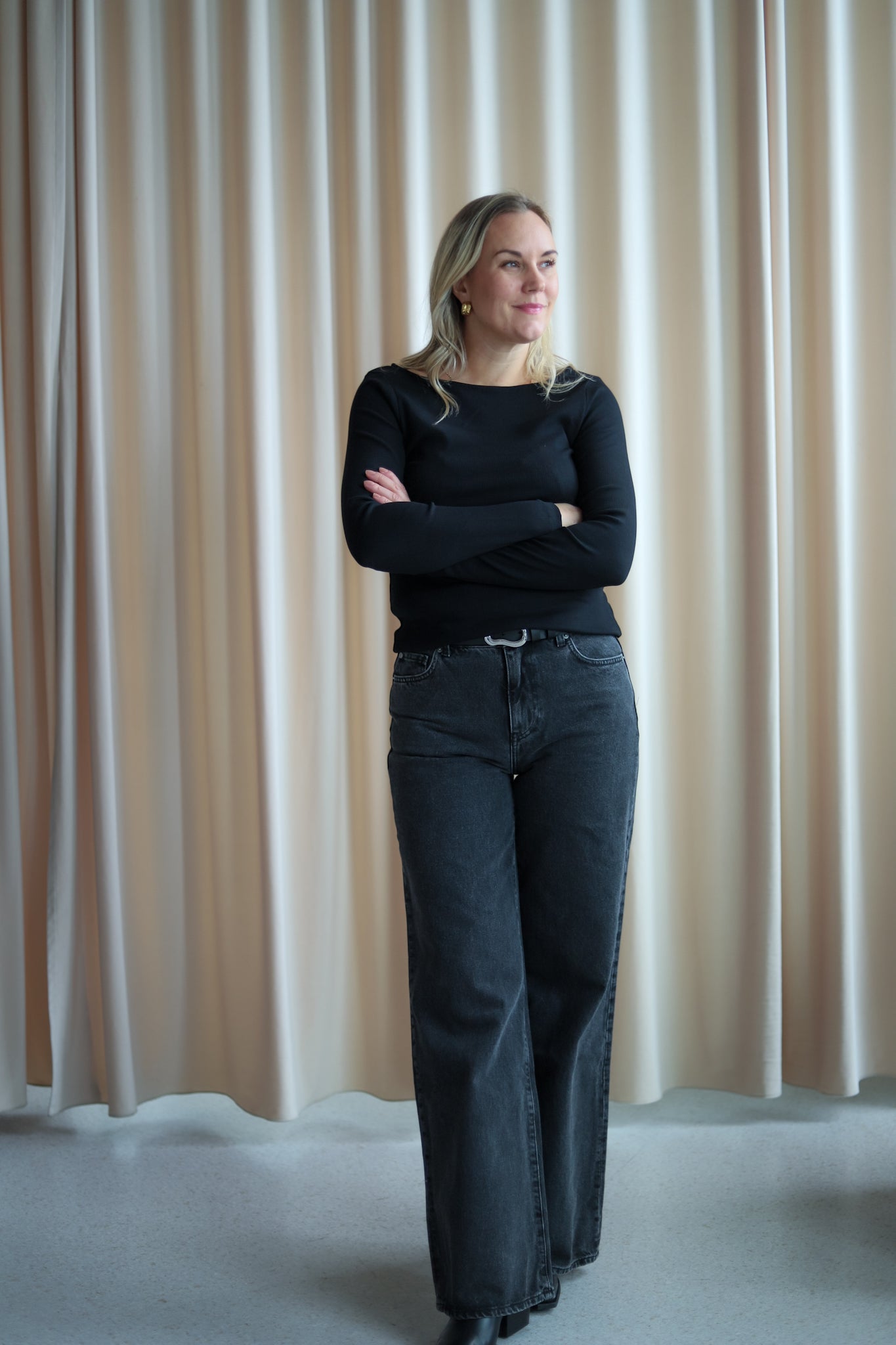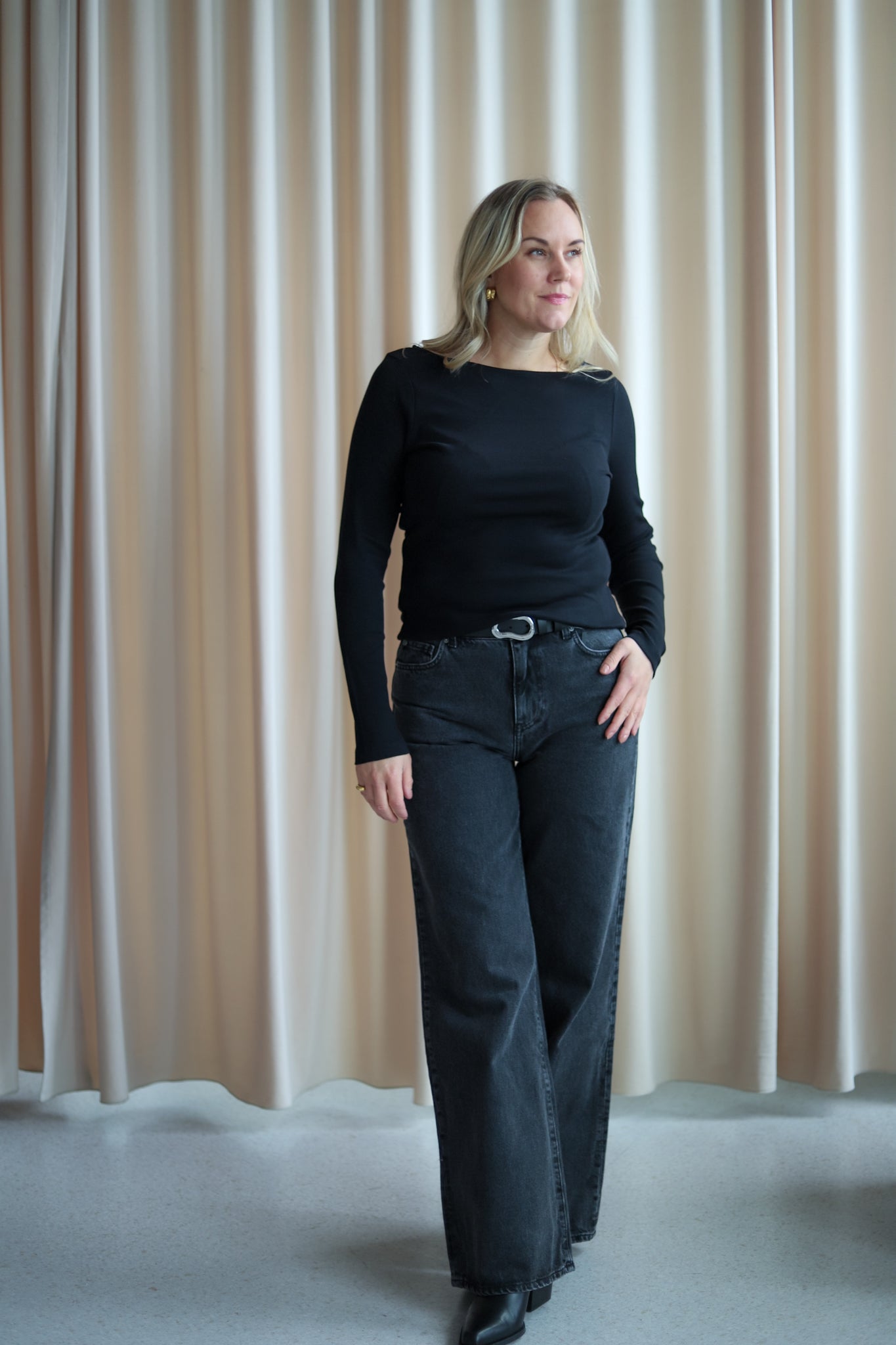 Delikat basic i klassisk sort ribbestrikk fra Camilla Pihl. Modellen er tettsittende med feminin båthals og lange smale ermer. En myk og elastisk klassiker som er like fin til jeans, skjørt og under en blazer.