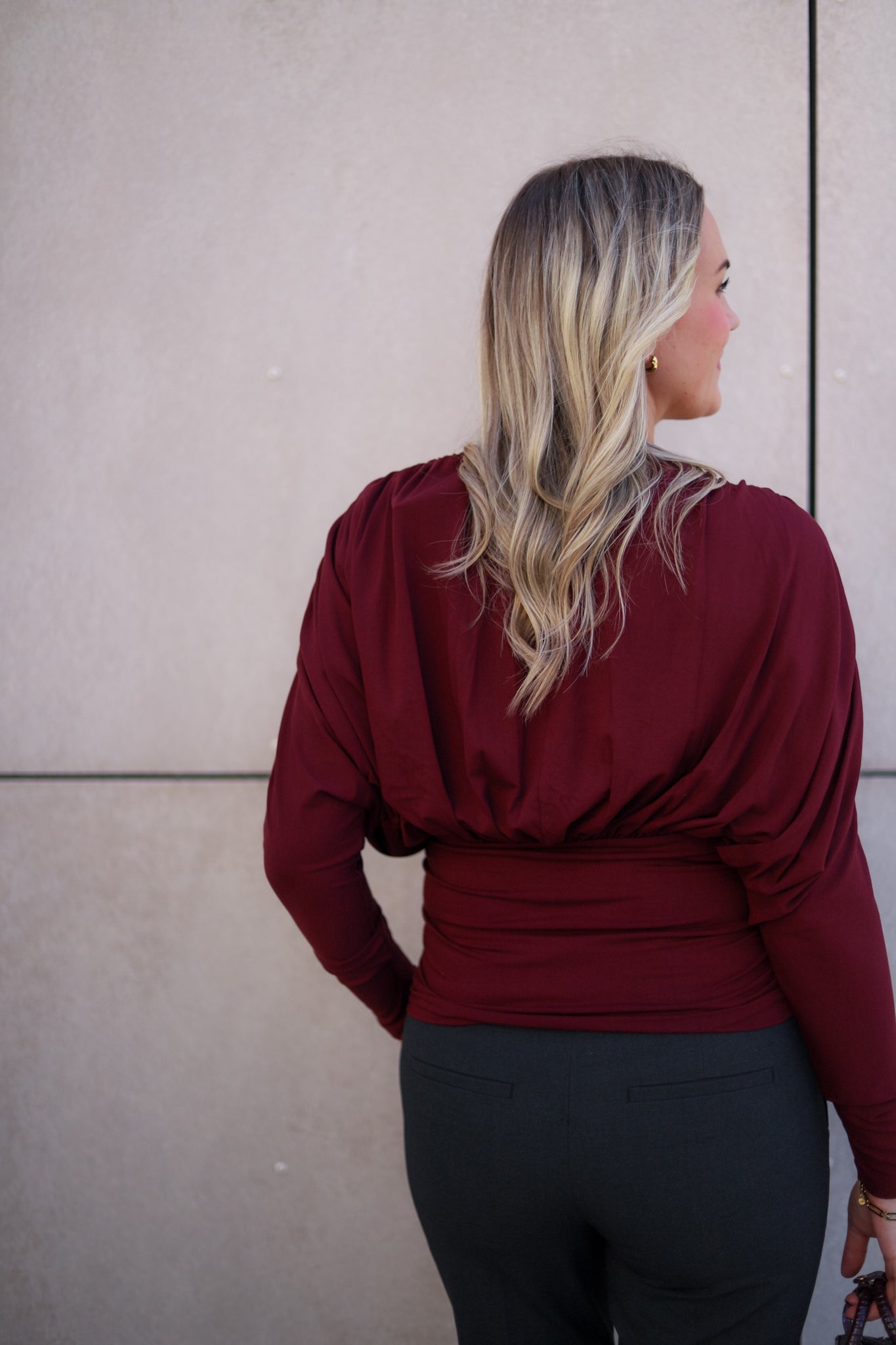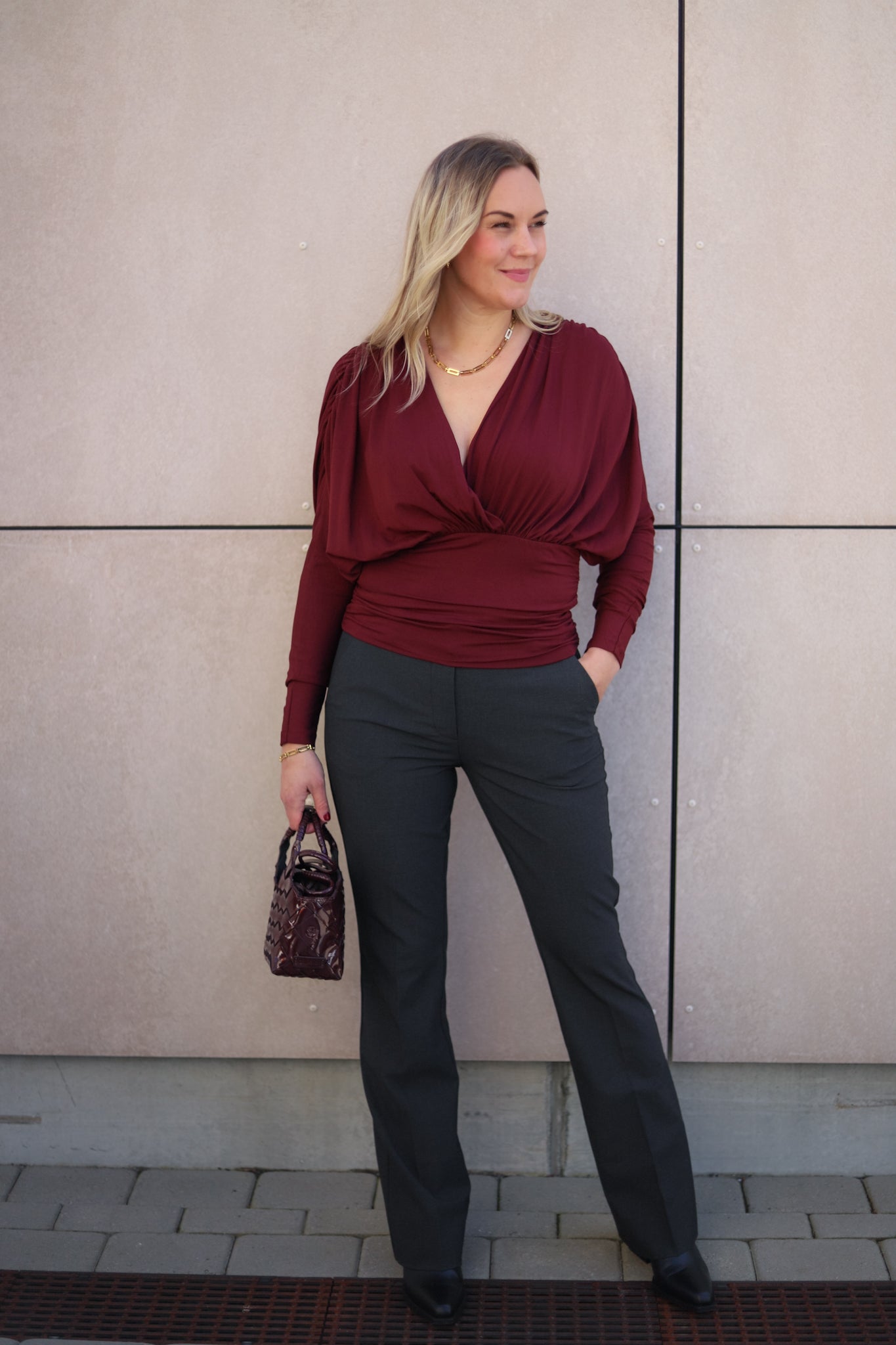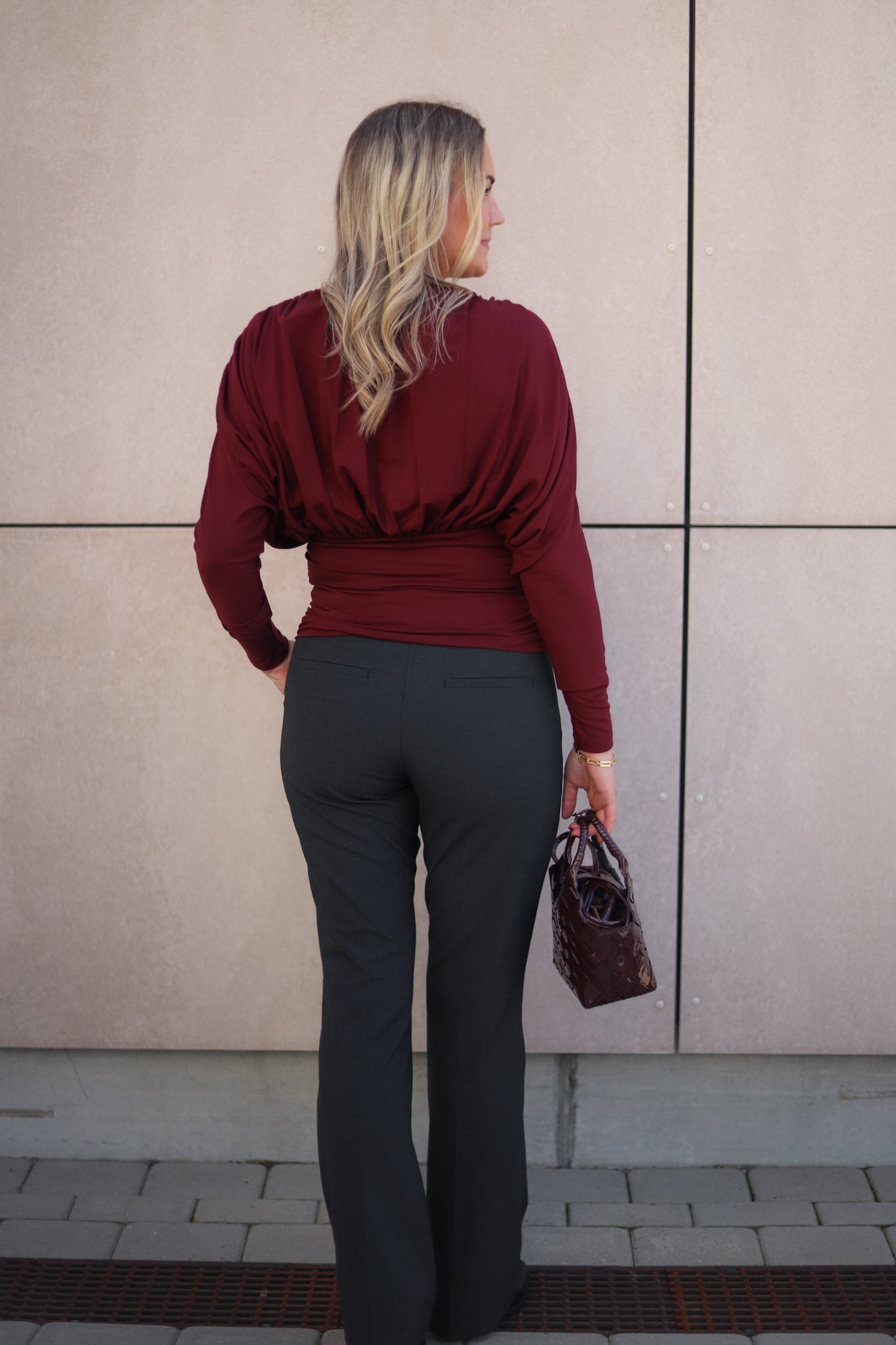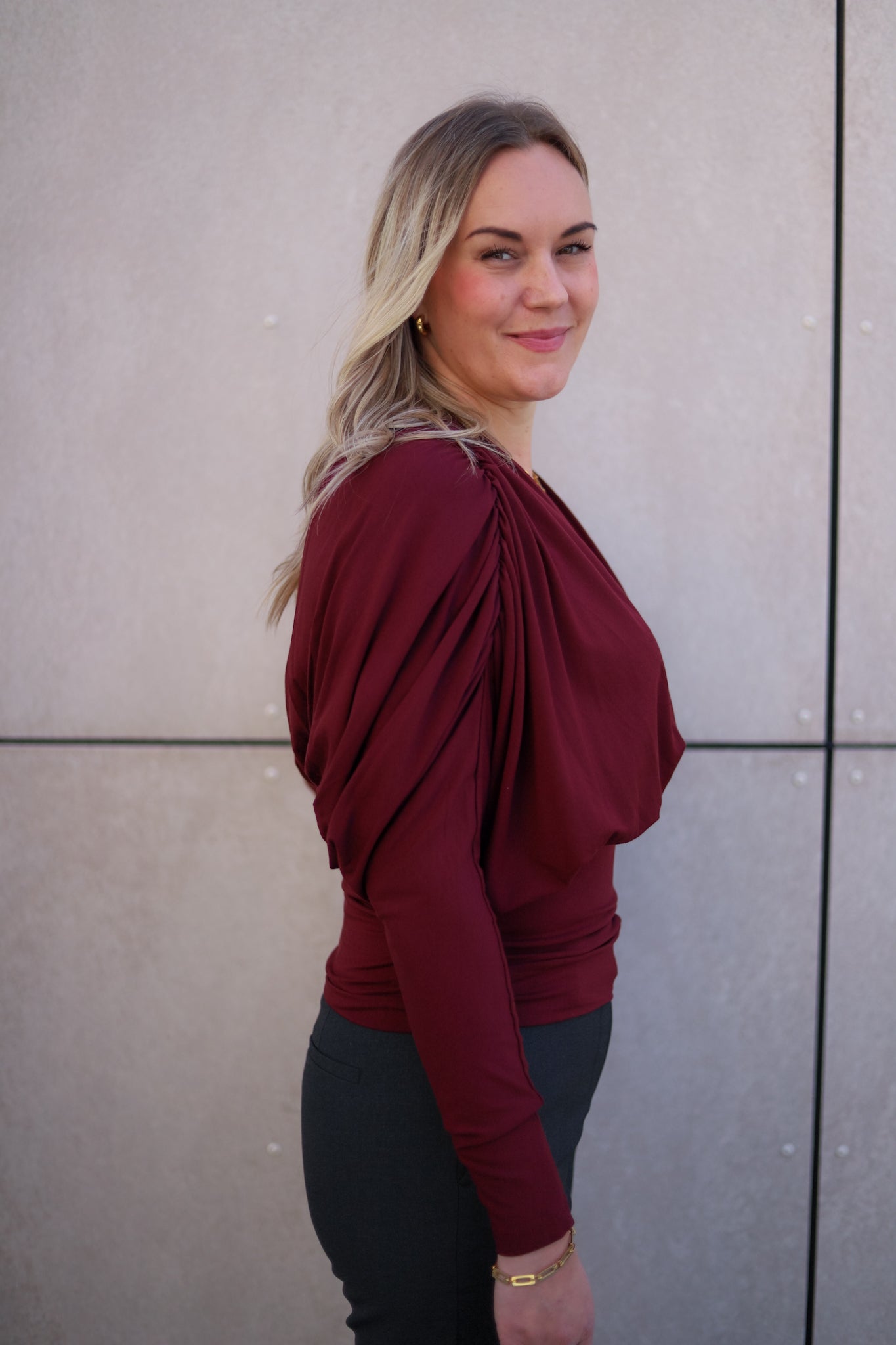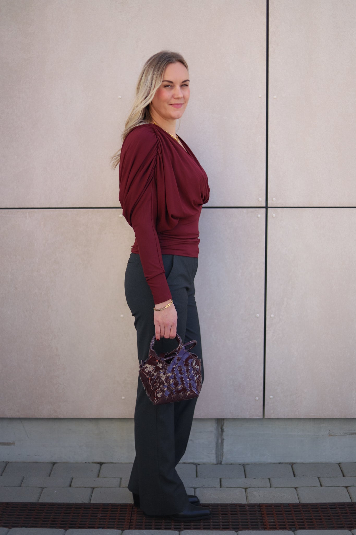Nydelig topp i trendy burgunder fra Viveh. Modellen har lange ermer med løs passform på skuldrene og en tettsittende midje. Laget av VIVEHs signaturstoff, en ECOVERO™ viskosejersey som faller vakkert og føles myk mot huden. Allsidig da den kan brukes på to måter, med en moderne, elegant høy hals eller en V-hals for et mer klassisk, glamorøst utseende. En must have i garderoben!