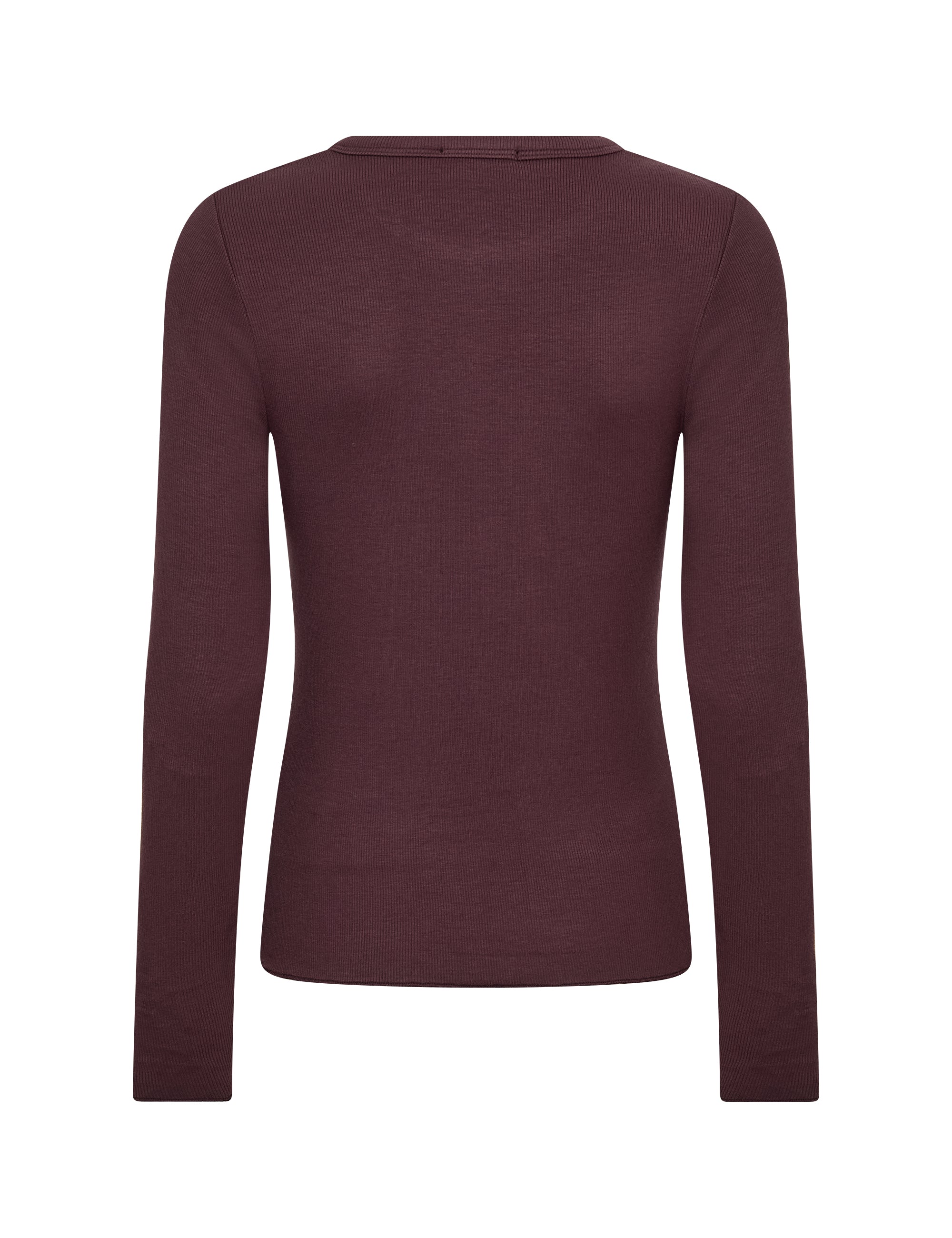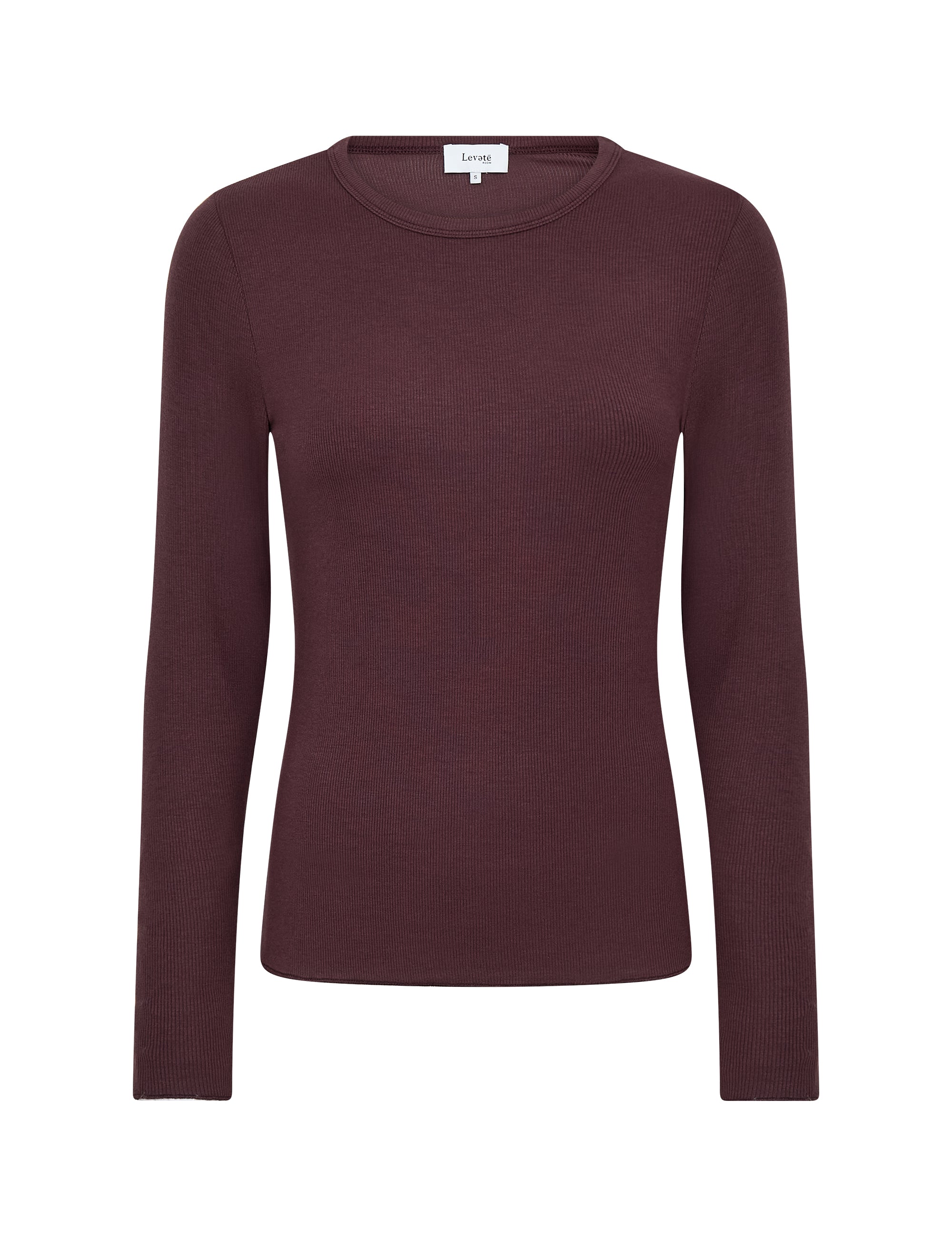 Deilig basic i trendy burgunder fra Levete Room. Modellen er tettsittende ribbestrikk med hoftelengde. Rund hals og lange smale ermer. Anvendelig basic i lett og stretchy viskosekvalitet.