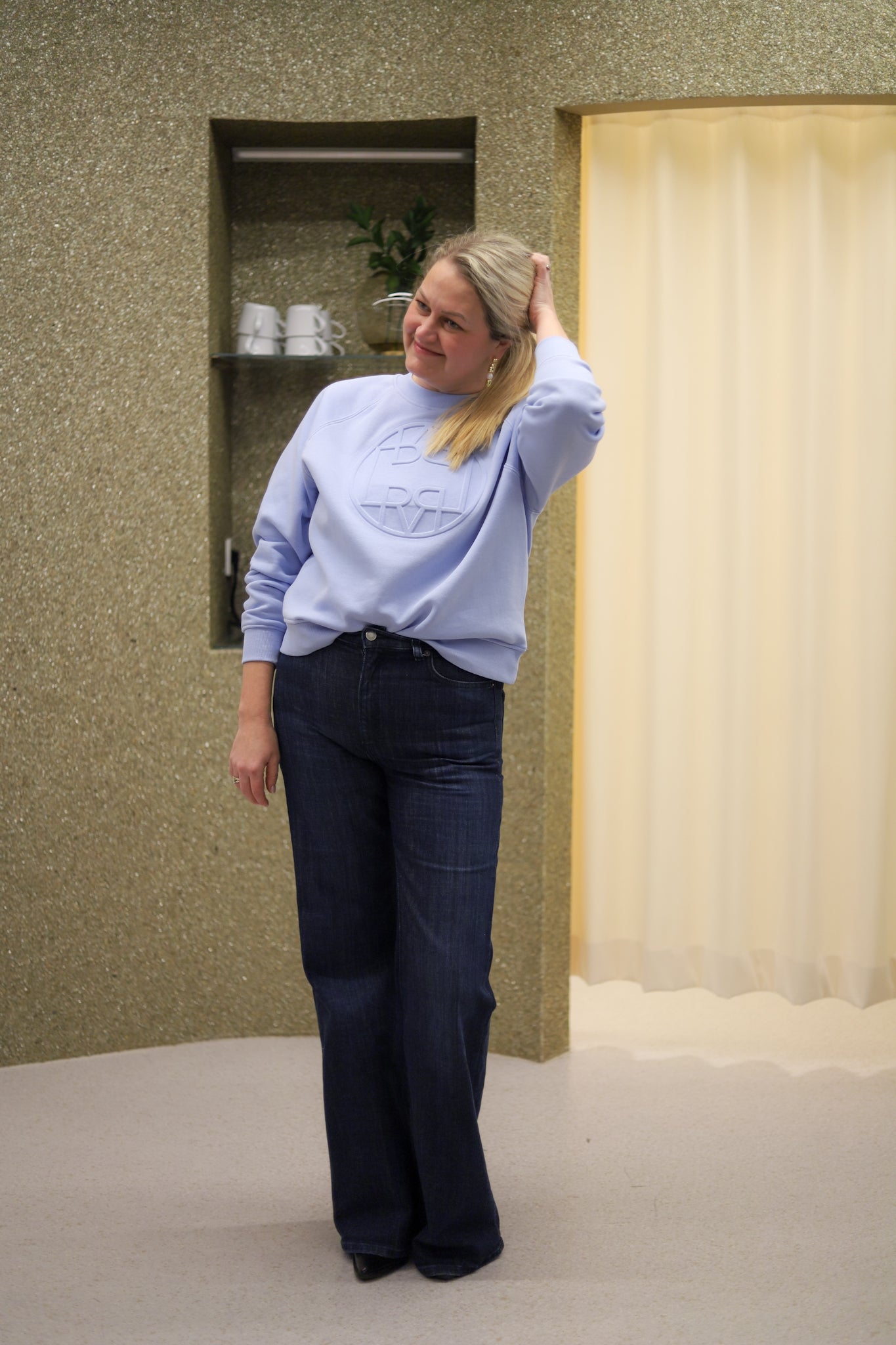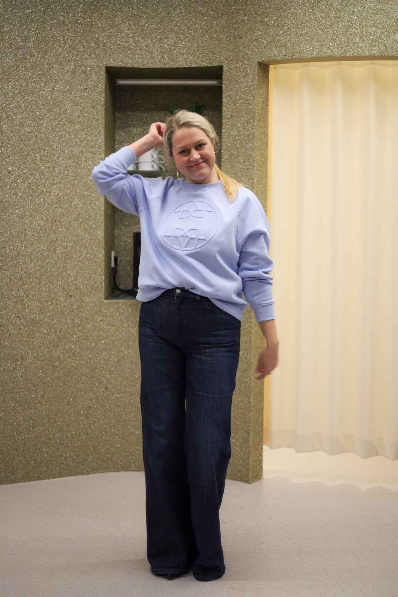 Flott lys blå sweat med brodert ton-i-ton logo fra Levete Room. Deilig bløt bomullsblanding med behagelig børstet innside. Regulær crewneck modell med raglansøm og ribb i kantene. Passformen er rett og avslappet. Tøff til jeans og perfekt som sett med matchende bukse.