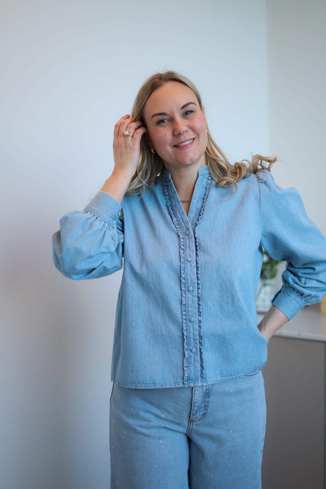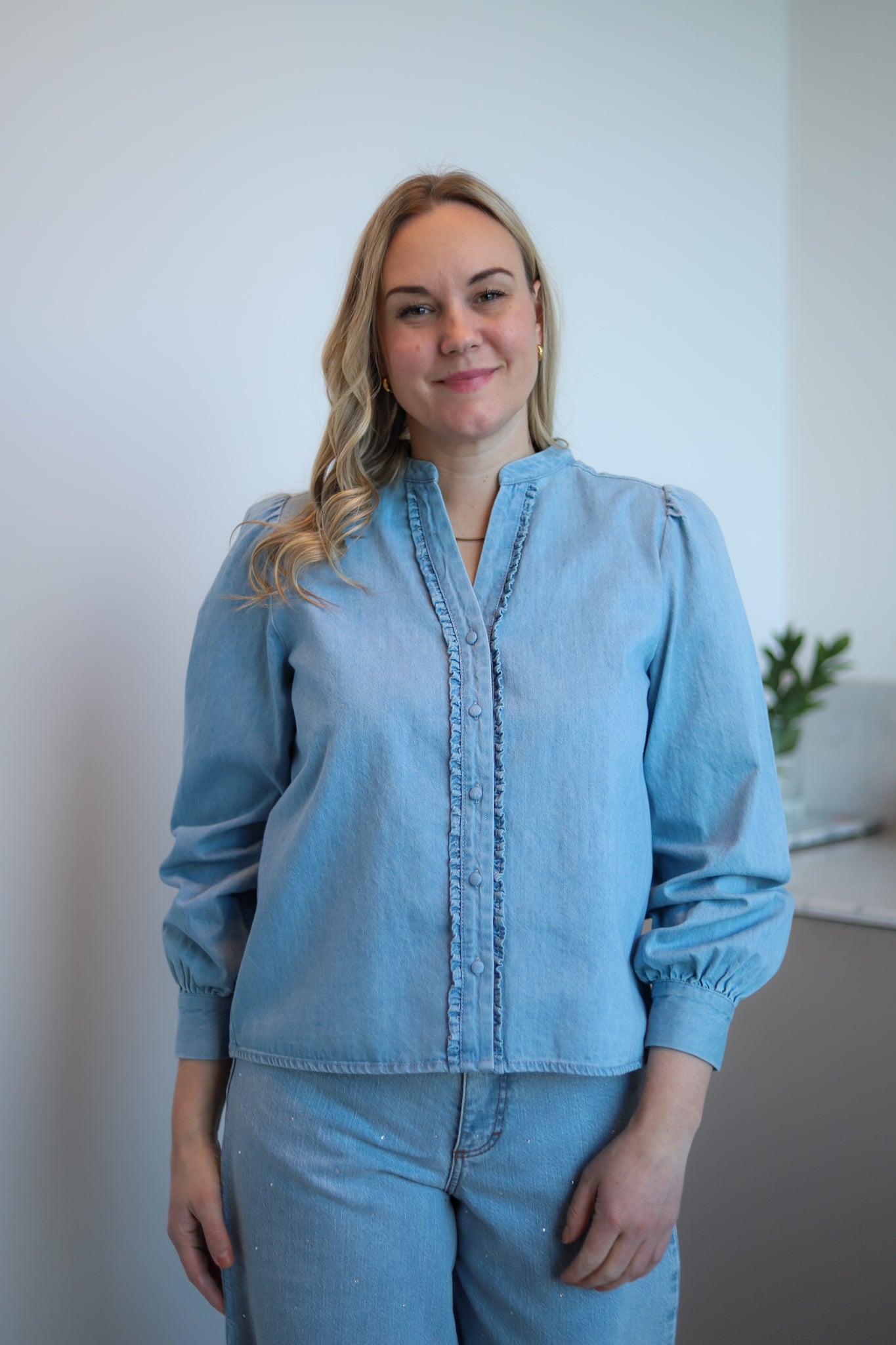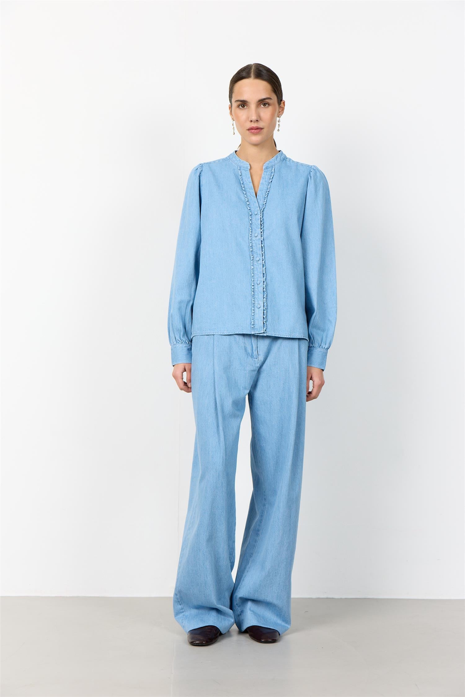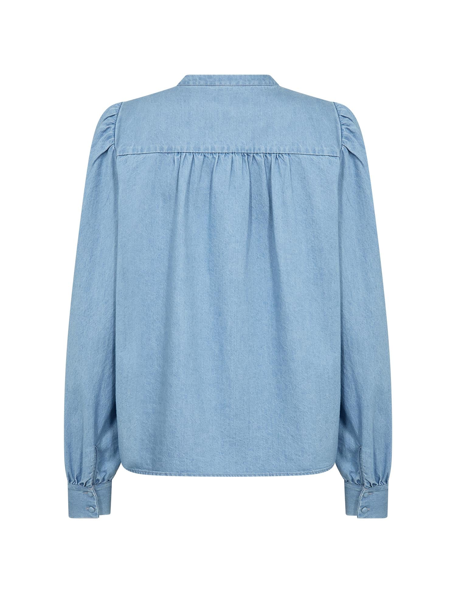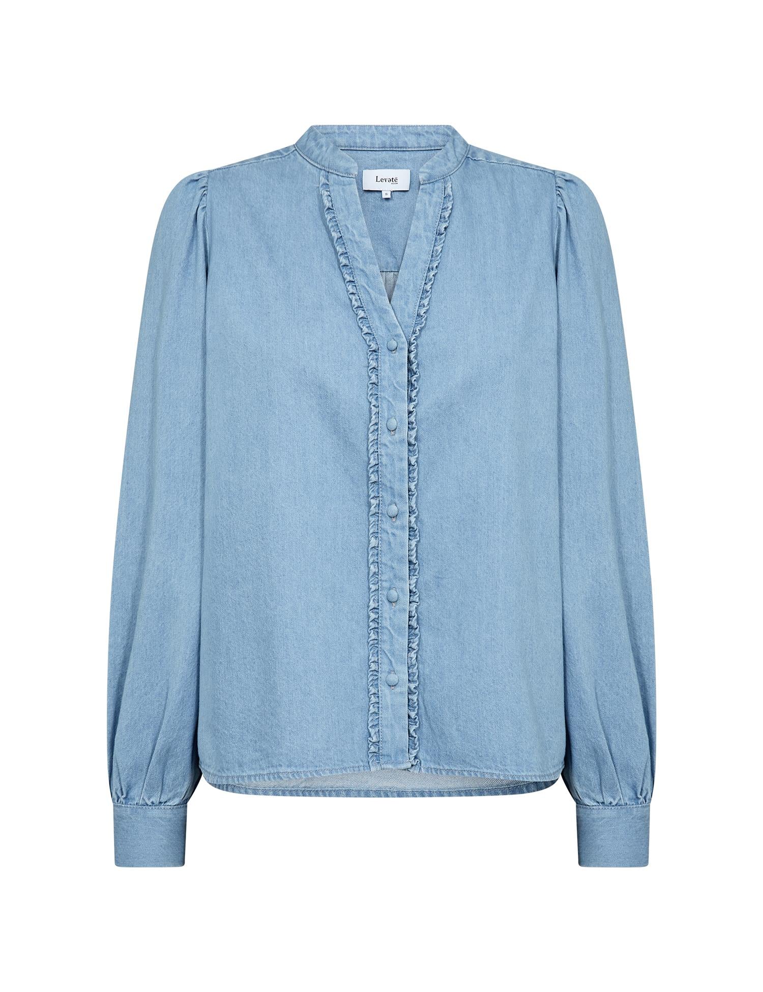 Pen skjorte i lys denim fra Levete Room. Modellen er rett med pen hoftelengde. Mandarinkrage med liten V-hals og ton-i-ton knappestople i front. Den har lange ermer med lett puff i skuldre og knapper i mansjett. Skjorten er detaljert med delikate volanger langs knappestolpen. En hverdagsfavoritt i myk denim.