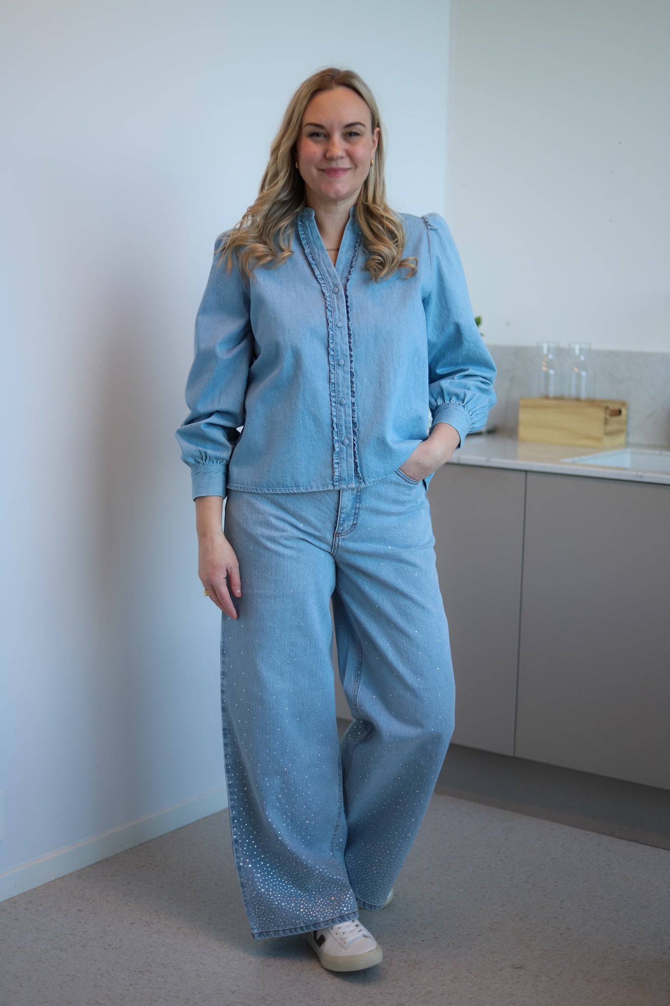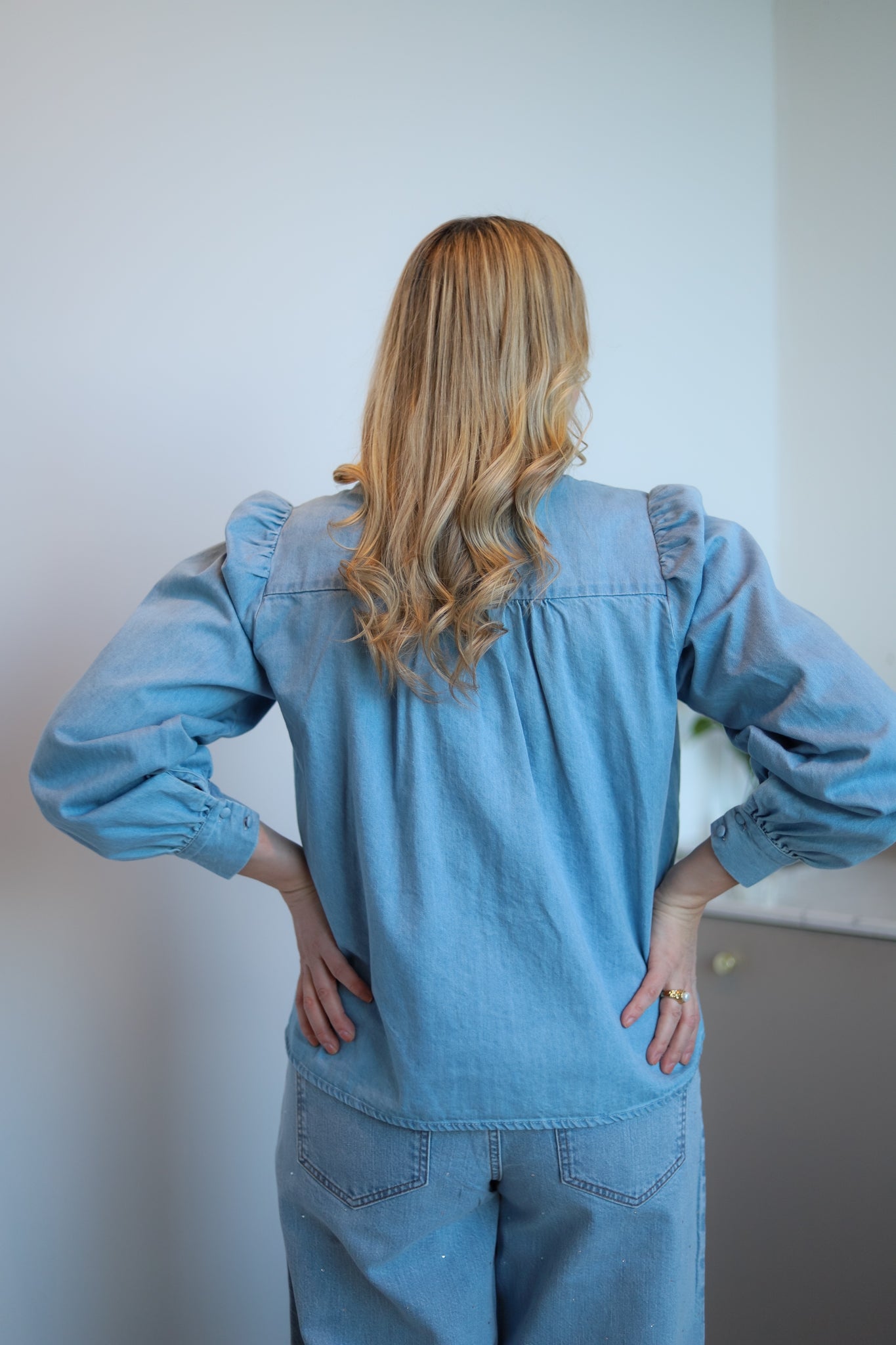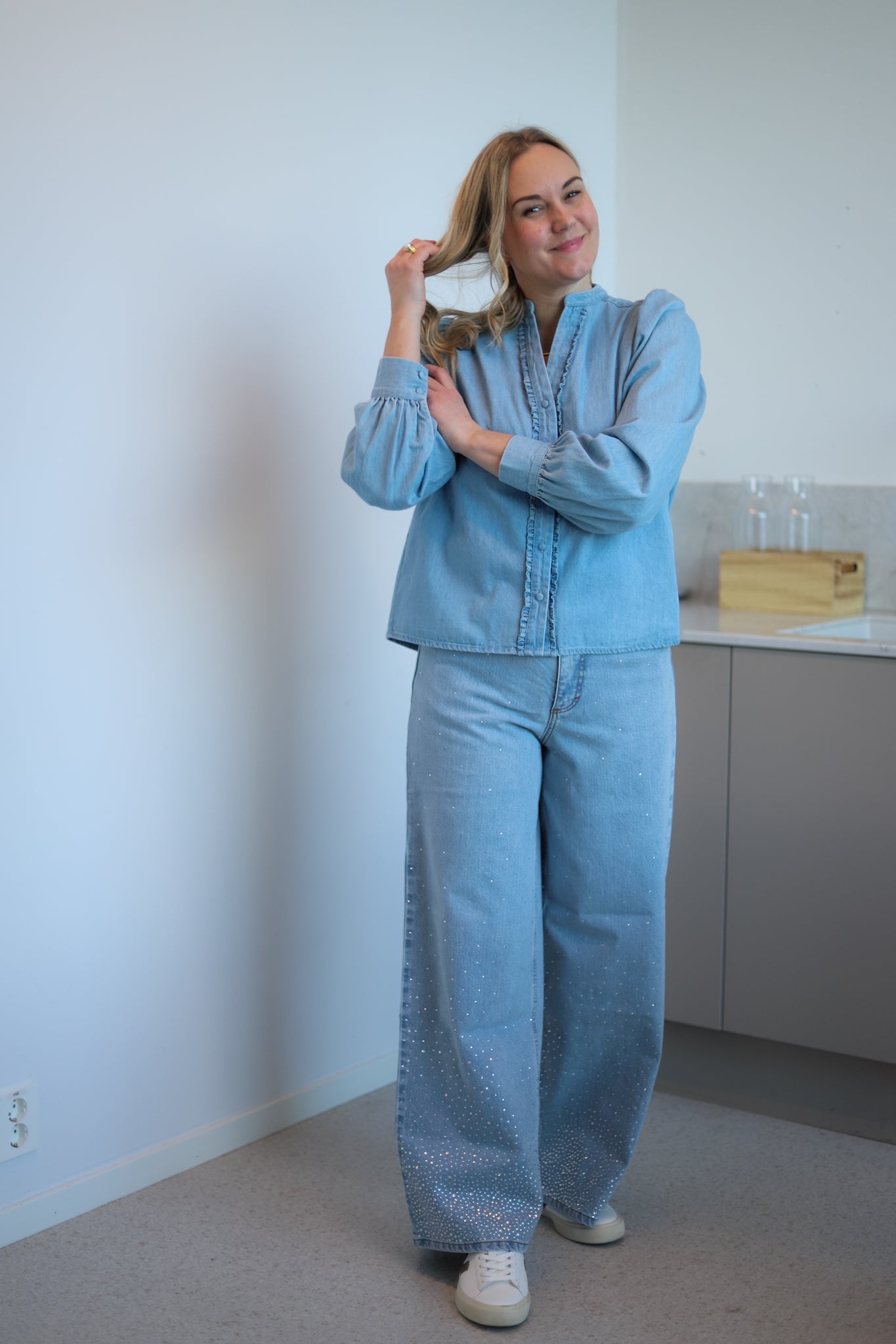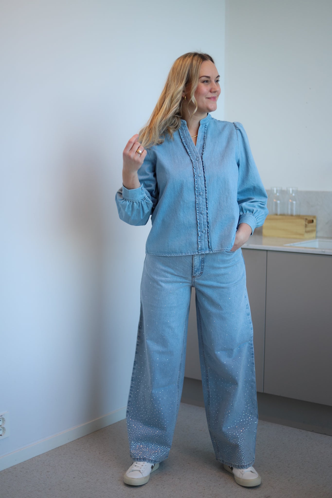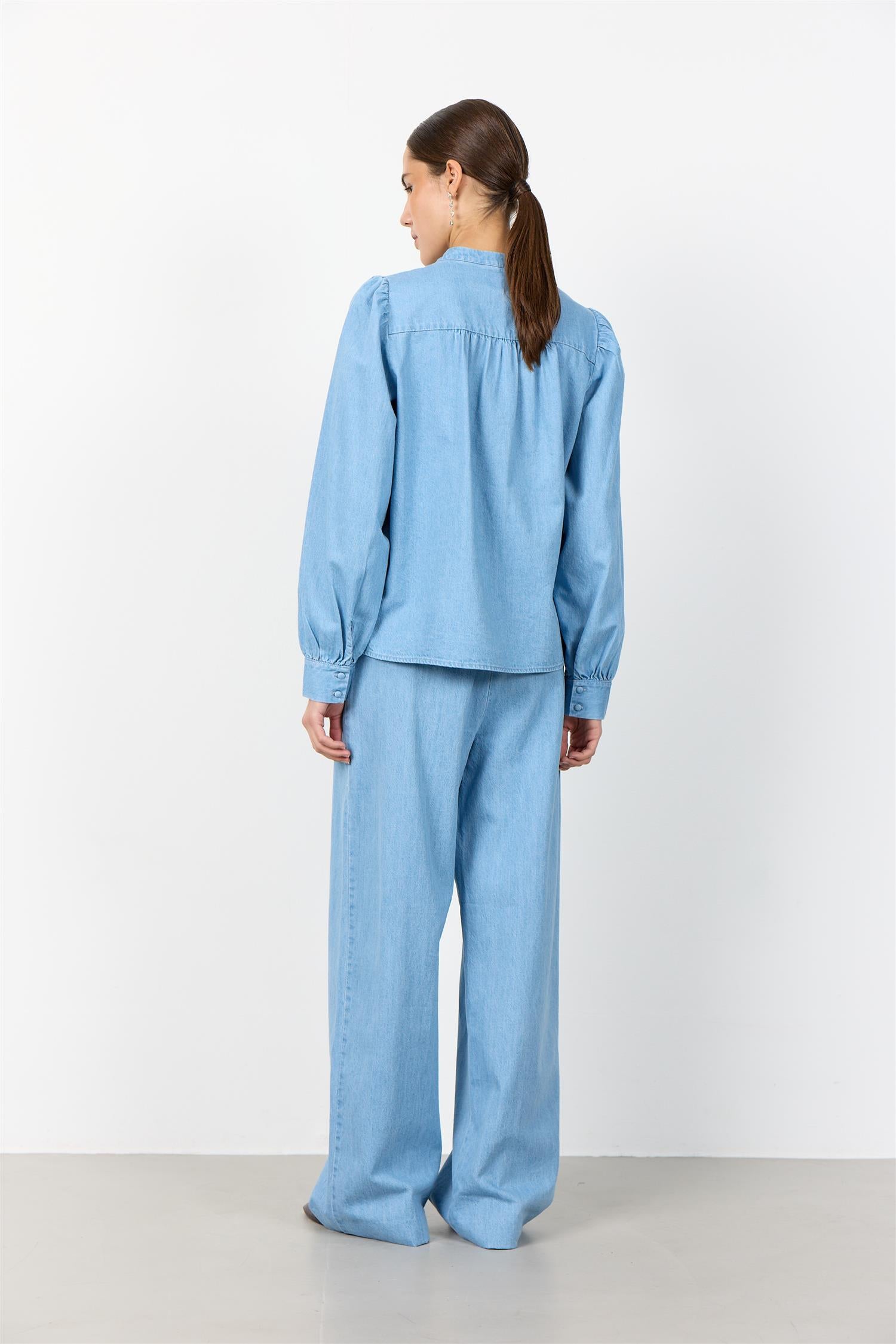 Pen skjorte i lys denim fra Levete Room. Modellen er rett med pen hoftelengde. Mandarinkrage med liten V-hals og ton-i-ton knappestople i front. Den har lange ermer med lett puff i skuldre og knapper i mansjett. Skjorten er detaljert med delikate volanger langs knappestolpen. En hverdagsfavoritt i myk denim.