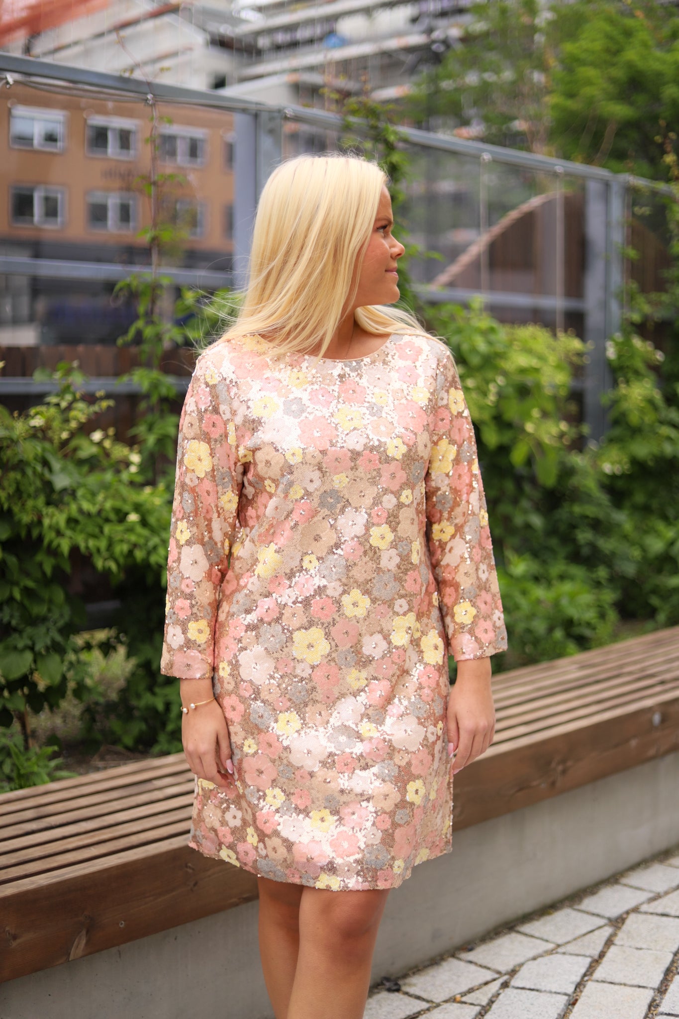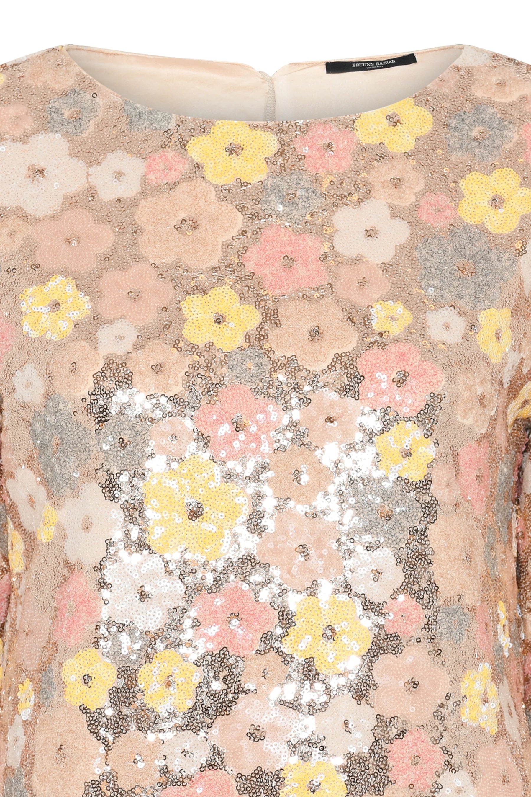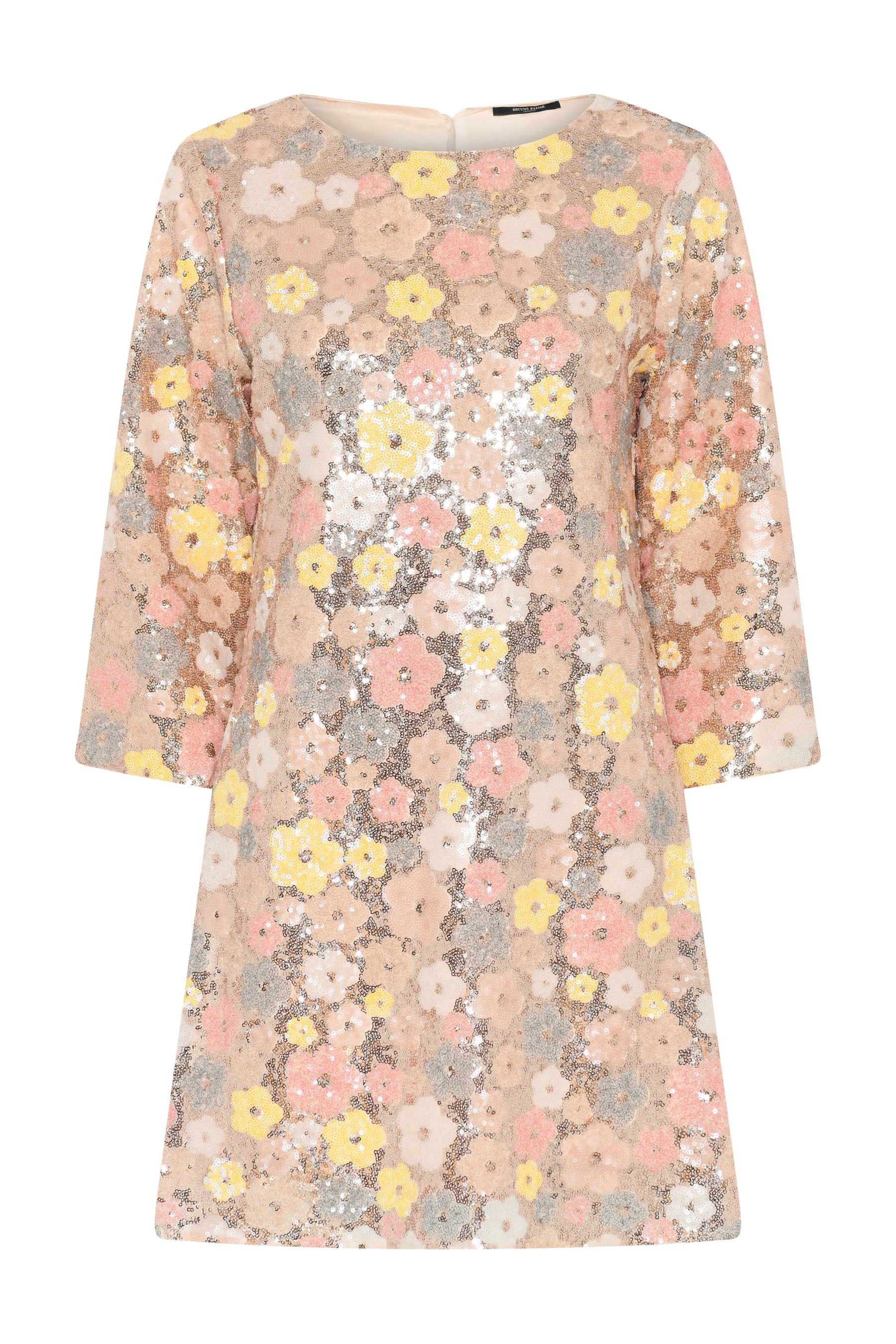 Lekker minikjole dekket av delikate paljetter fra Bruuns Bazaar. Nydelige duse toner med gull i bunnen og blomster i gult og fersken. Modellen har rund hals og glidelås langs ryggen. Den har lett innsving, lengde midt på låret og 3/4 ermer med lett trumpet fasong. Kjolen føles myk og behagelig, og er helfóret. En nydelig vakker kjole til alle typer festligheter. Kombiner med hæler til fest og sneakers for en mer casual look.