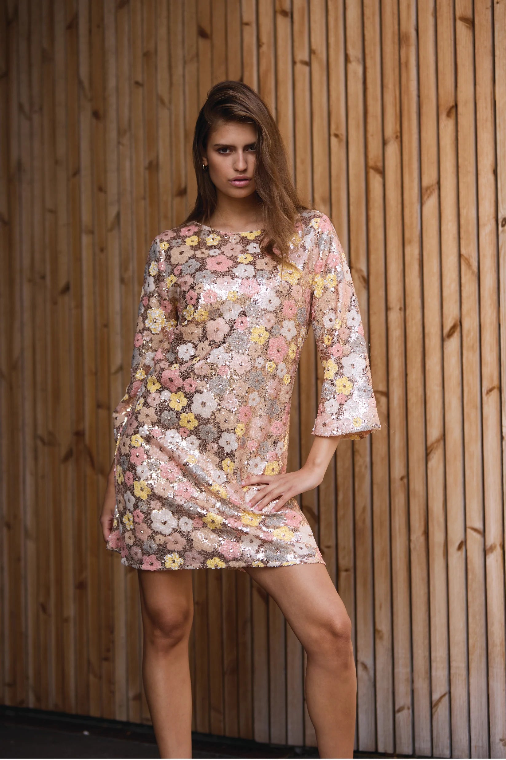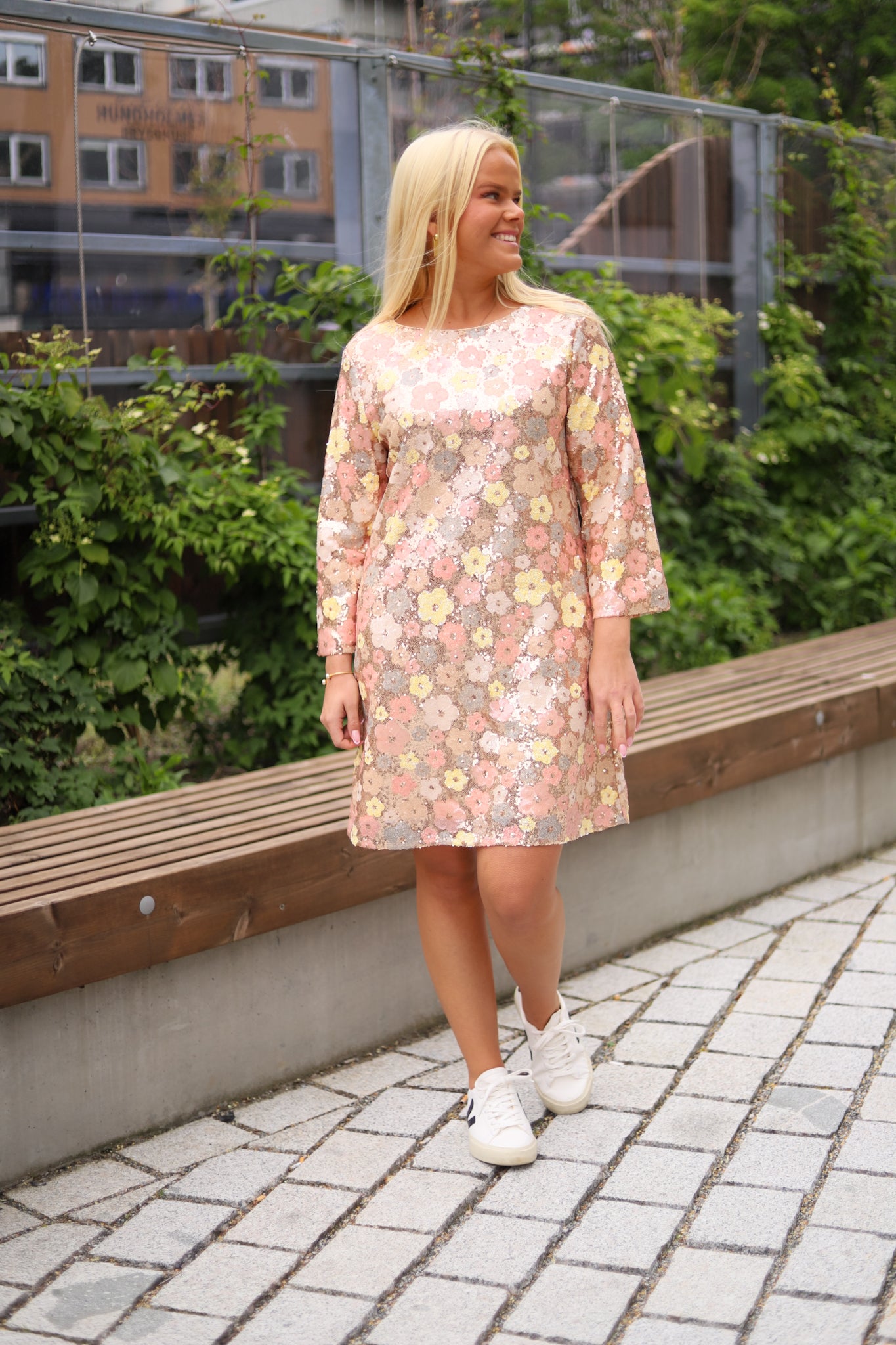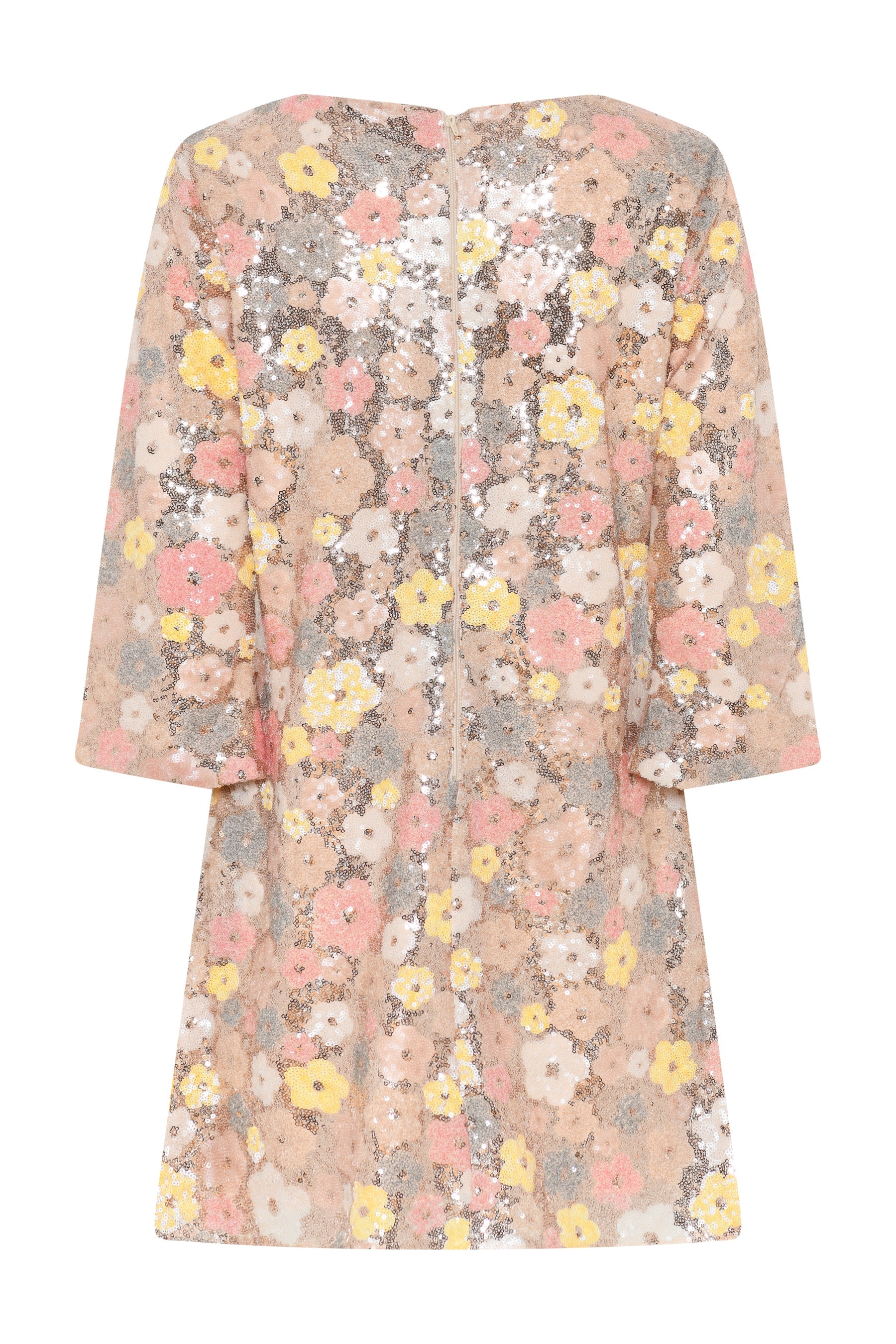Lekker minikjole dekket av delikate paljetter fra Bruuns Bazaar. Nydelige duse toner med gull i bunnen og blomster i gult og fersken. Modellen har rund hals og glidelås langs ryggen. Den har lett innsving, lengde midt på låret og 3/4 ermer med lett trumpet fasong. Kjolen føles myk og behagelig, og er helfóret. En nydelig vakker kjole til alle typer festligheter. Kombiner med hæler til fest og sneakers for en mer casual look.
