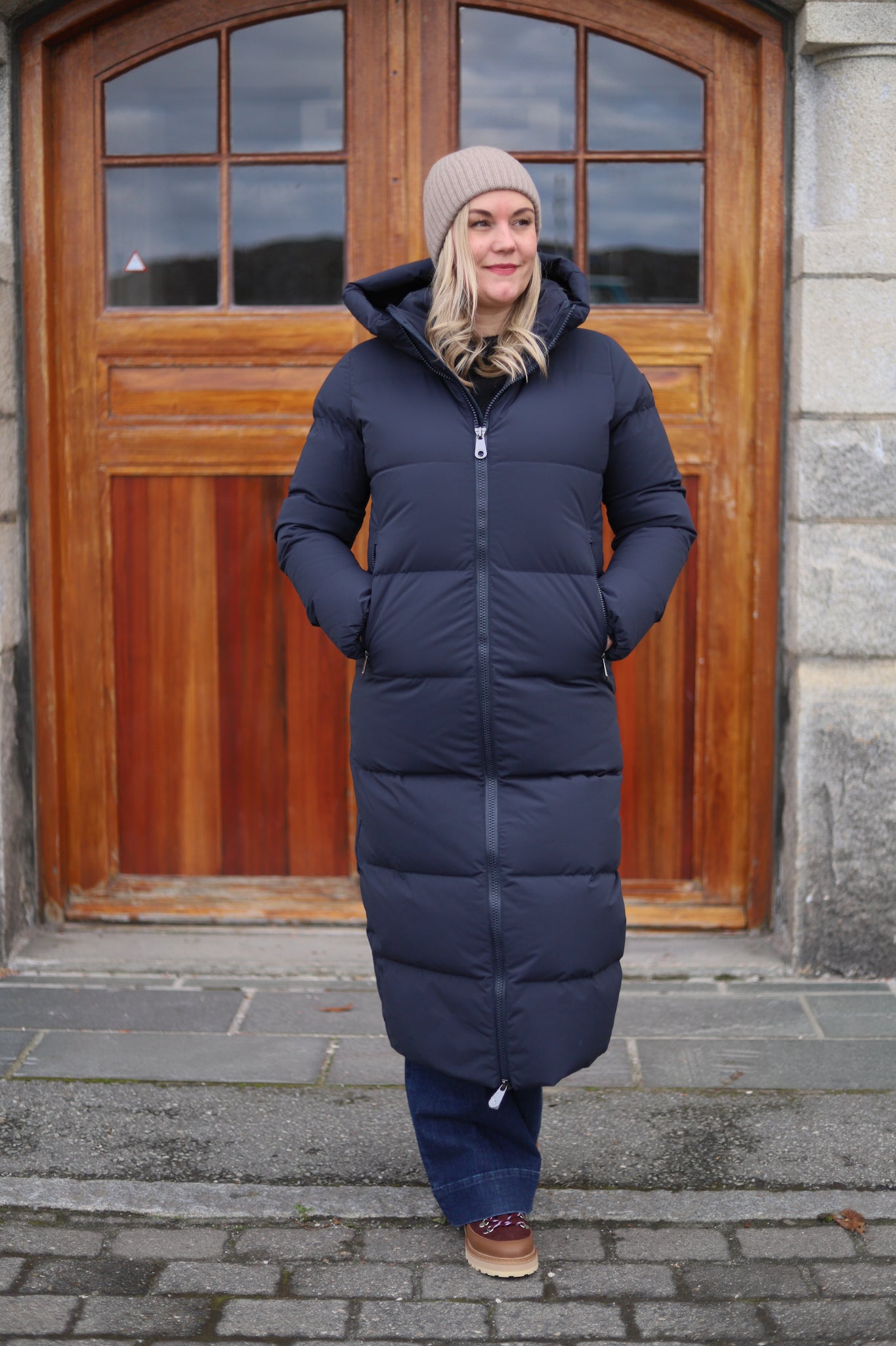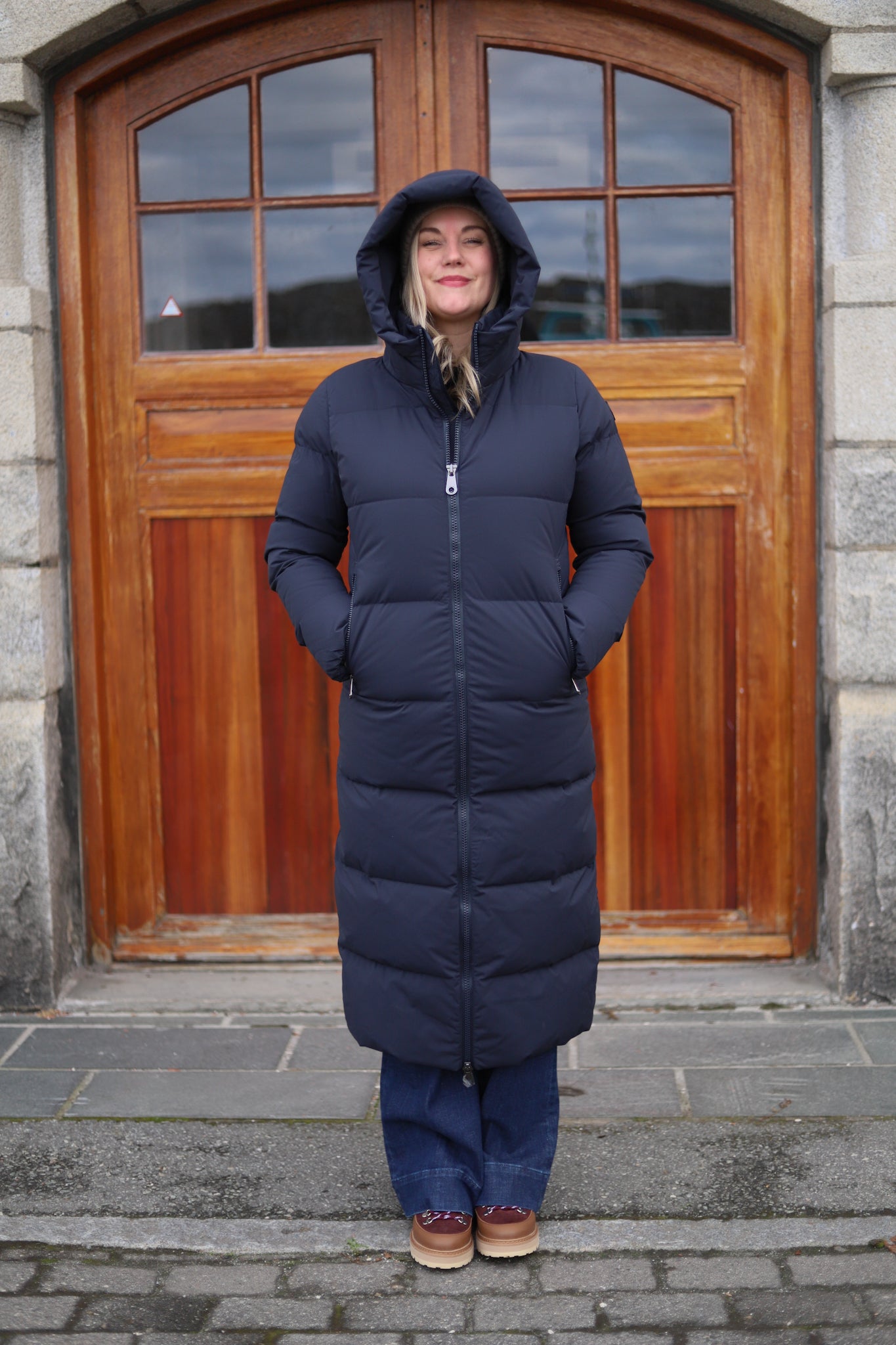 Lang og teknisk god dunjakke i mørk blå fra Monel. Utsiden har en vannsøyle på 10.000 mm og har en delikat matt finish. Den utstyrt med 4-veis stretch, som gir økt komfort og bevegelsesfrihet. Dette gjør jakken perfekt for aktive dager ute i naturen eller i byen. Modellen når midt på leggen og har smal feminin silhuett. Den er quiltet i brede kanaler av ypperste dunblanding 90/10 og er behagelig lett i vekt. Fine detaljer med toveis YKK glidelås i front, deilig stor hette og behagelig ribb i mansjett. Skrålommer i front og en innvendig lomme med glidelås. Kul og trendy jakke som er utrolig behagelig på!