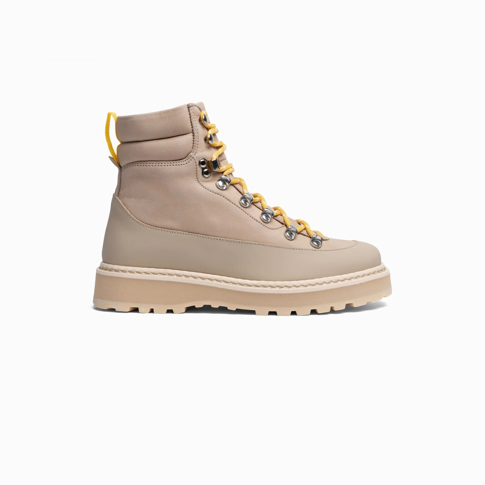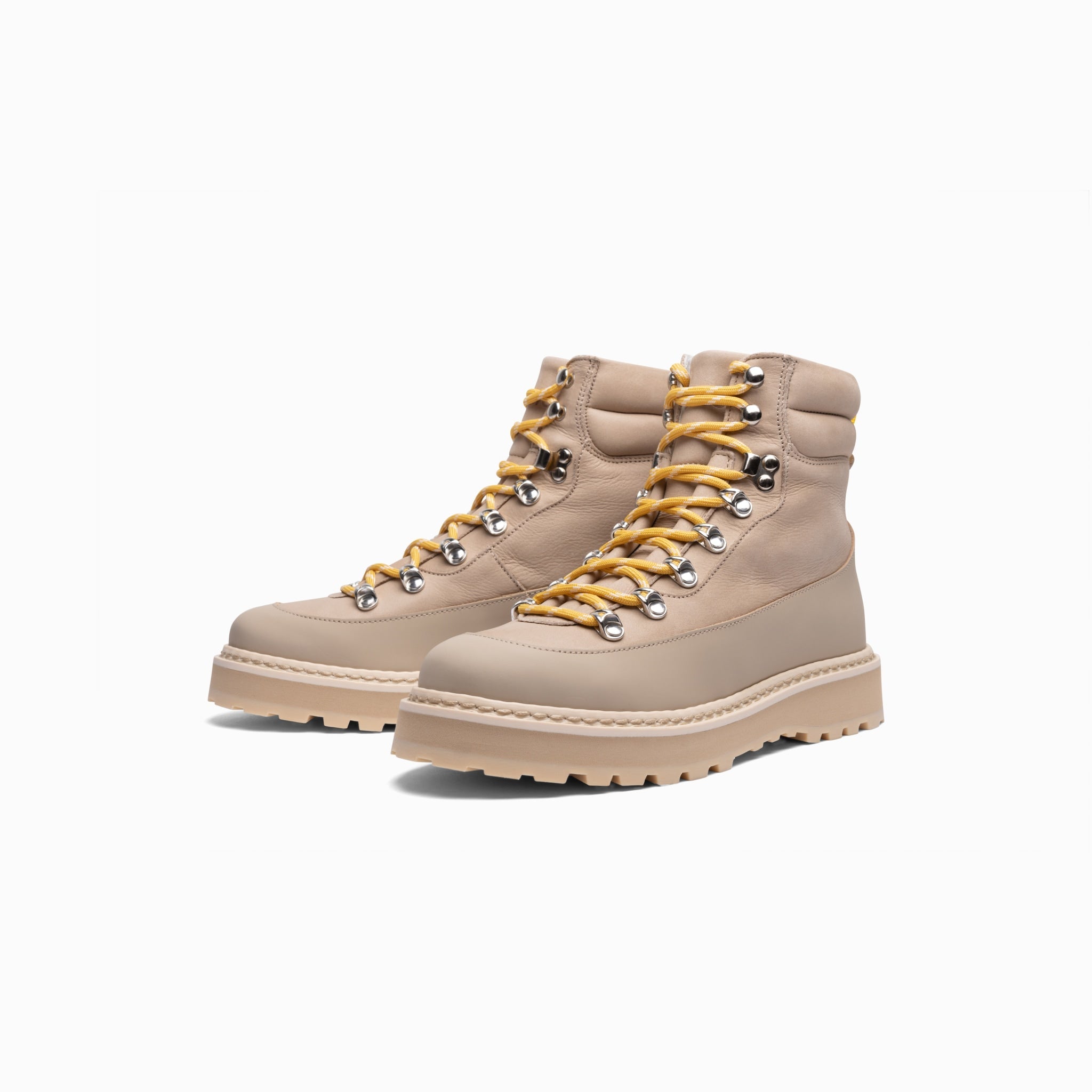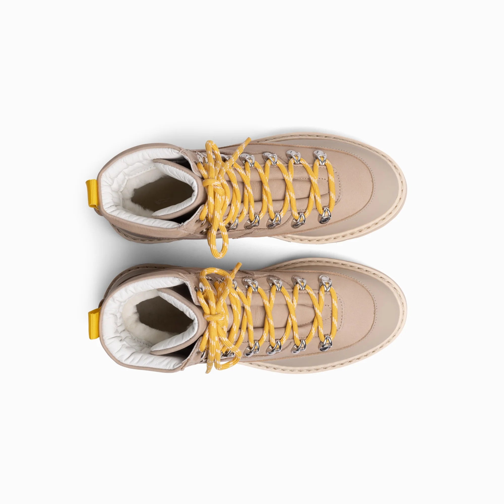 Det norske skomerket MONO har satt sine spor og er kjent for sine komfortable hikinginspirerte vintersko. Cap-modellen har en forlengelse av gummisålen som gir ekstra beskyttelse mot snø og slaps. Fjellsko-inspiret sko med godt grep og halvhøyt skaft. Herlig skinnkvalitet fóret med deilig shearling-ull som både varmer og puster. Super behagelig og flott sko - perfekt for norsk vinter! Her i en lys beigefarge.