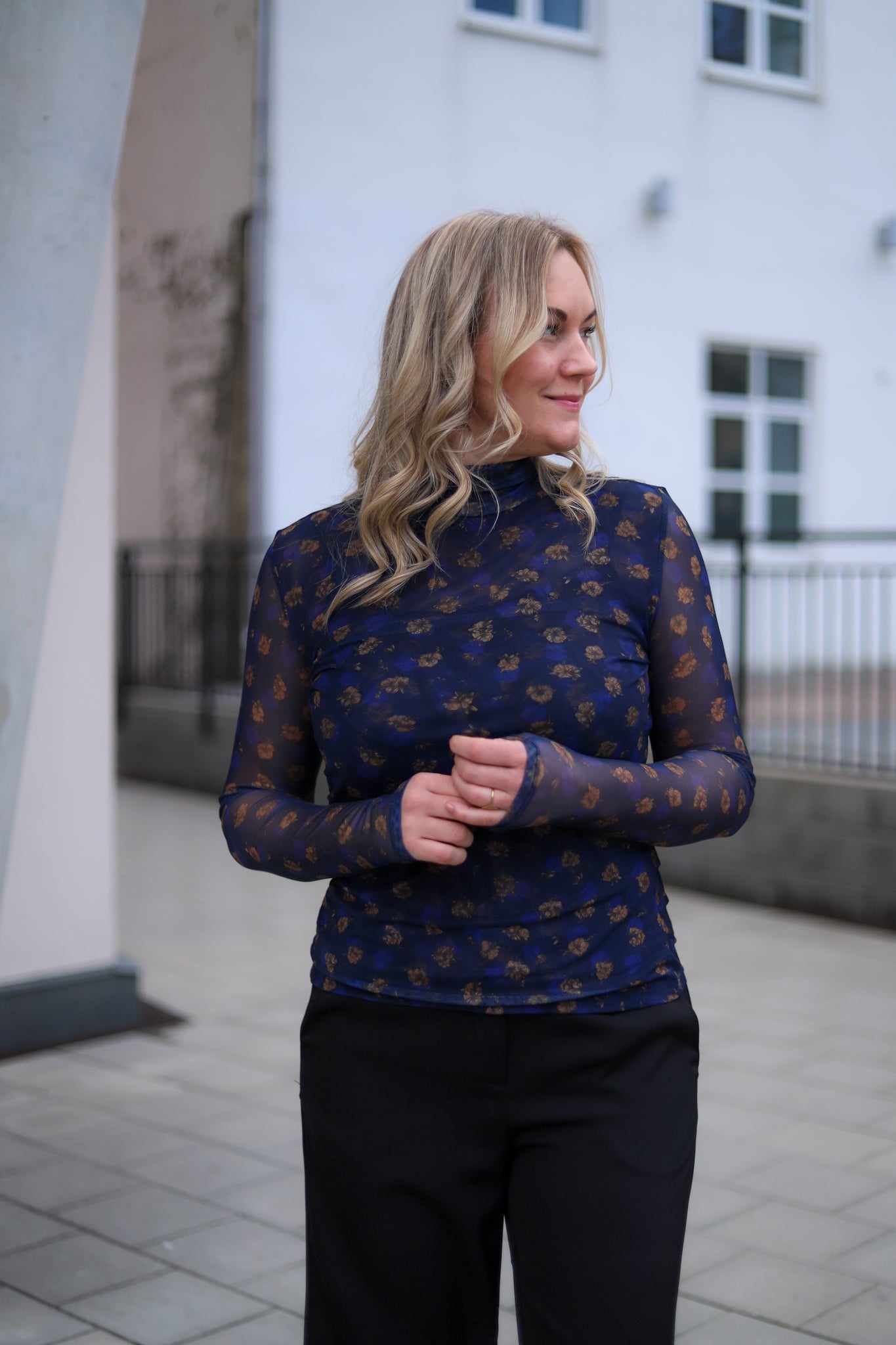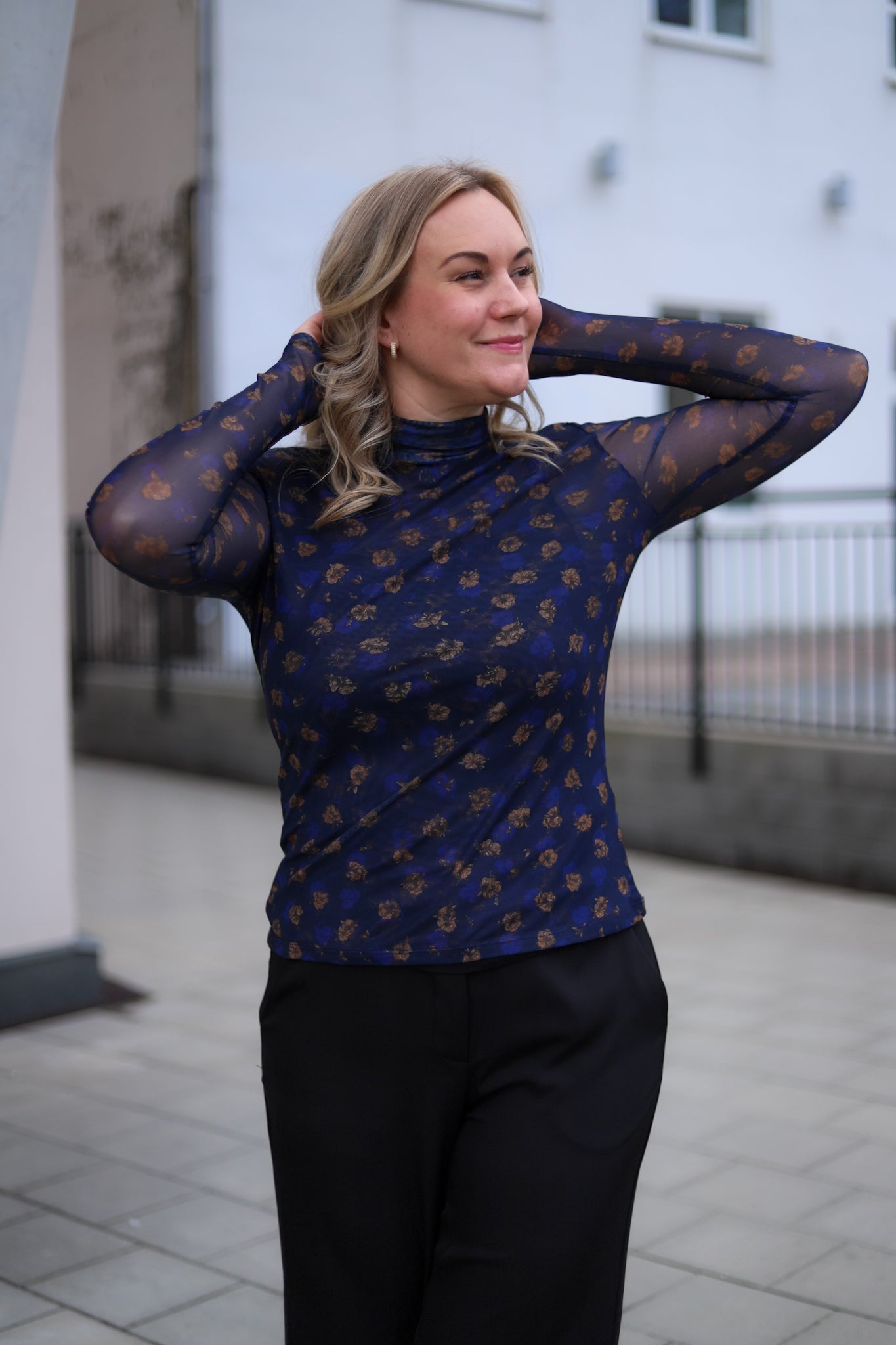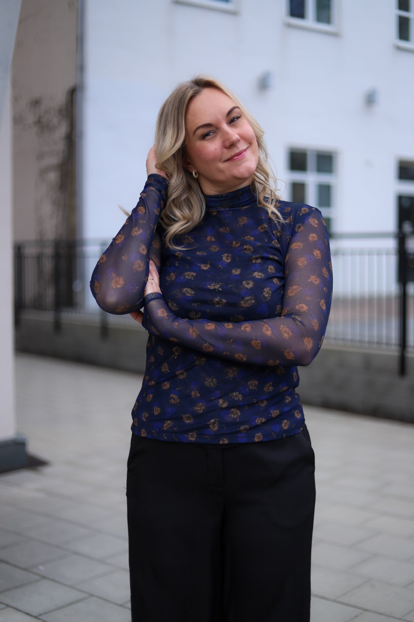 Stilig meshtopp i mørk blå med blomsterprint fra MSCH Copenhagen. Modellen er tettsittende med høy hals og lange smale ermer. Bruk den under en blazer for et sofistikert antrekk, eller style den alene med jeans for et mer feminint antrekk.